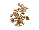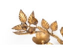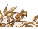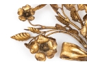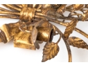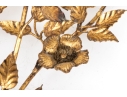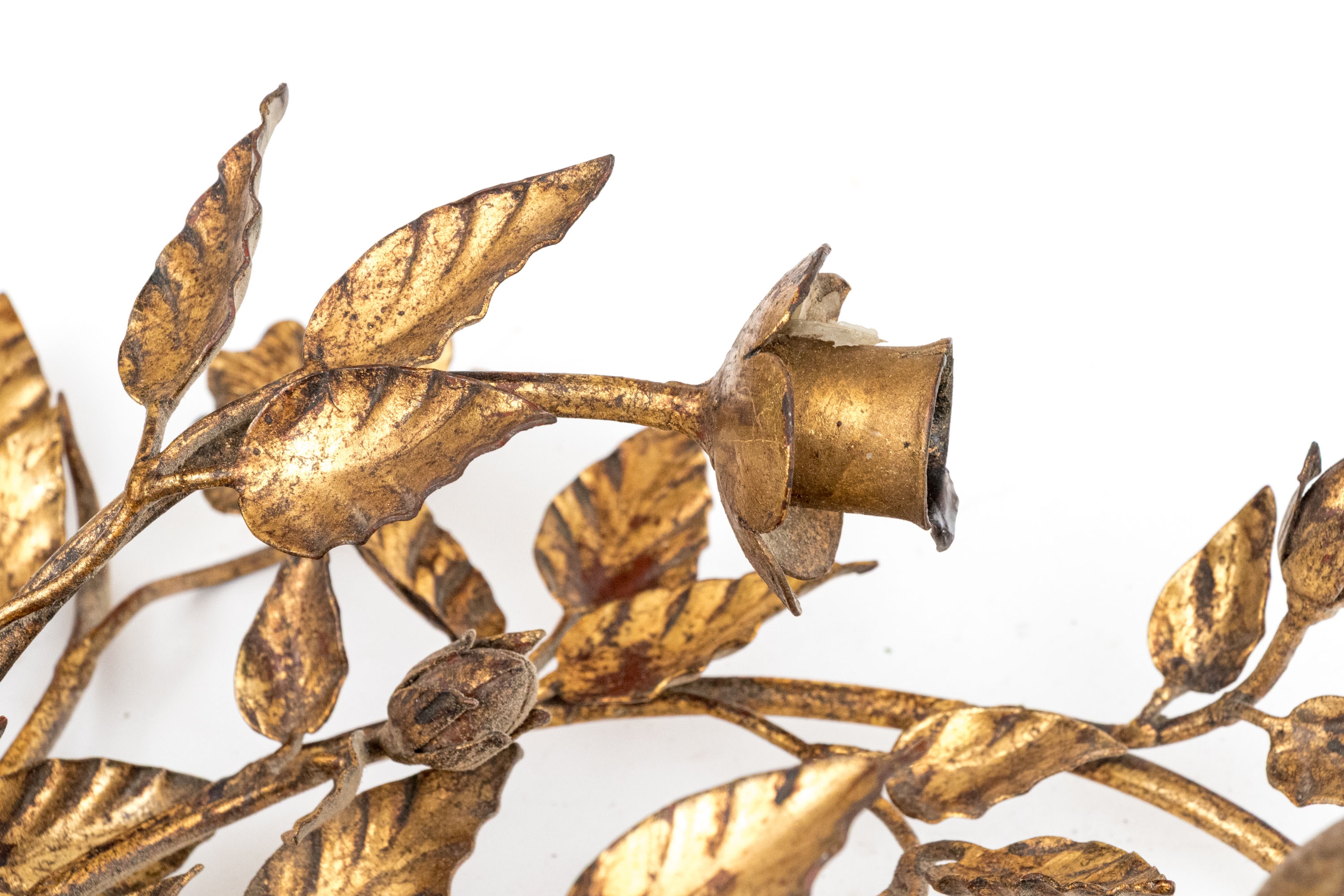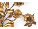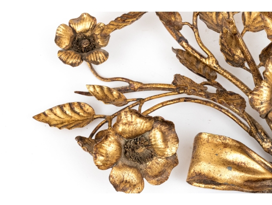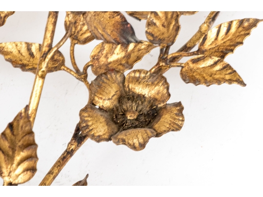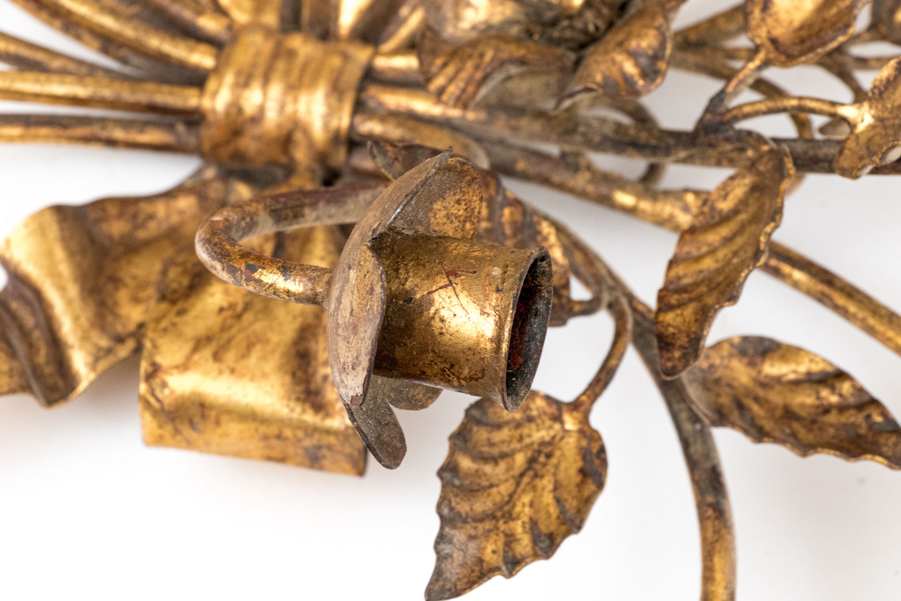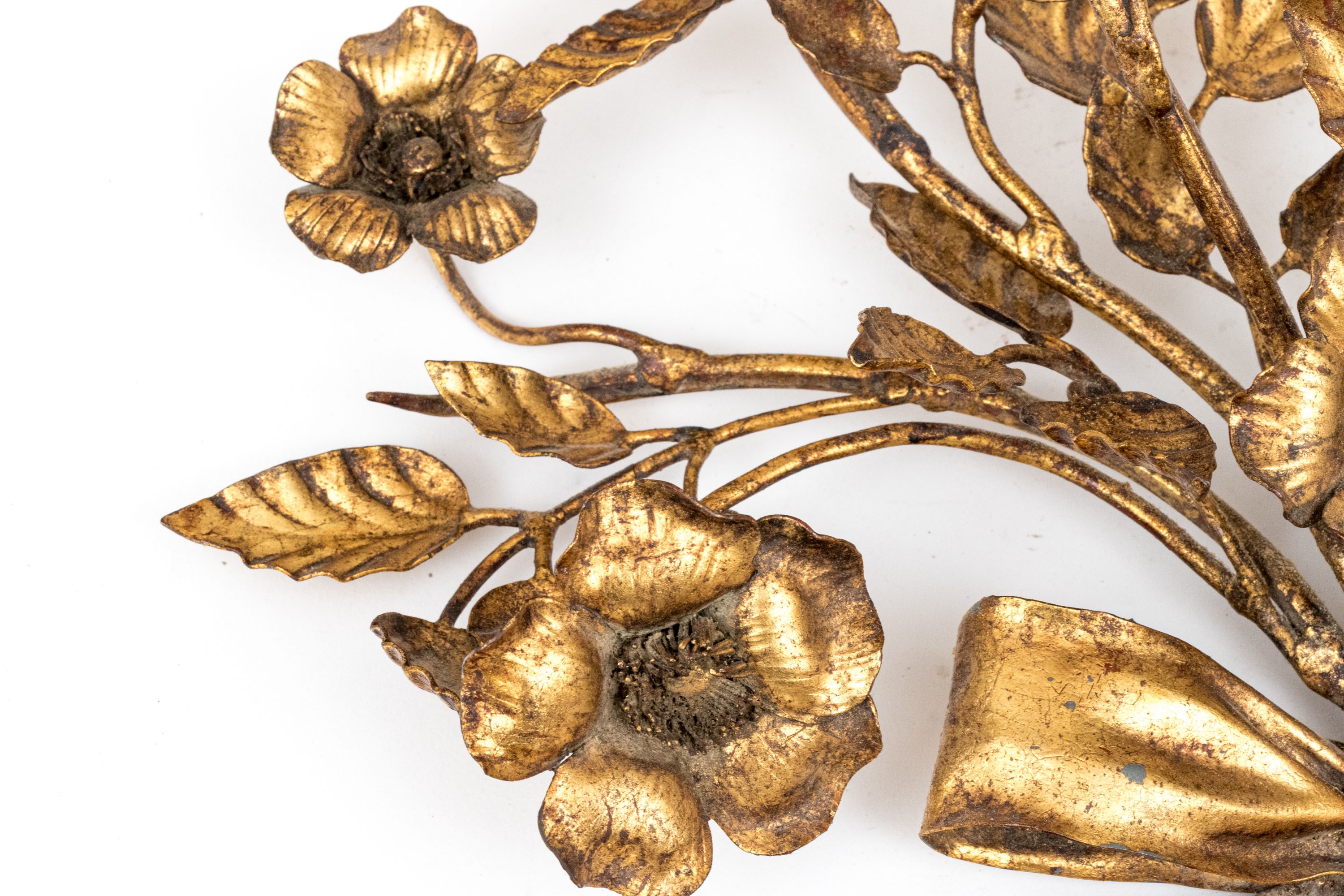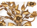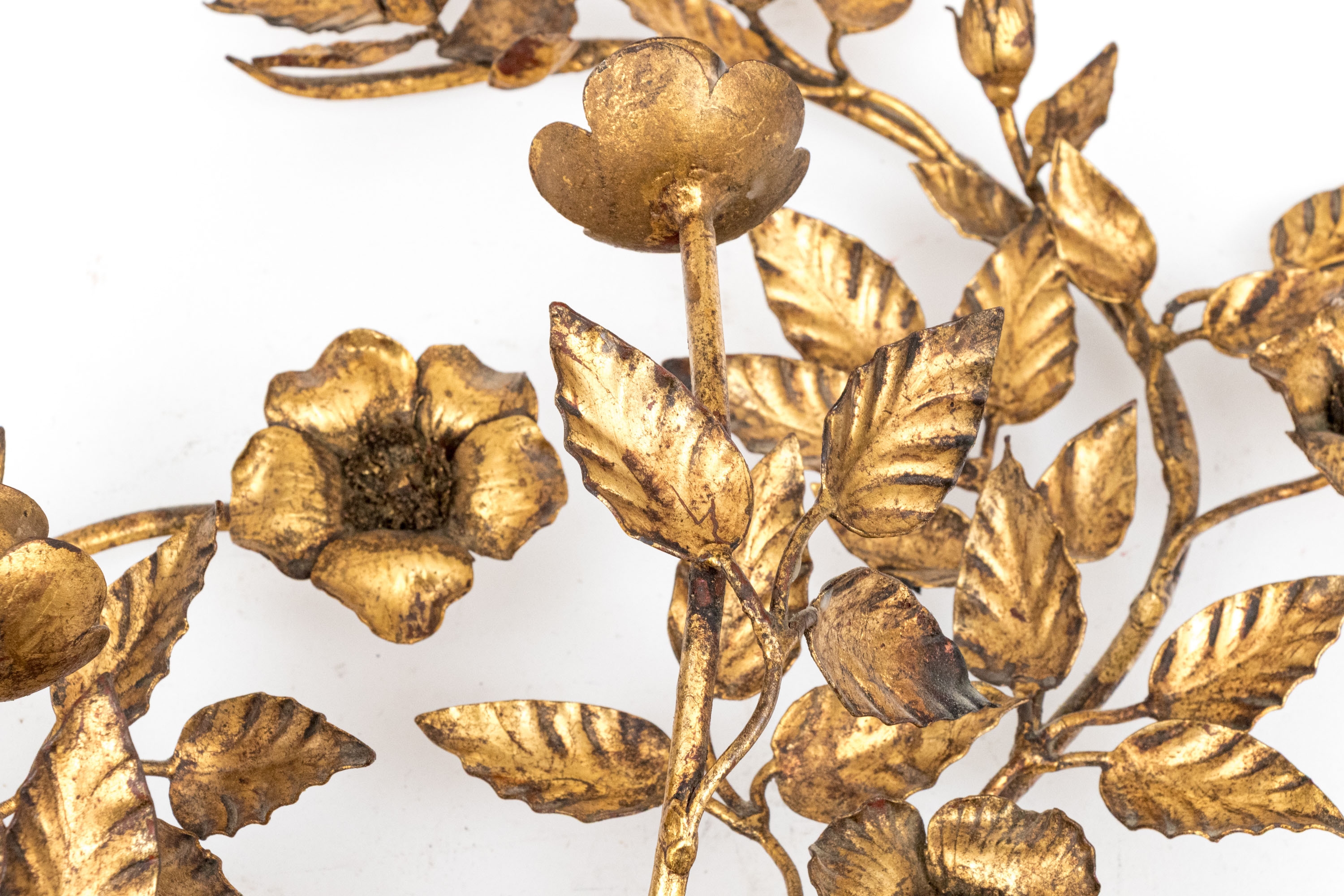 A pair of Florentine gilt metal wall sconces with floral bouquet motifs incorporating winding vines, pointed leaves, and three petaled sconces for candles. The stems meet at the center bottom with large ribbon bow.
