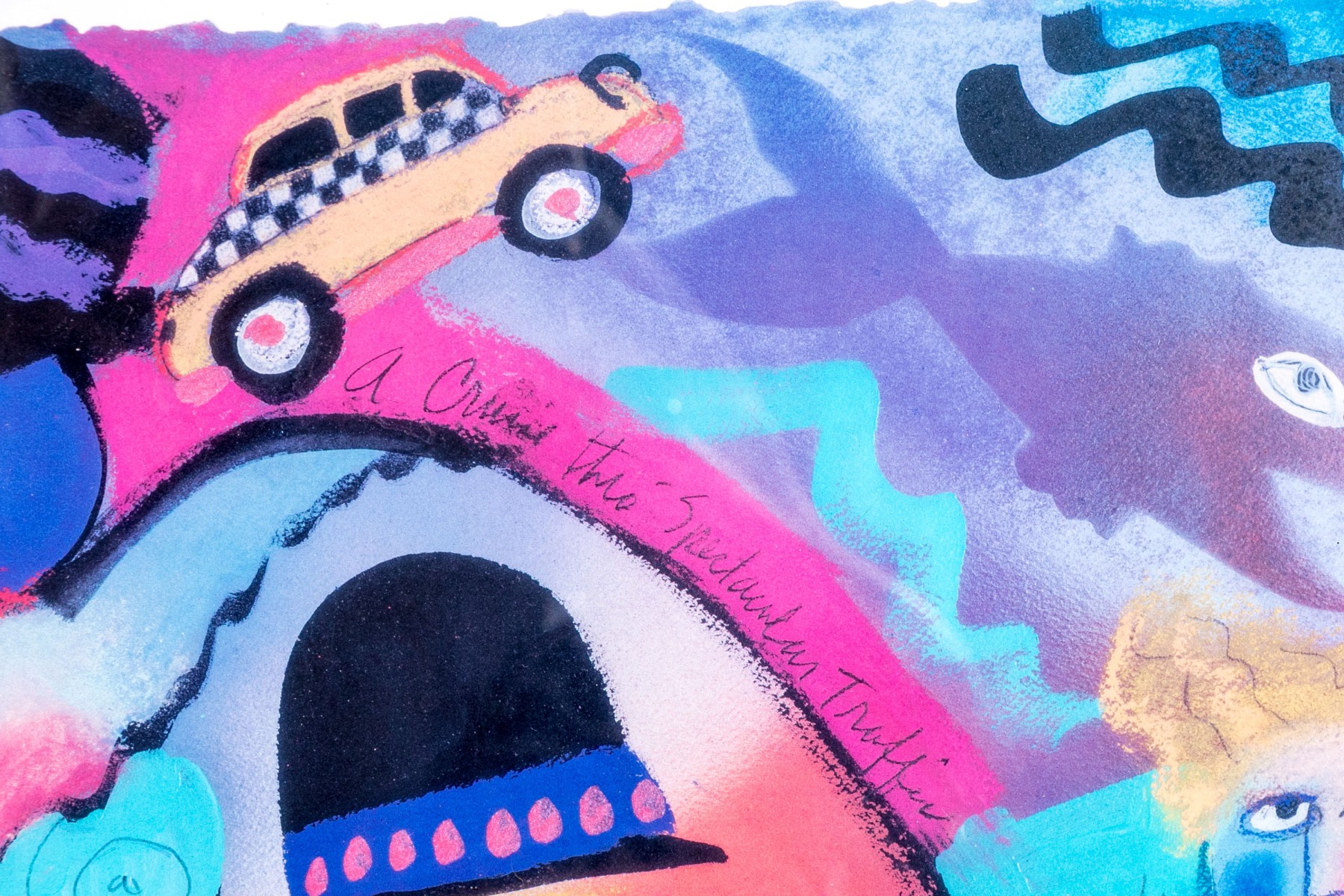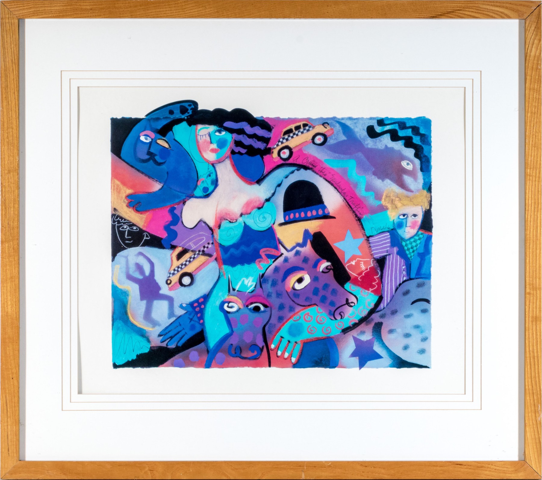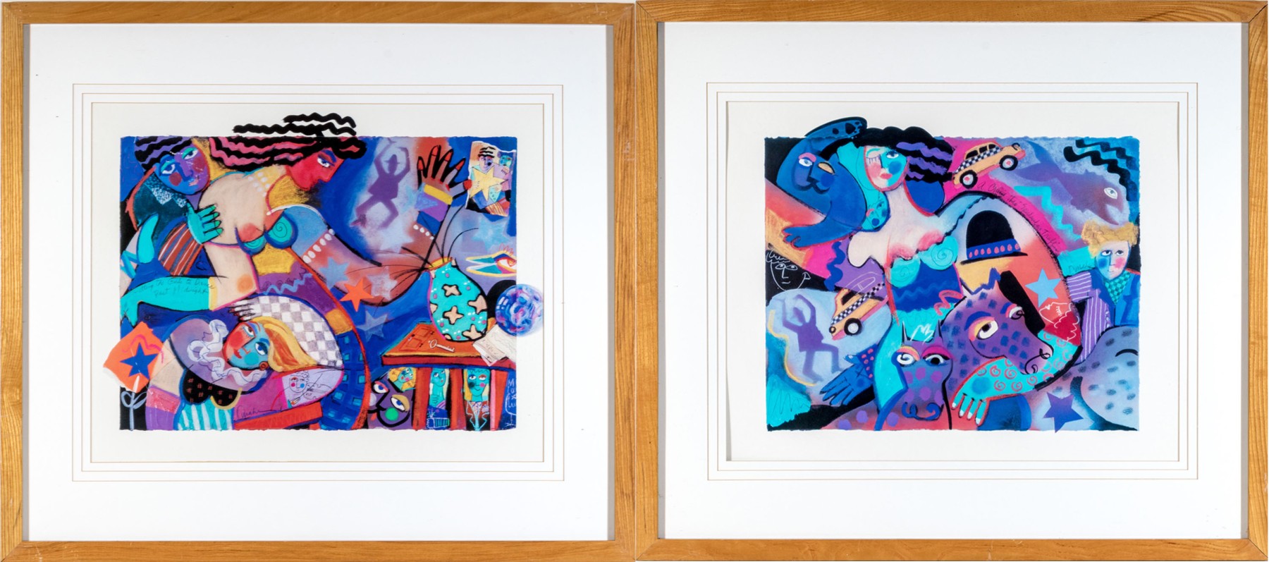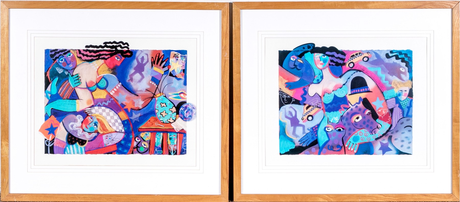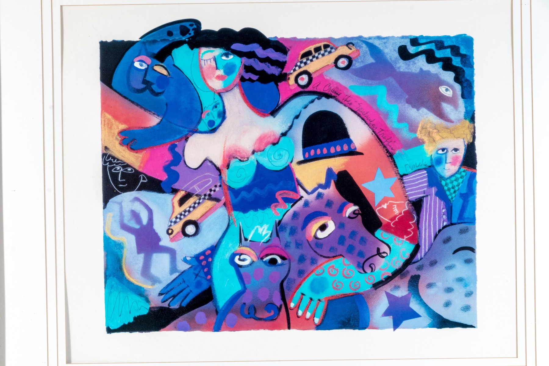 Colorful surreal compositions with figures, faces and taxis, each titled and signed in plate. Presented matted in wood frames and glazed.