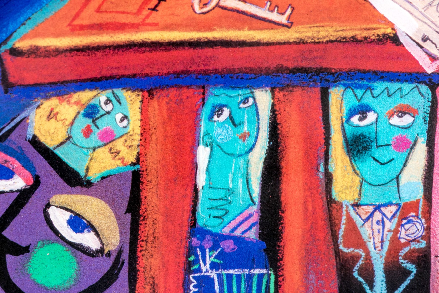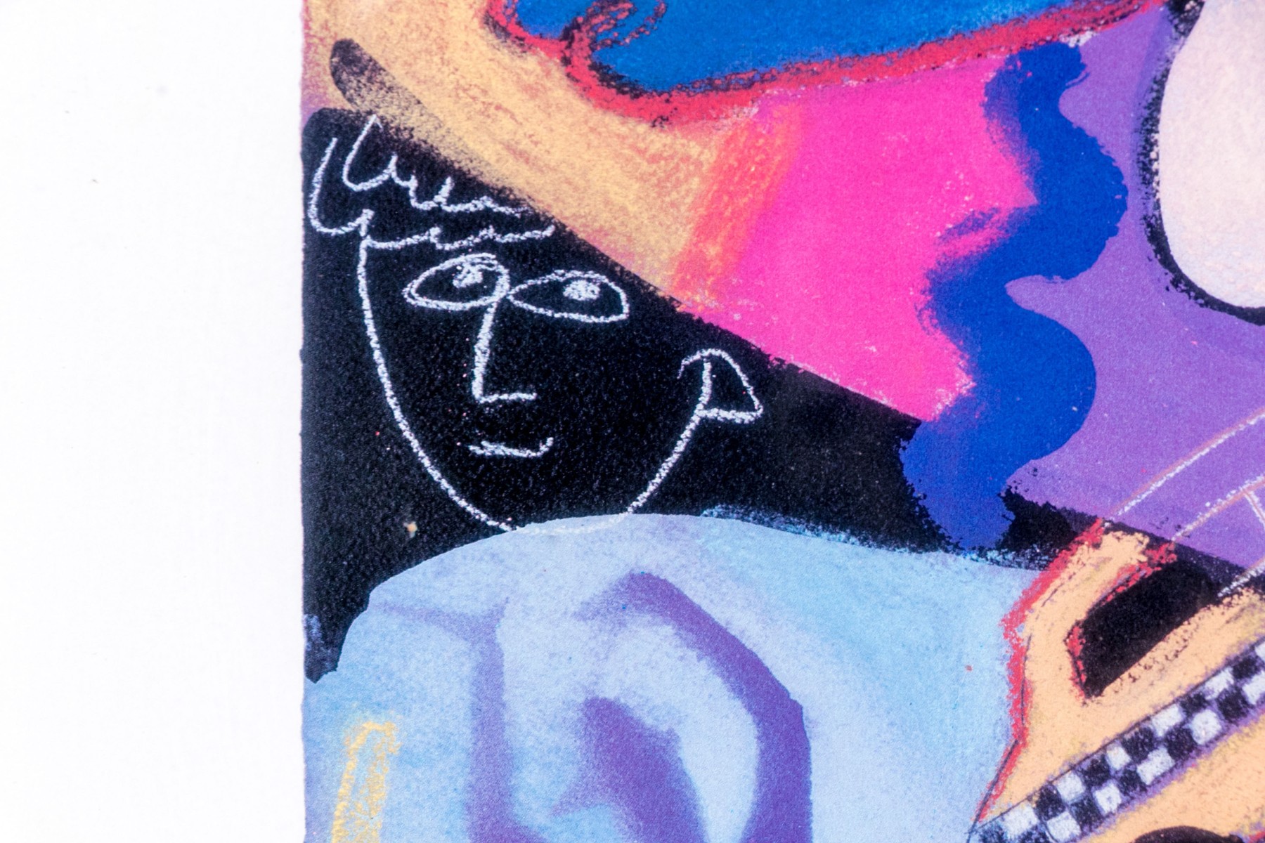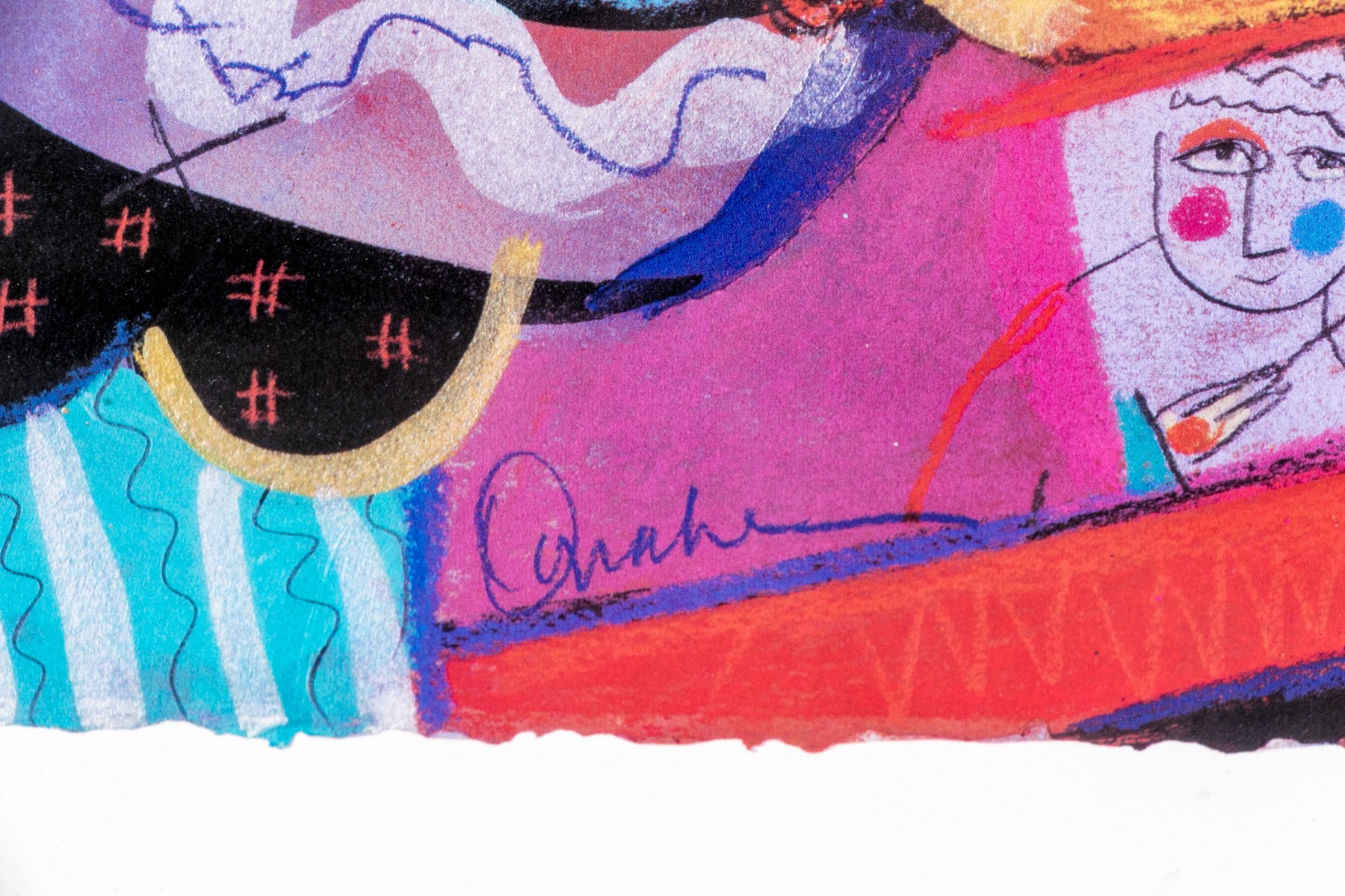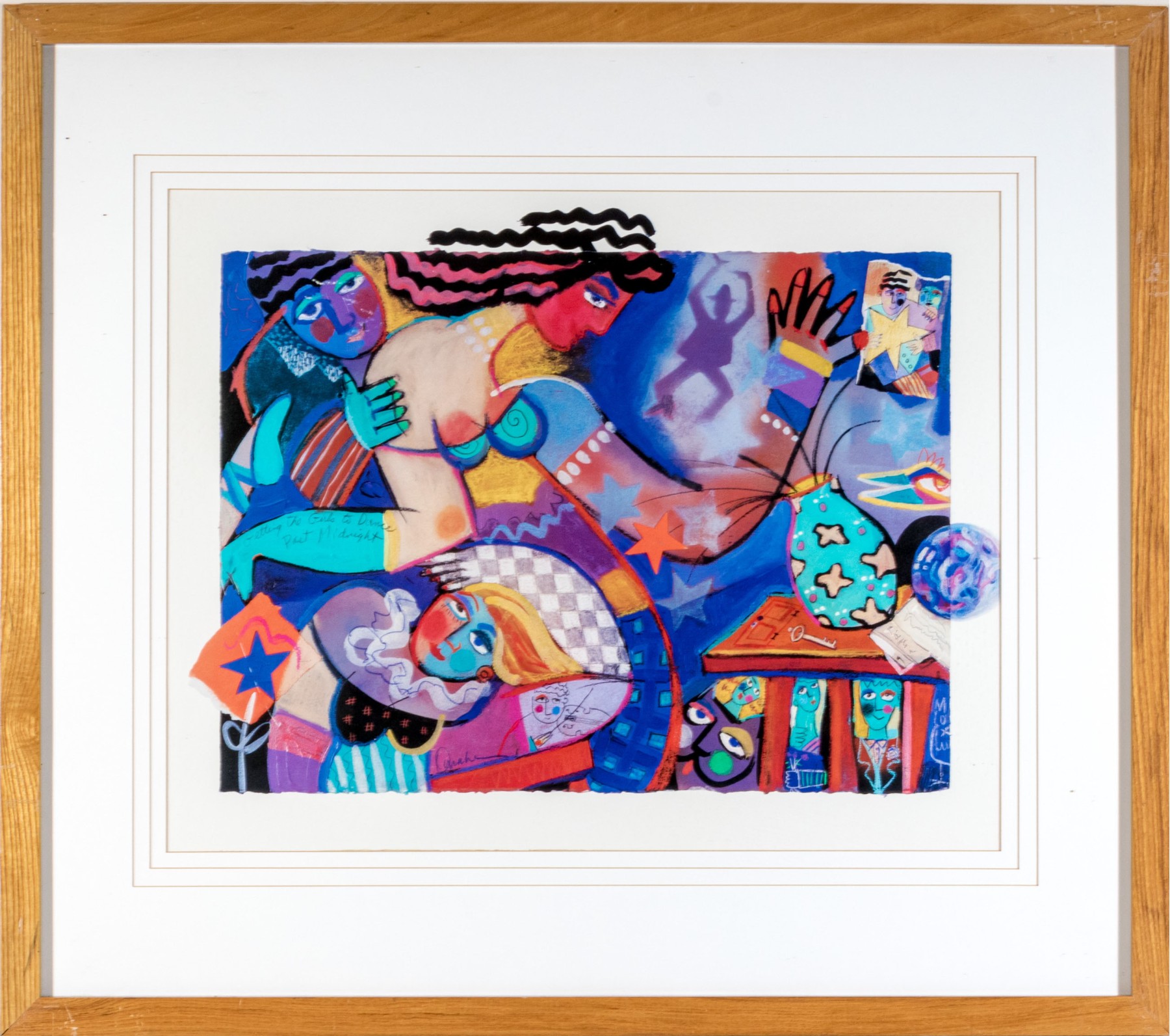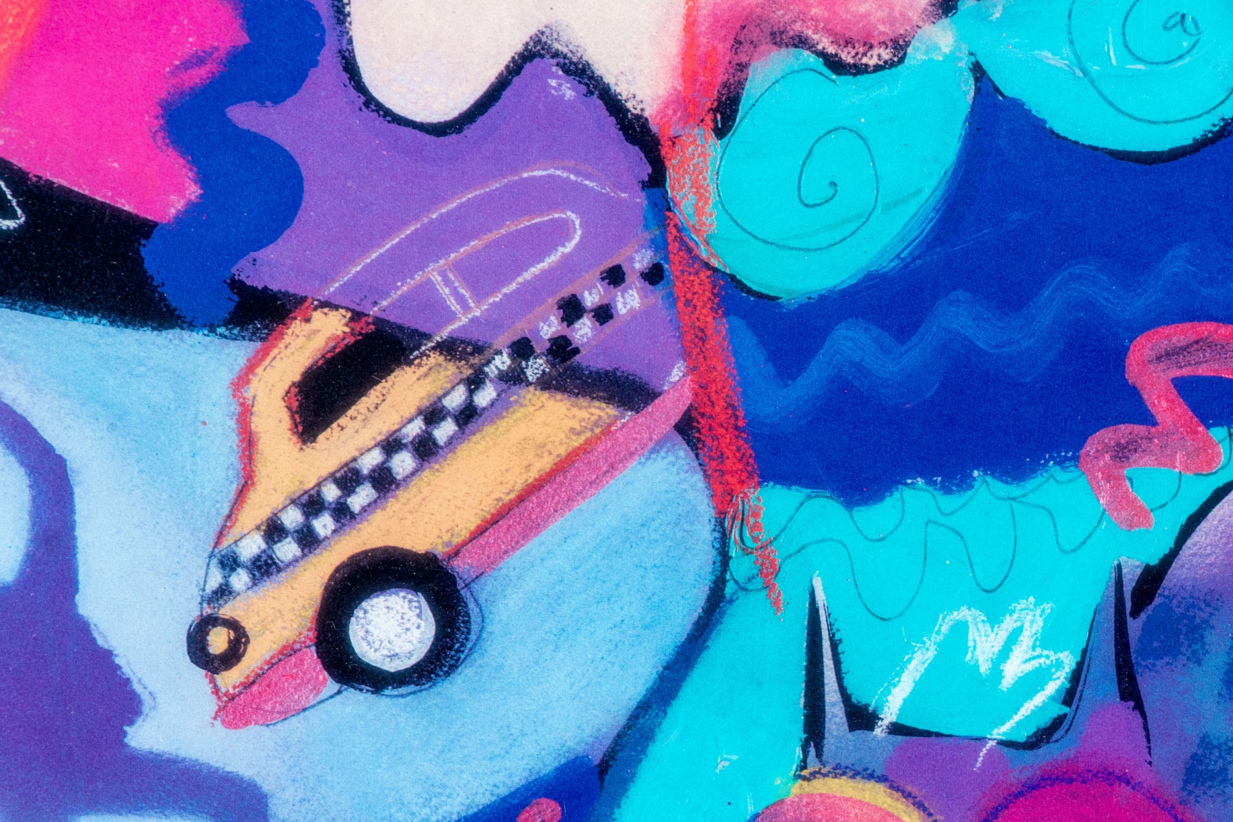 Colorful surreal compositions with figures, faces and taxis, each titled and signed in plate. Presented matted in wood frames and glazed.