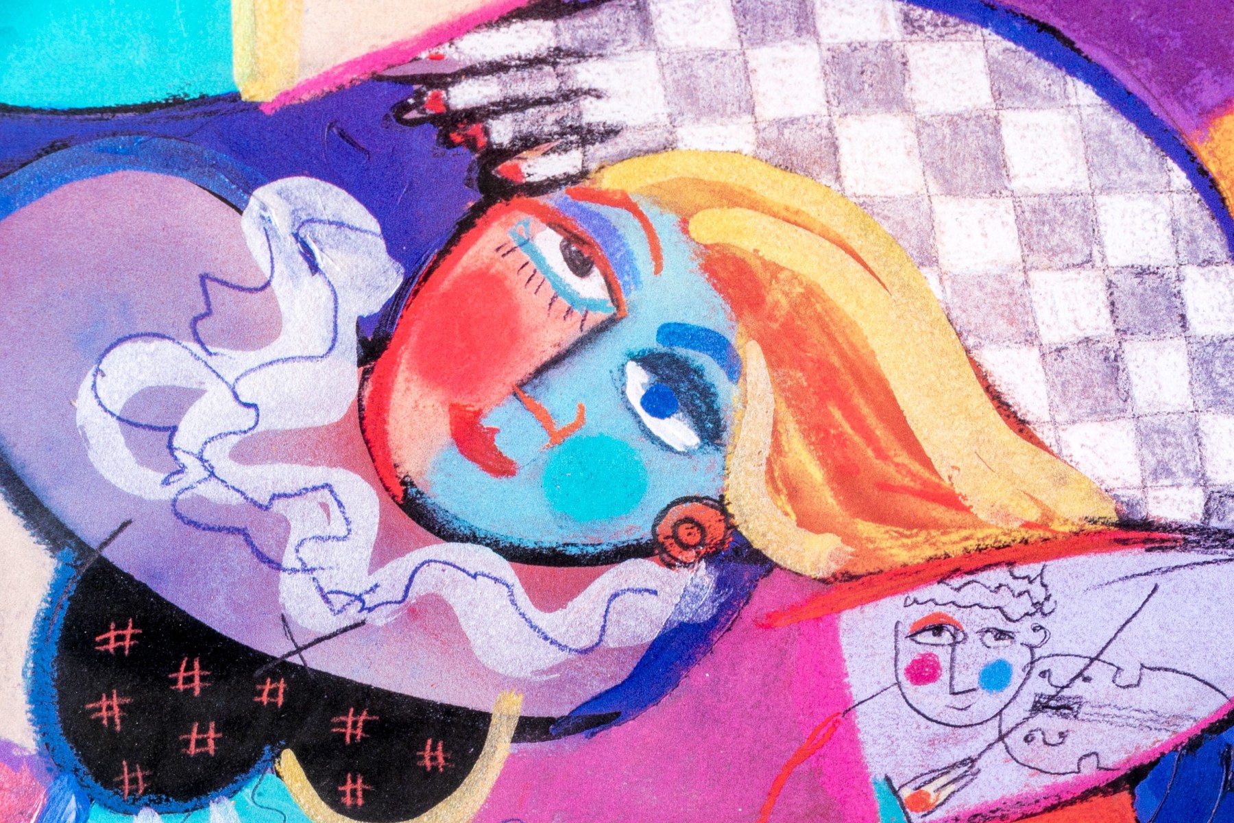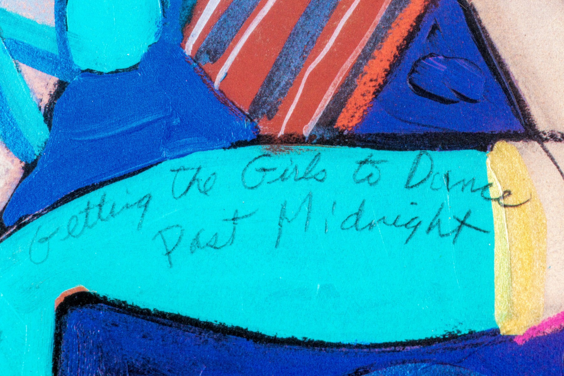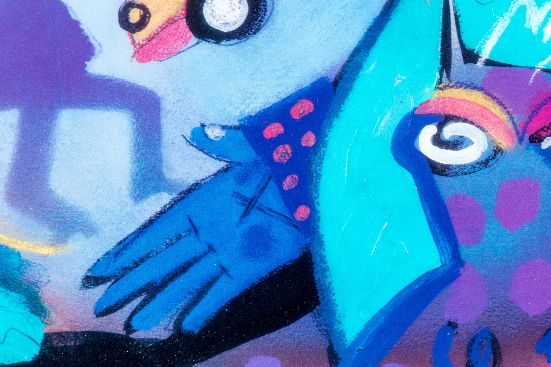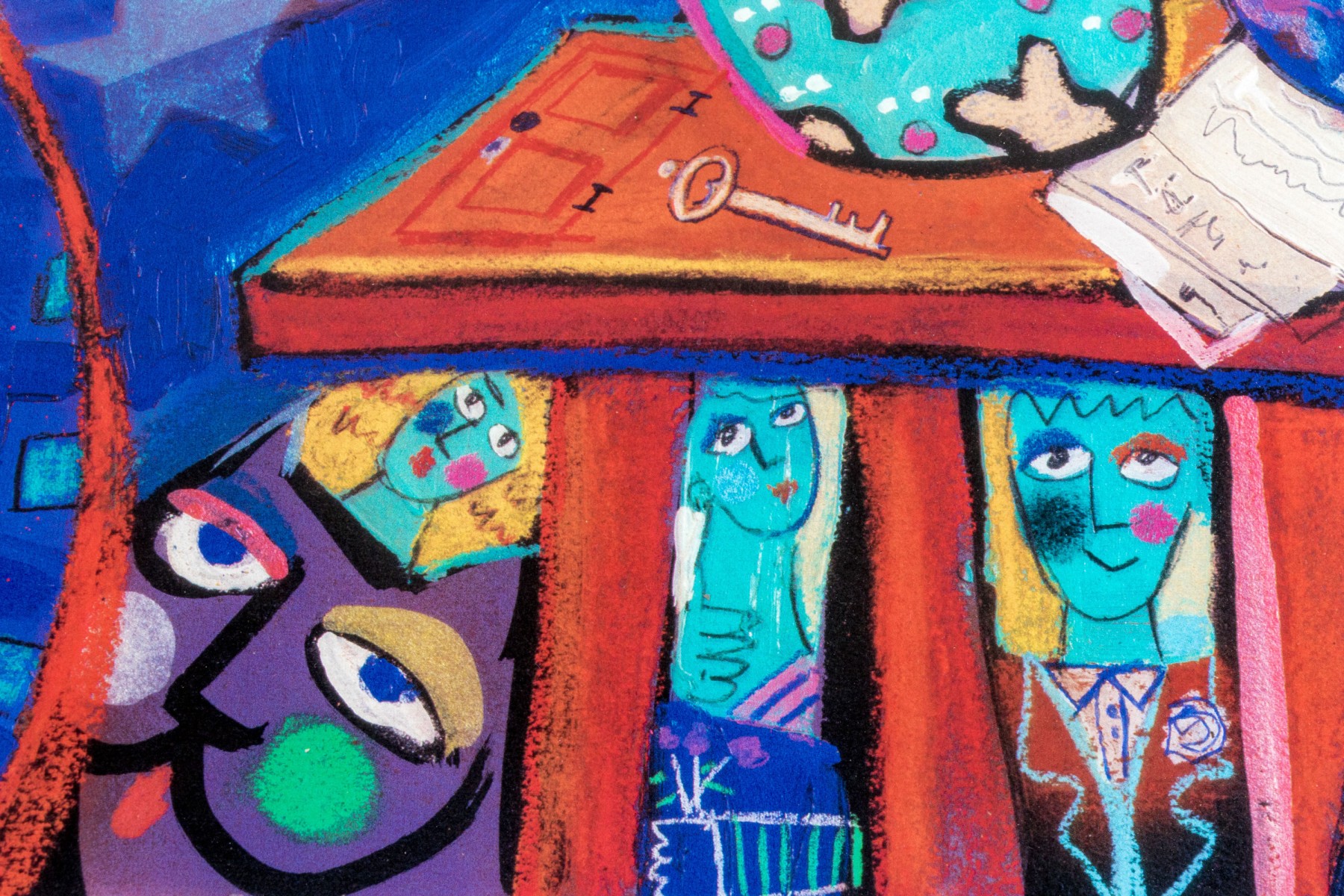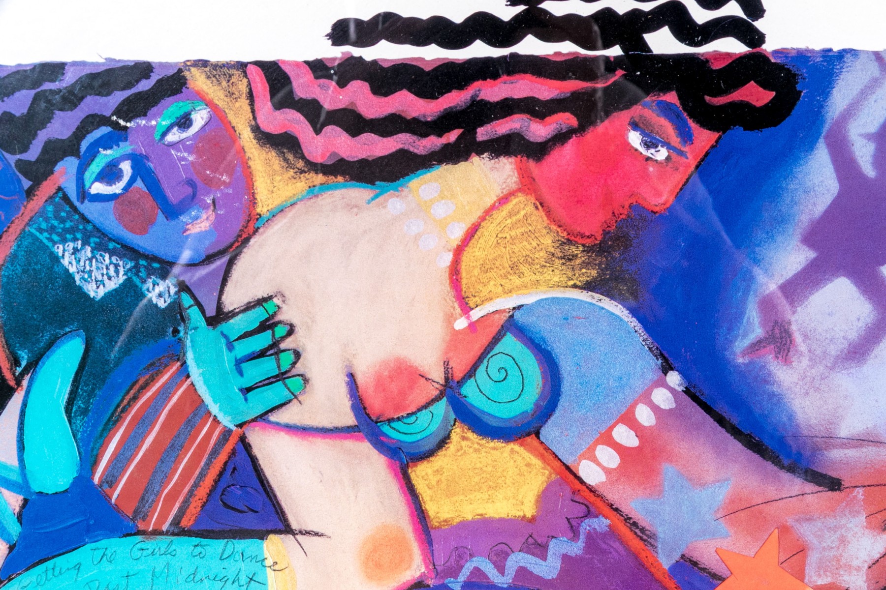 Colorful surreal compositions with figures, faces and taxis, each titled and signed in plate. Presented matted in wood frames and glazed.