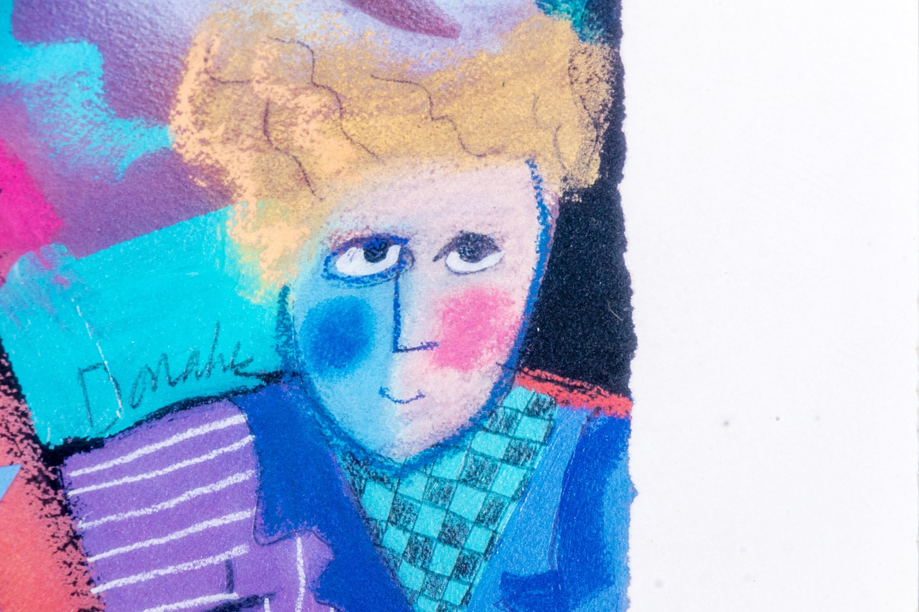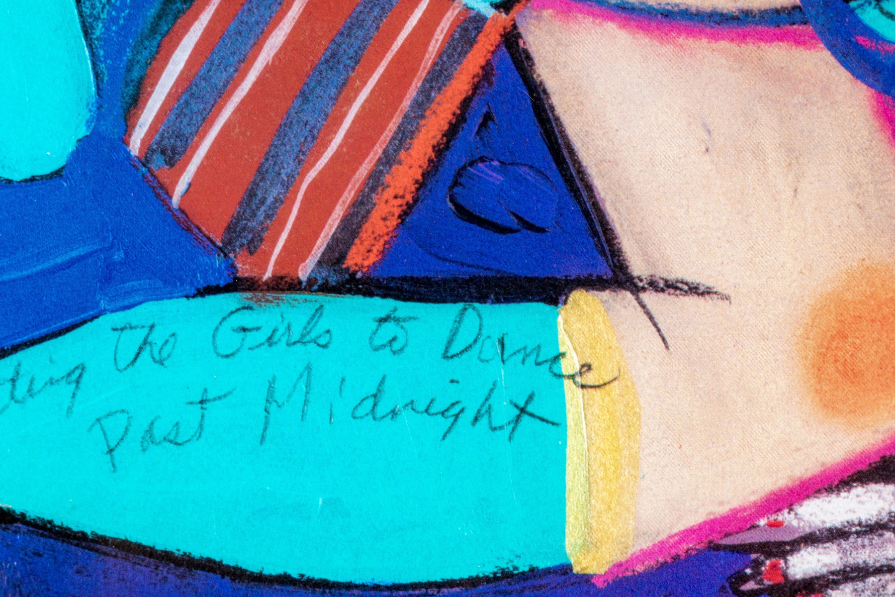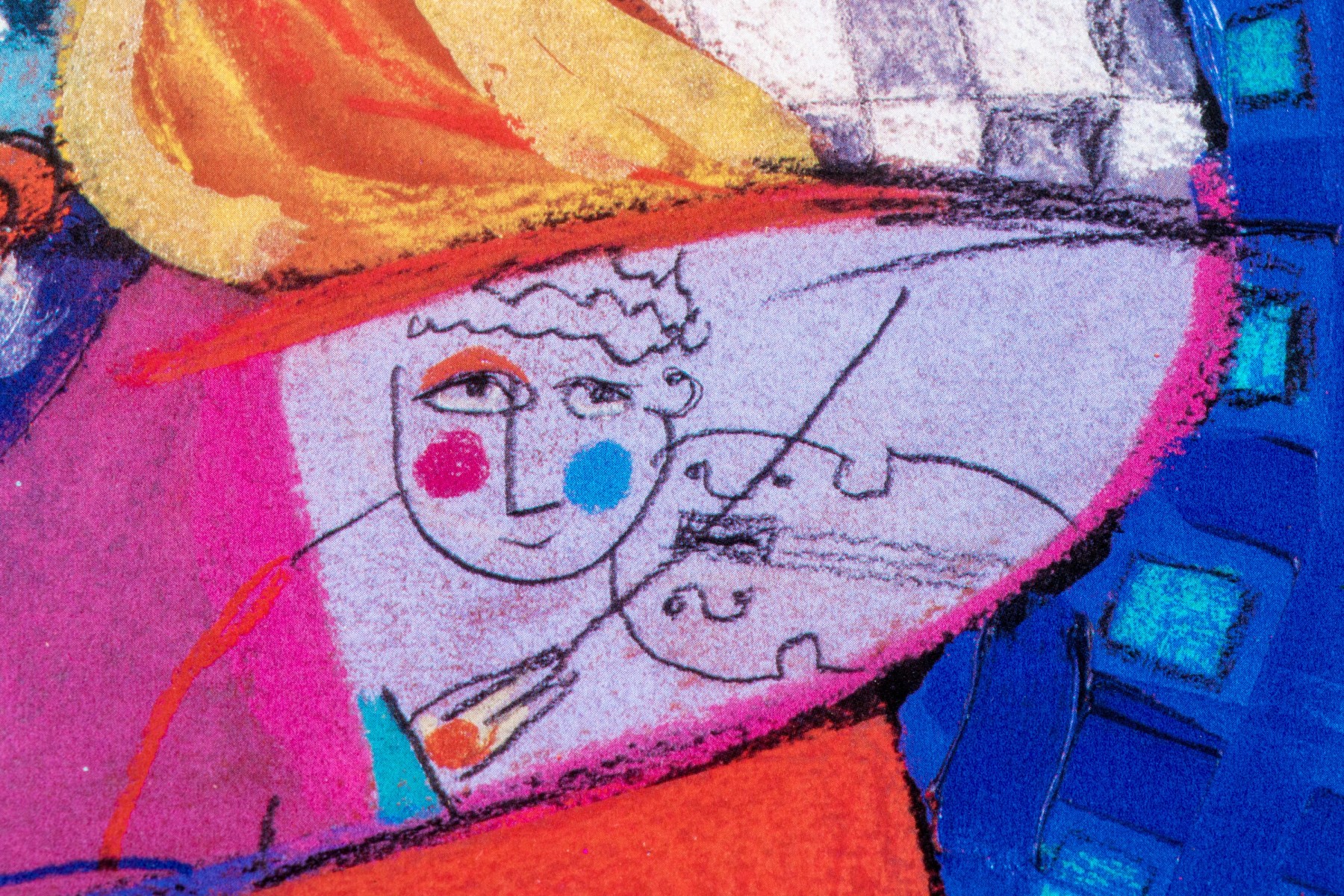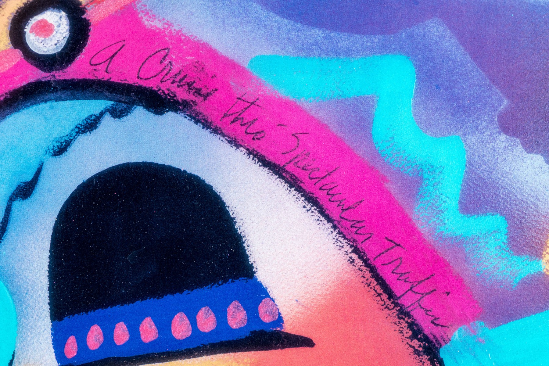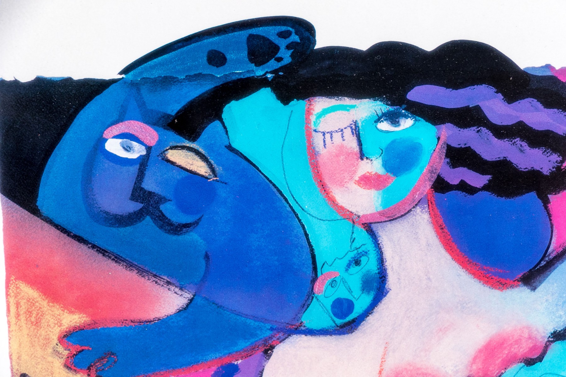 Colorful surreal compositions with figures, faces and taxis, each titled and signed in plate. Presented matted in wood frames and glazed.