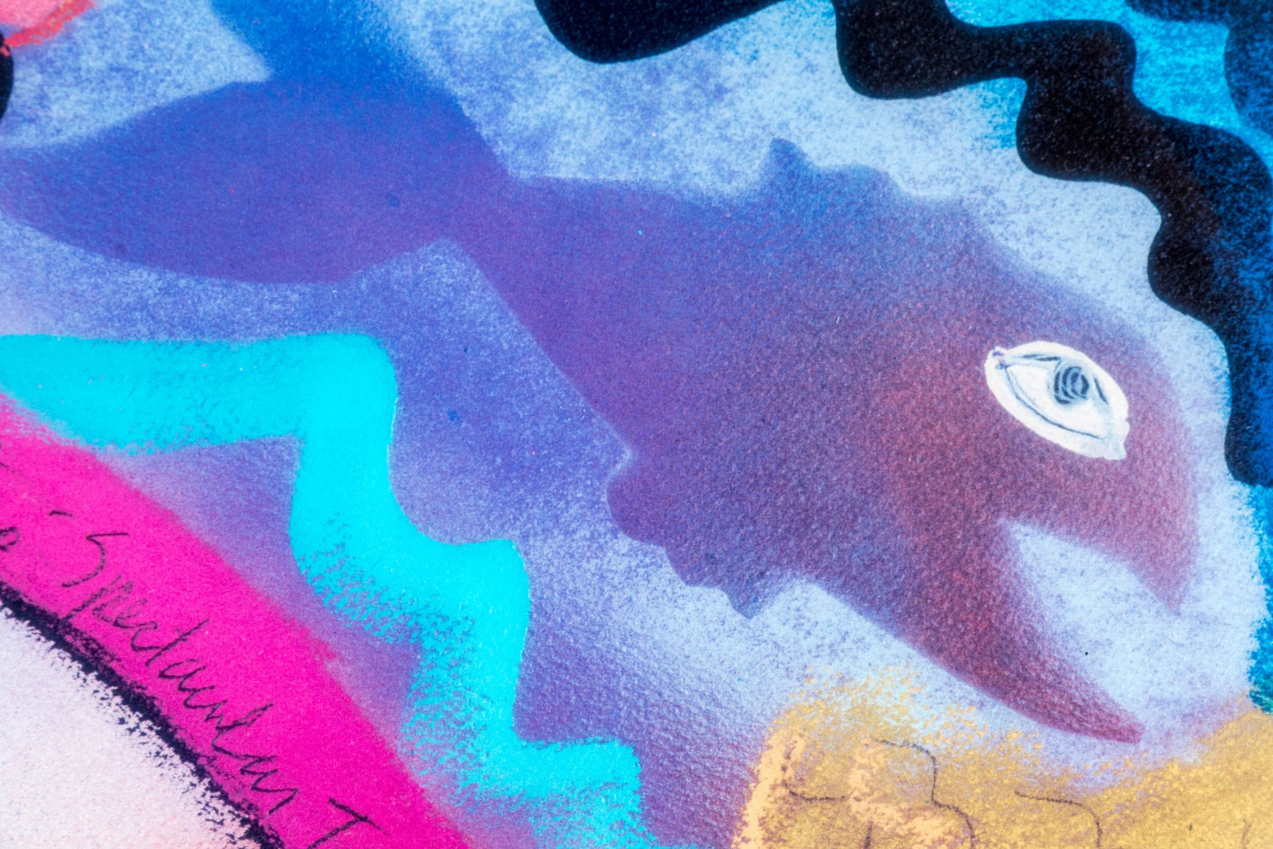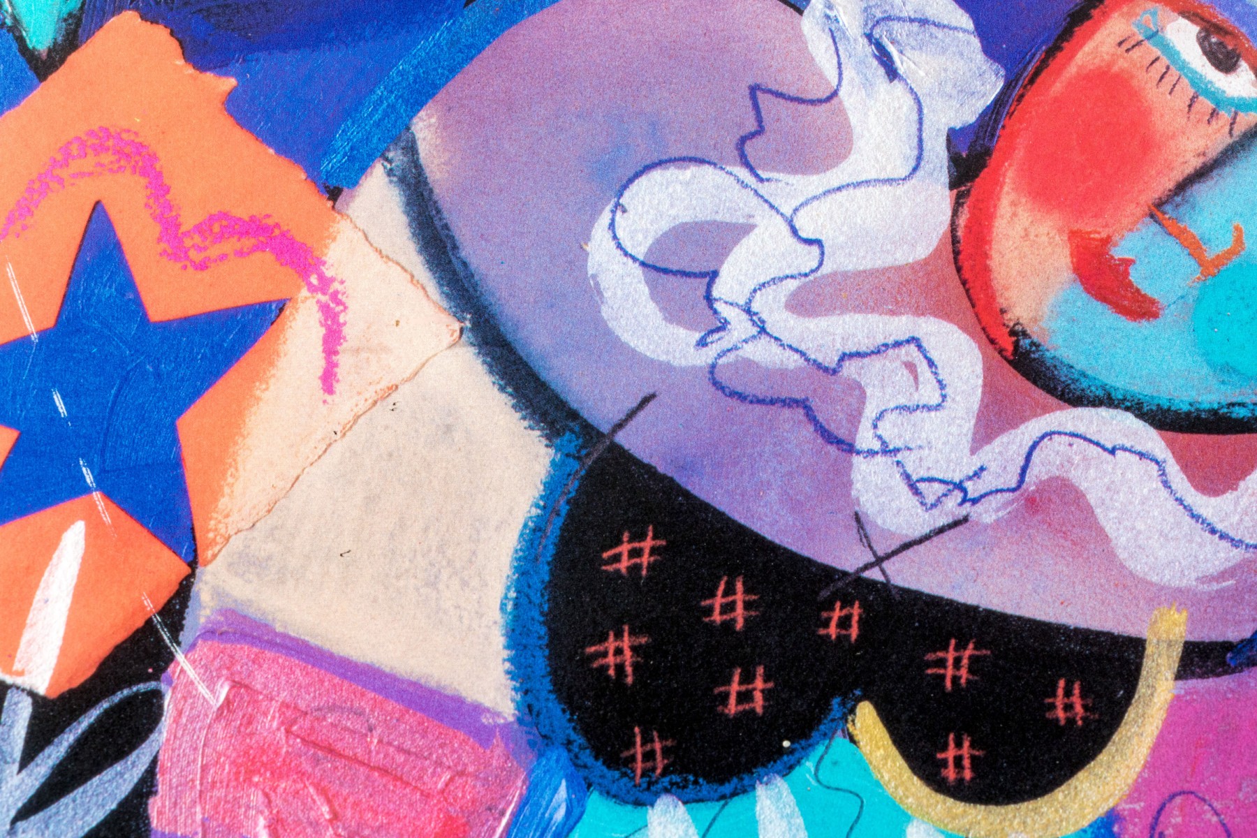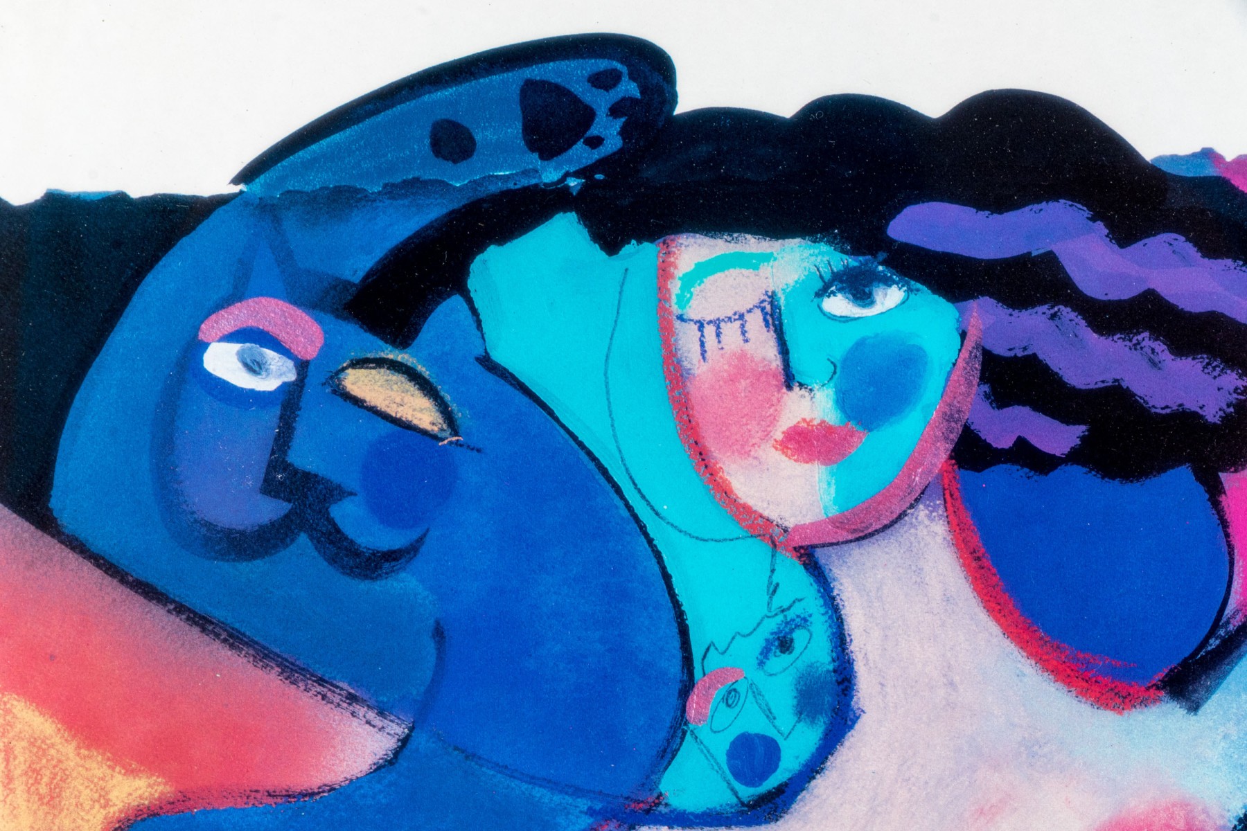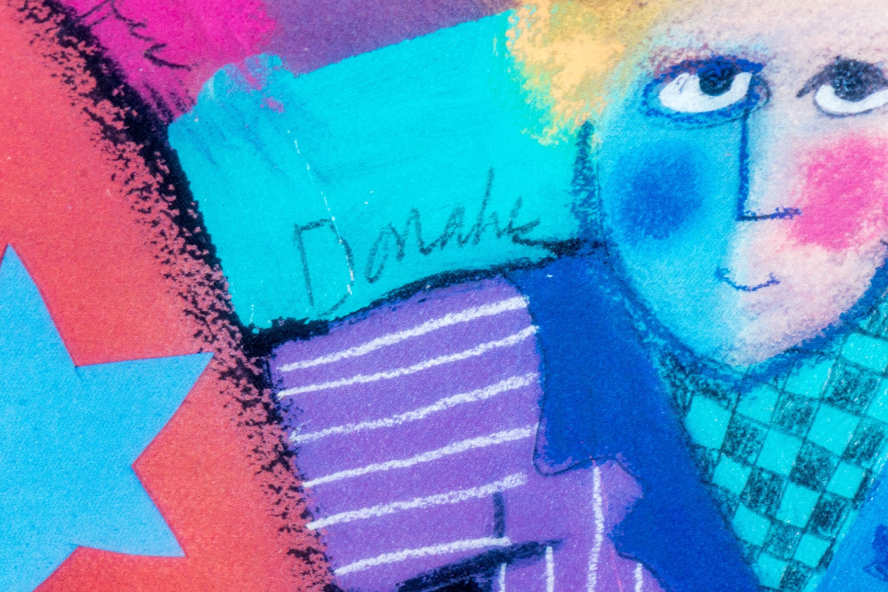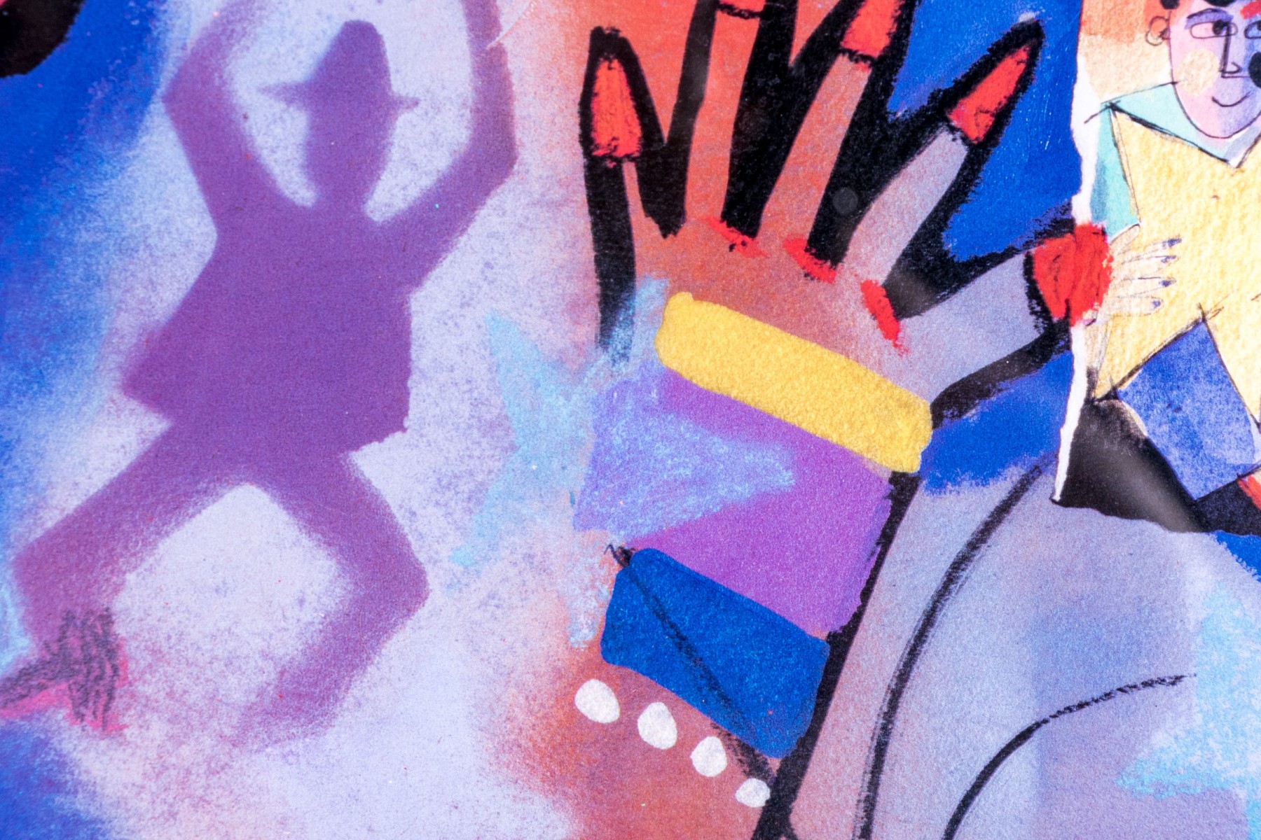 Colorful surreal compositions with figures, faces and taxis, each titled and signed in plate. Presented matted in wood frames and glazed.