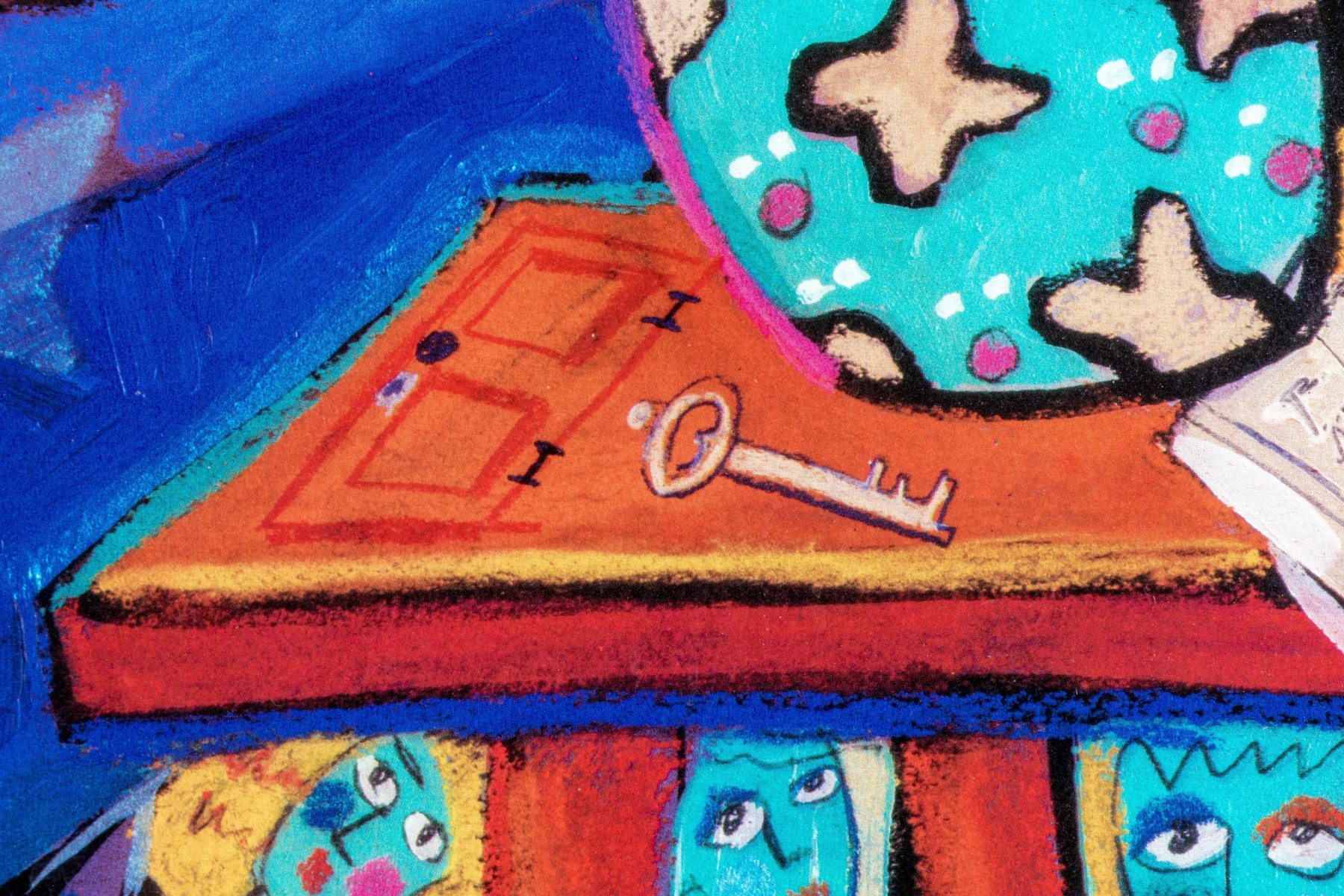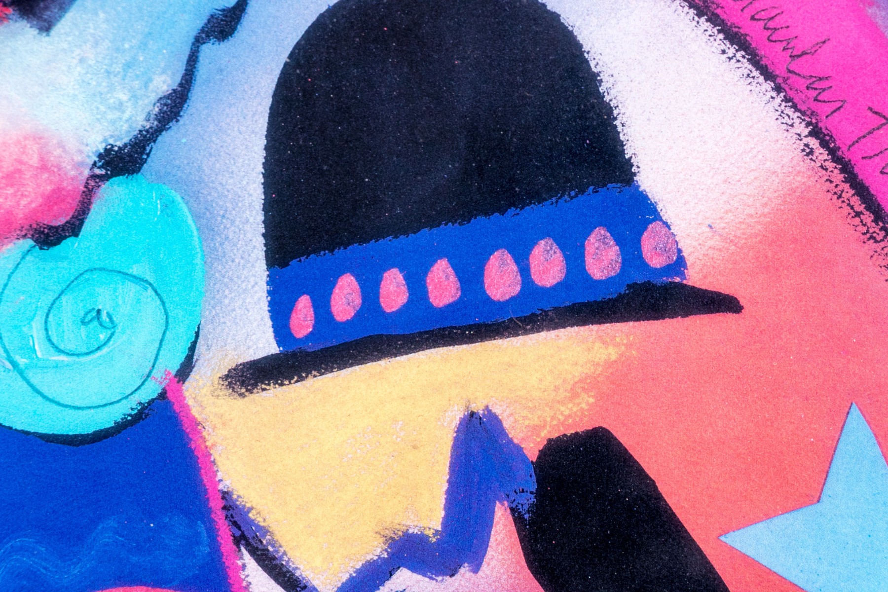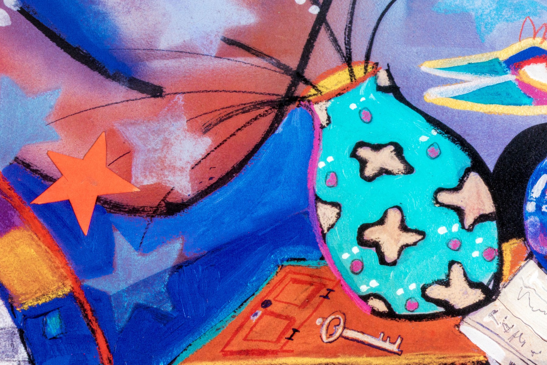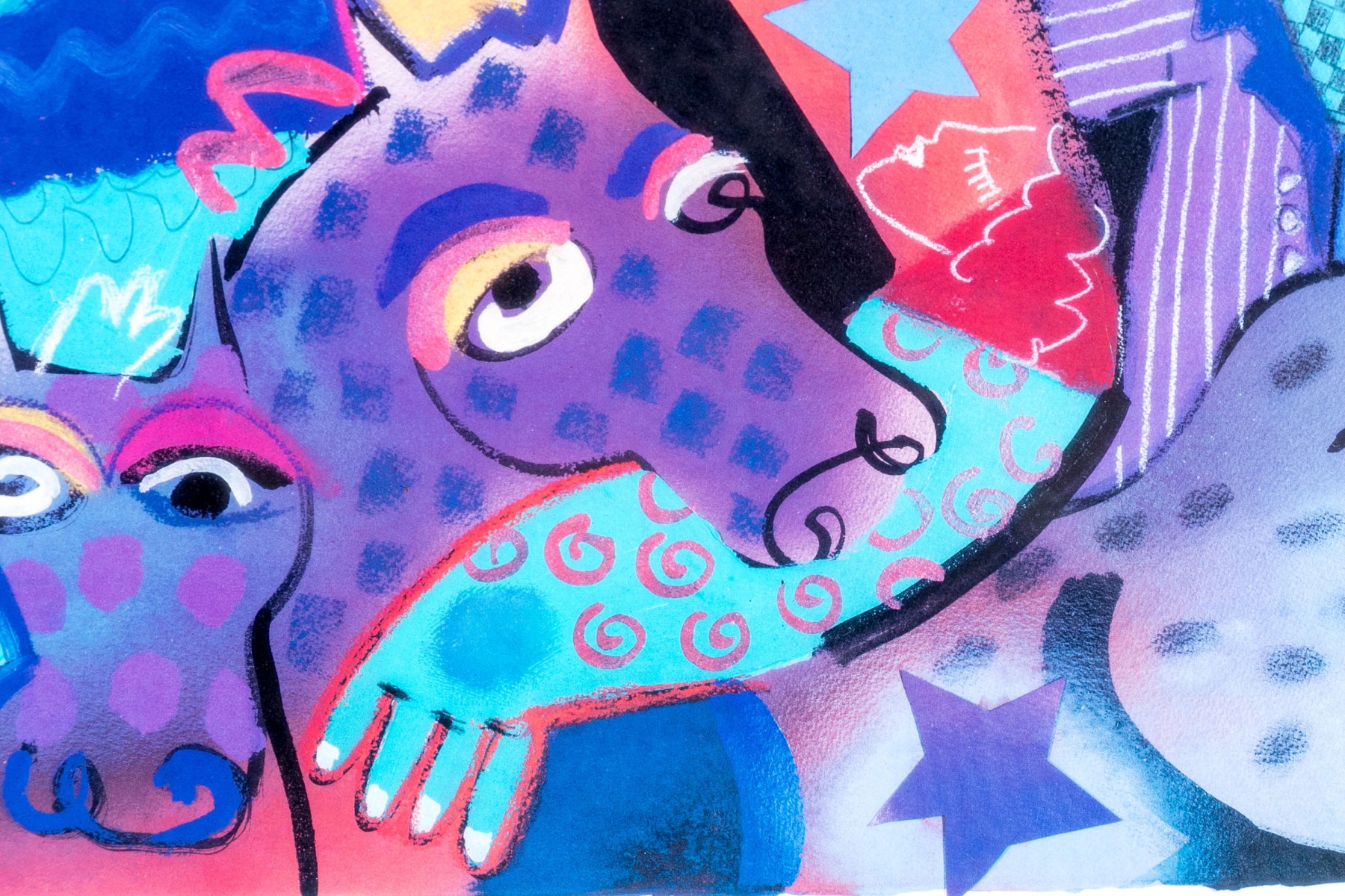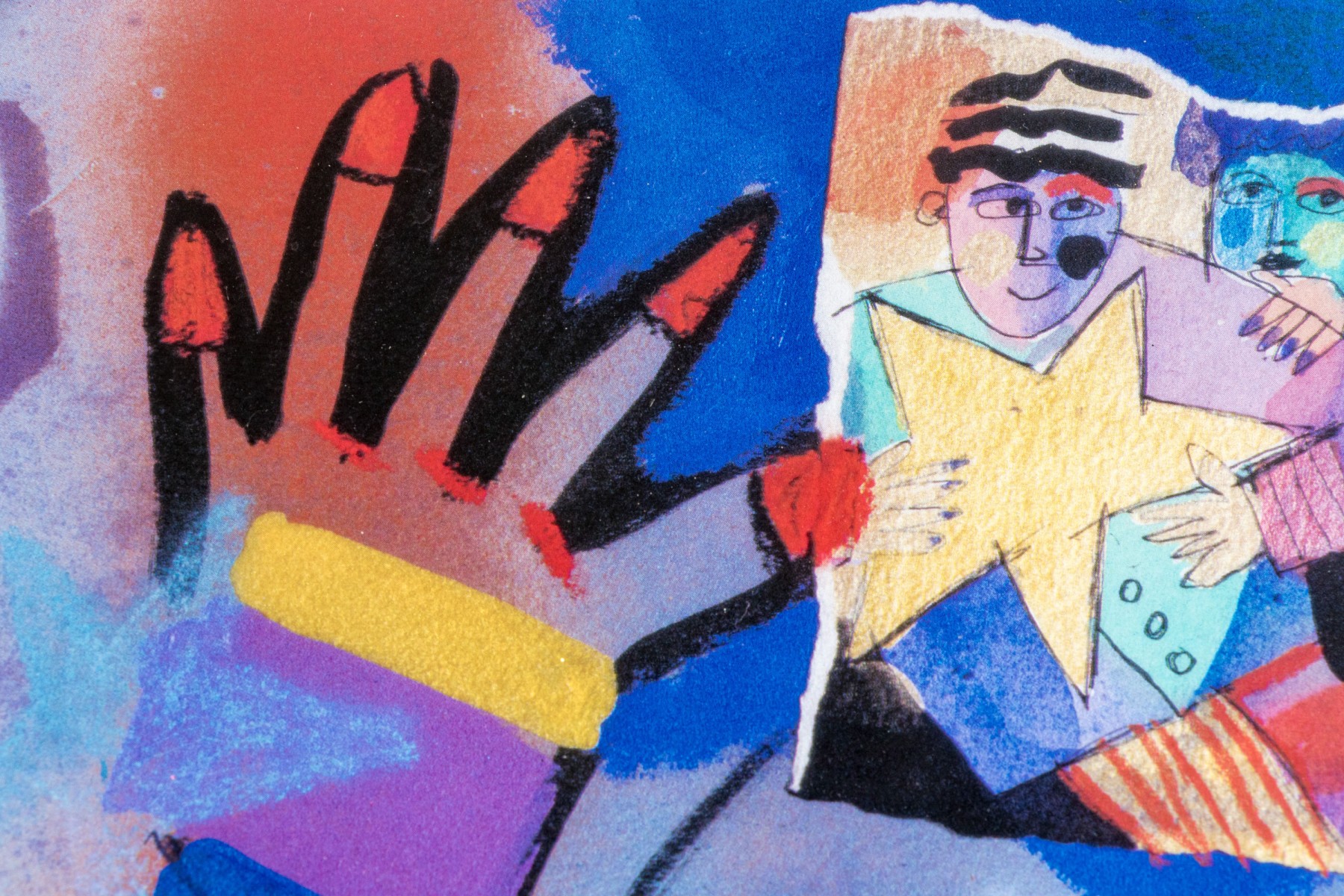 Colorful surreal compositions with figures, faces and taxis, each titled and signed in plate. Presented matted in wood frames and glazed.
