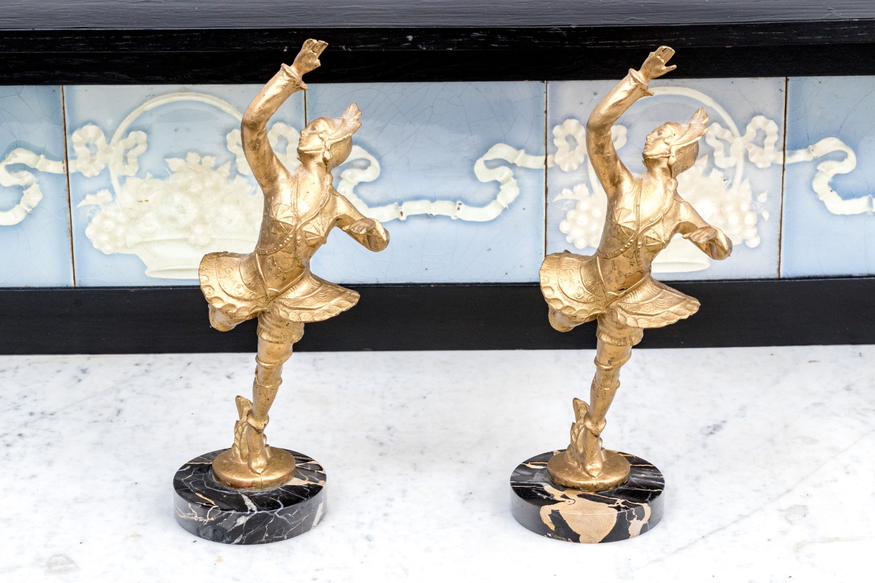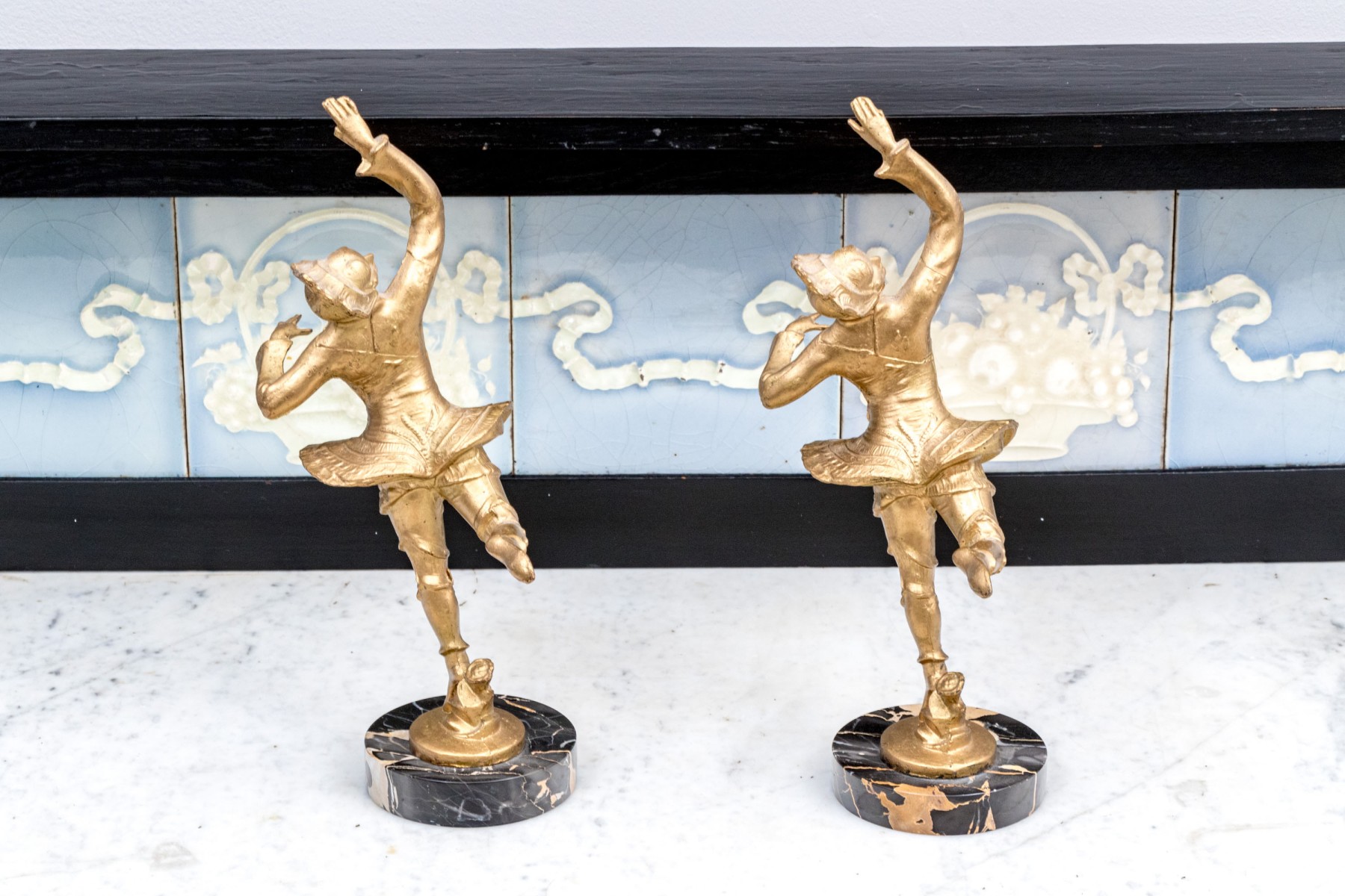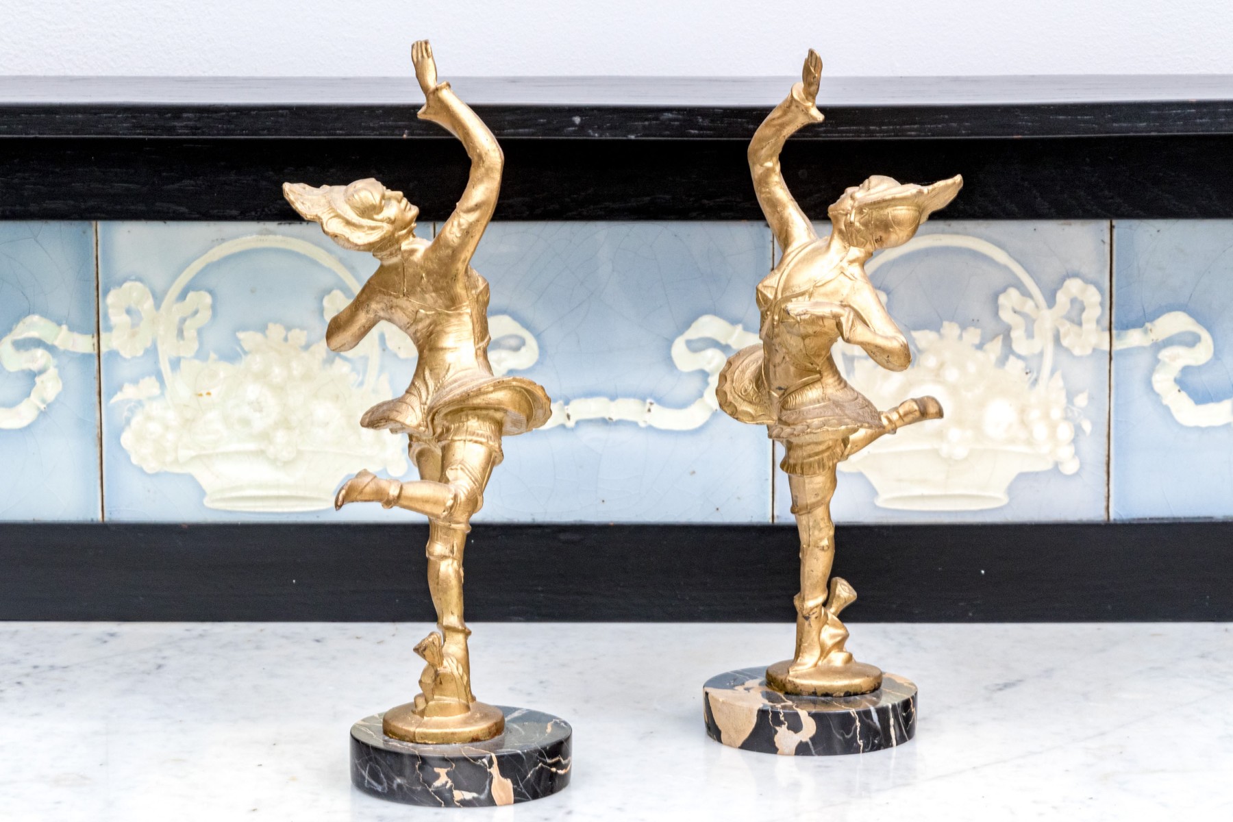 A fabulous pair of French art deco figures of dancers in a luxurious gilt finish. Both dancers presented balanced on one leg with the other raised as if twirling. Each is presented as though dressed in ballerina attire with flared skirts. The figures are raised on black marble bases.