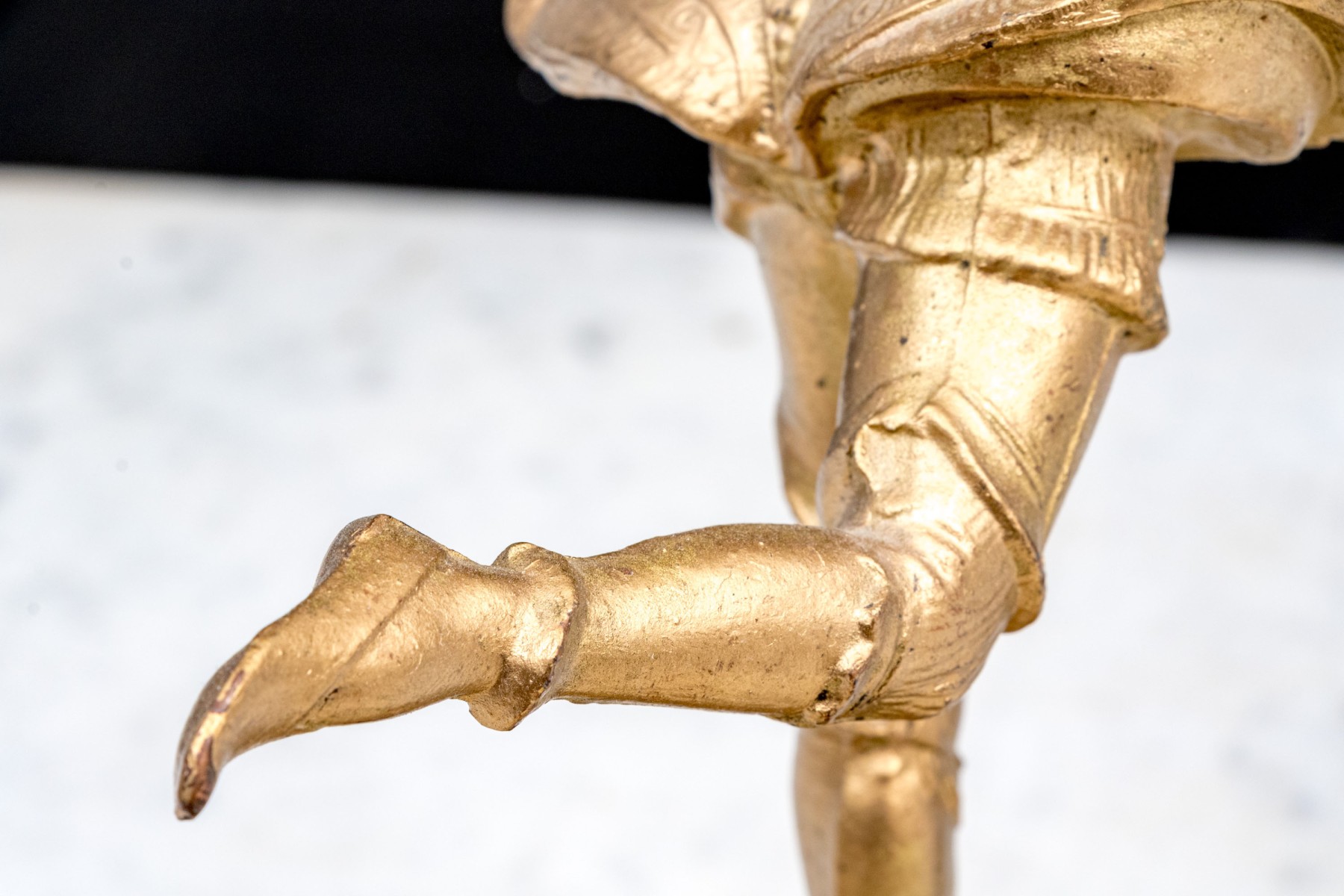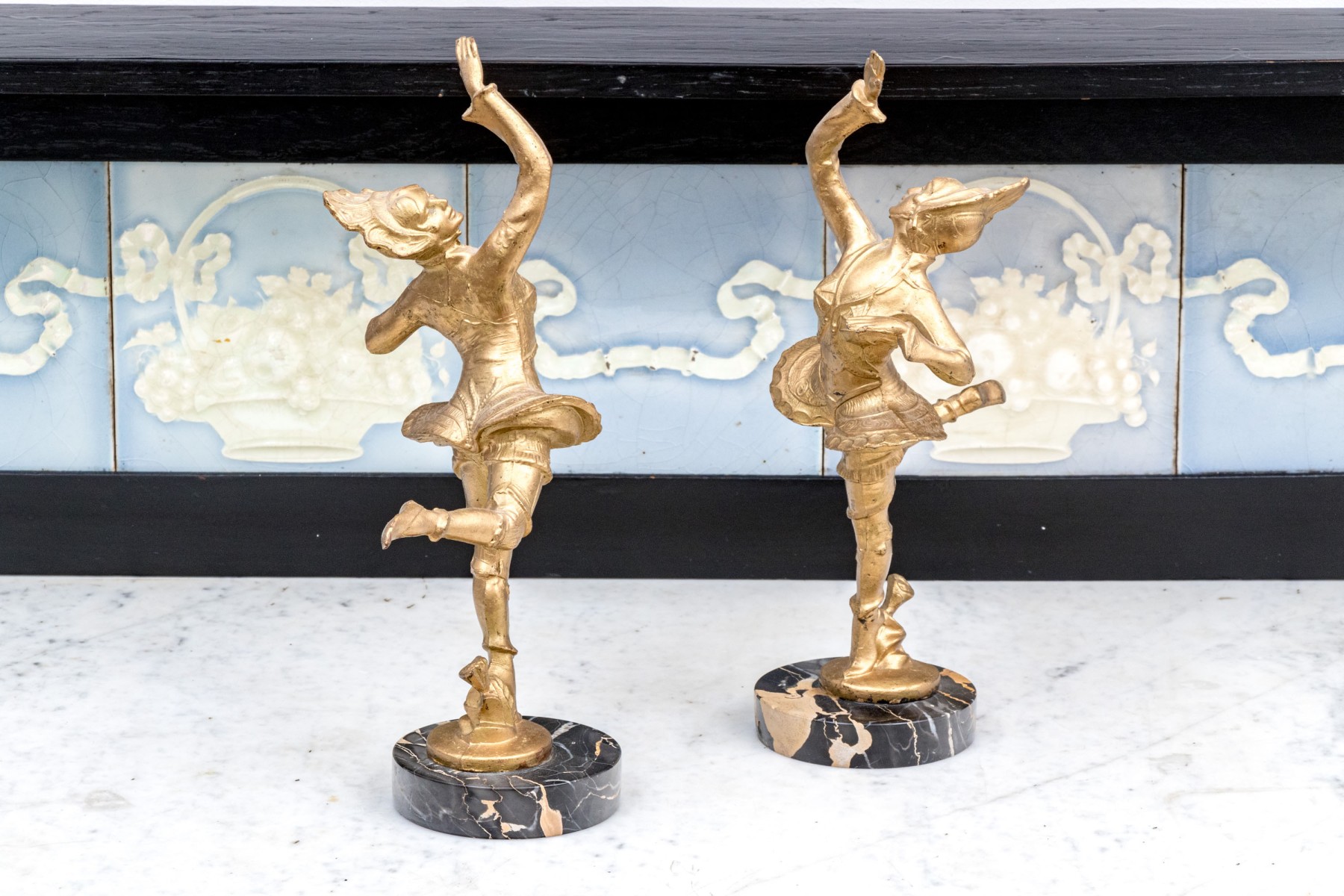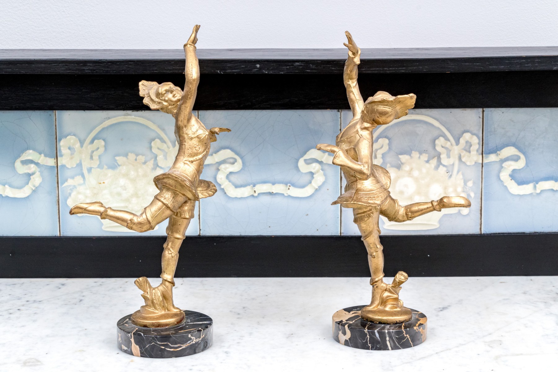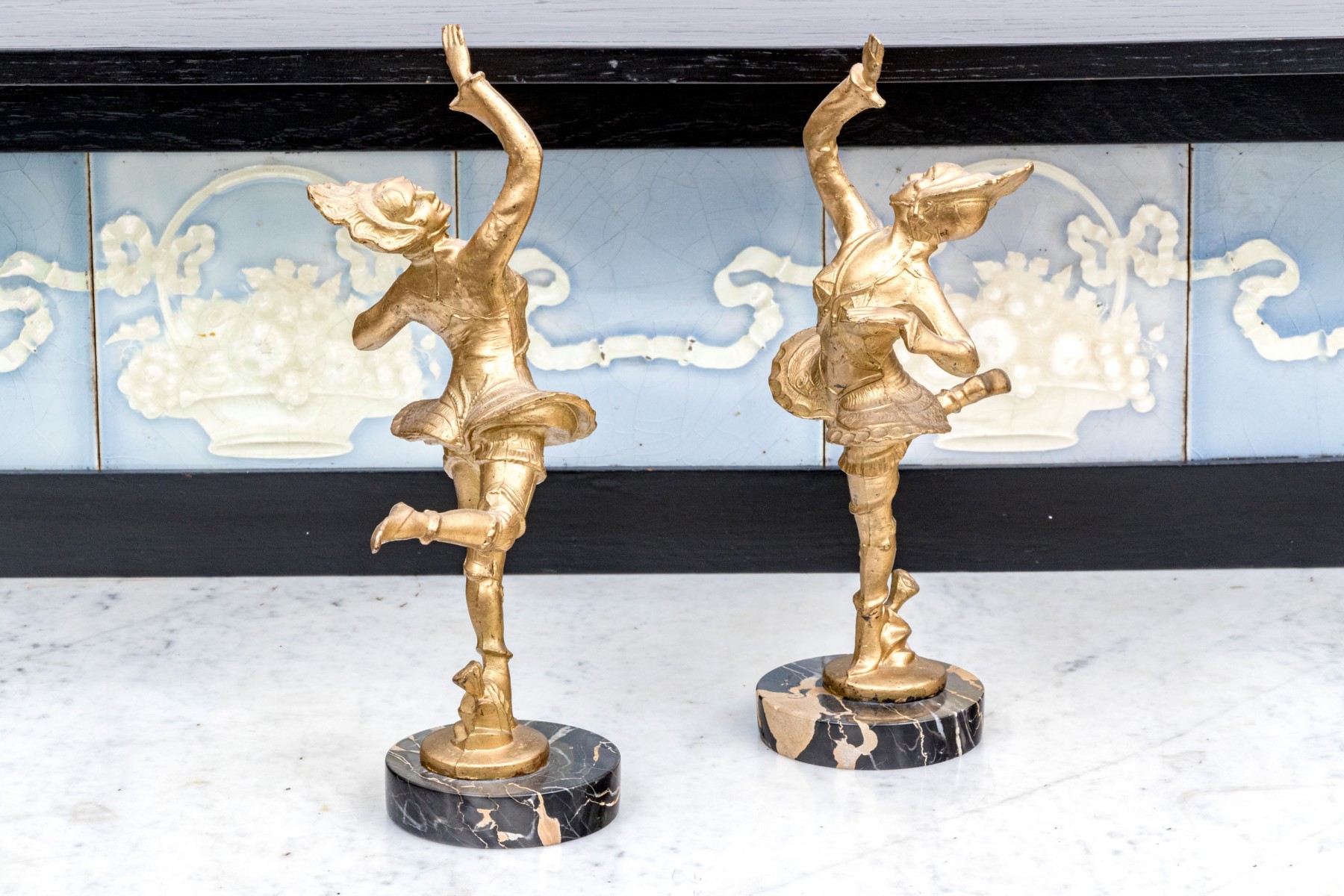 A fabulous pair of French art deco figures of dancers in a luxurious gilt finish. Both dancers presented balanced on one leg with the other raised as if twirling. Each is presented as though dressed in ballerina attire with flared skirts. The figures are raised on black marble bases.