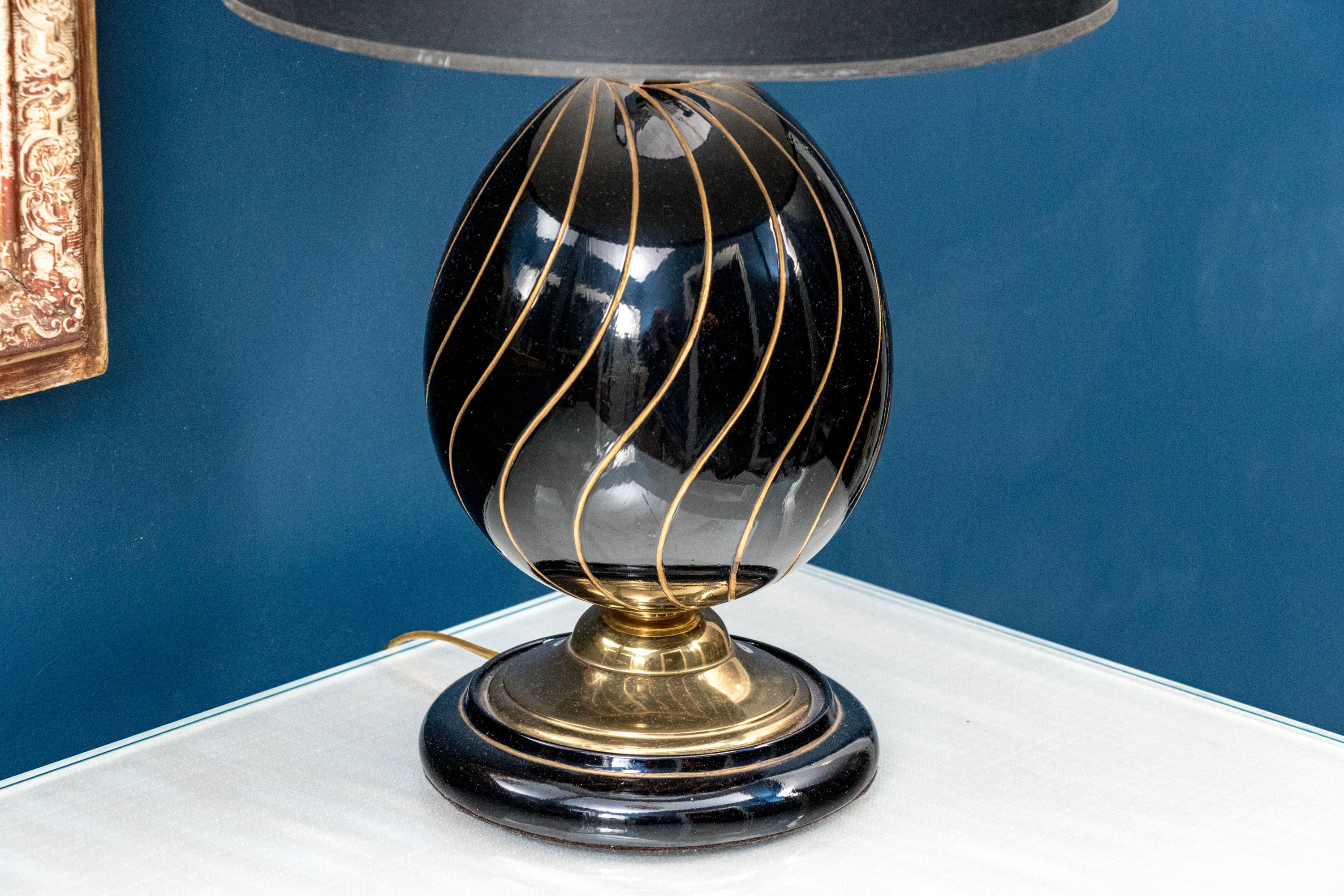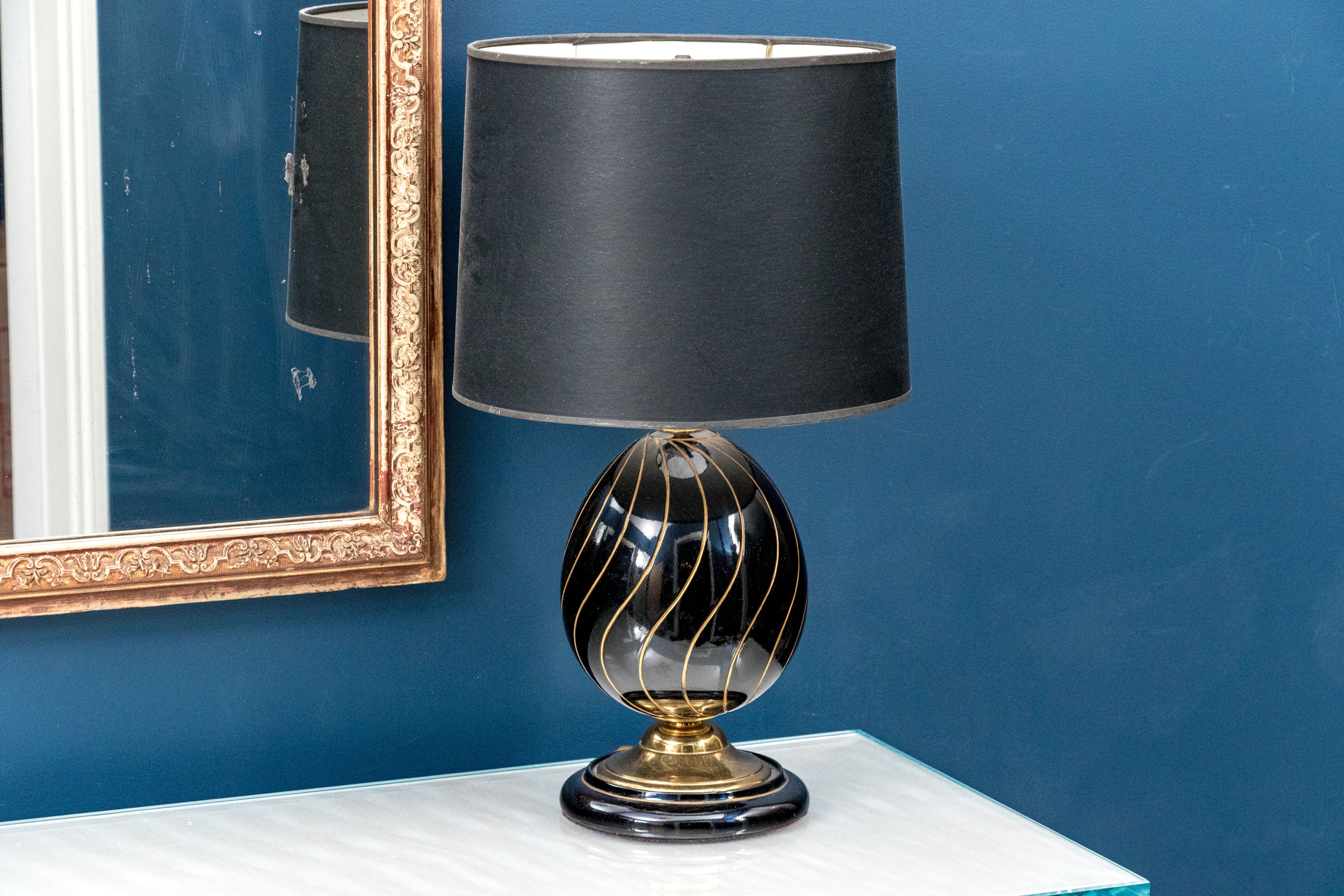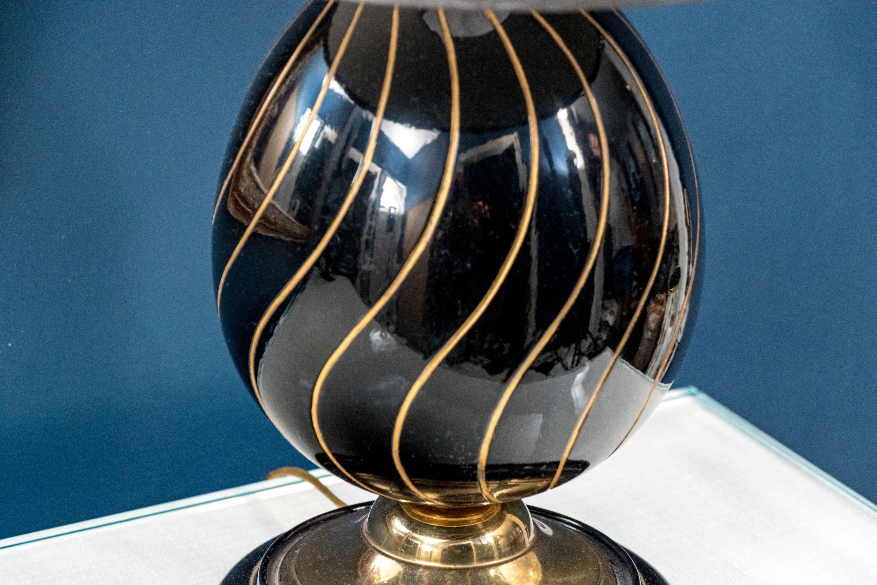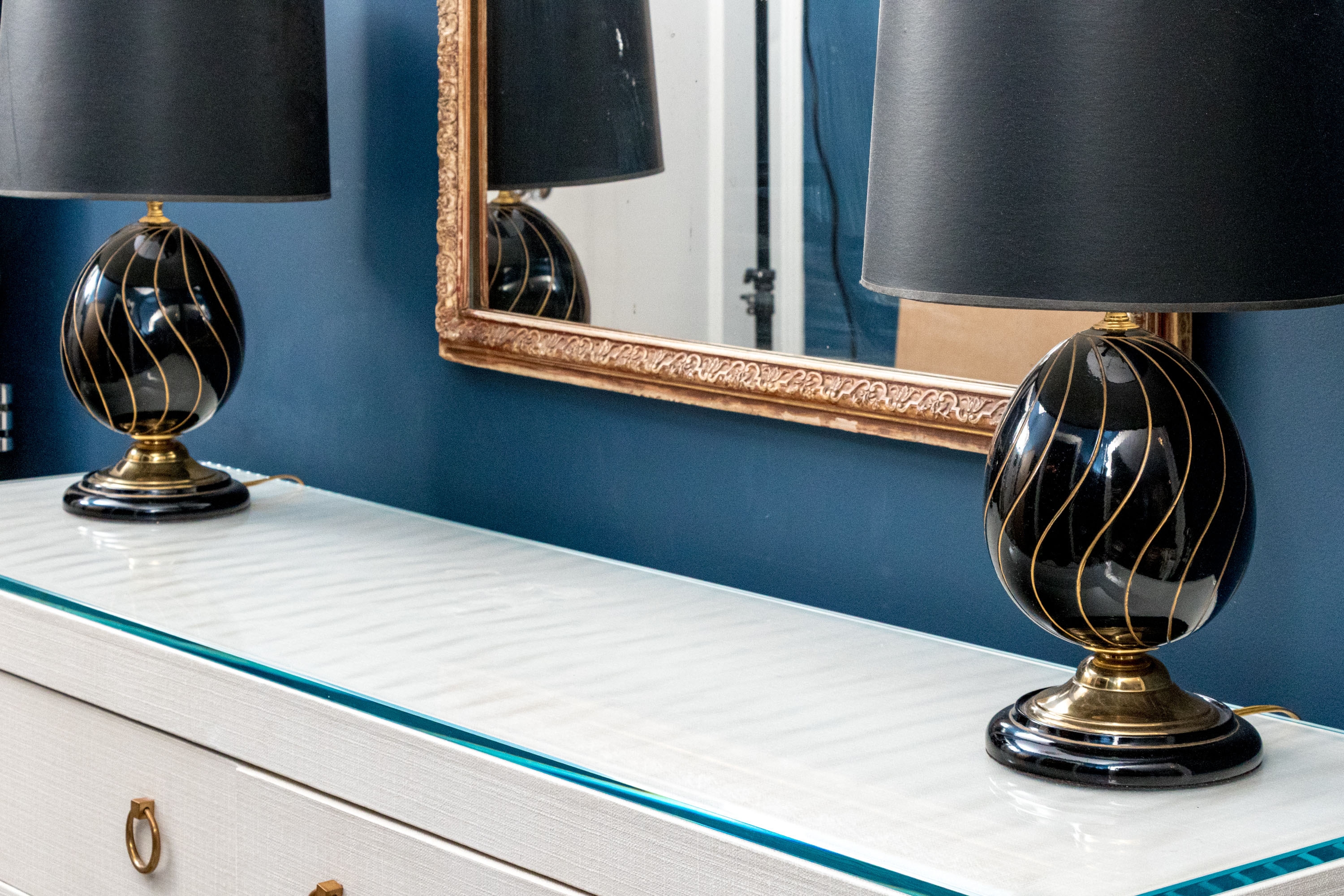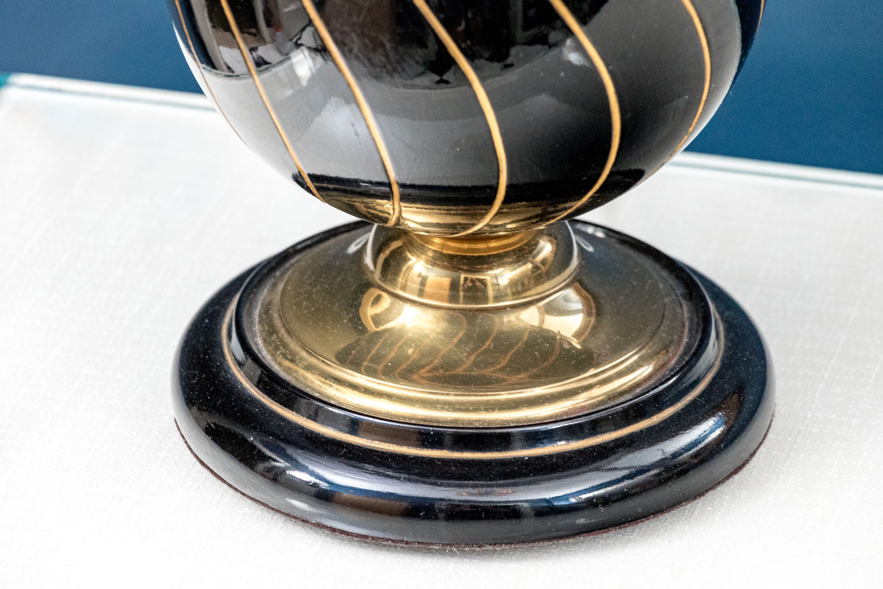 On circular bases with egg form bodies with black finish and carved and gilt swirled vertical lines. Each with black shade and finial.