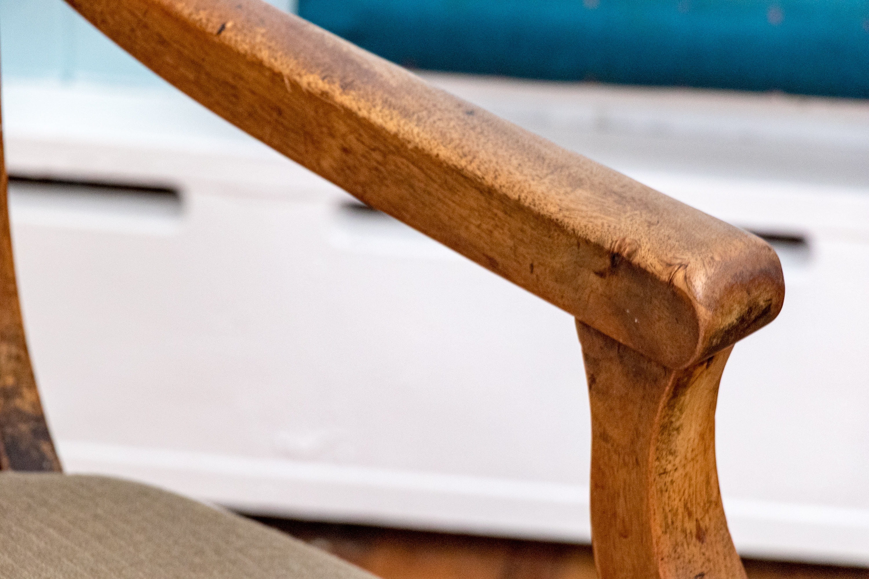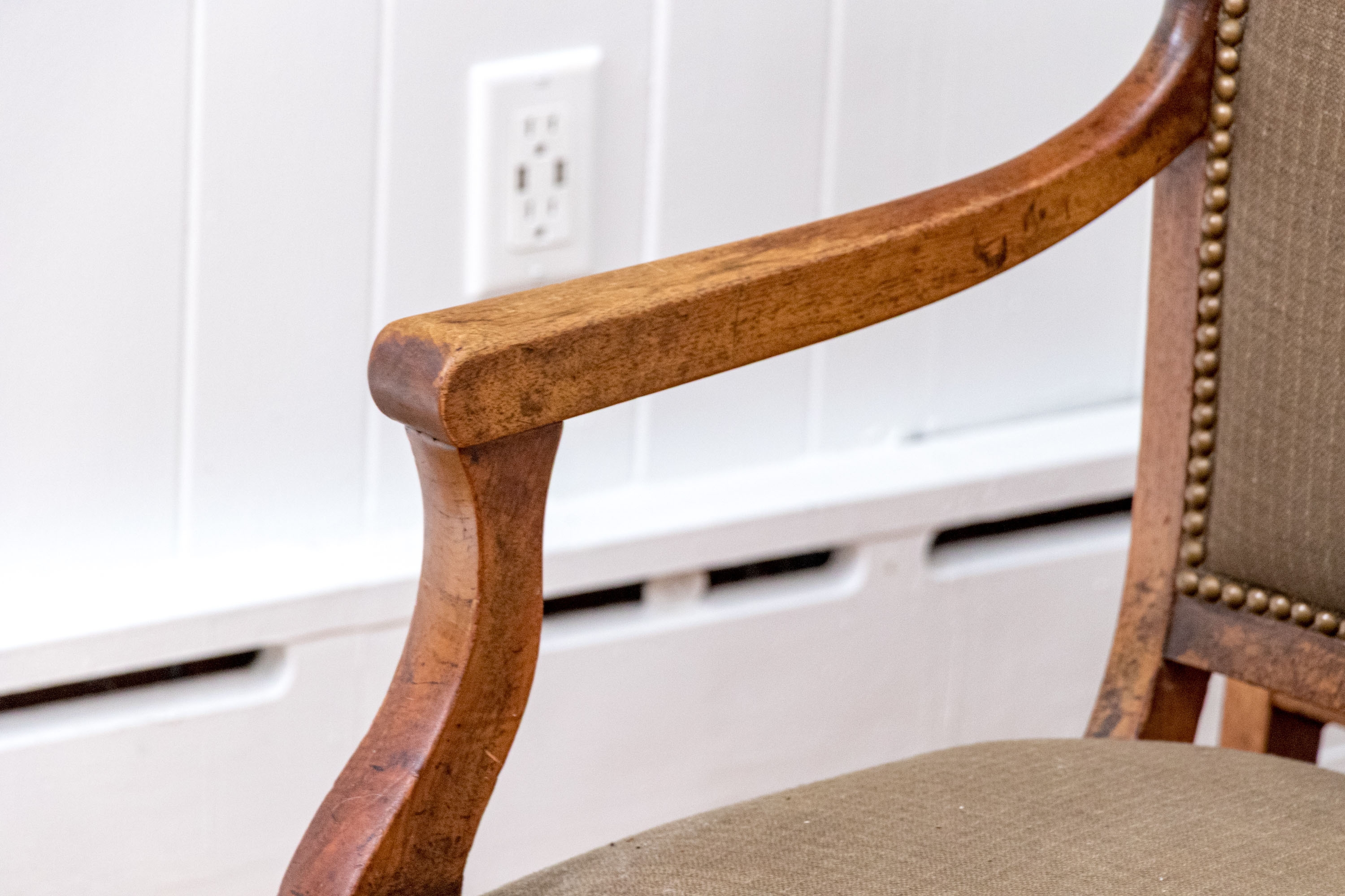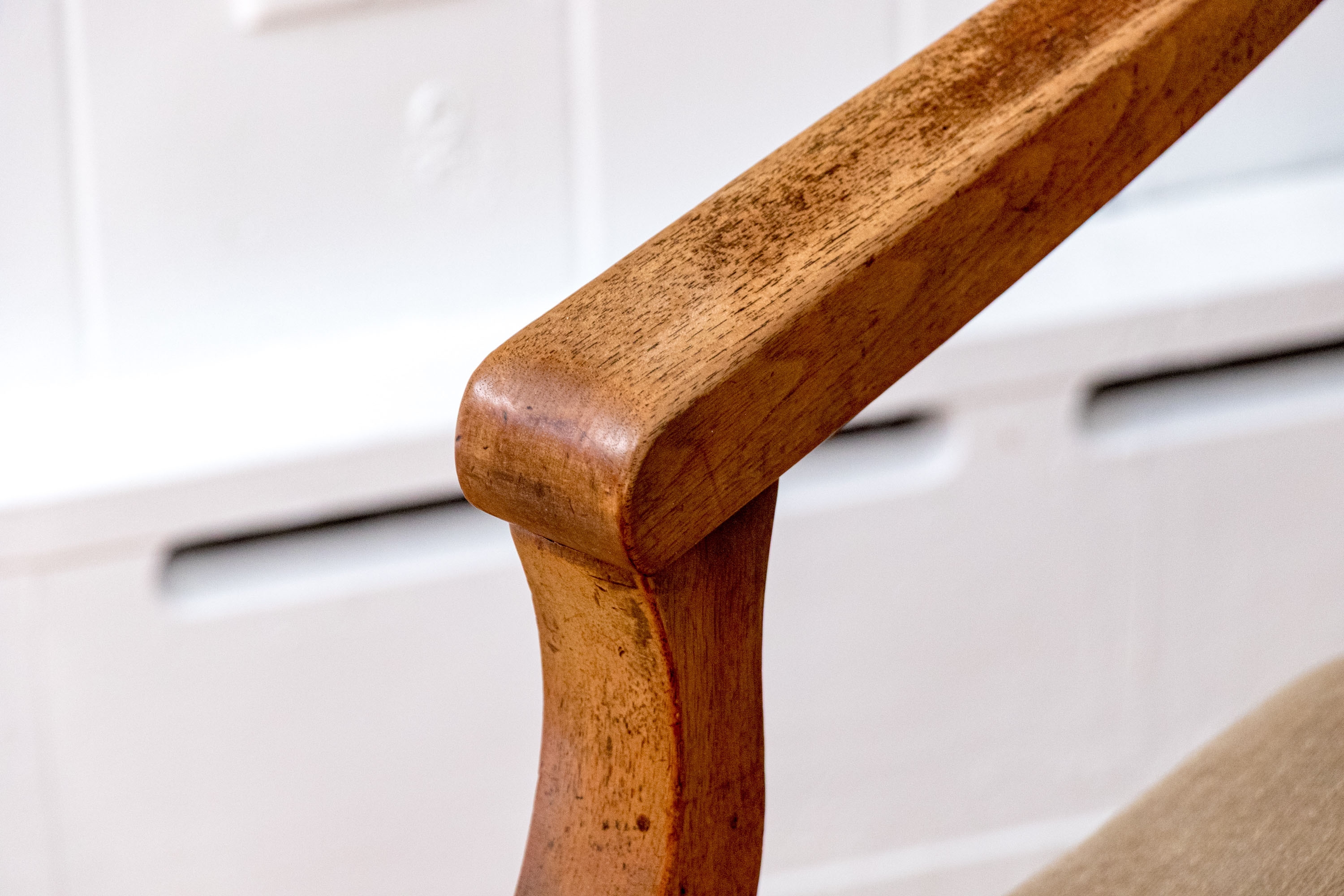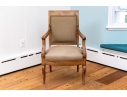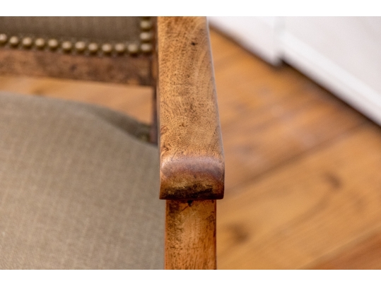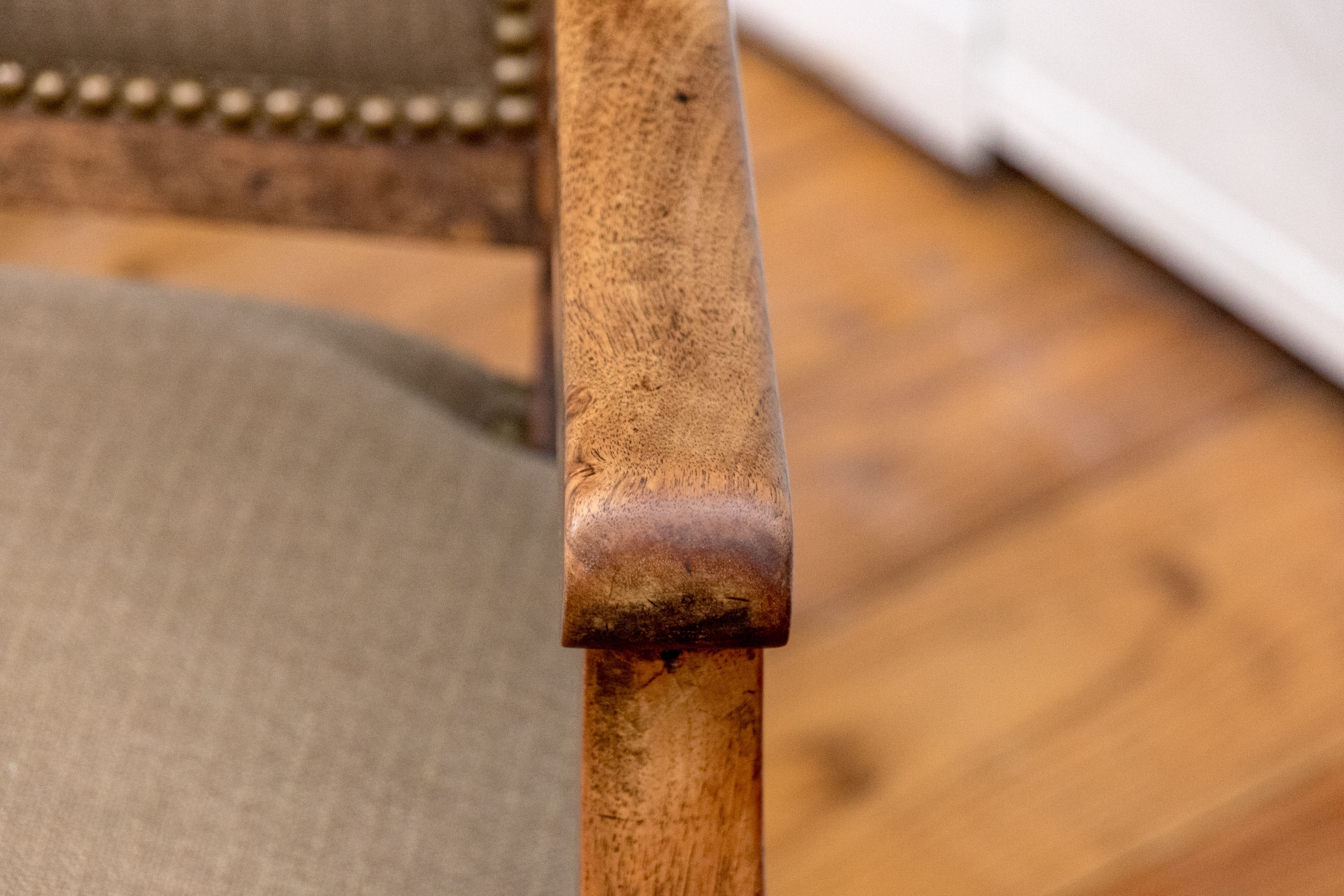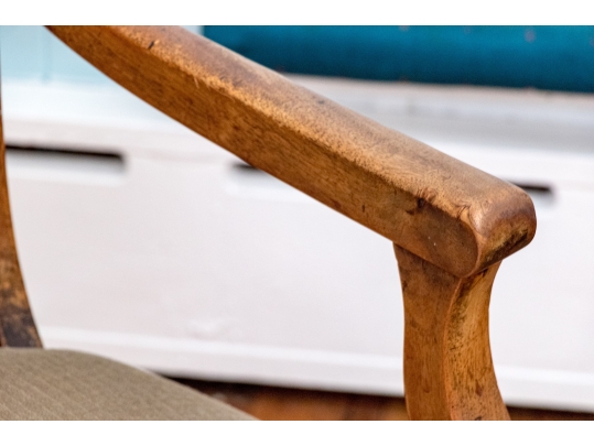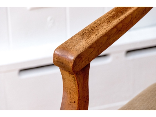 Condition: Wear to the finish especially to armrests, one with tiny age split to top rail; worn and stained upholstery. Please see photos for details of condition.