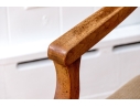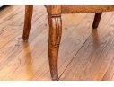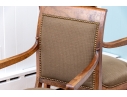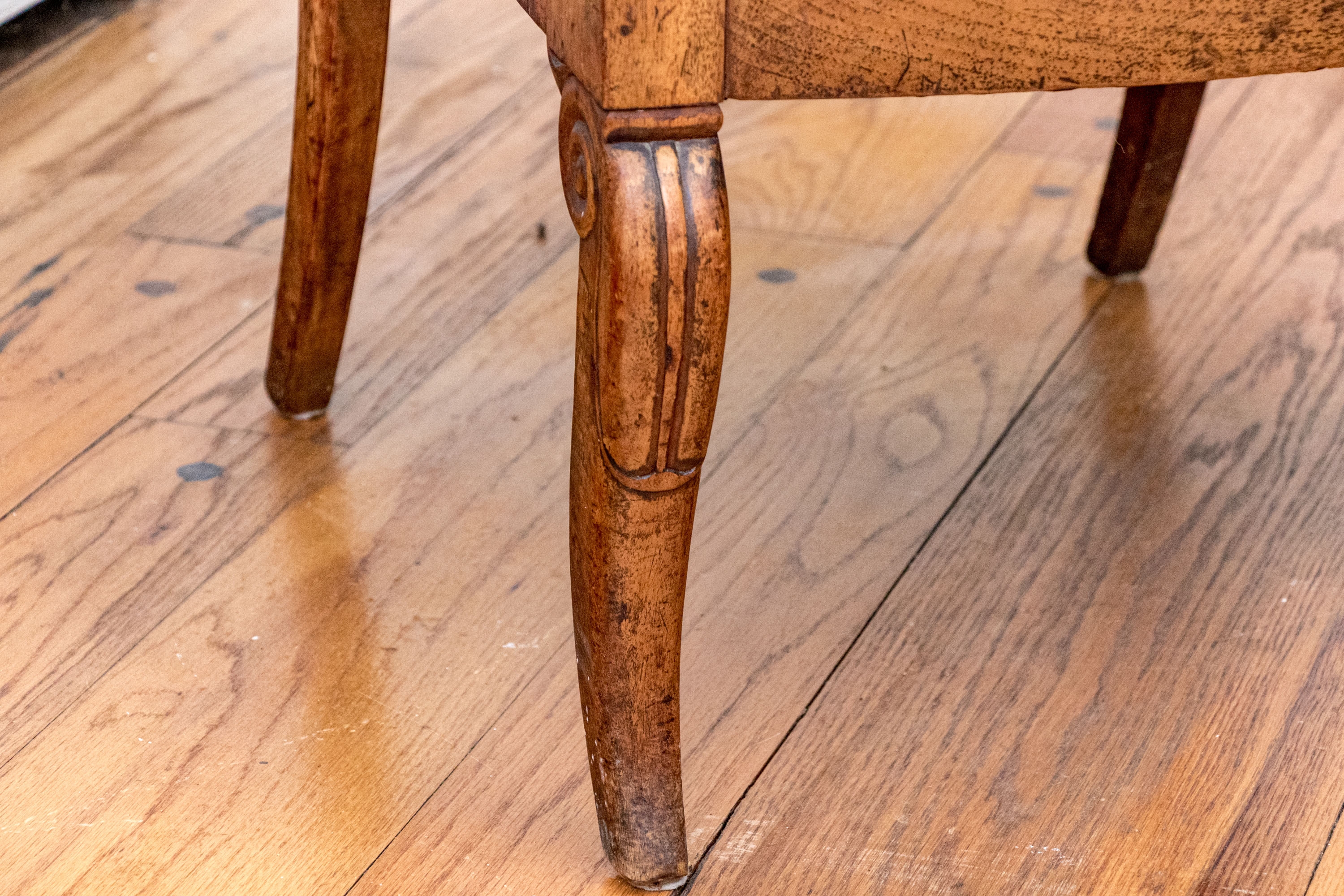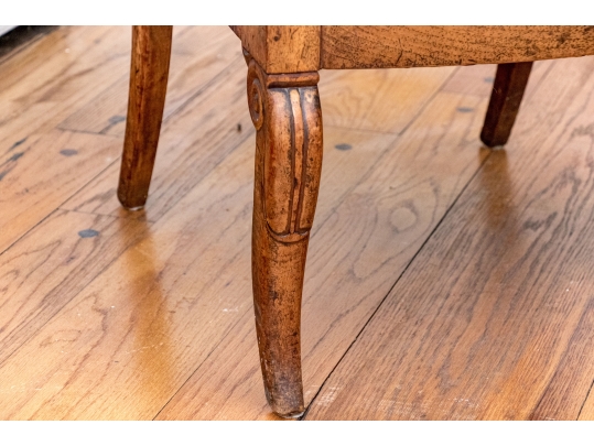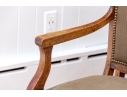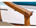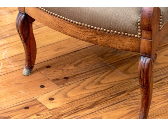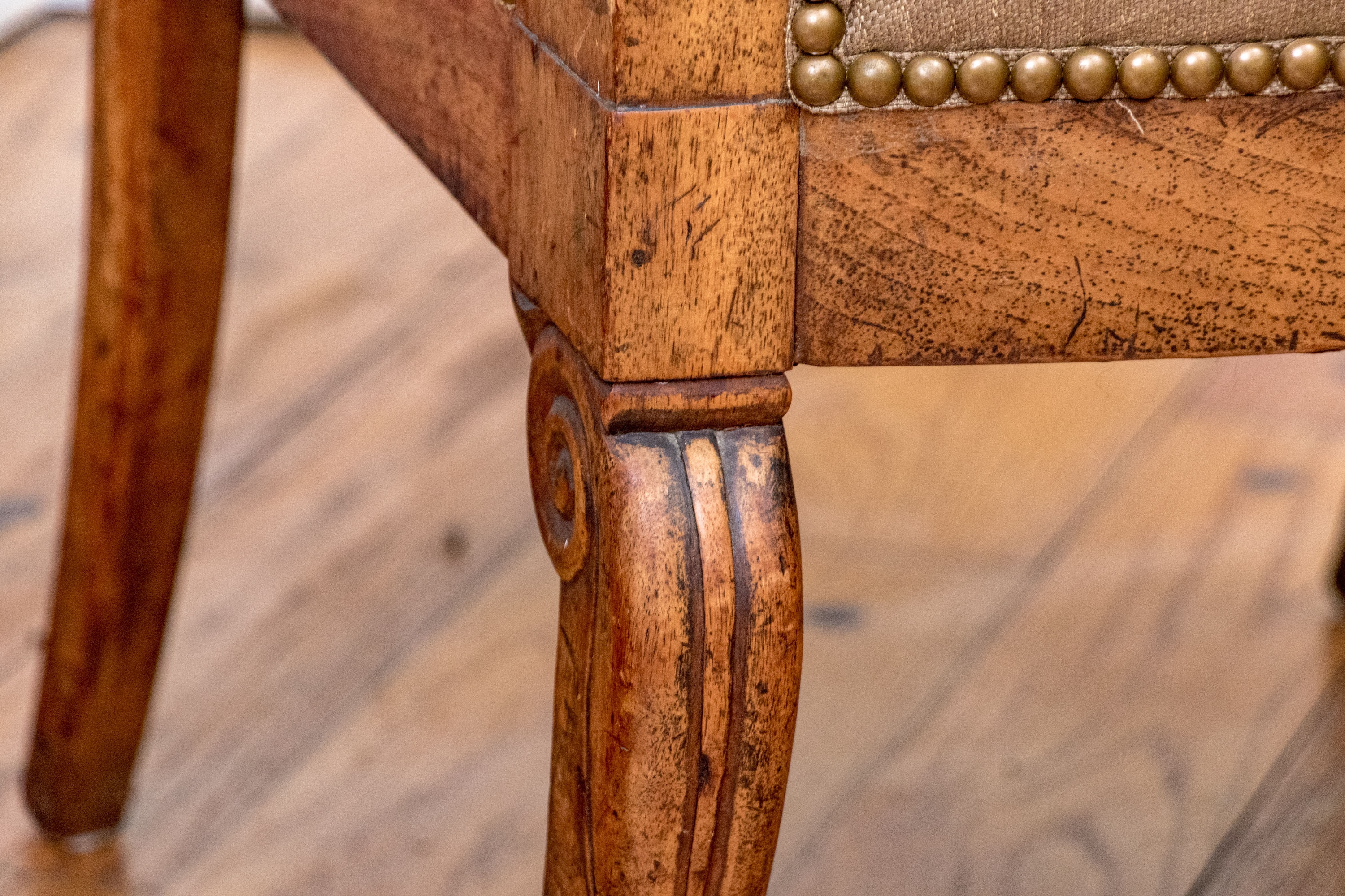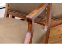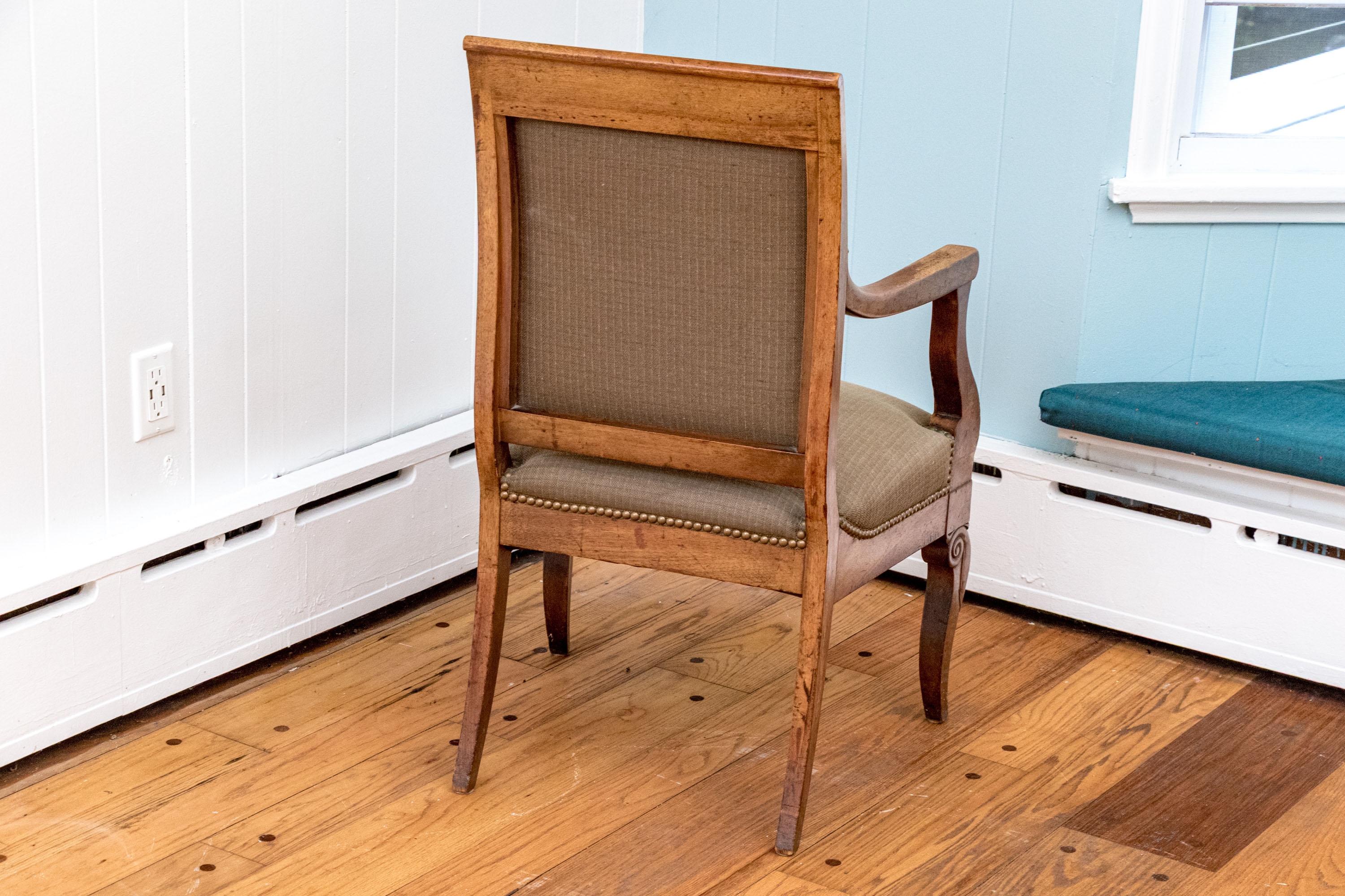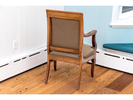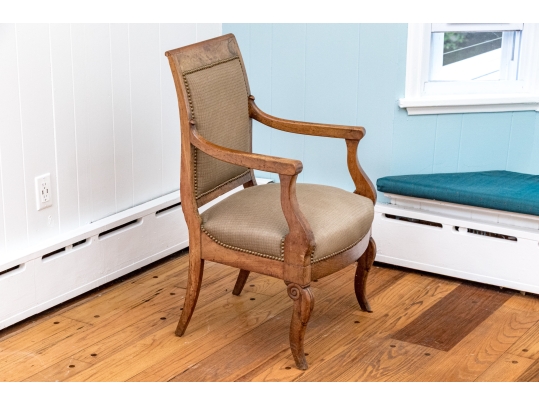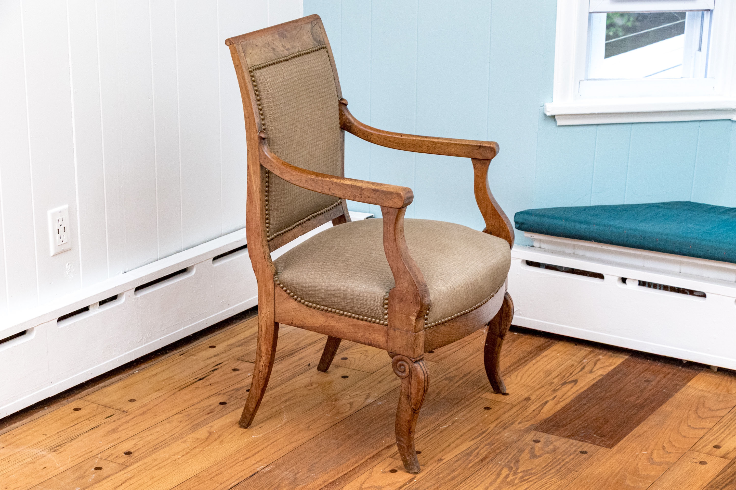 Condition: Wear to the finish especially to armrests, one with tiny age split to top rail; worn and stained upholstery. Please see photos for details of condition.
