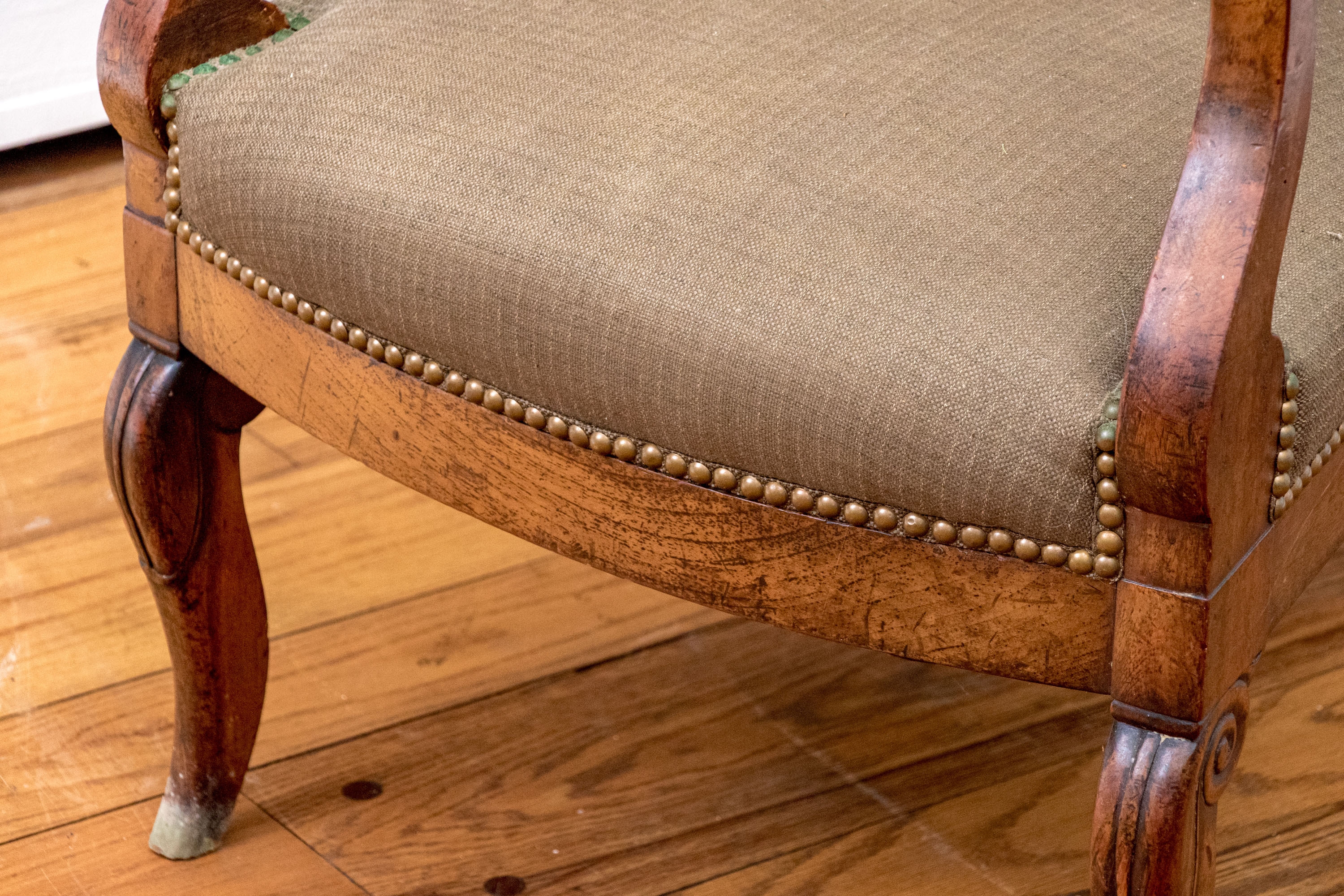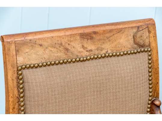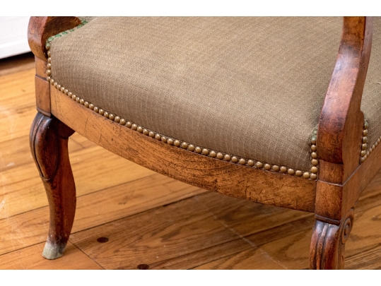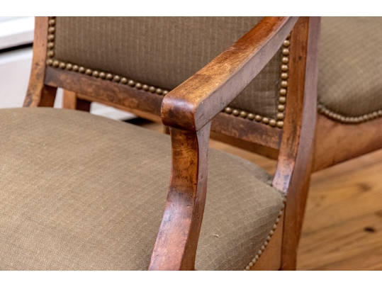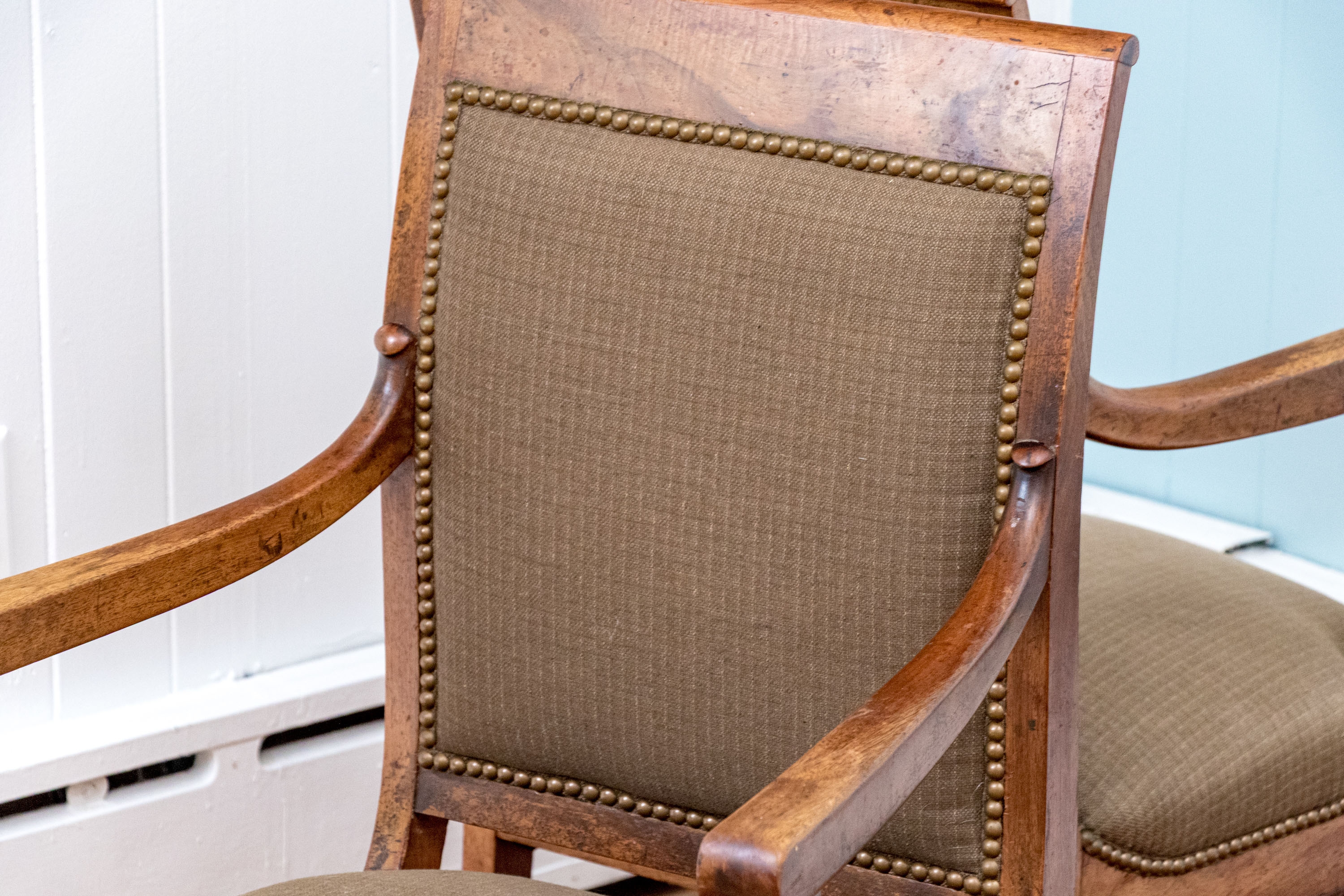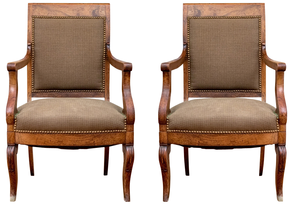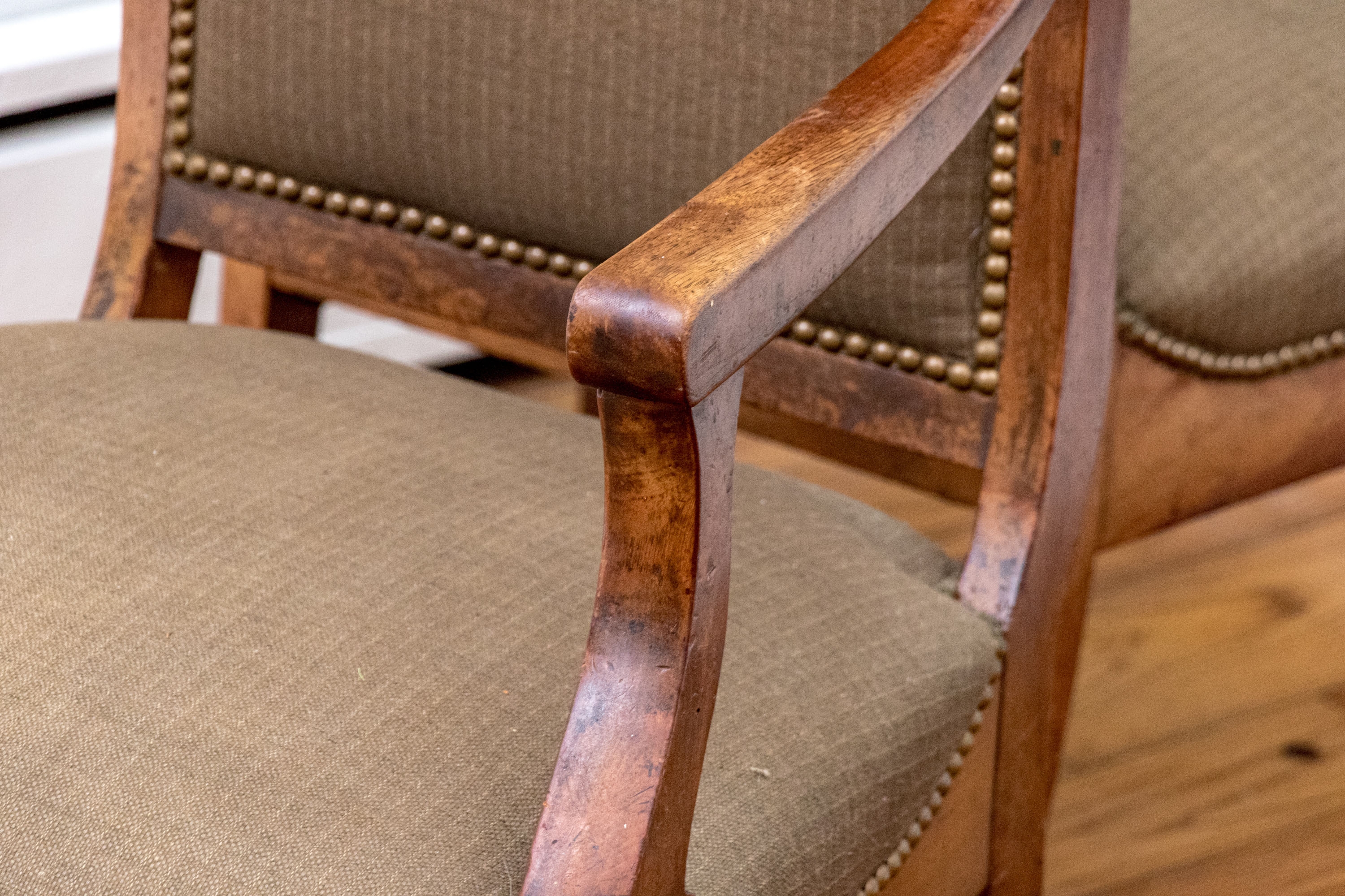 Pair of burl walnut Empire style armchairs with upholstered seats and backs featuring fine craftsmanship with a square top rail and stylized carved accent on front of each arm support and a carved detail at the top of cabriole legs. The chairs are accentuated with brass tack nailheads highlighting the simple form.
