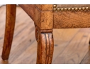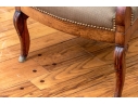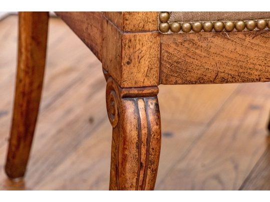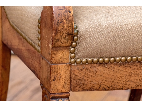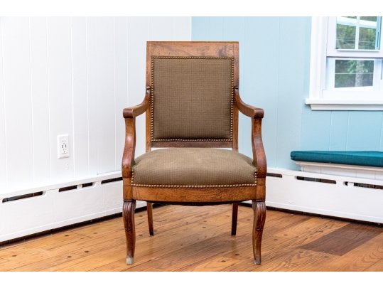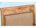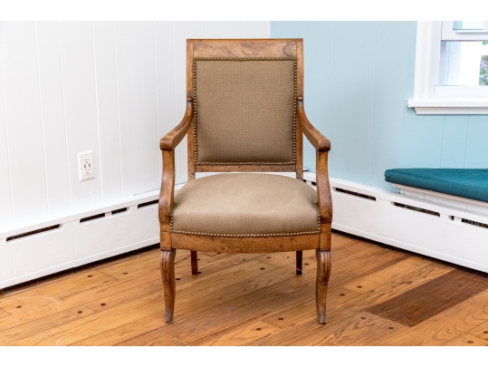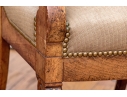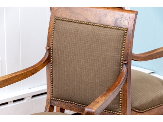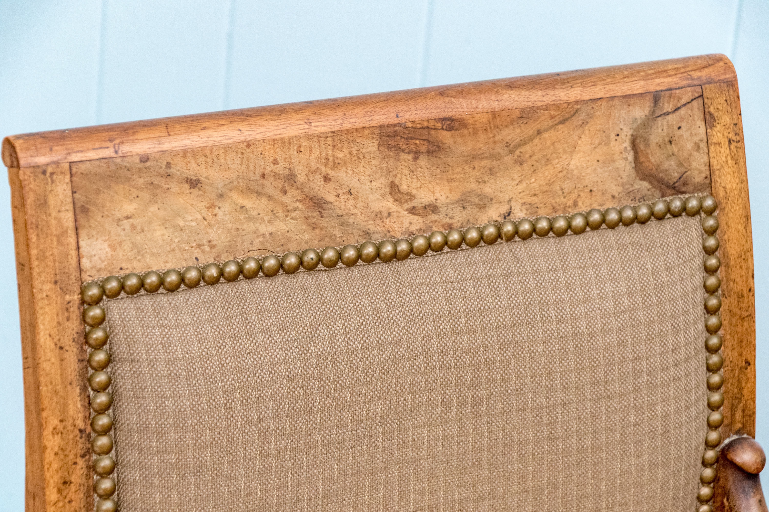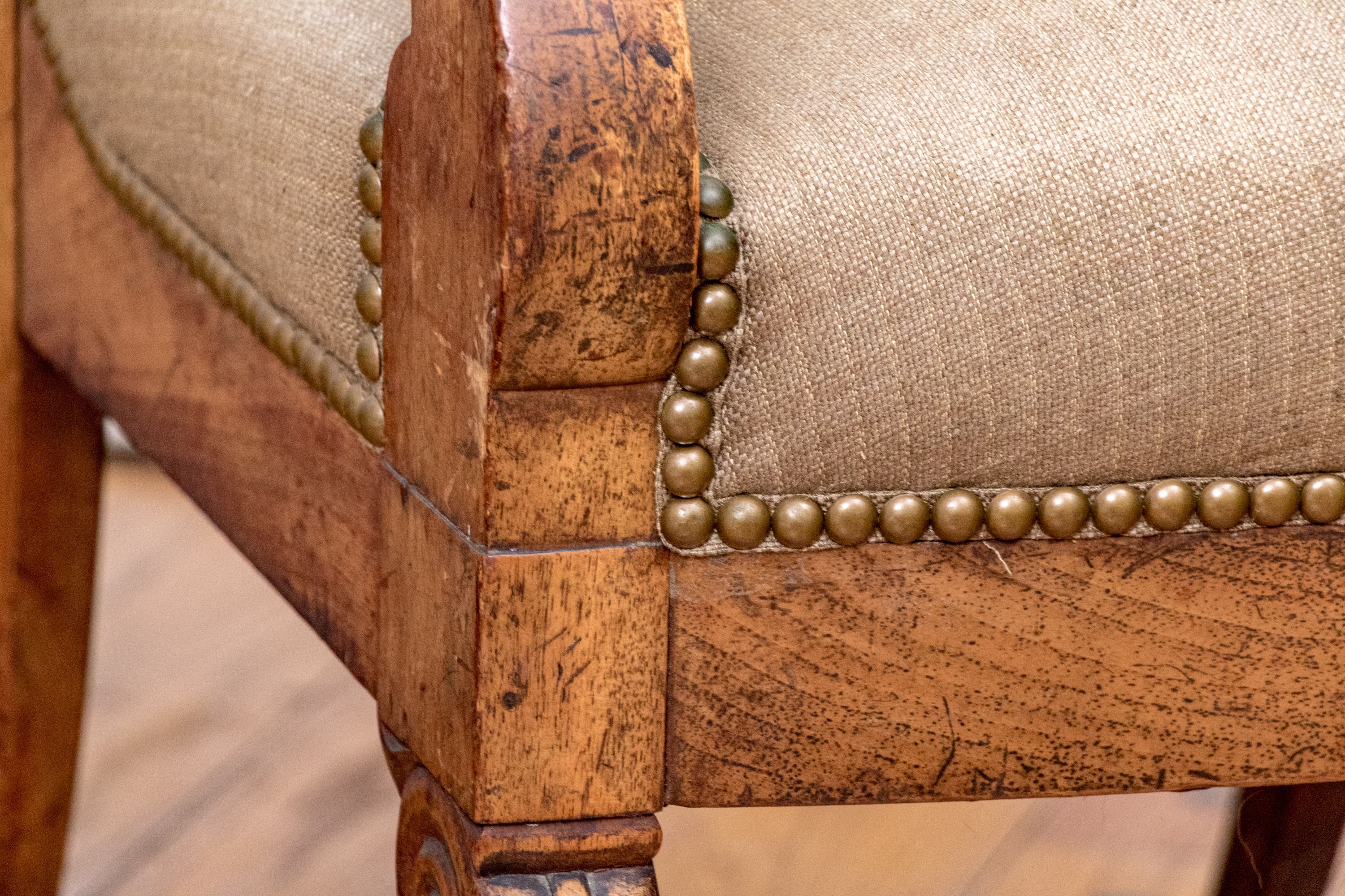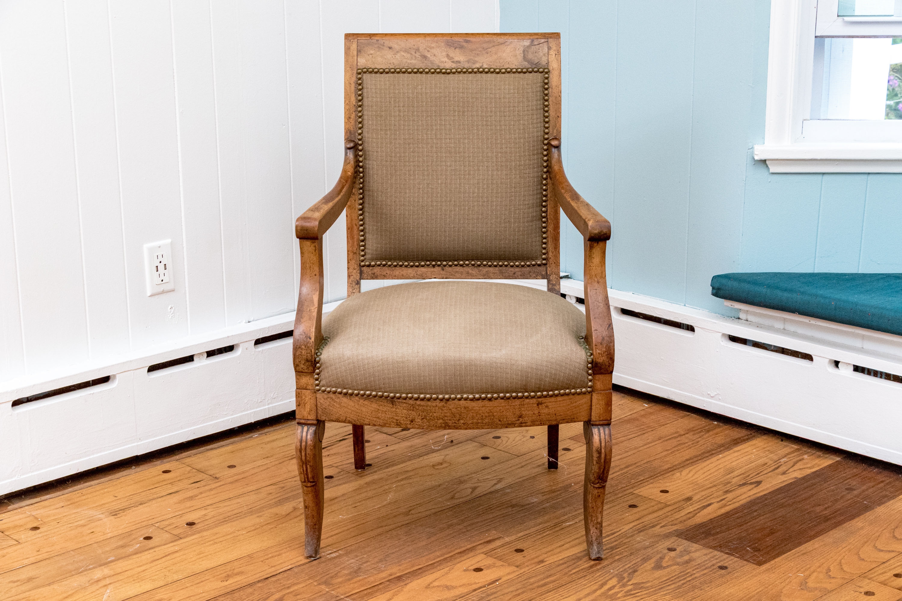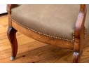 Pair of burl walnut Empire style armchairs with upholstered seats and backs featuring fine craftsmanship with a square top rail and stylized carved accent on front of each arm support and a carved detail at the top of cabriole legs. The chairs are accentuated with brass tack nailheads highlighting the simple form.