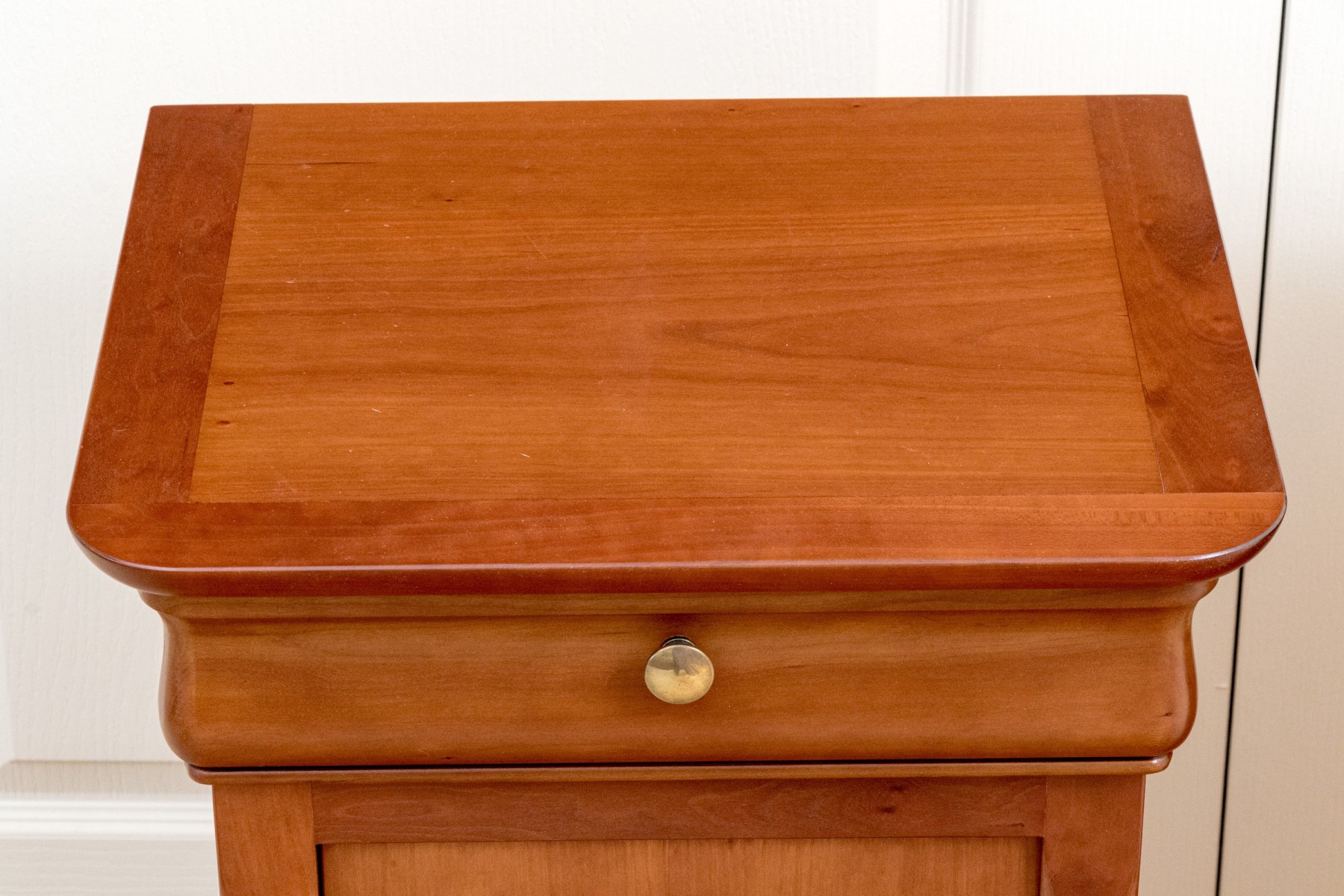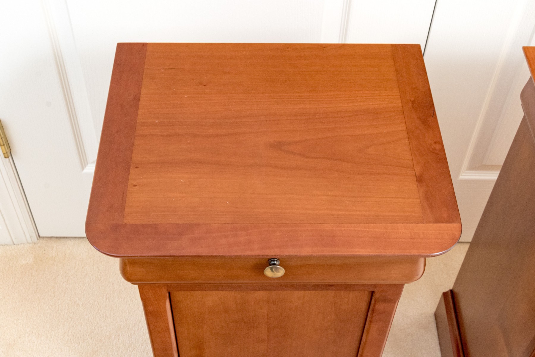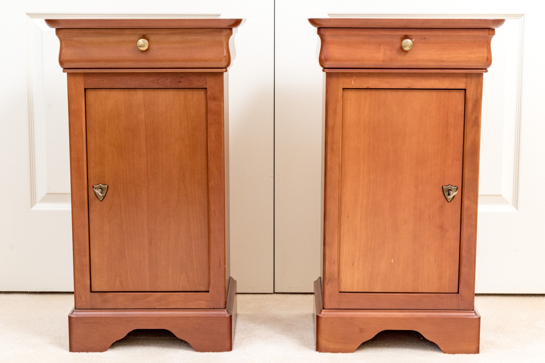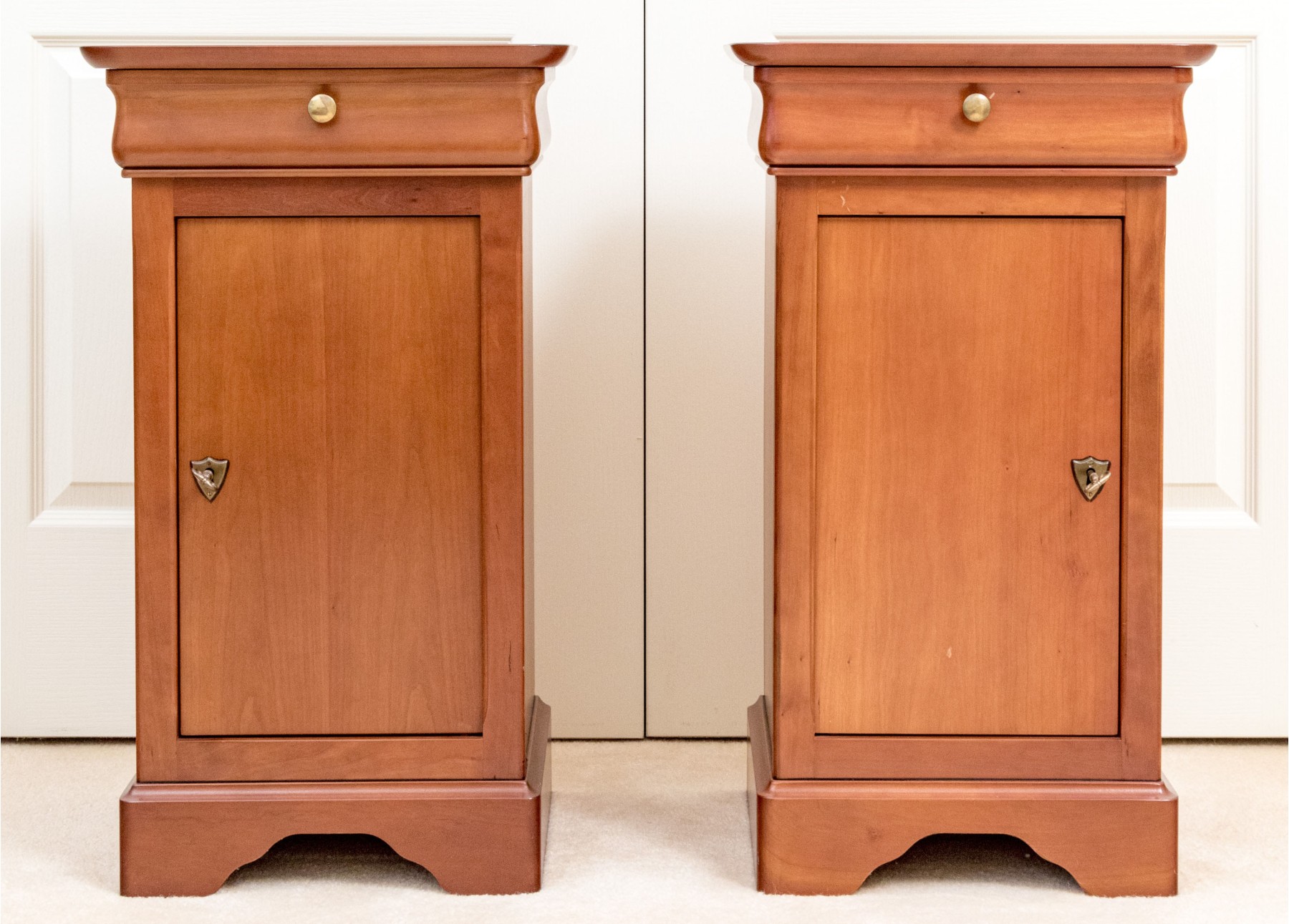 A wonderful pair of French Louis Philippe style commode end tables, each with a drawer with a brass knob above a single cabinet with a shelved interior.