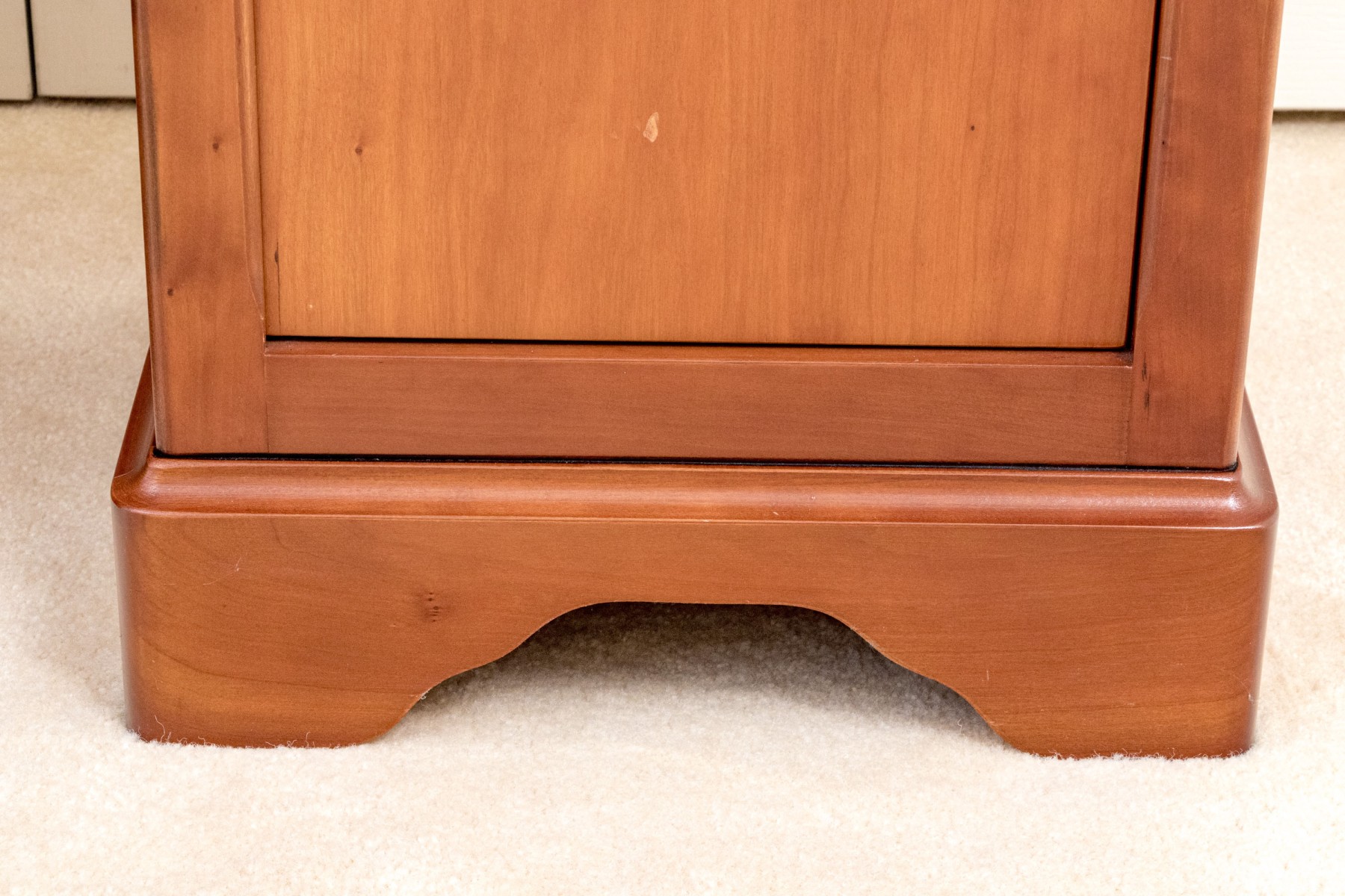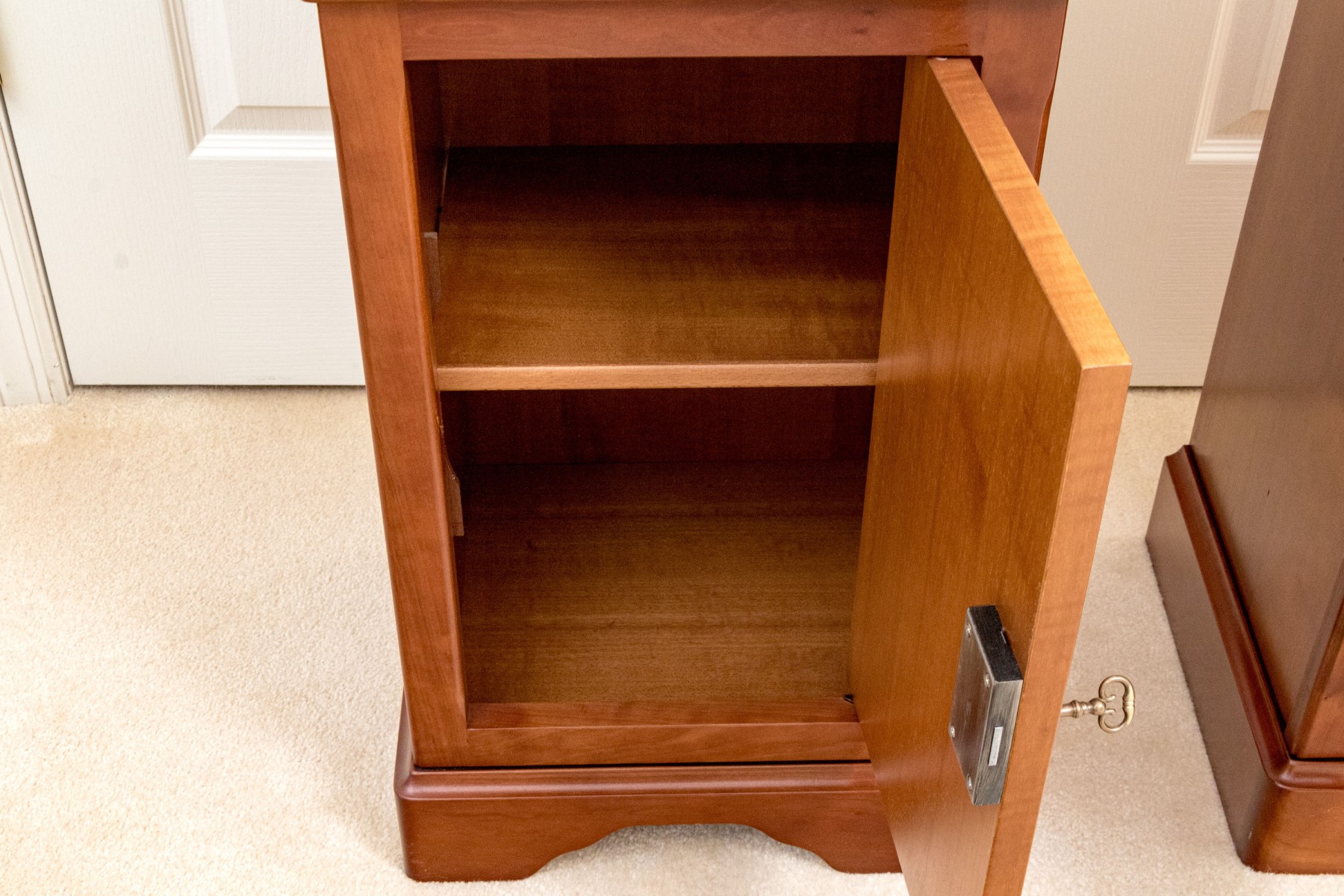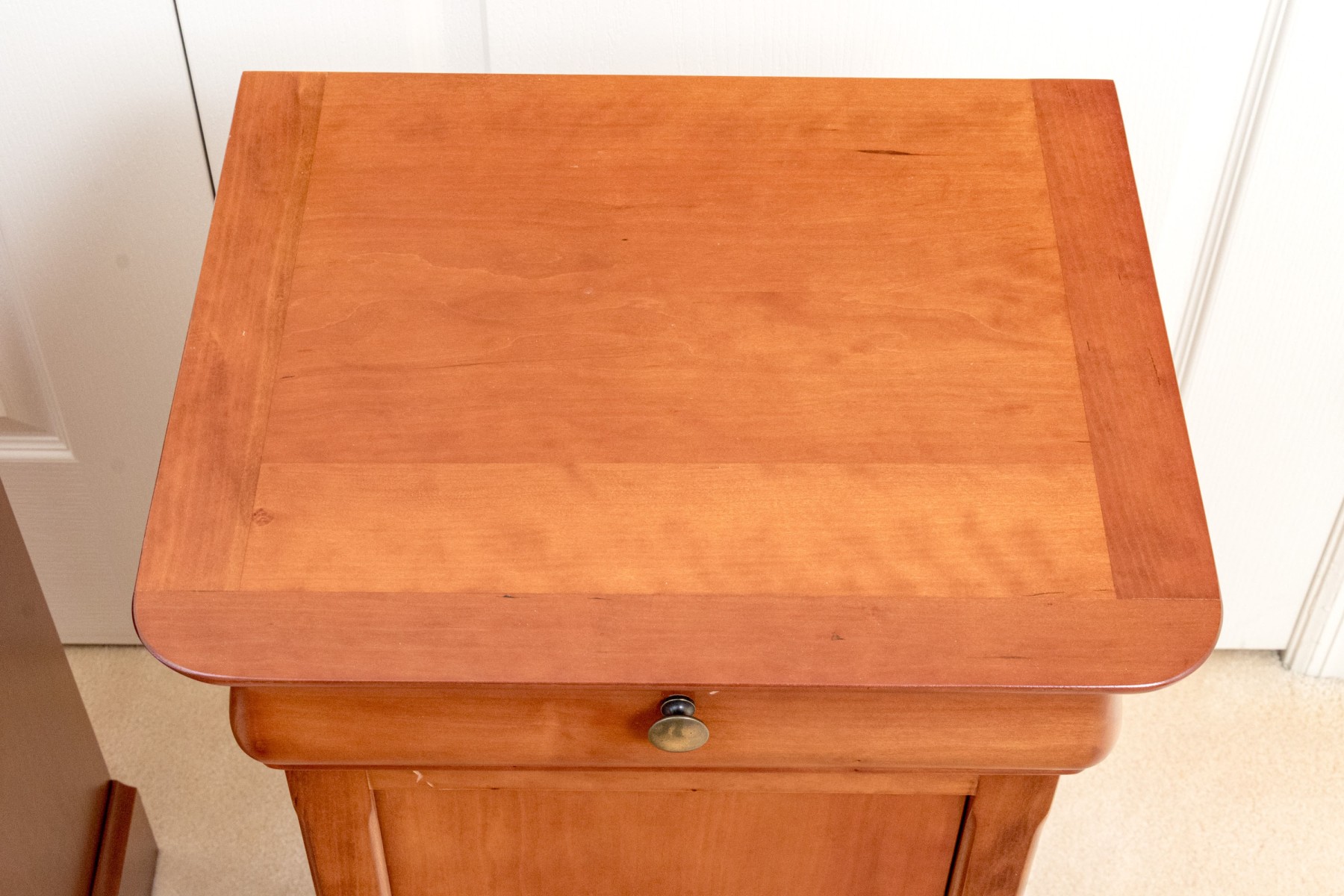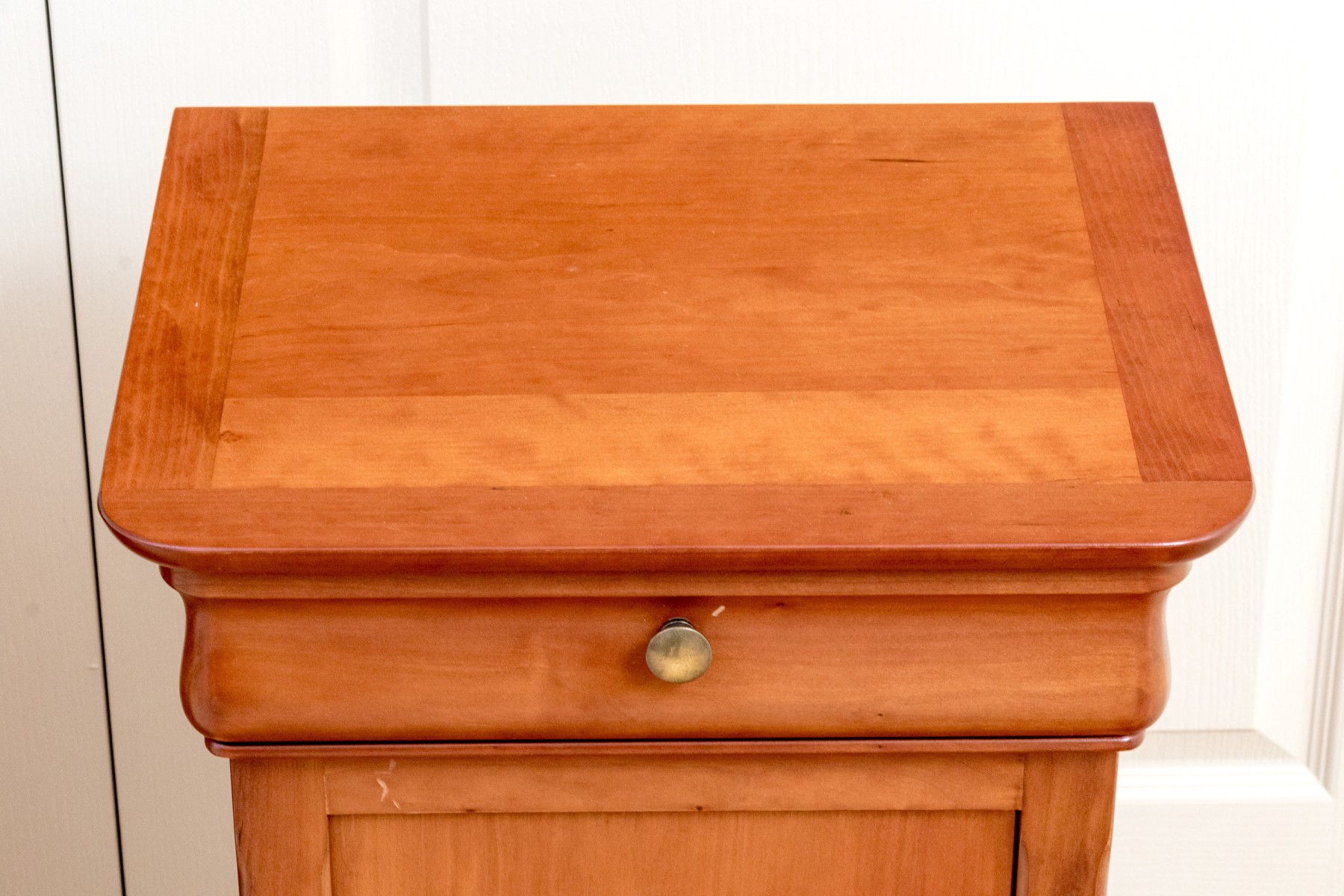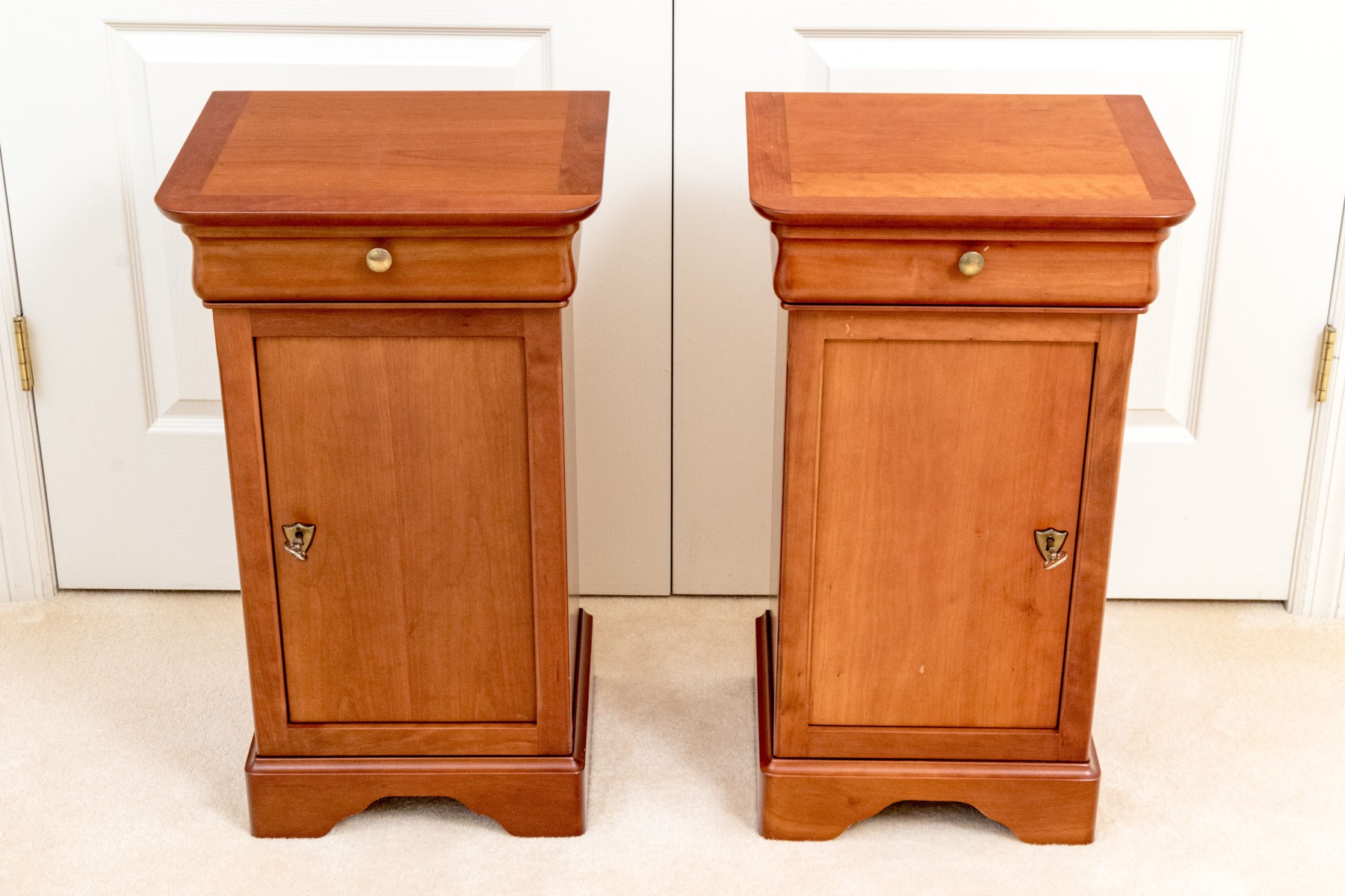 A wonderful pair of French Louis Philippe style commode end tables, each with a drawer with a brass knob above a single cabinet with a shelved interior.