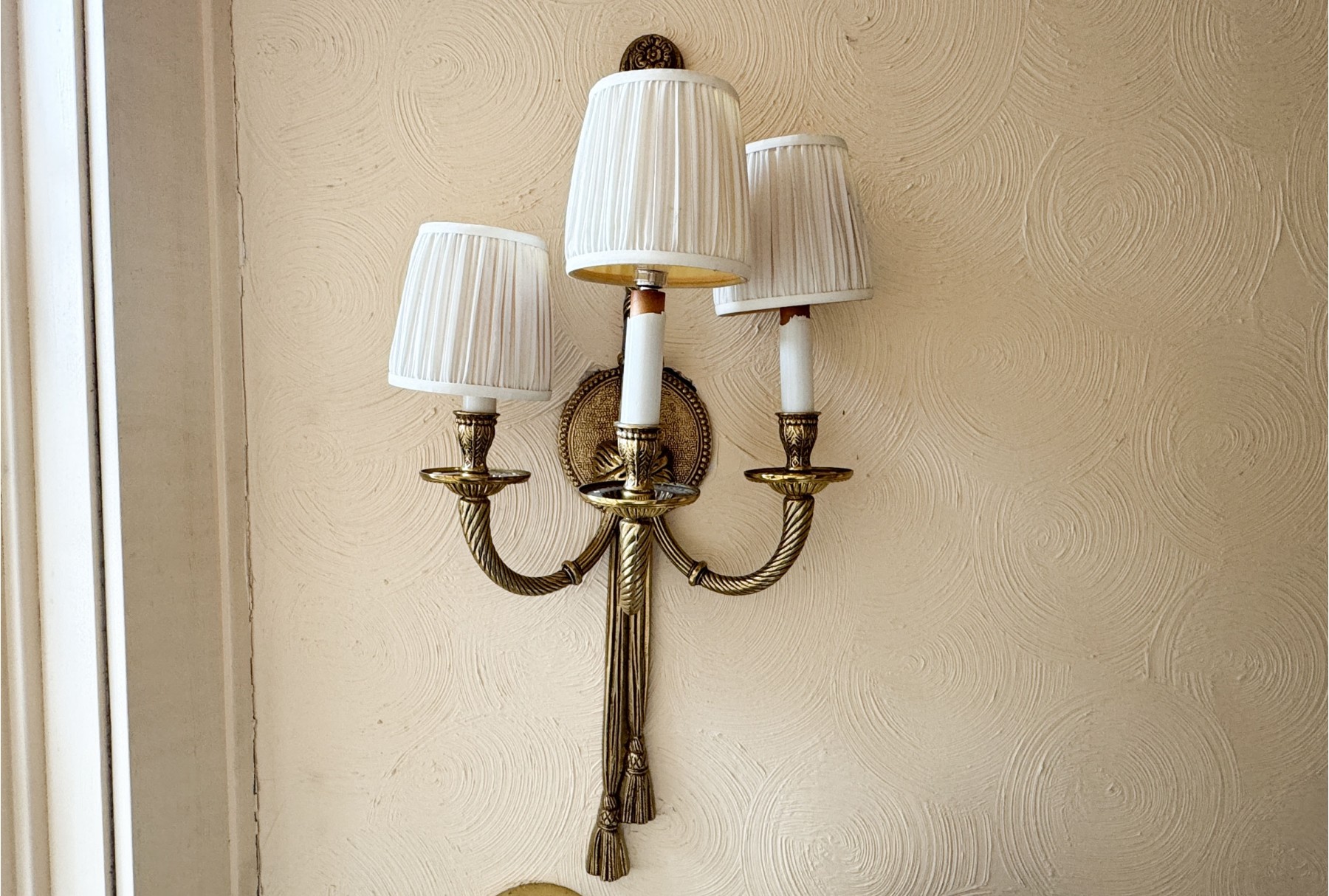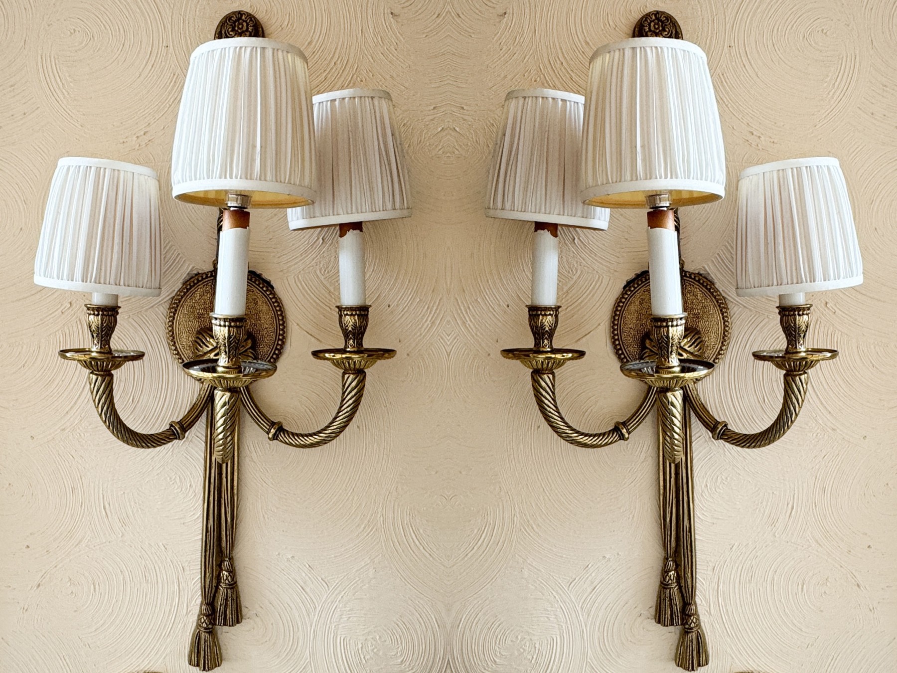 An excellent pair of French Louis XVI style electrified wall sconces showcasing three candle sockets over spiraled arms emerging from a tassel form plaque. The lights are surmounted with white pleated shades.