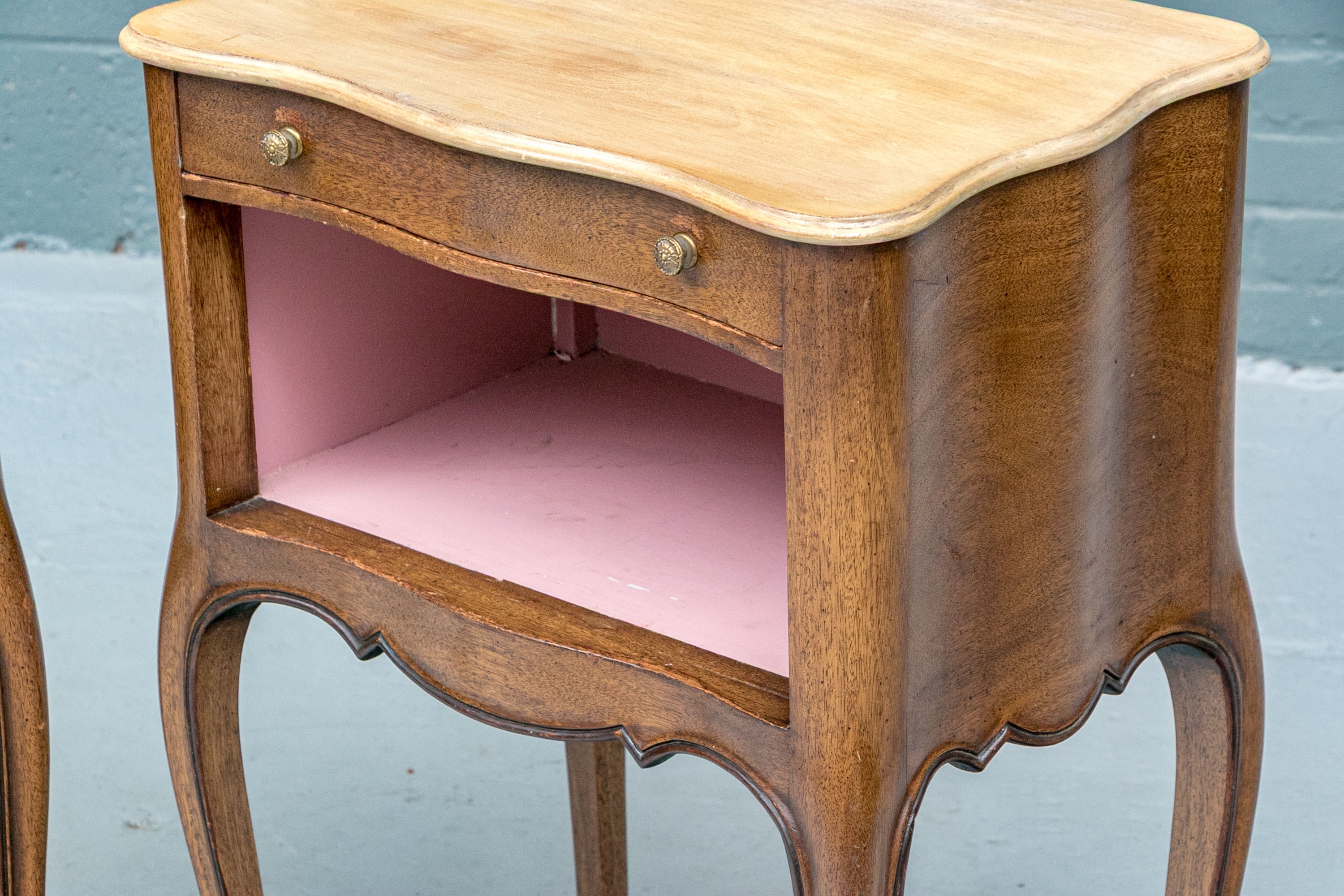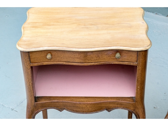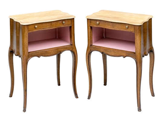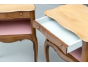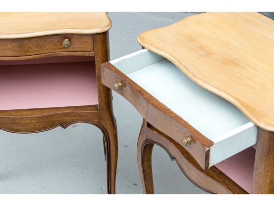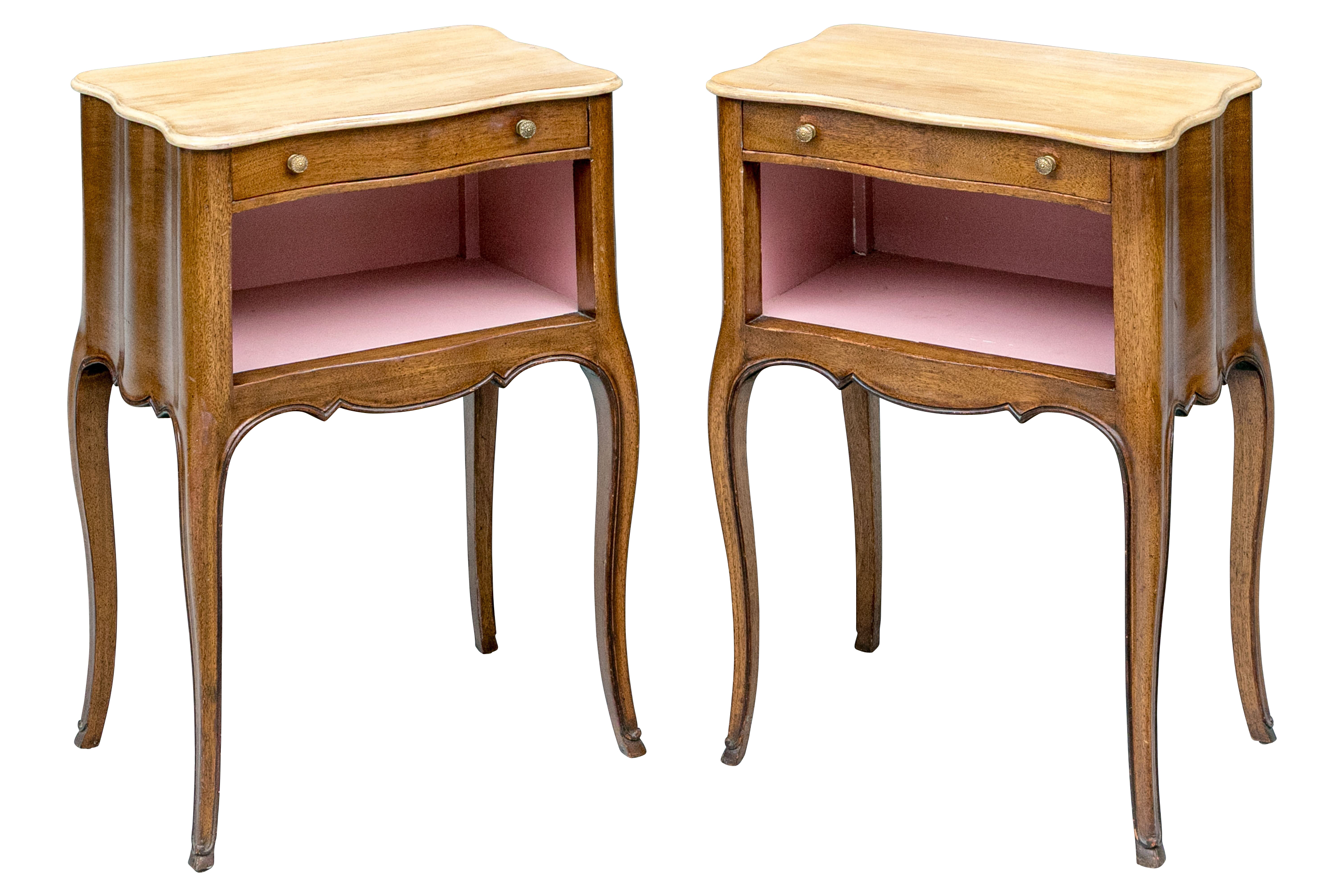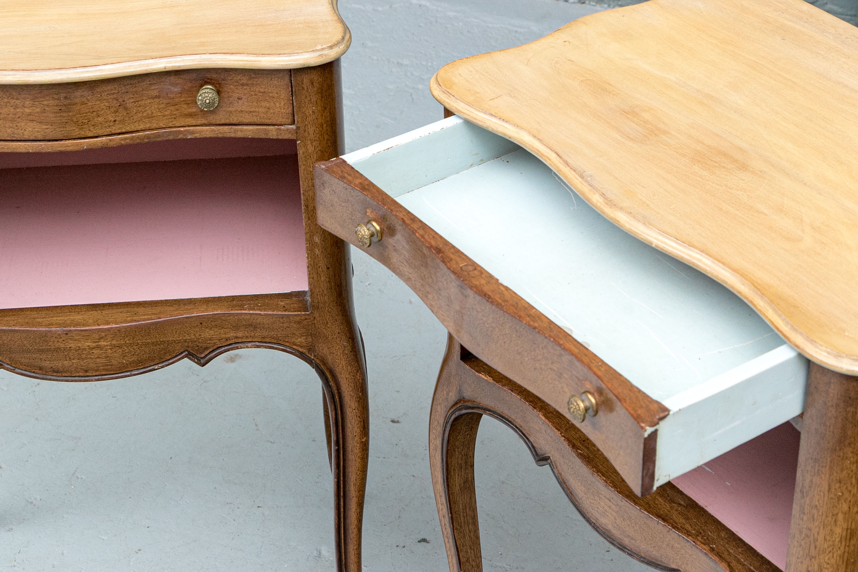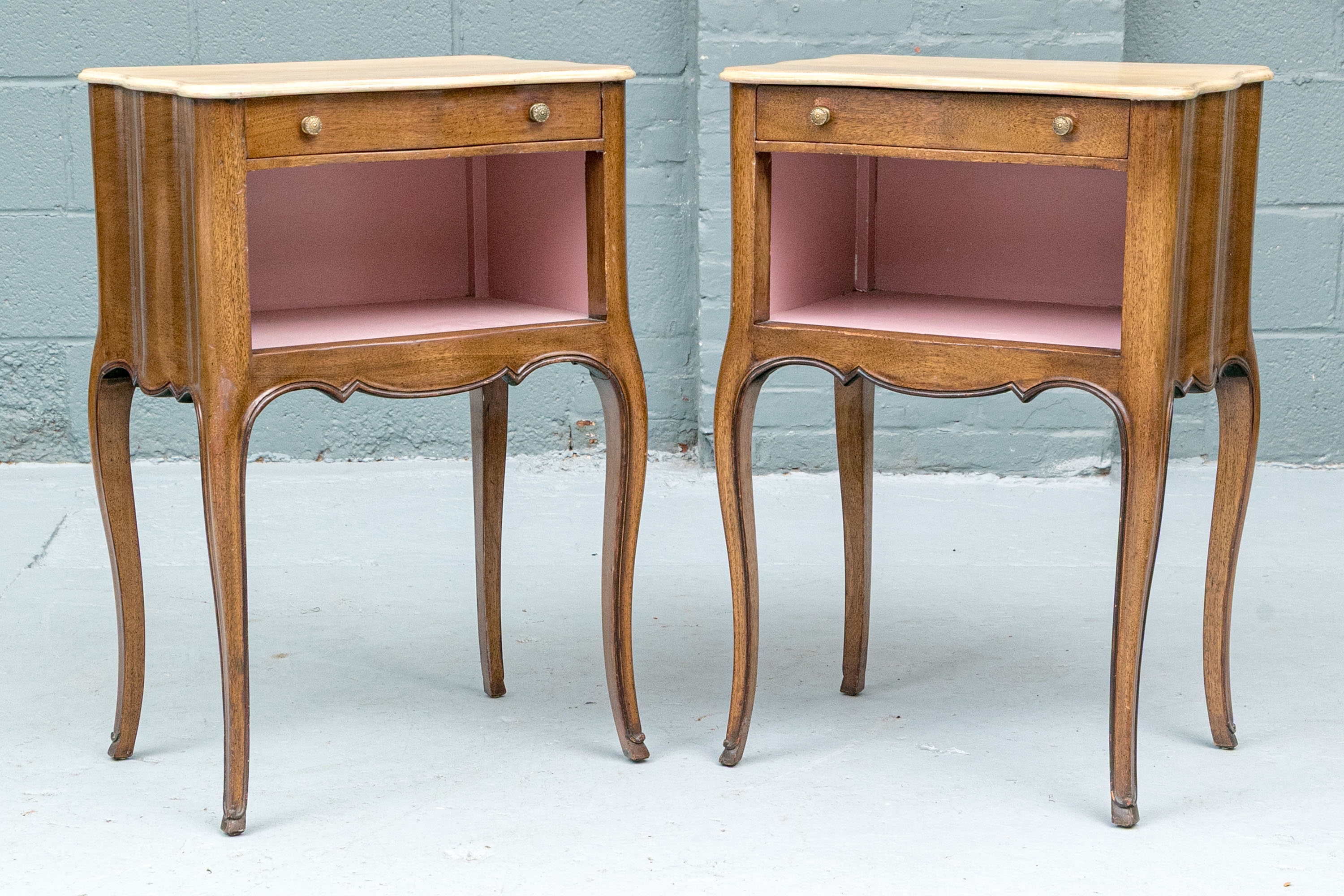 Pair of French Provincial bed side tables with shallow drawers opening to pale blue panted interior and pink painted open compartments. The contrasting faux finished wood top with scalloped design. The scalloped aprons have a raised moulded detail and the whole resting upon cabriole legs.