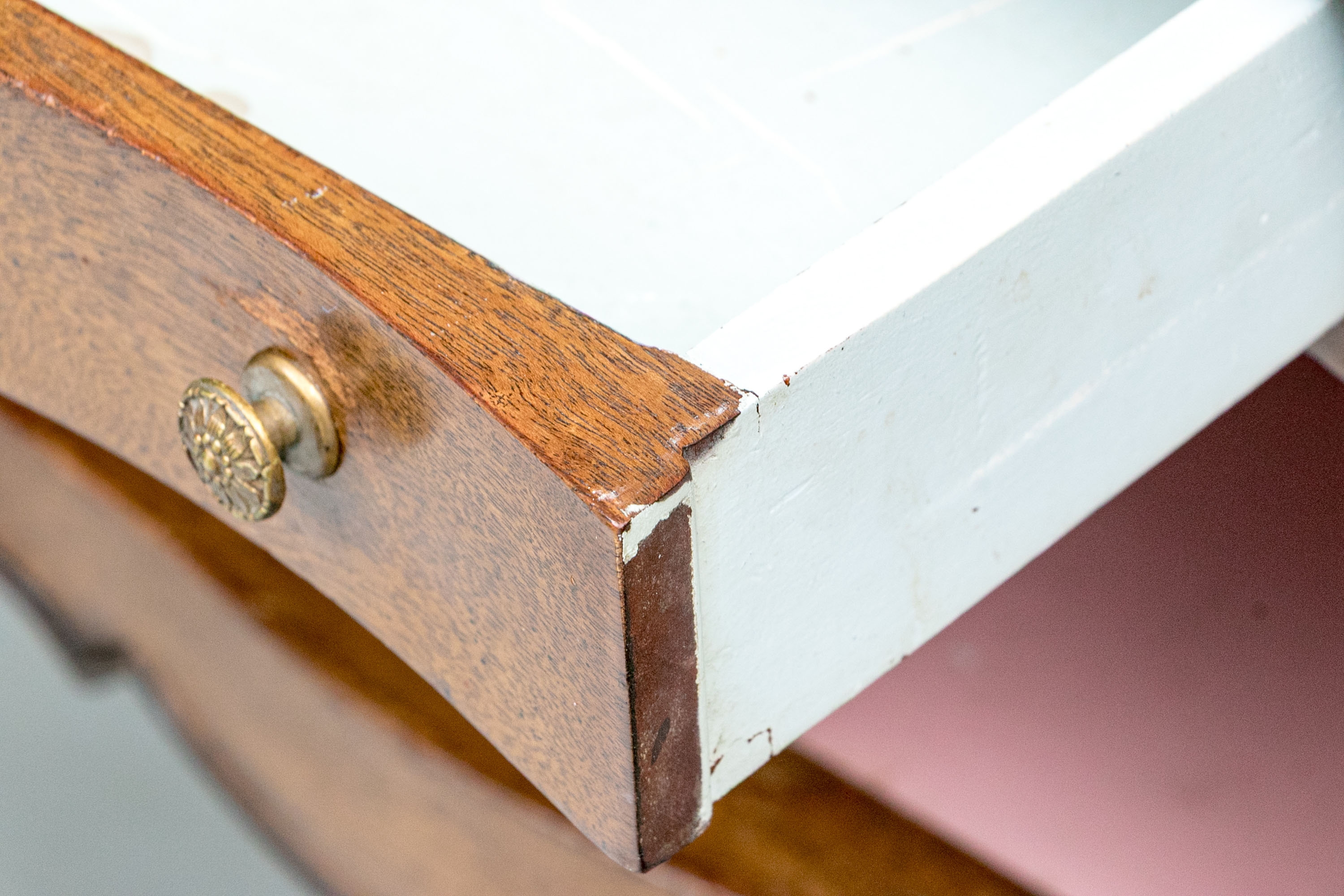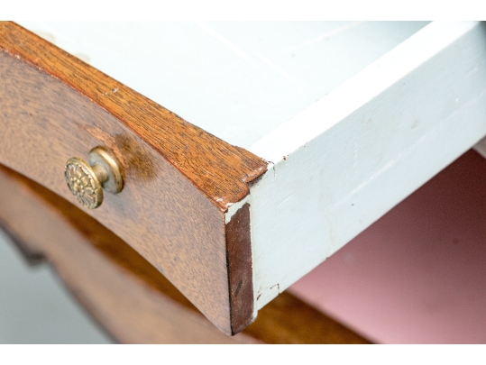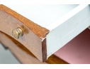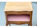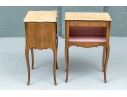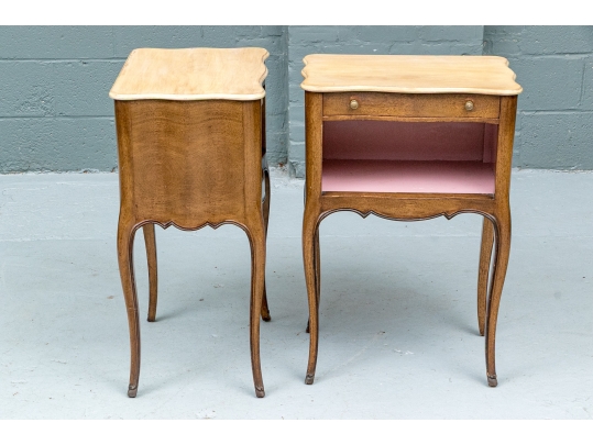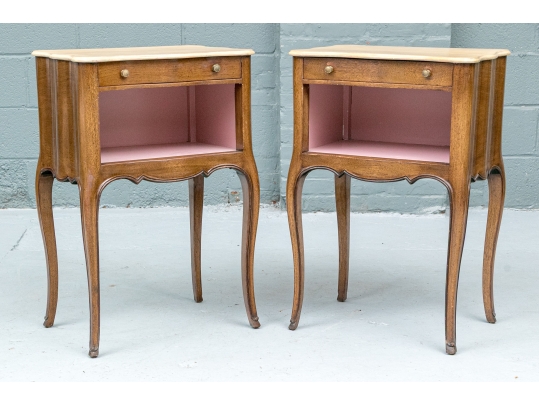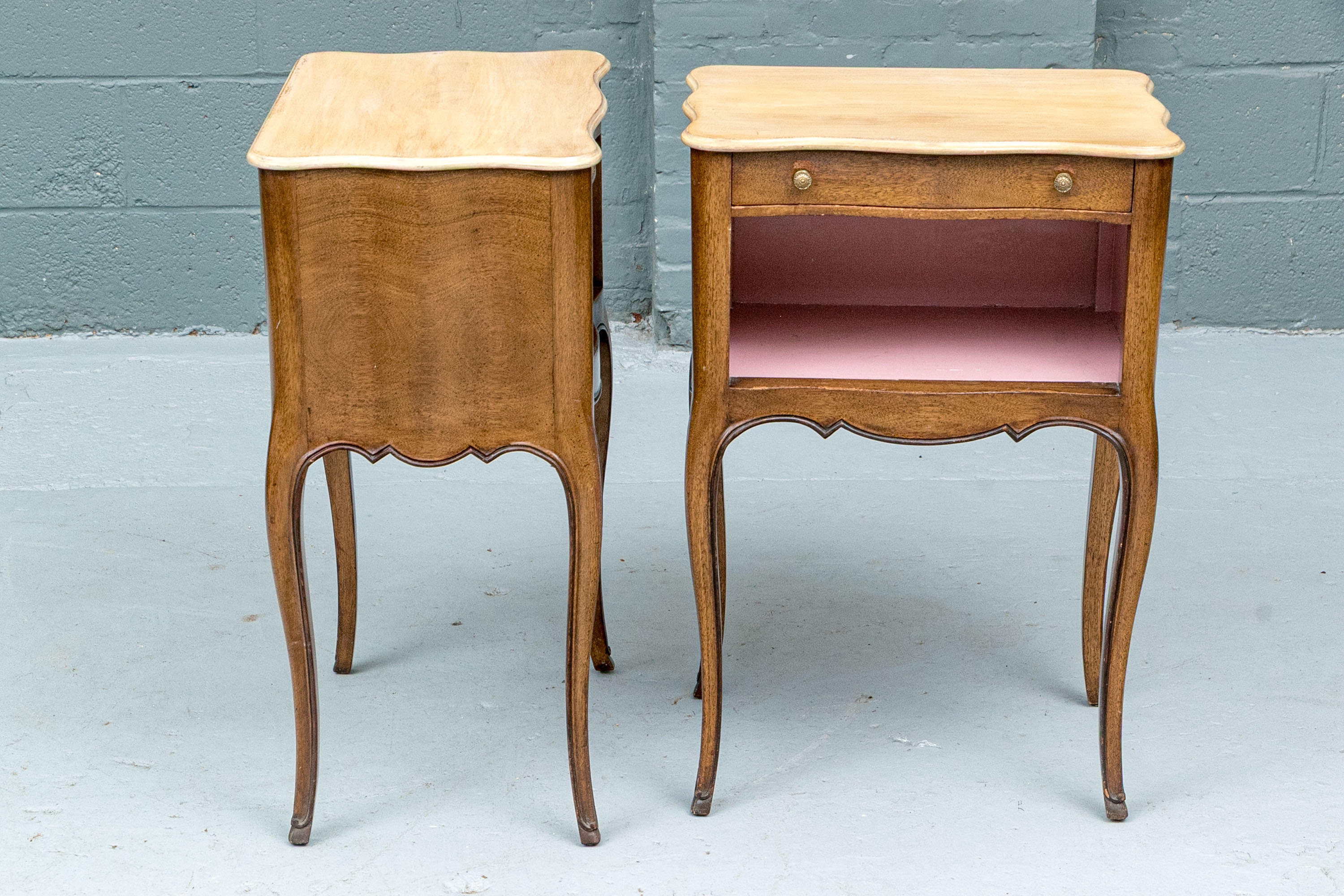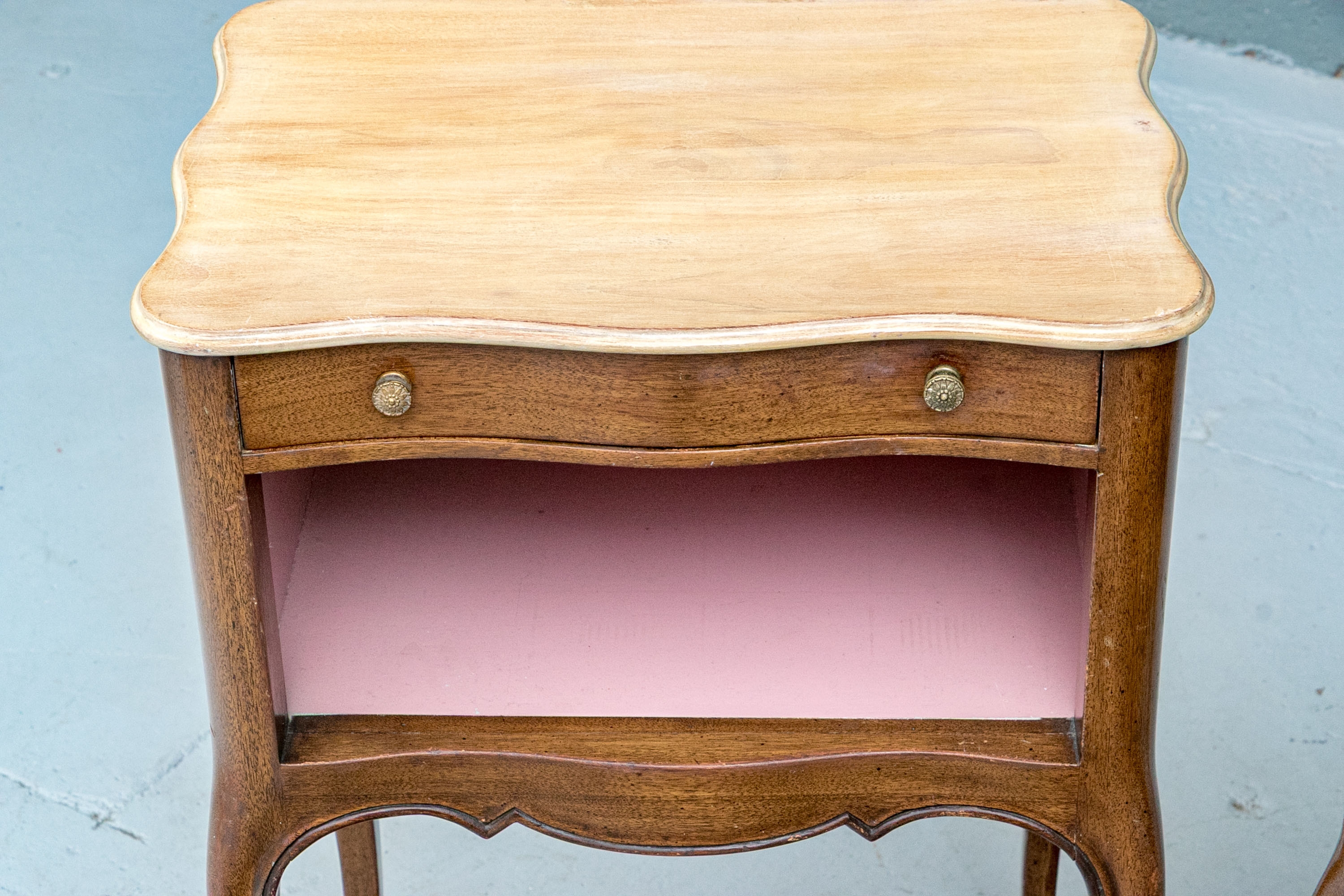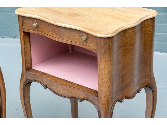 Pair of French Provincial bed side tables with shallow drawers opening to pale blue panted interior and pink painted open compartments. The contrasting faux finished wood top with scalloped design. The scalloped aprons have a raised moulded detail and the whole resting upon cabriole legs.