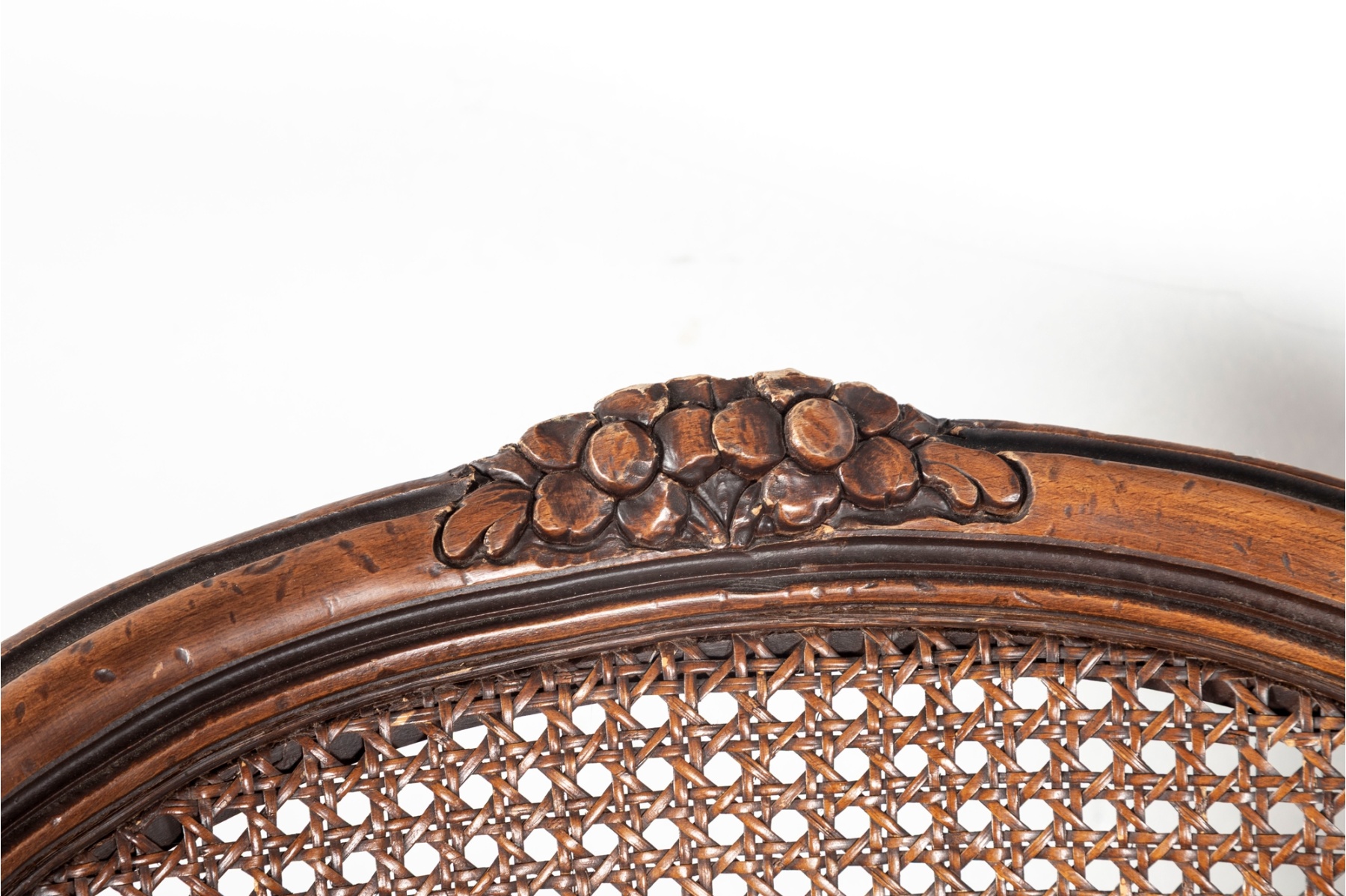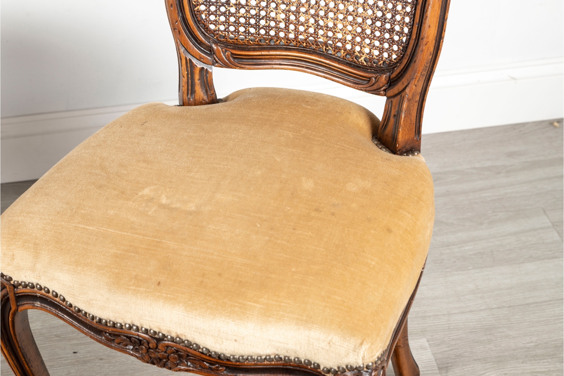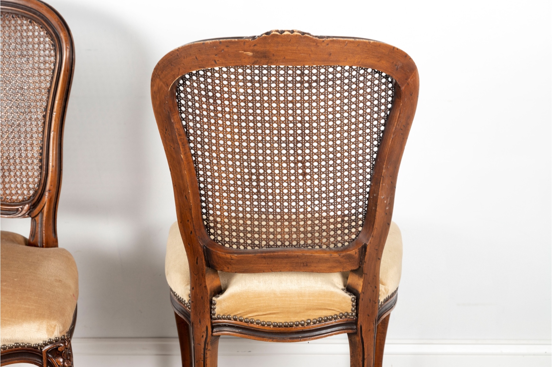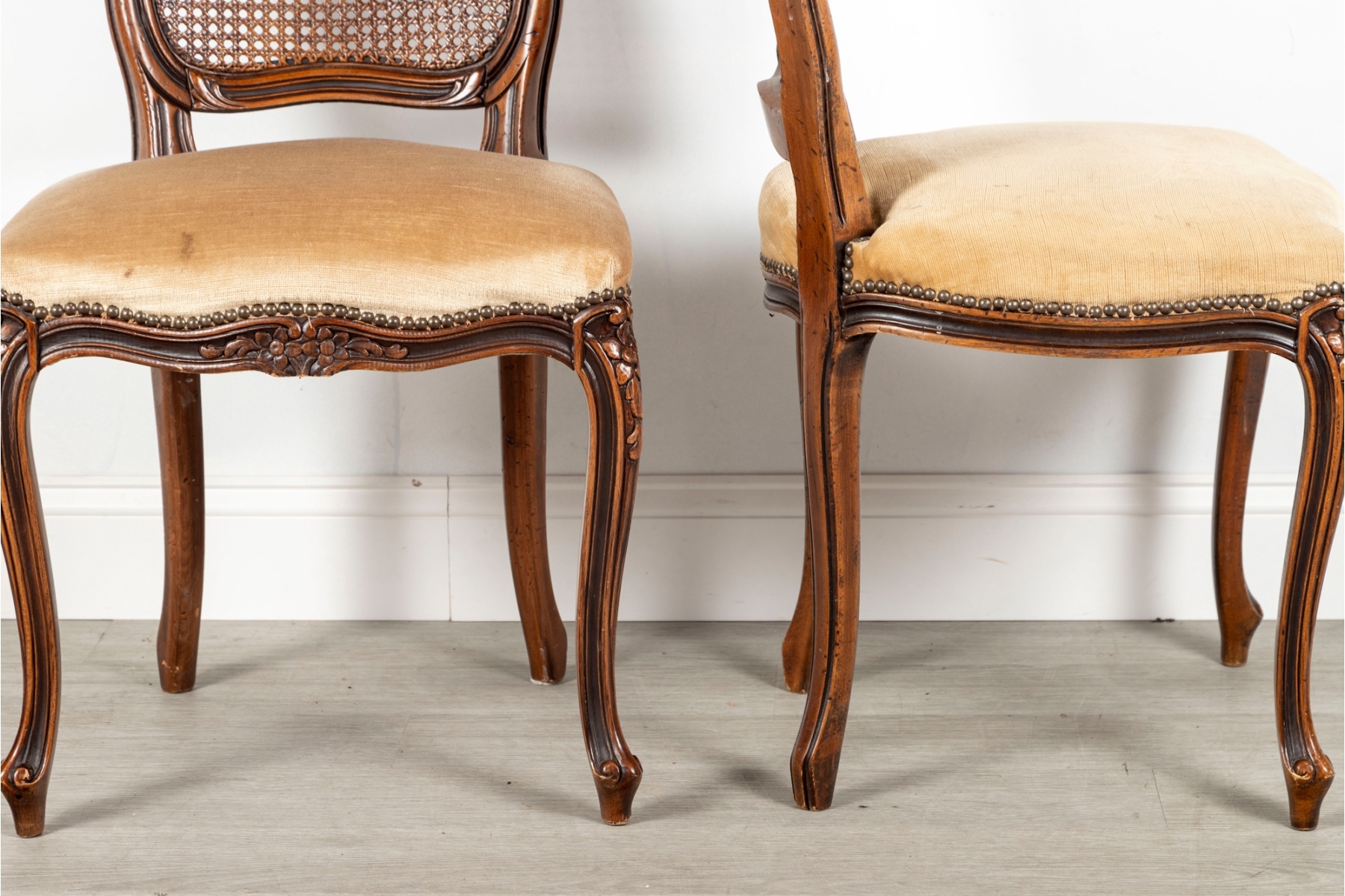 Elegant pair of carved wooden side chairs featuring caned backs, cabriole legs, and scalloped aprons with floral detailing.
