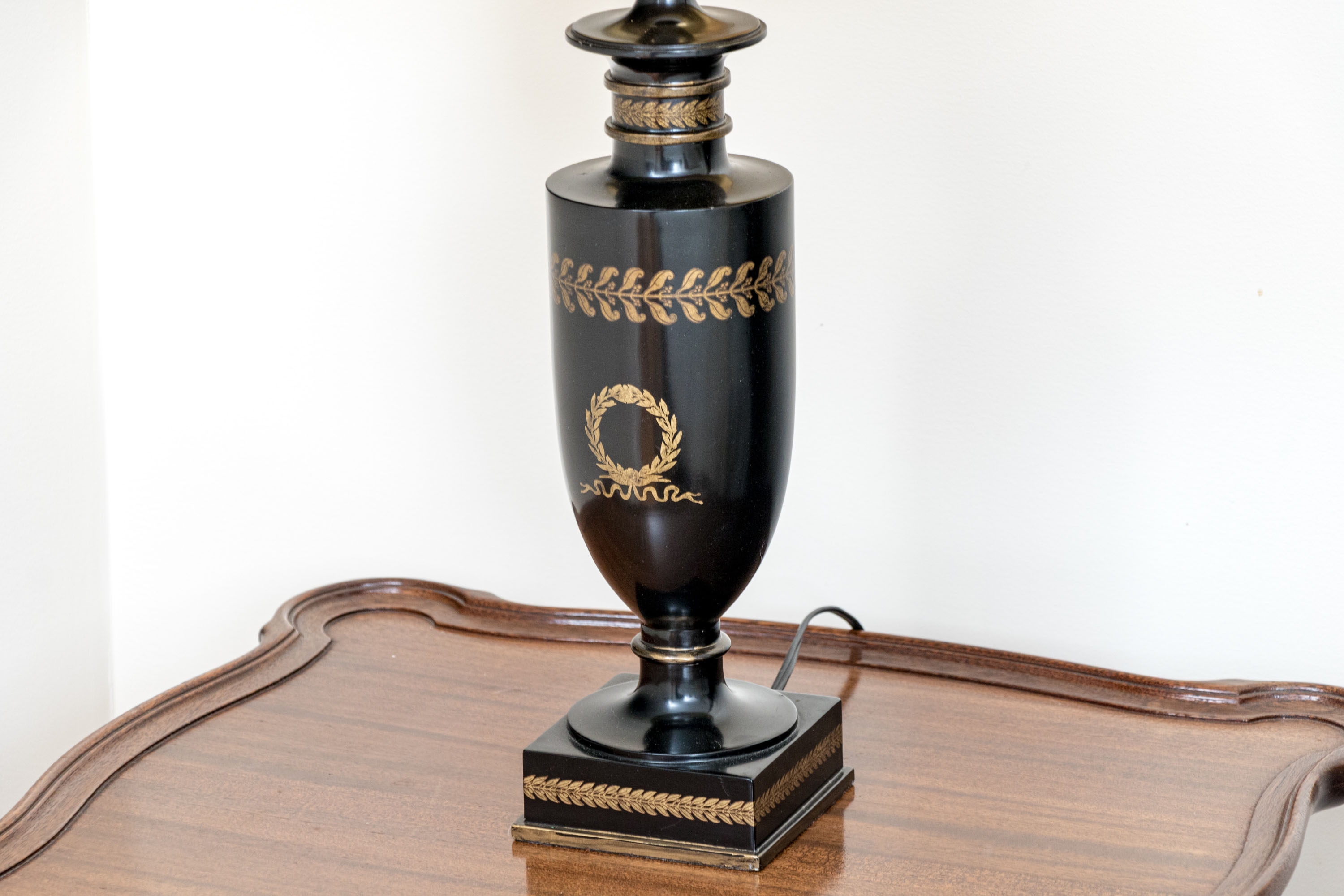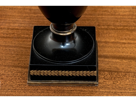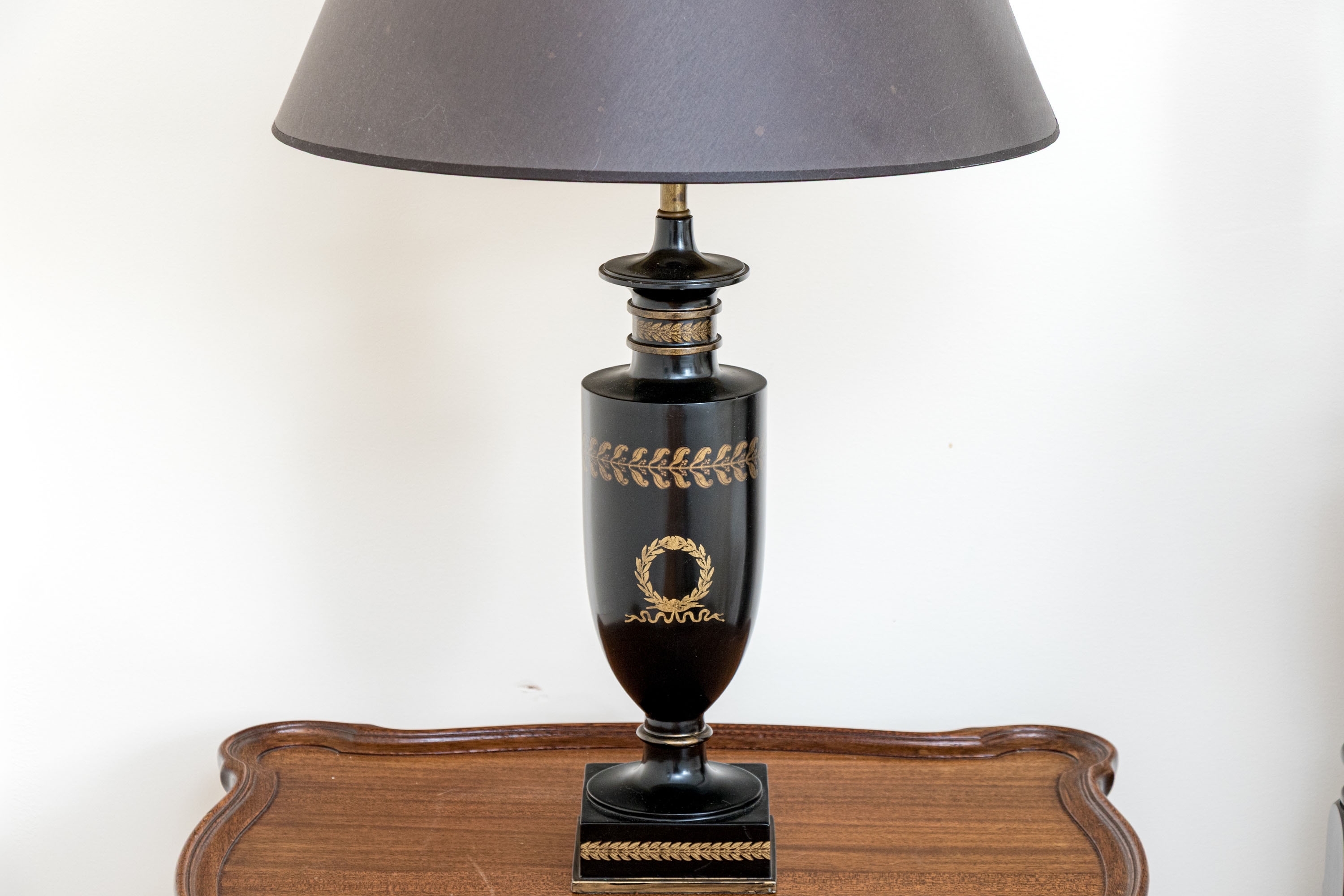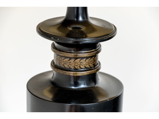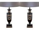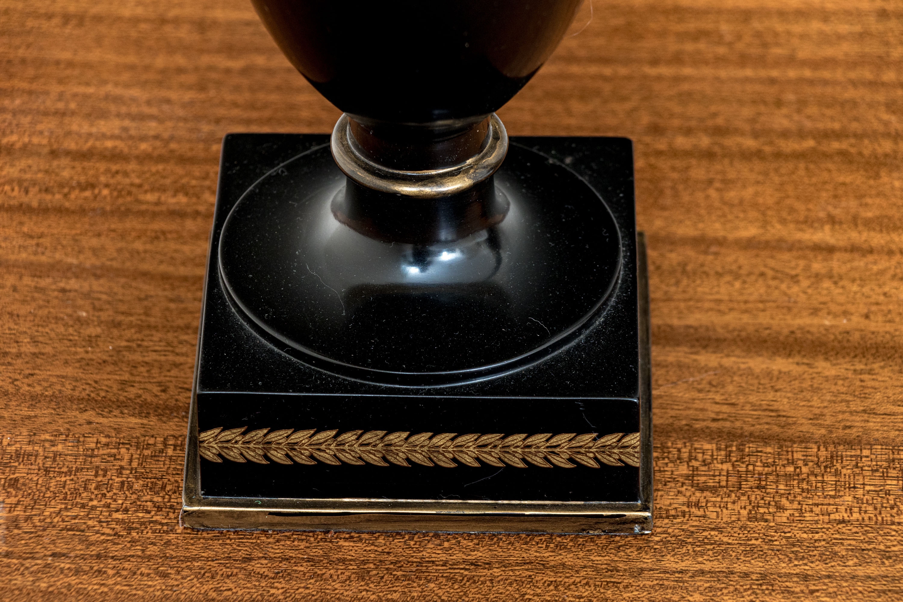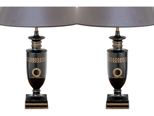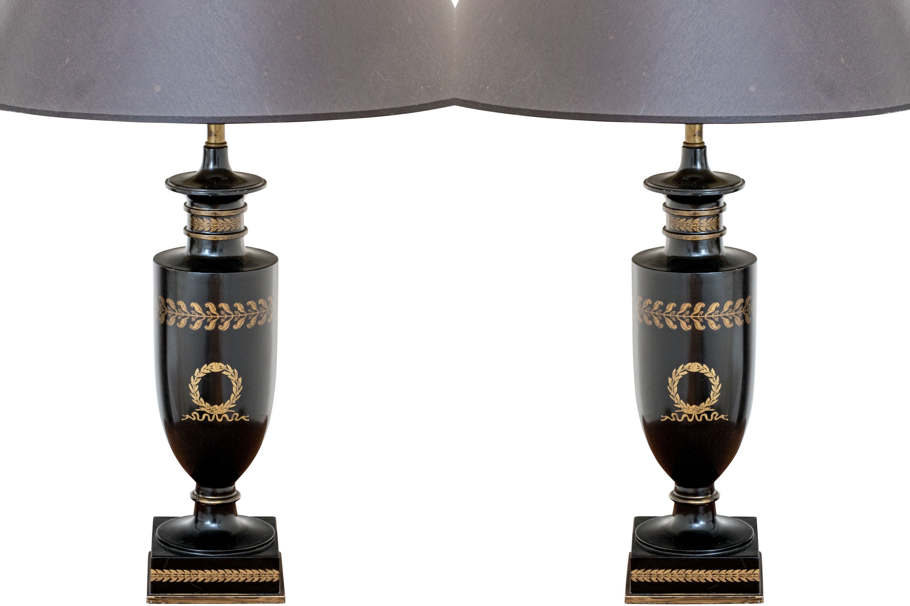 Heavy urns in black with gilt leaves around the necks, leafy bands at the tops over wreaths with ribbons. Mounted on square black bases with brass edges. With fine black fabric shades with gold paper linings.
