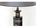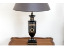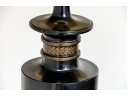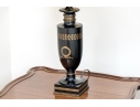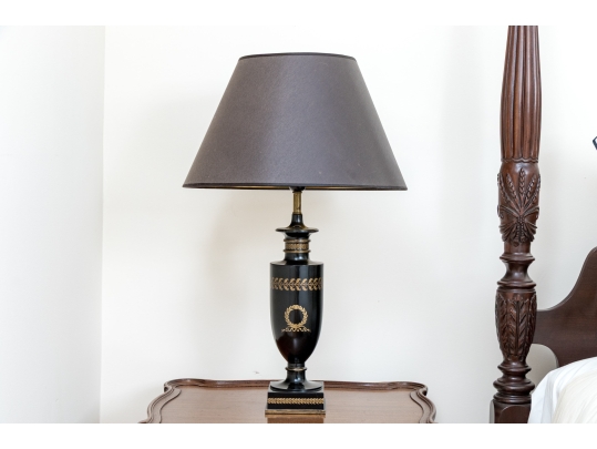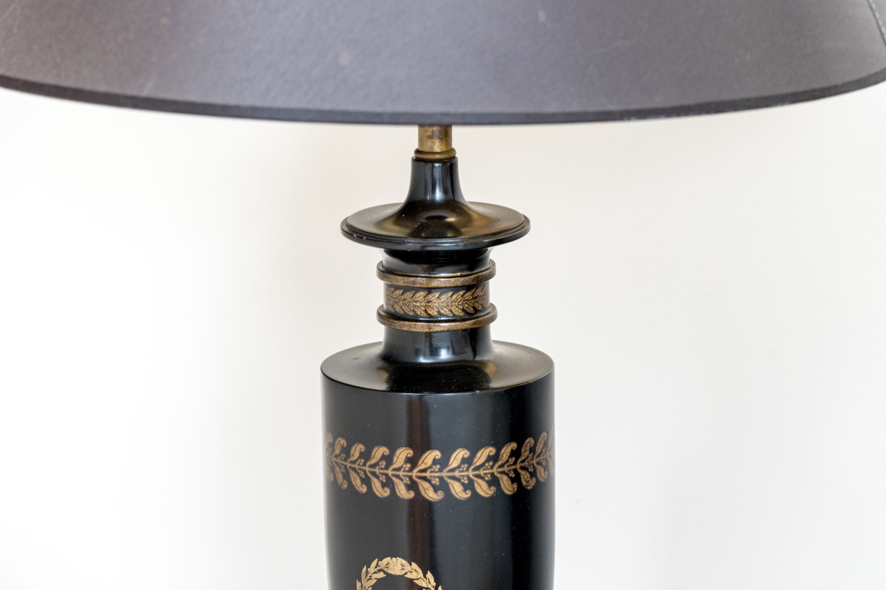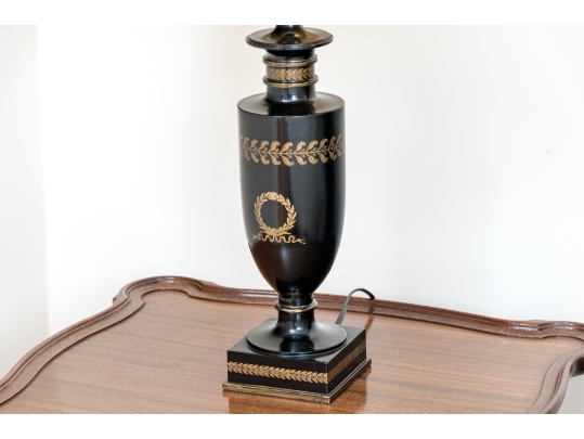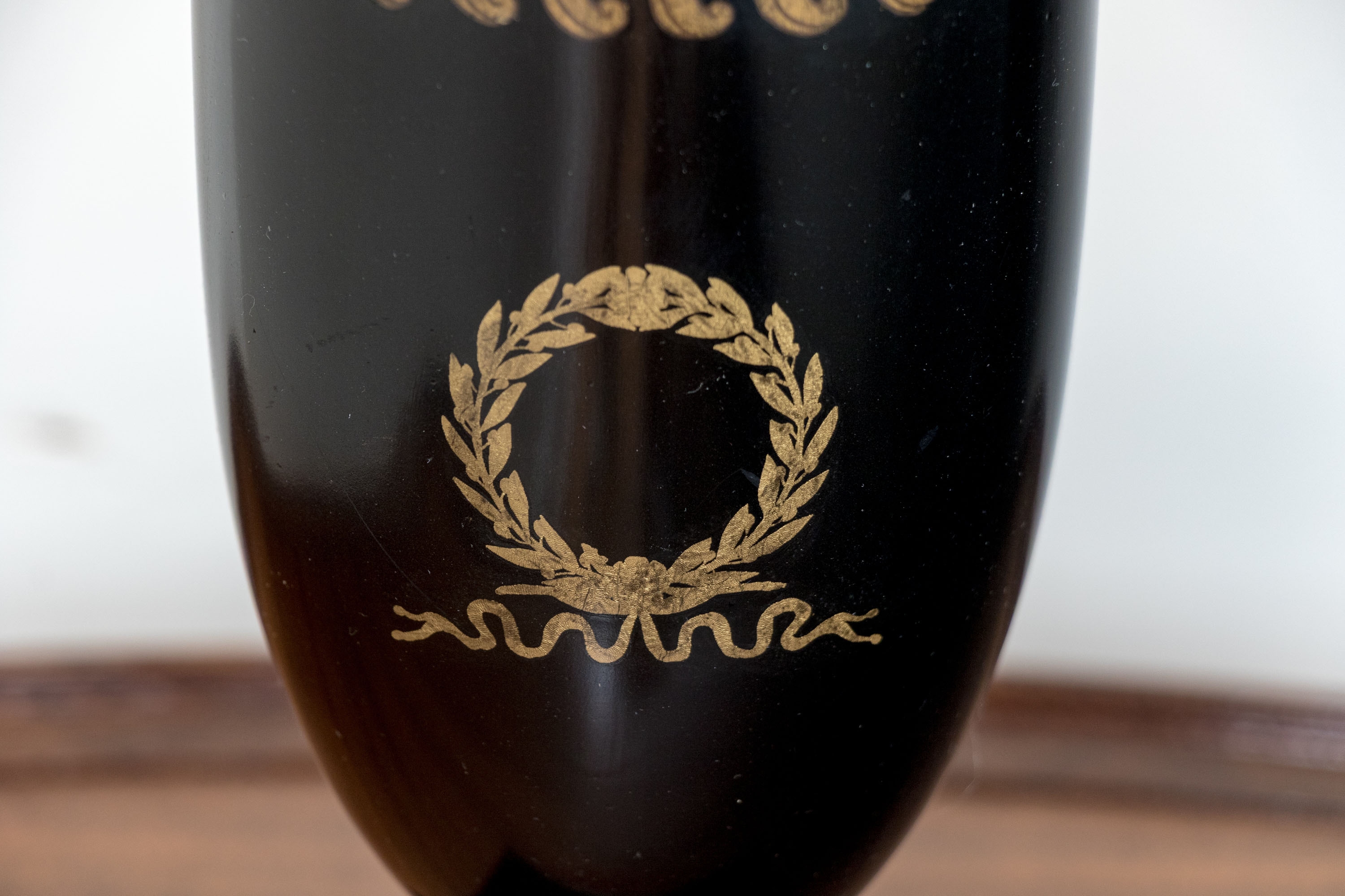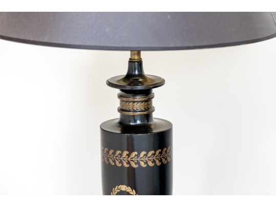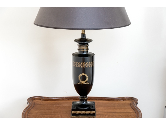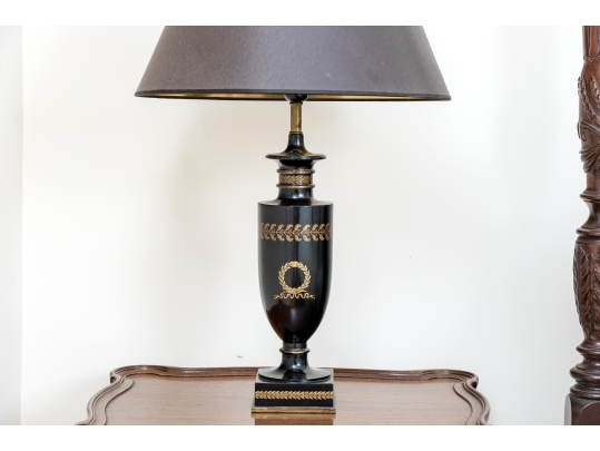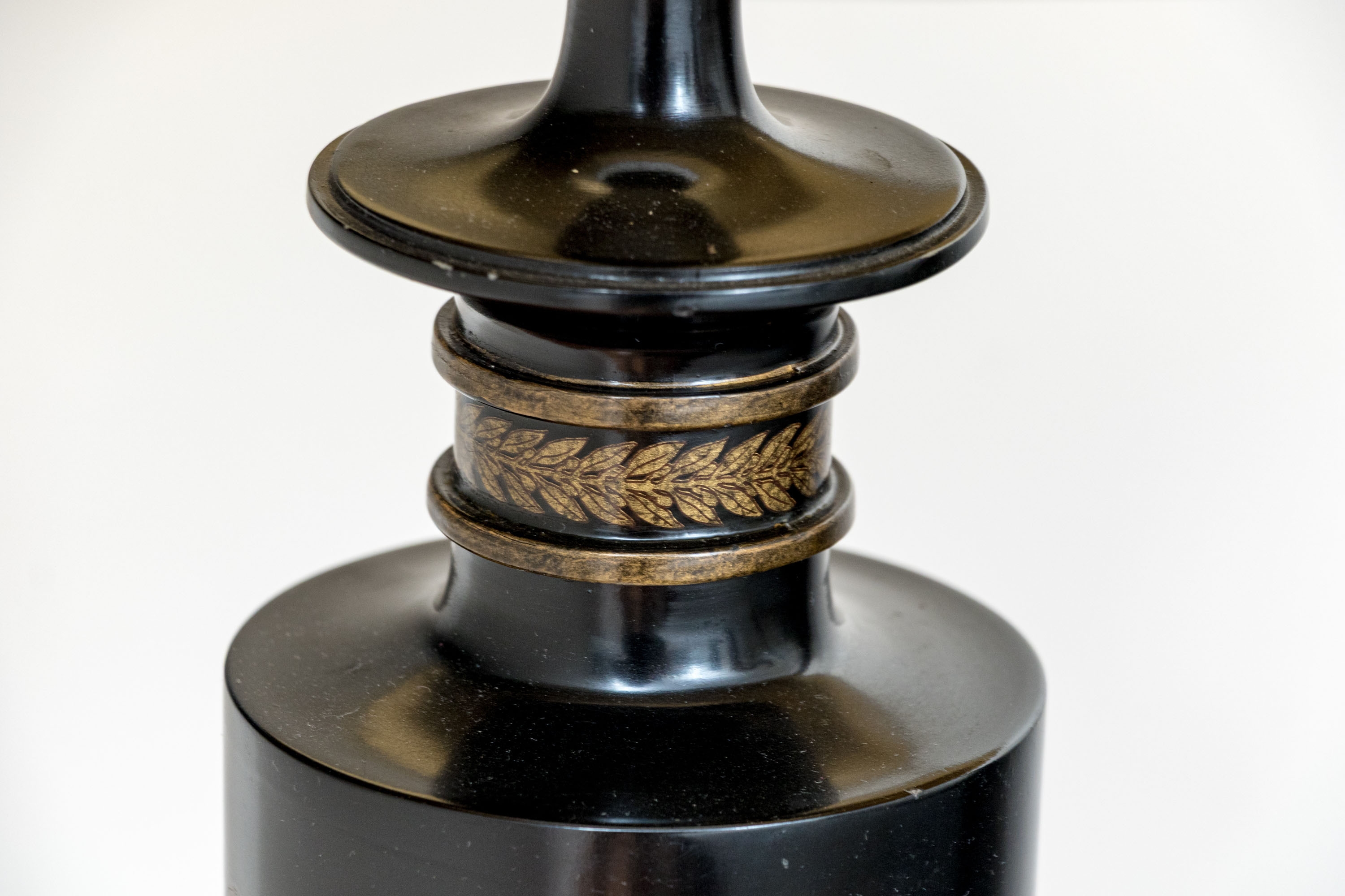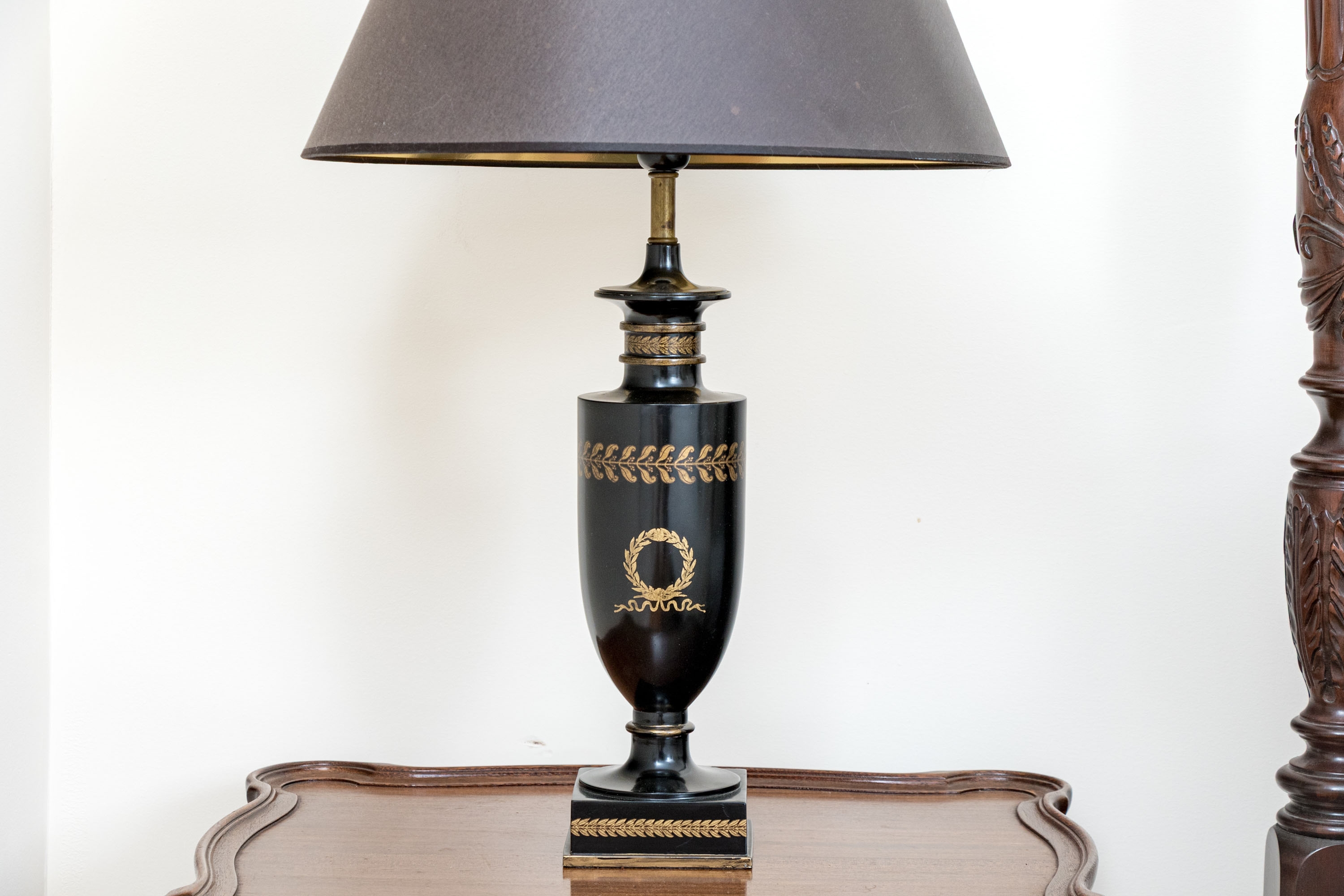 Heavy urns in black with gilt leaves around the necks, leafy bands at the tops over wreaths with ribbons. Mounted on square black bases with brass edges. With fine black fabric shades with gold paper linings.