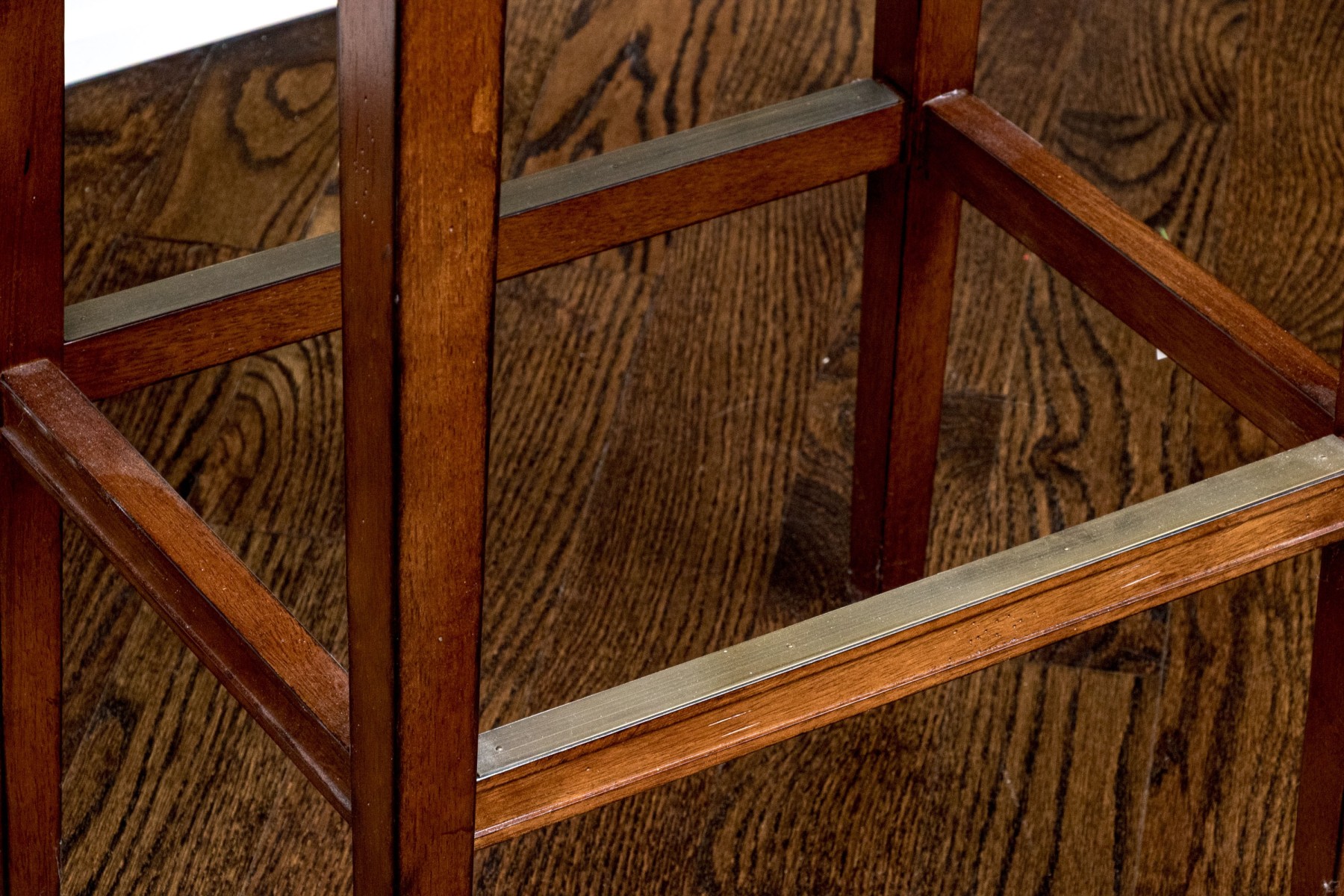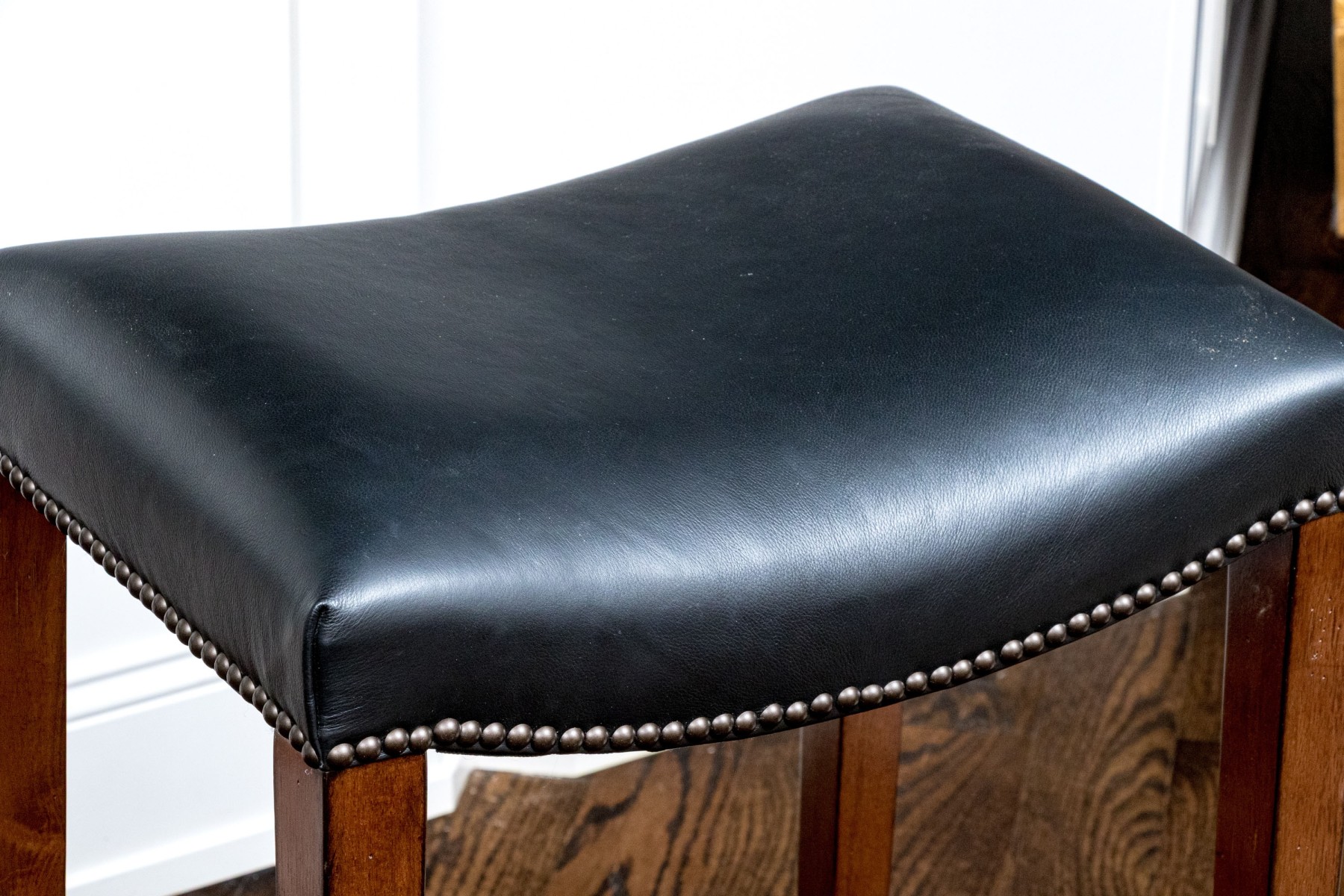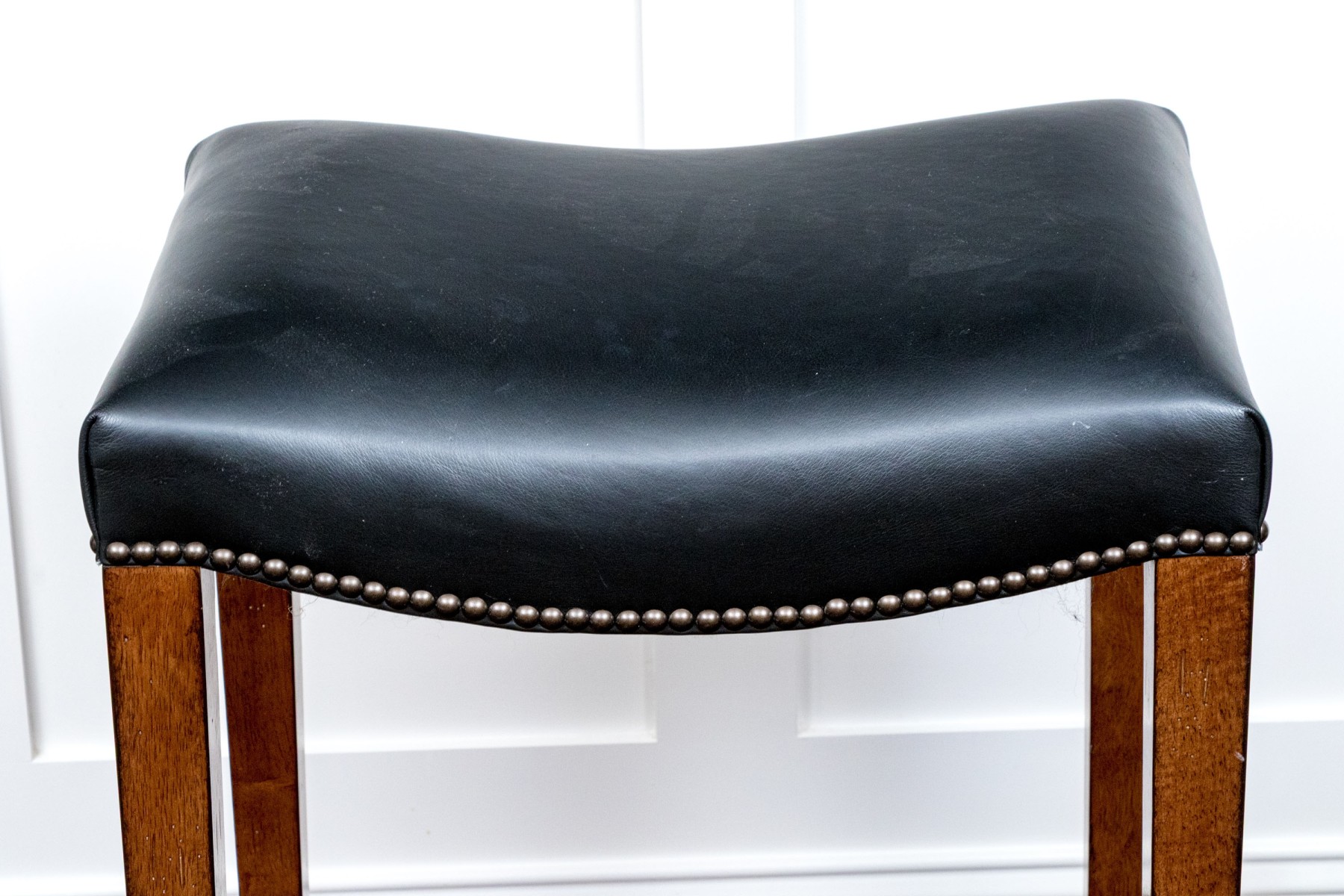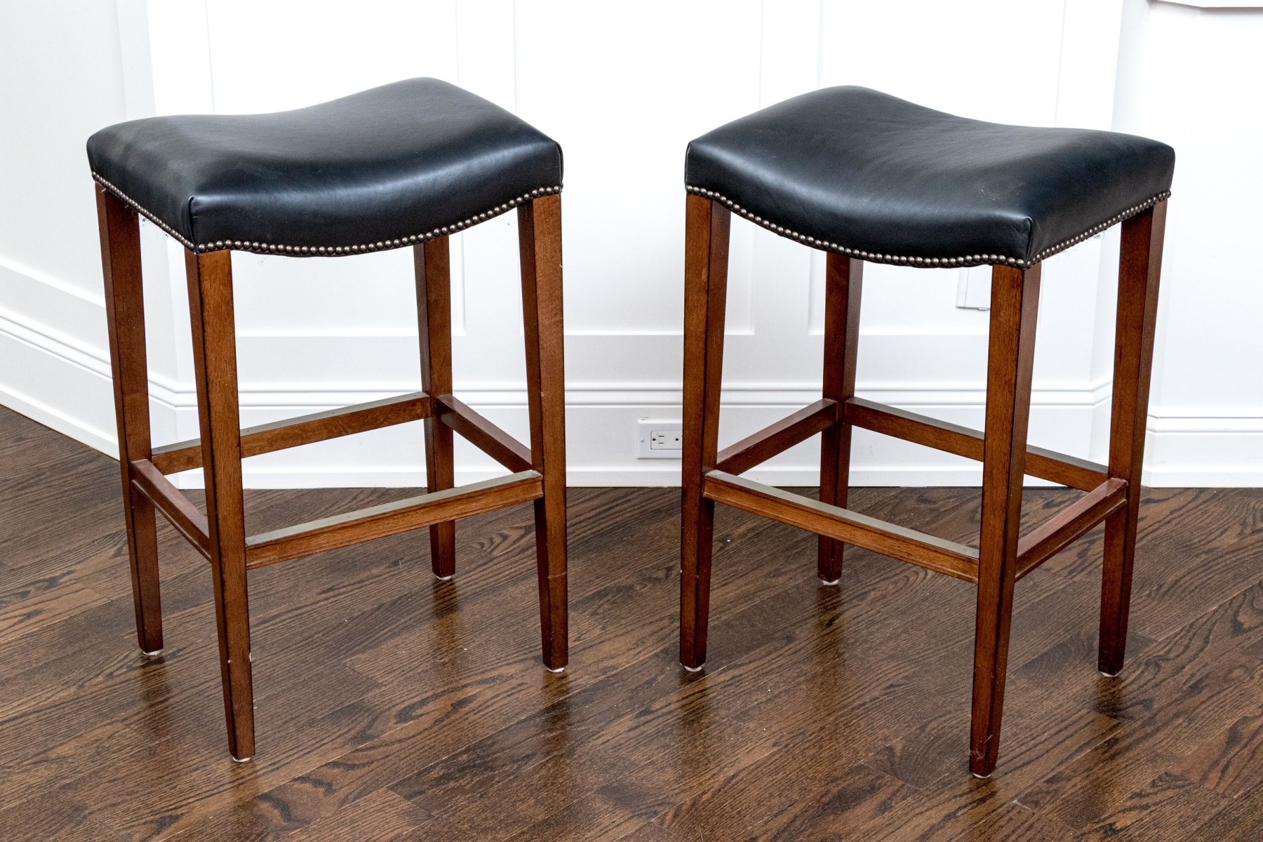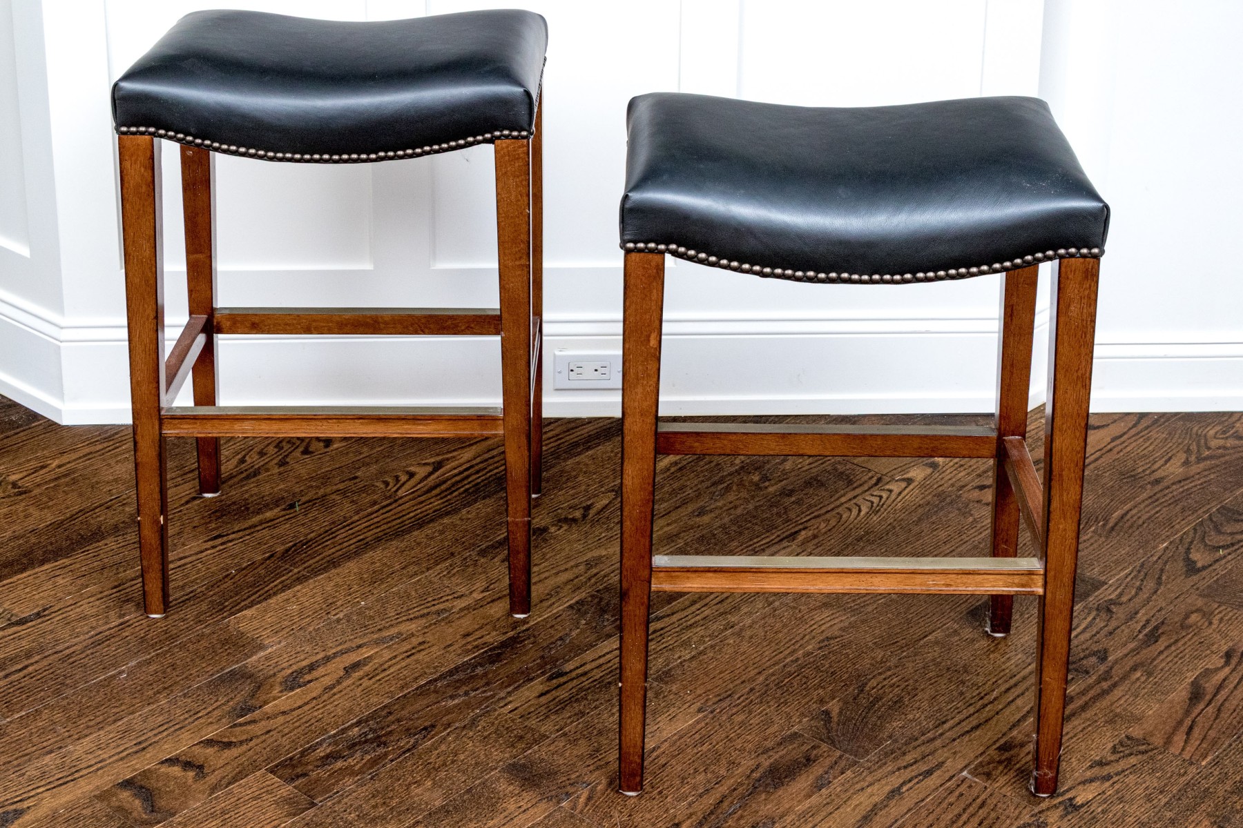 A handsome pair of Frontgate "Calais" barstools showcasing sleek black leather saddle seats with gray nailhead trims over simple warm-toned brown straight and tapered legs with box stretchers.