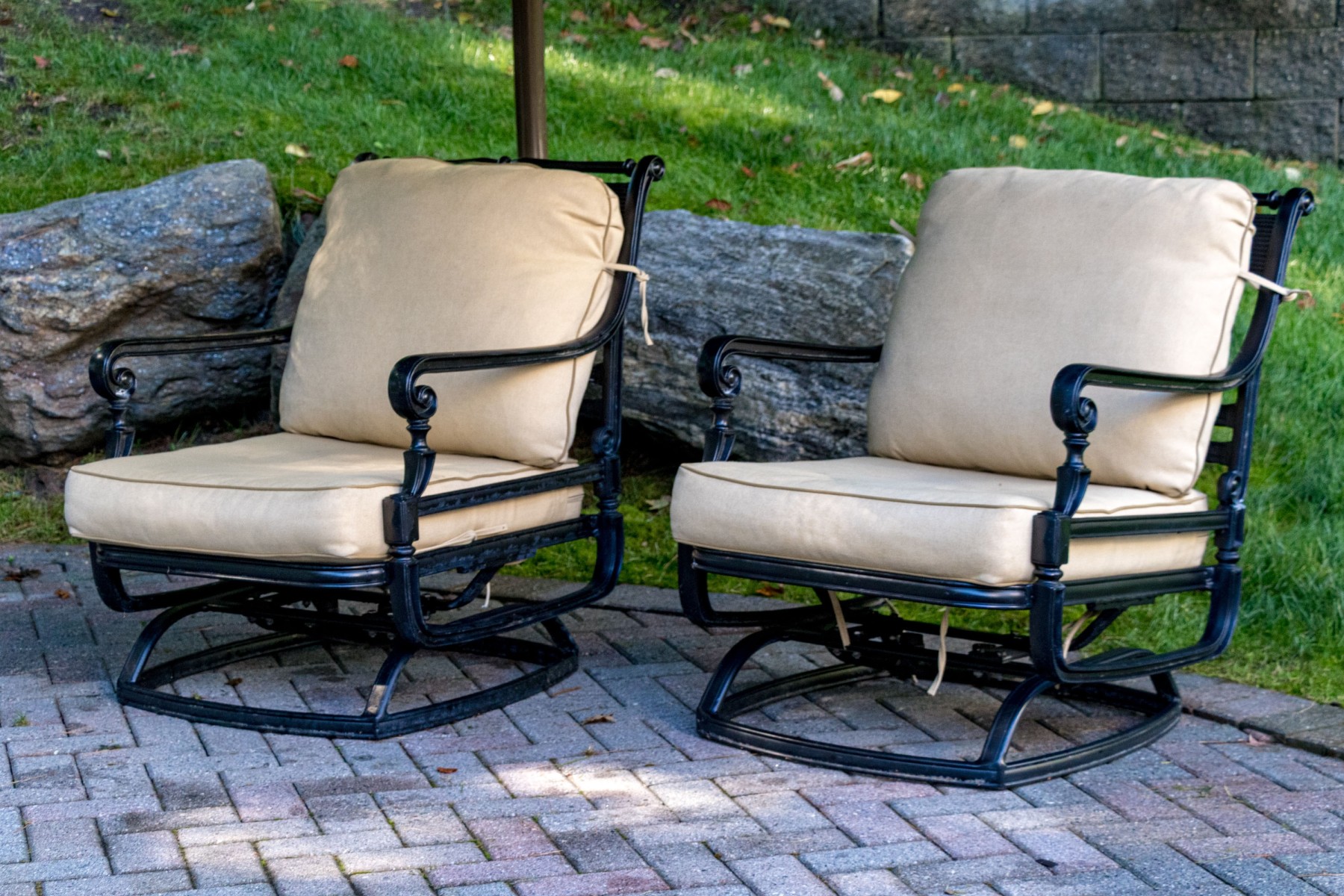 A high quality pair of Frontgate "Carlisle" outdoor lounge chairs featuring cast aluminum frames in a rich onyx black finish, designed with stately rolled backs with horizontal slats and scrolled arms on decoratively curving supports. Raised on glider bases and topped with loose back and seat cushions in a lovely warm cream hue, affixing to the frames with ties.