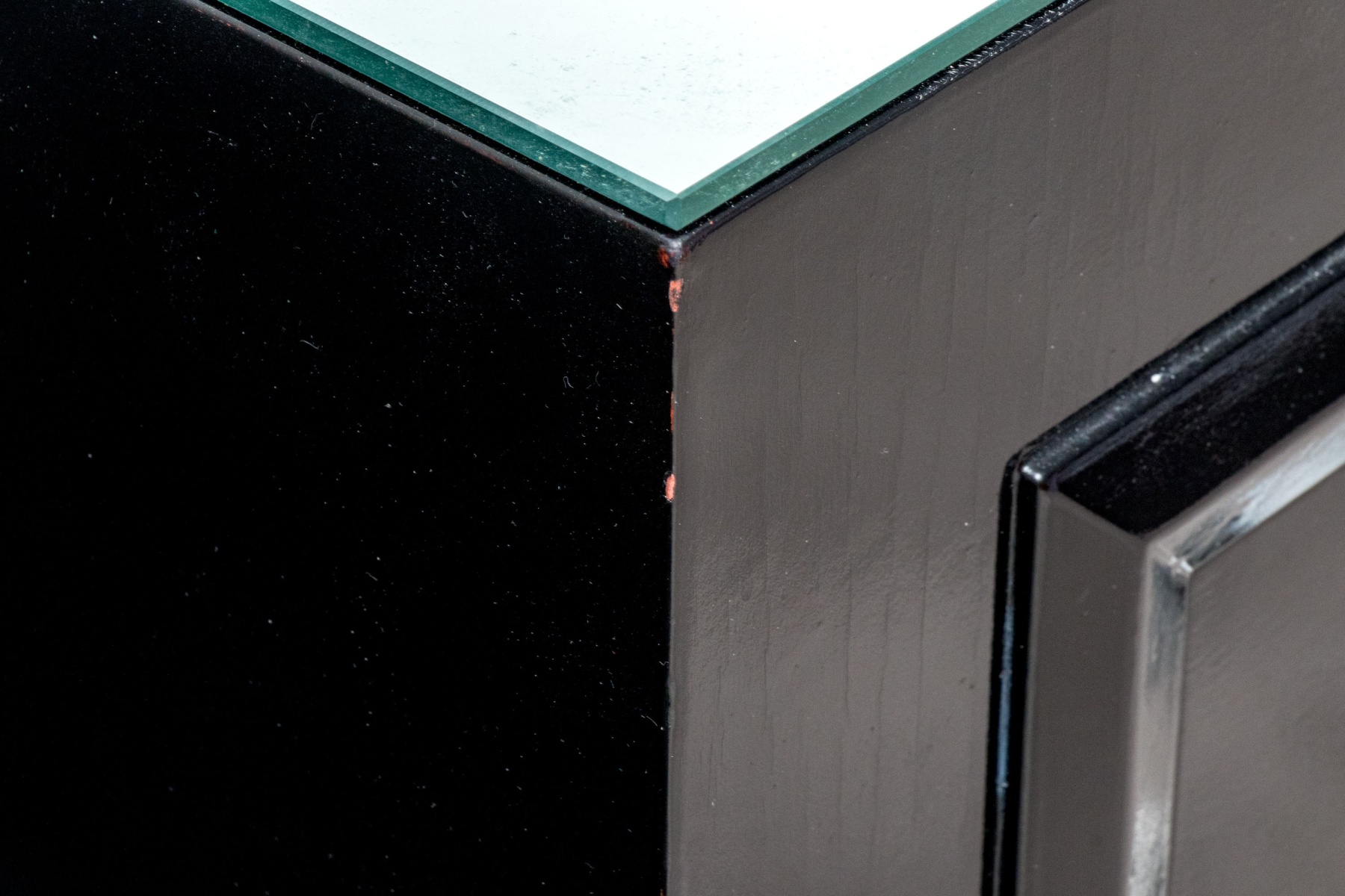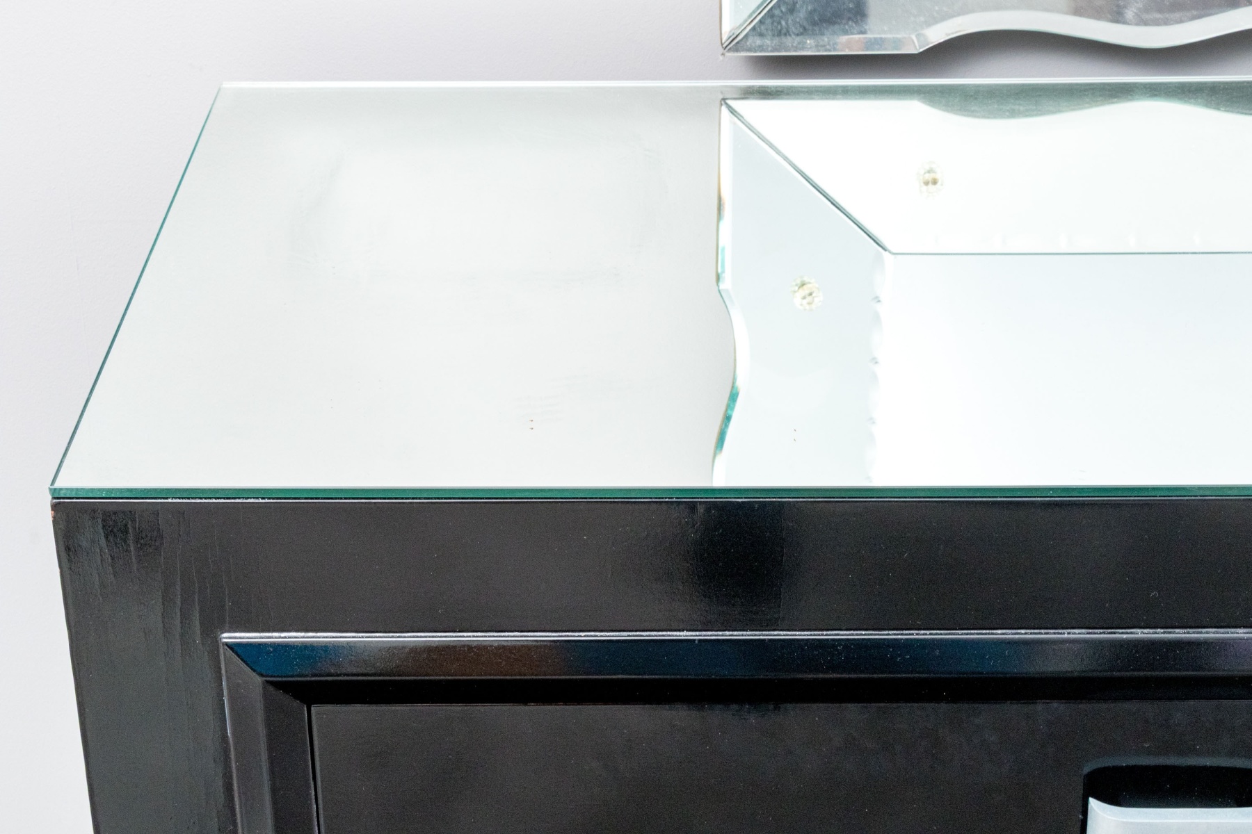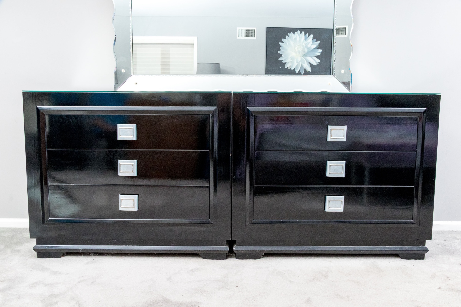 A delightful pair of Futurama custom made dresser chest of drawers with great mid-century modern appeal, showcasing sleek rectangular cases lacquered black and fitted with three drawers each adorned with impactful gray metal rounded bracket handles. Finished with mirror top and raised on recessed aprons with a beveled borders over bracket feet.