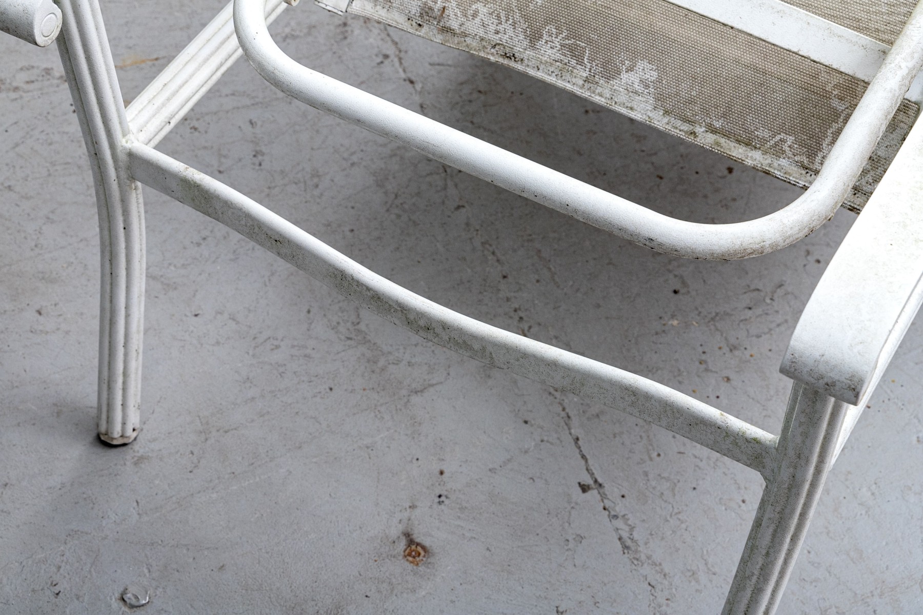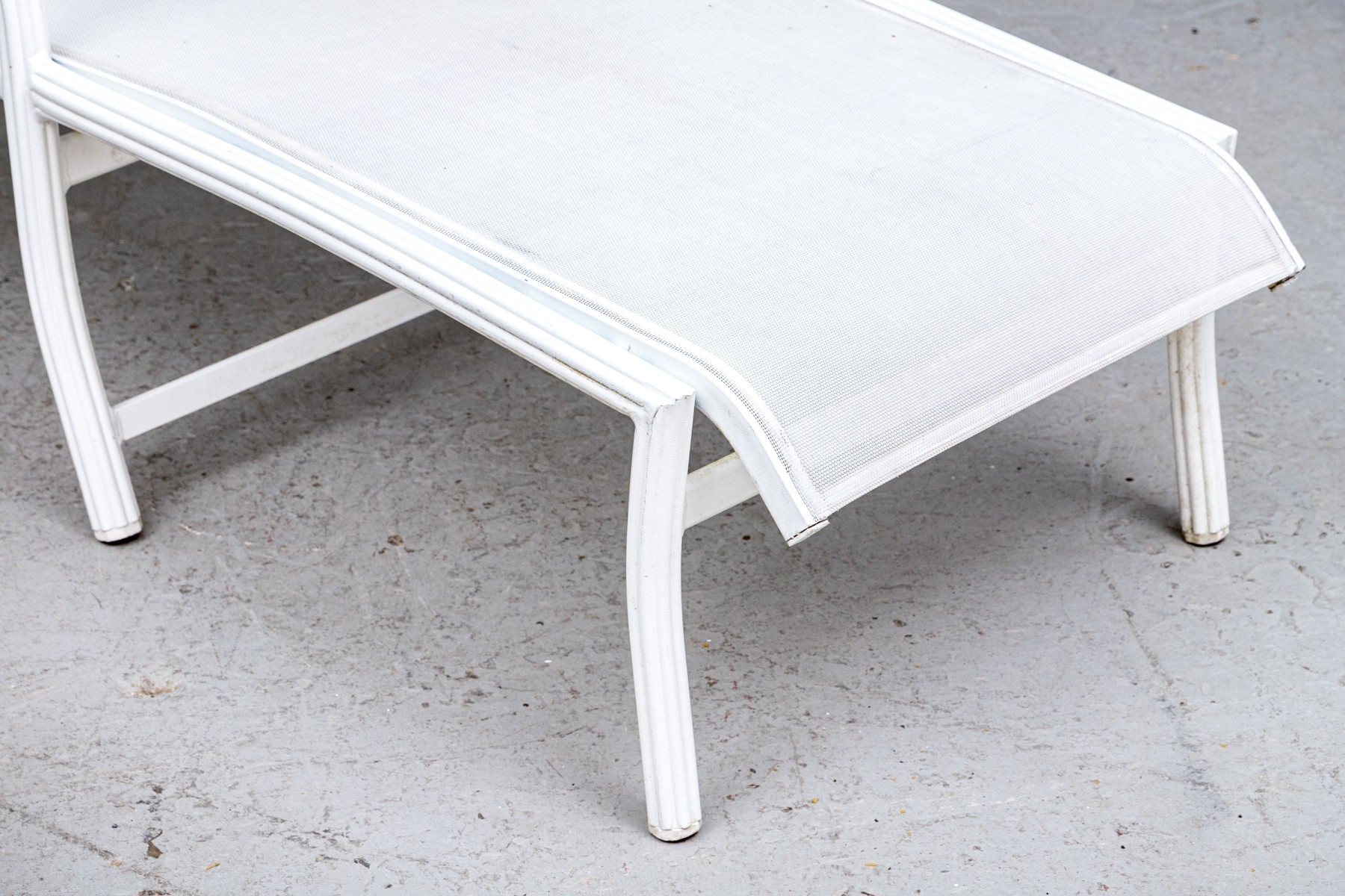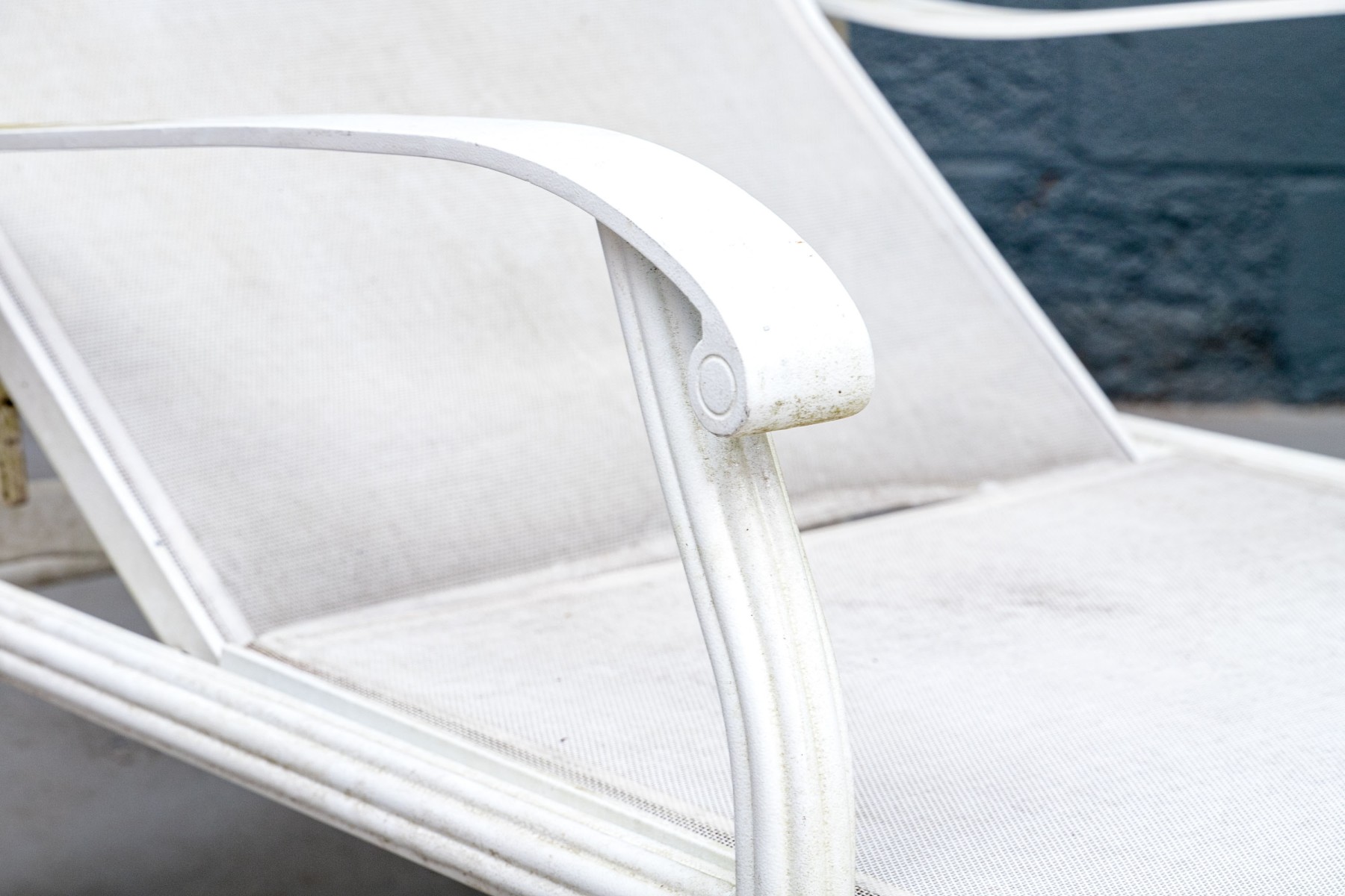 Each with white finished aluminum frames with mesh netted seats and seat backs.