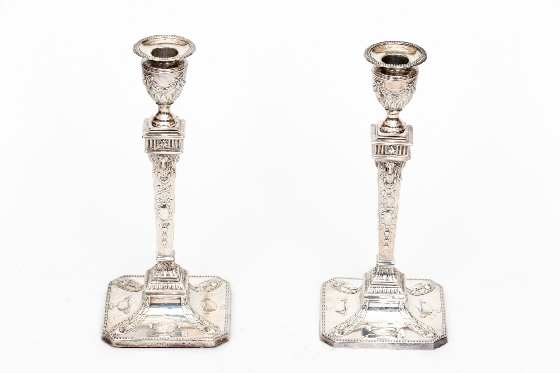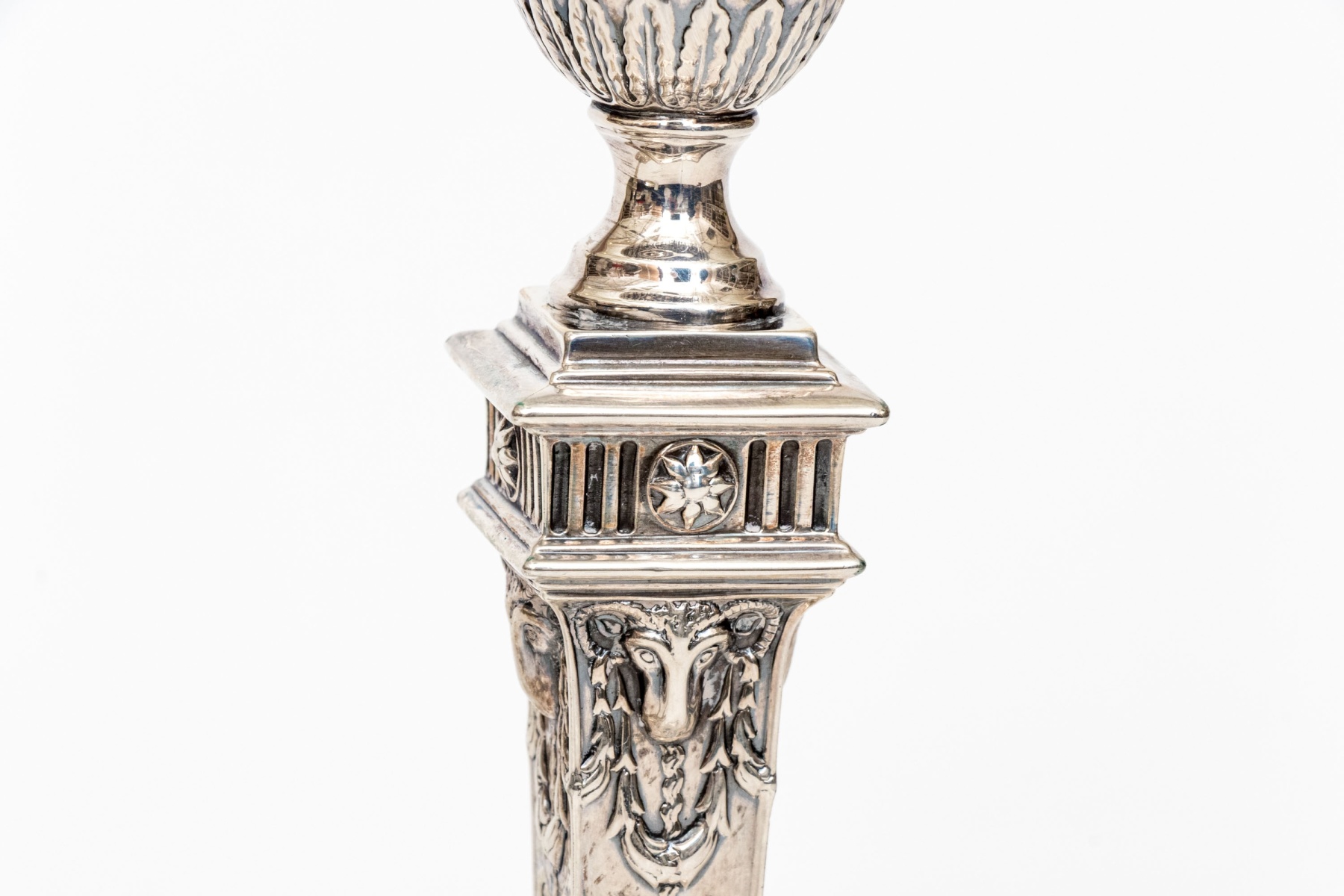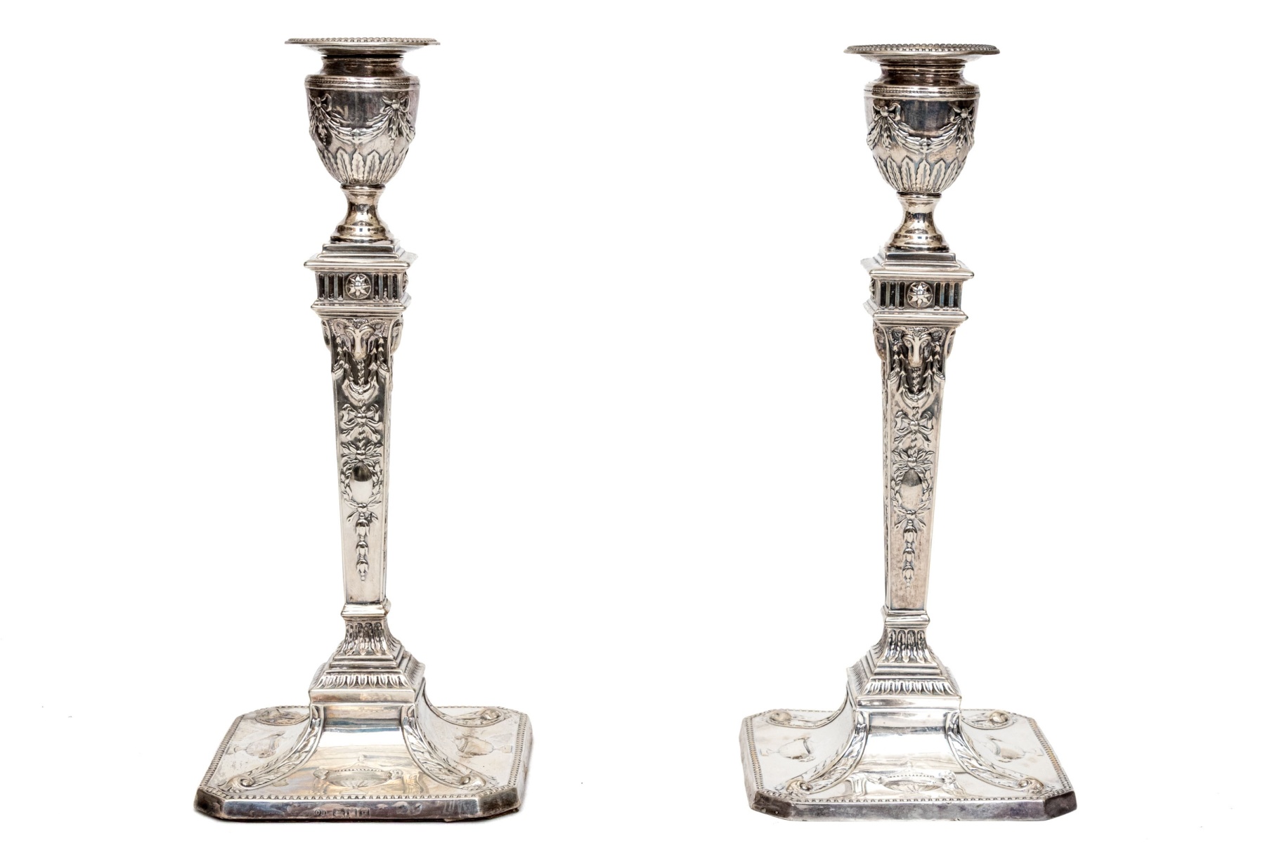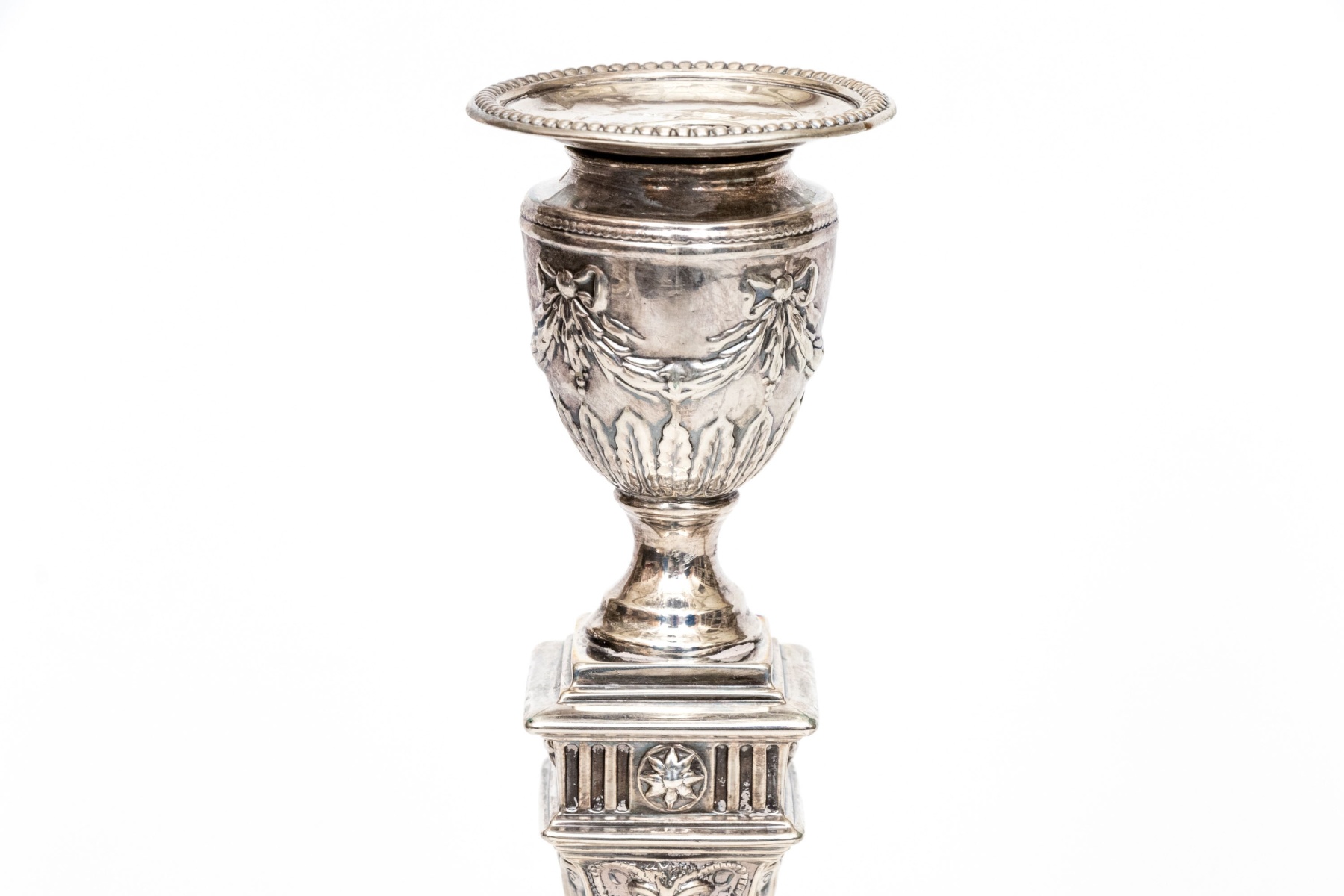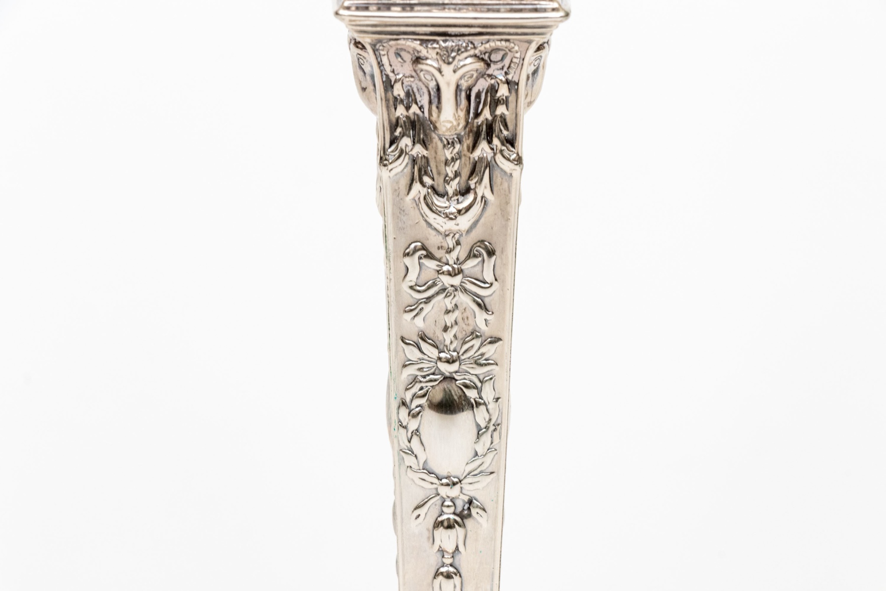 A high quality pair of English Georgian weighted sterling silver candlesticks with great neoclassical appeal, finely detailed with textured nozzled over urn form capitals with ribbon swags and foliate borders on pedestal feet over striking tapered square columns. Columns are decorated with swags and wreaths in gentle relief, leading down to impressive cut-corner rectangular bases with foliate flourishes at the diagonals alternating between imagery of urns. Hallmarked along the edges of the bases appearing CB, possibly Charles Boyton II. Purportedly purchased at Christies.