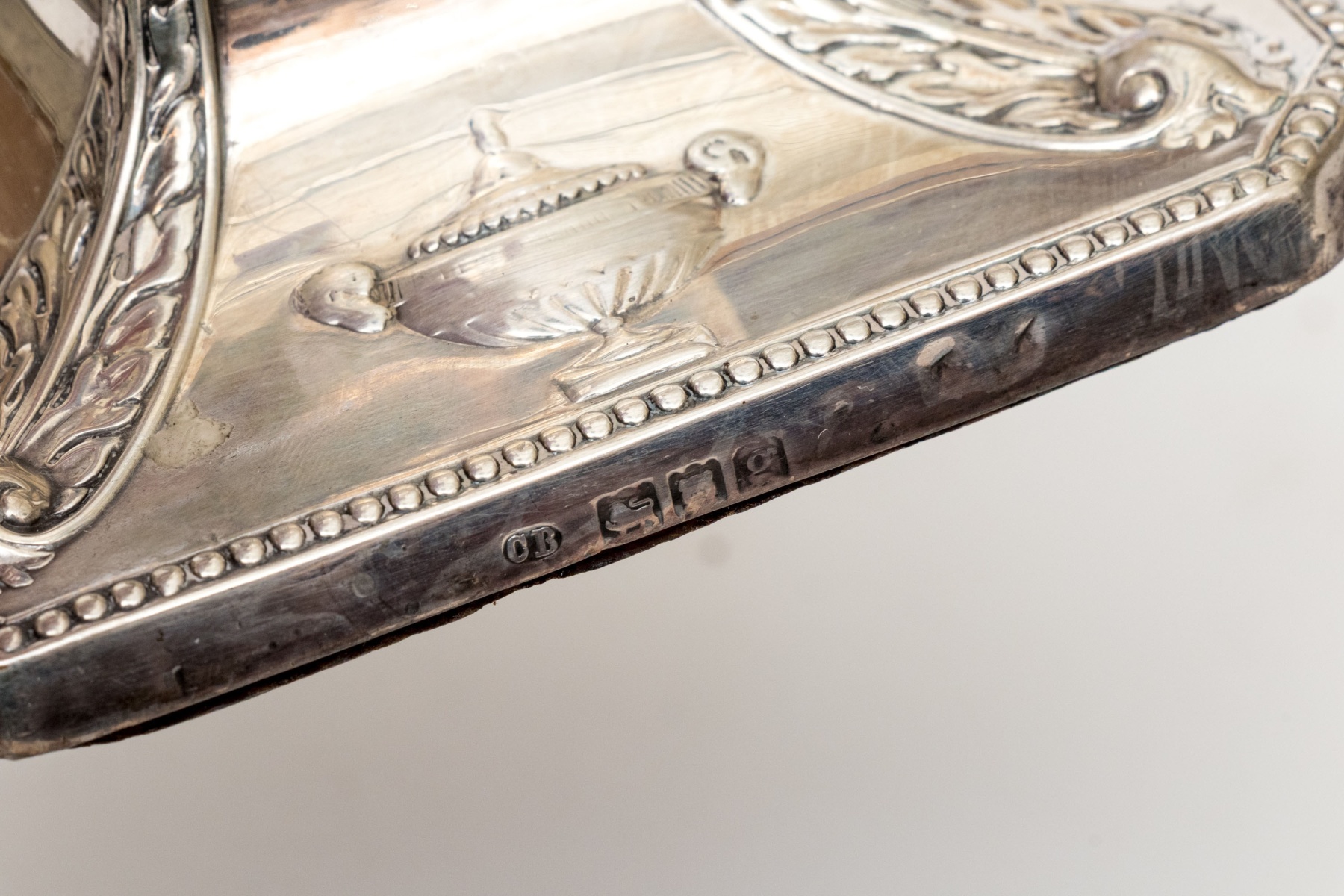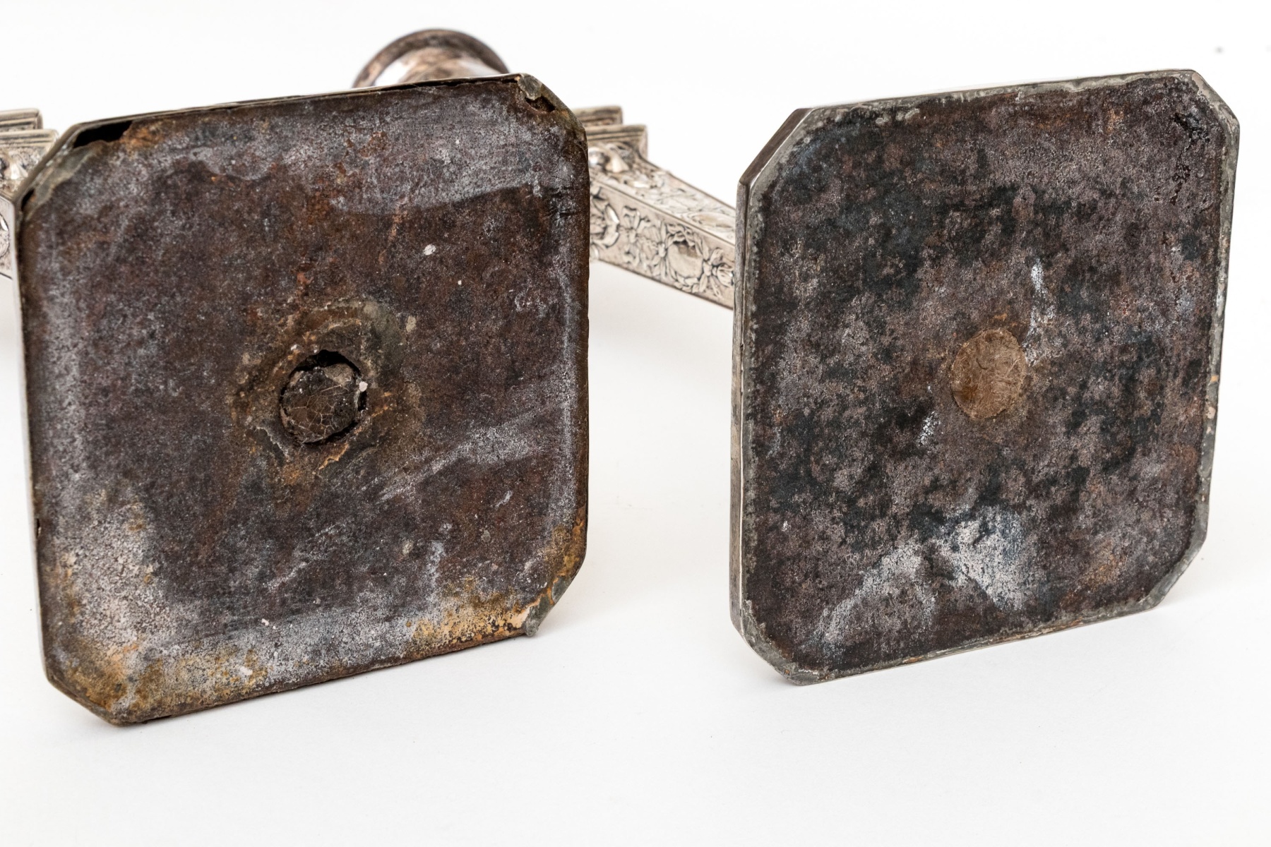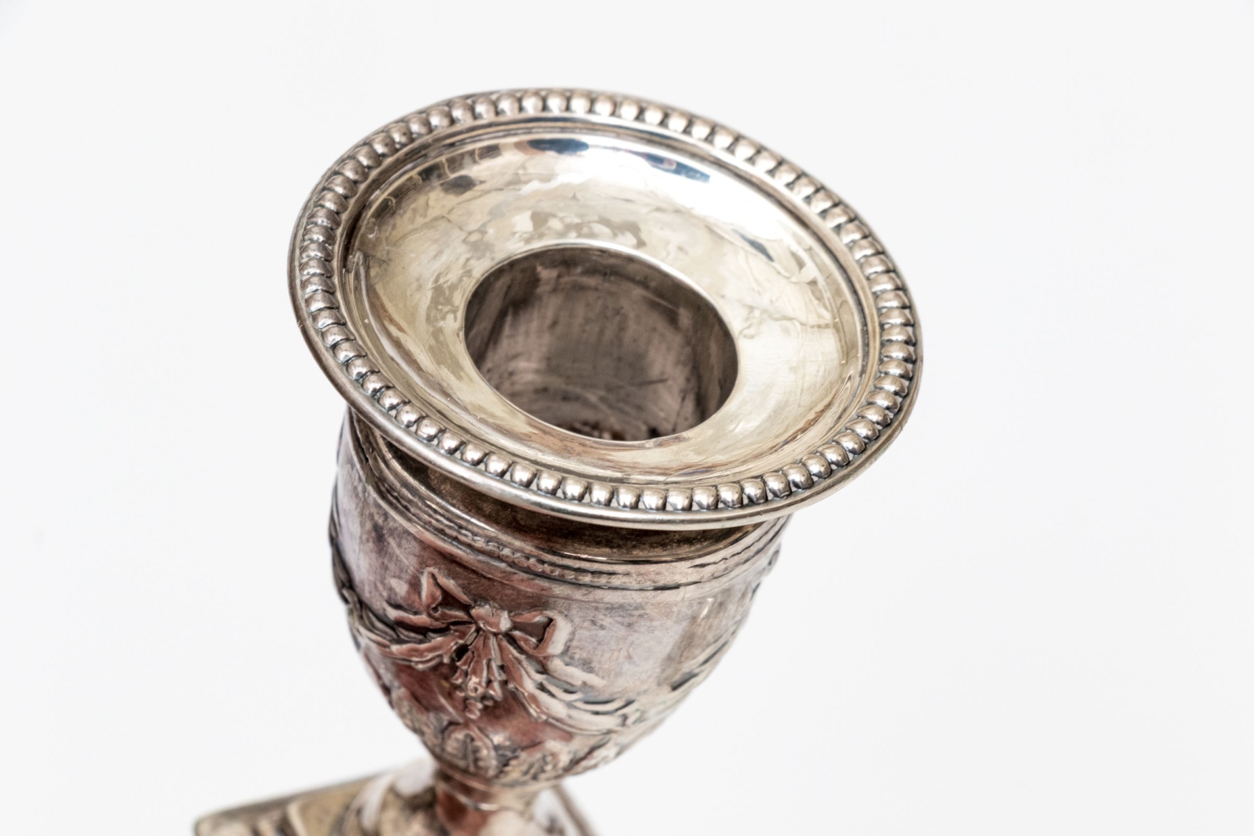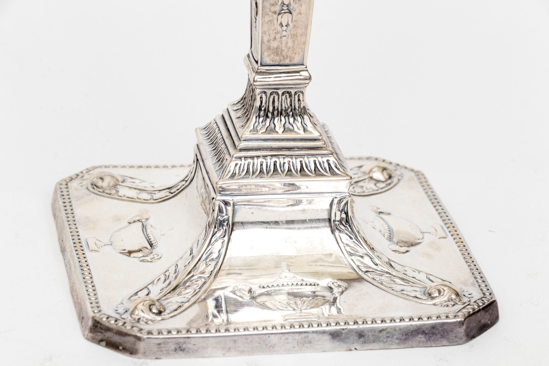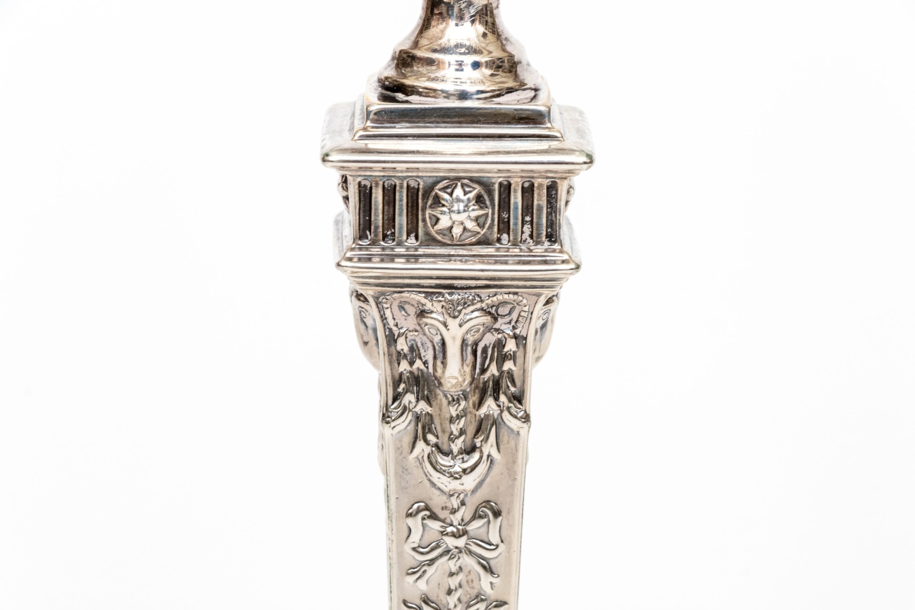 A high quality pair of English Georgian weighted sterling silver candlesticks with great neoclassical appeal, finely detailed with textured nozzled over urn form capitals with ribbon swags and foliate borders on pedestal feet over striking tapered square columns. Columns are decorated with swags and wreaths in gentle relief, leading down to impressive cut-corner rectangular bases with foliate flourishes at the diagonals alternating between imagery of urns. Hallmarked along the edges of the bases appearing CB, possibly Charles Boyton II. Purportedly purchased at Christies.