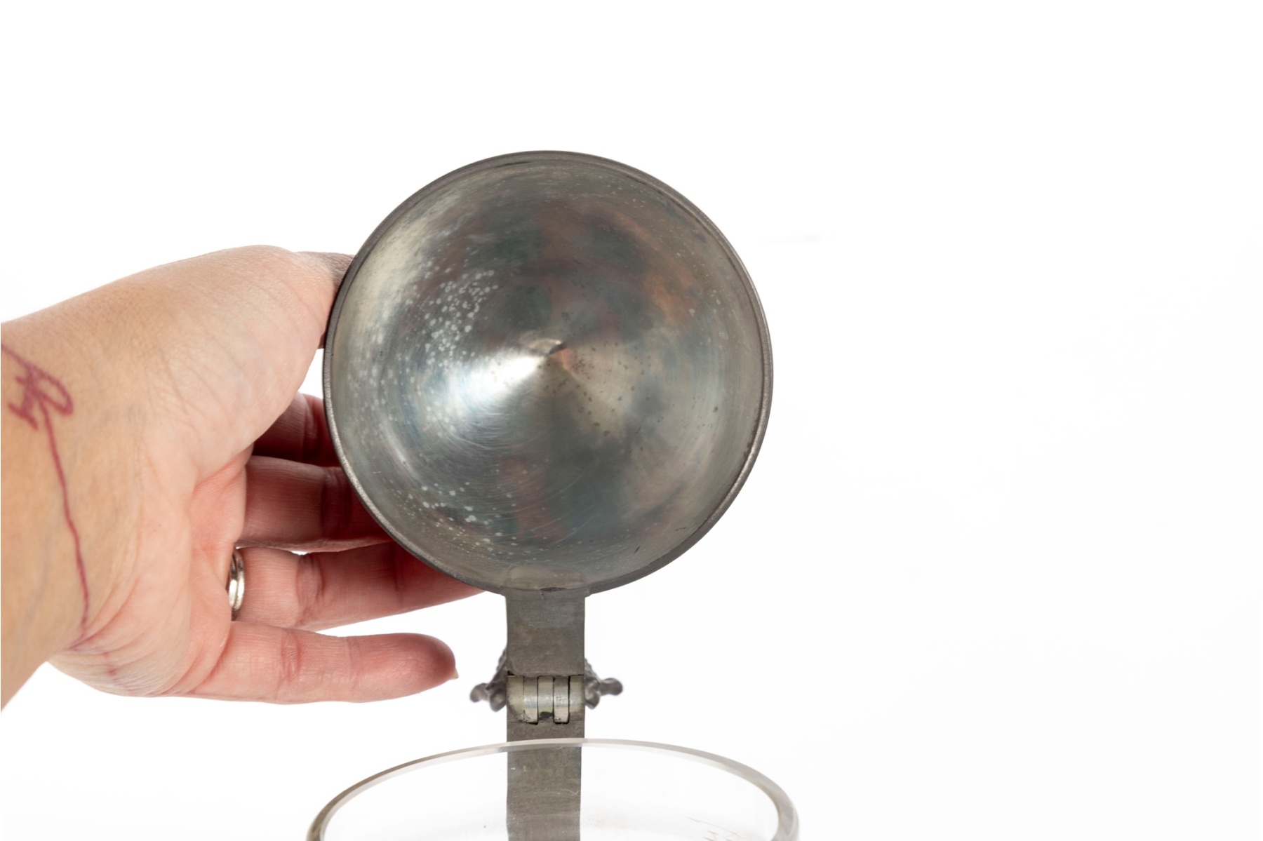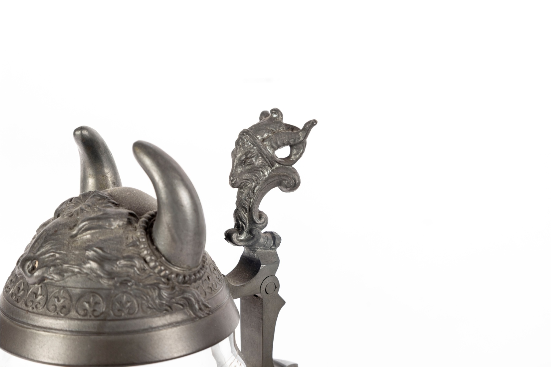 Pair of vintage German beer steins including one clear glass stein with pewter lid, featuring a heraldic crest and “Meiner Gesundheit” inscription, and one ceramic stein marked “Schwabing München” with a pewter lid and city crest. Both display fine craftsmanship and traditional Bavarian motifs, ideal for display or collection.