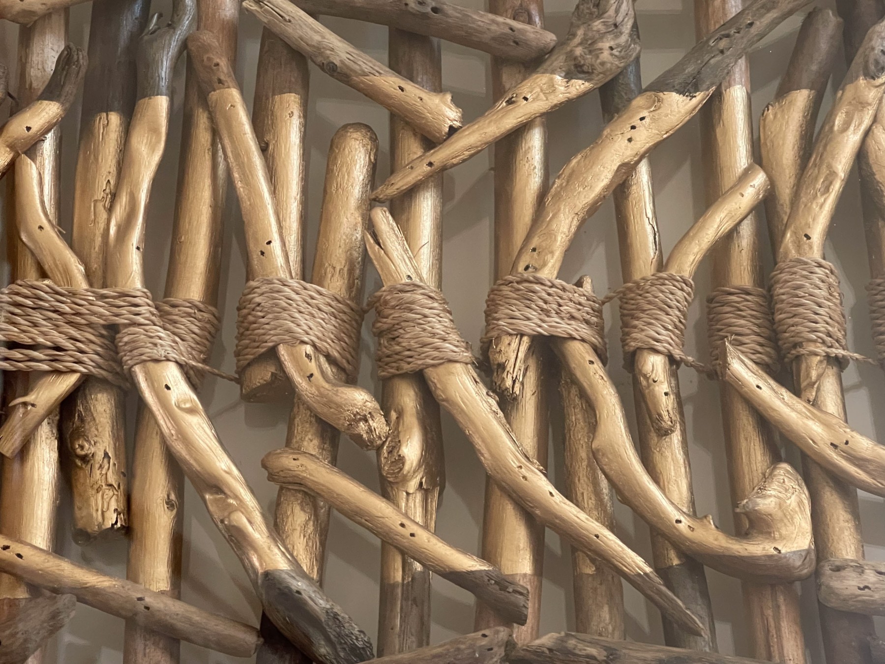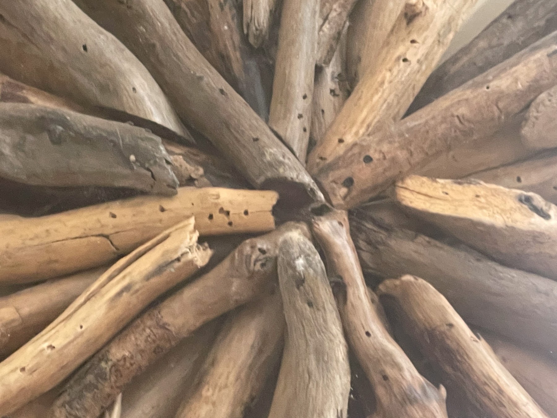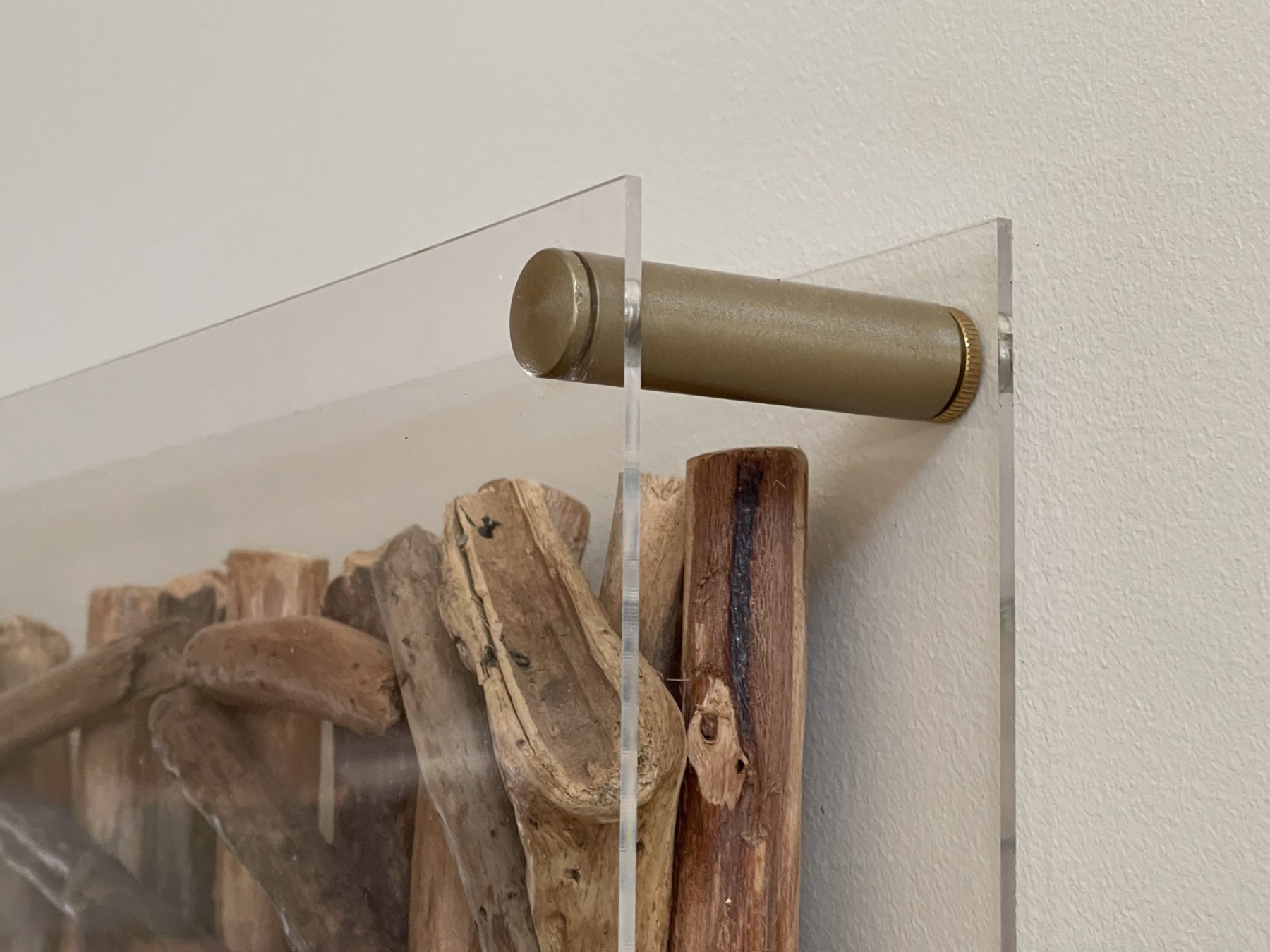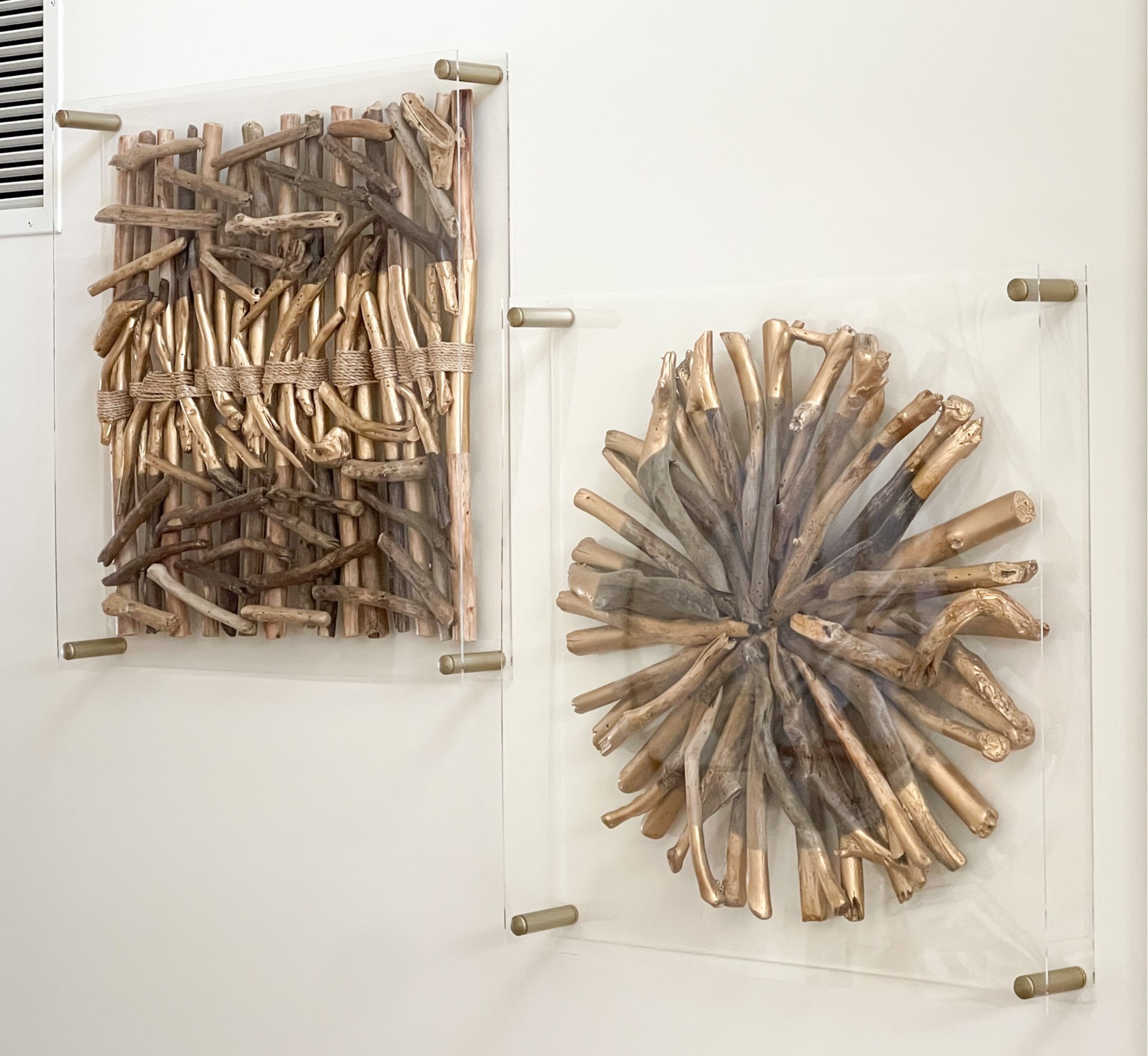 A chic pair of wall art pieces featuring textural arrangements of driftwood with gilt accents, housed within clear acrylic mountings.