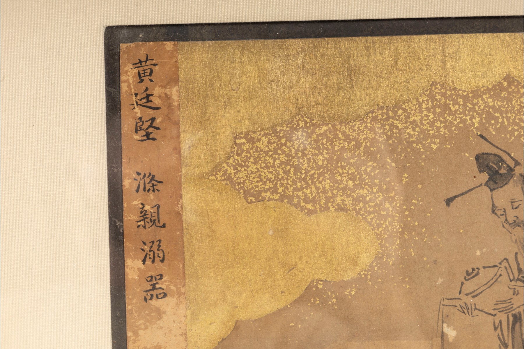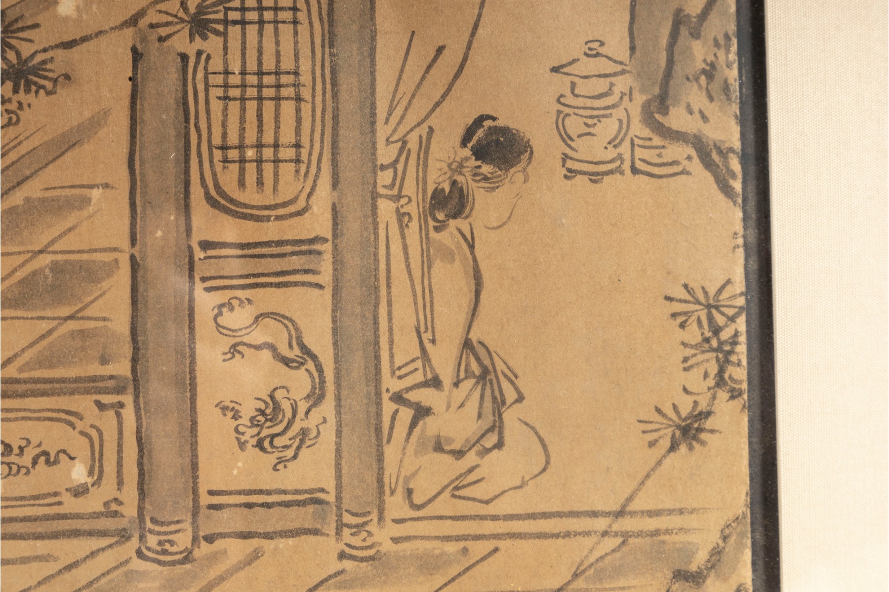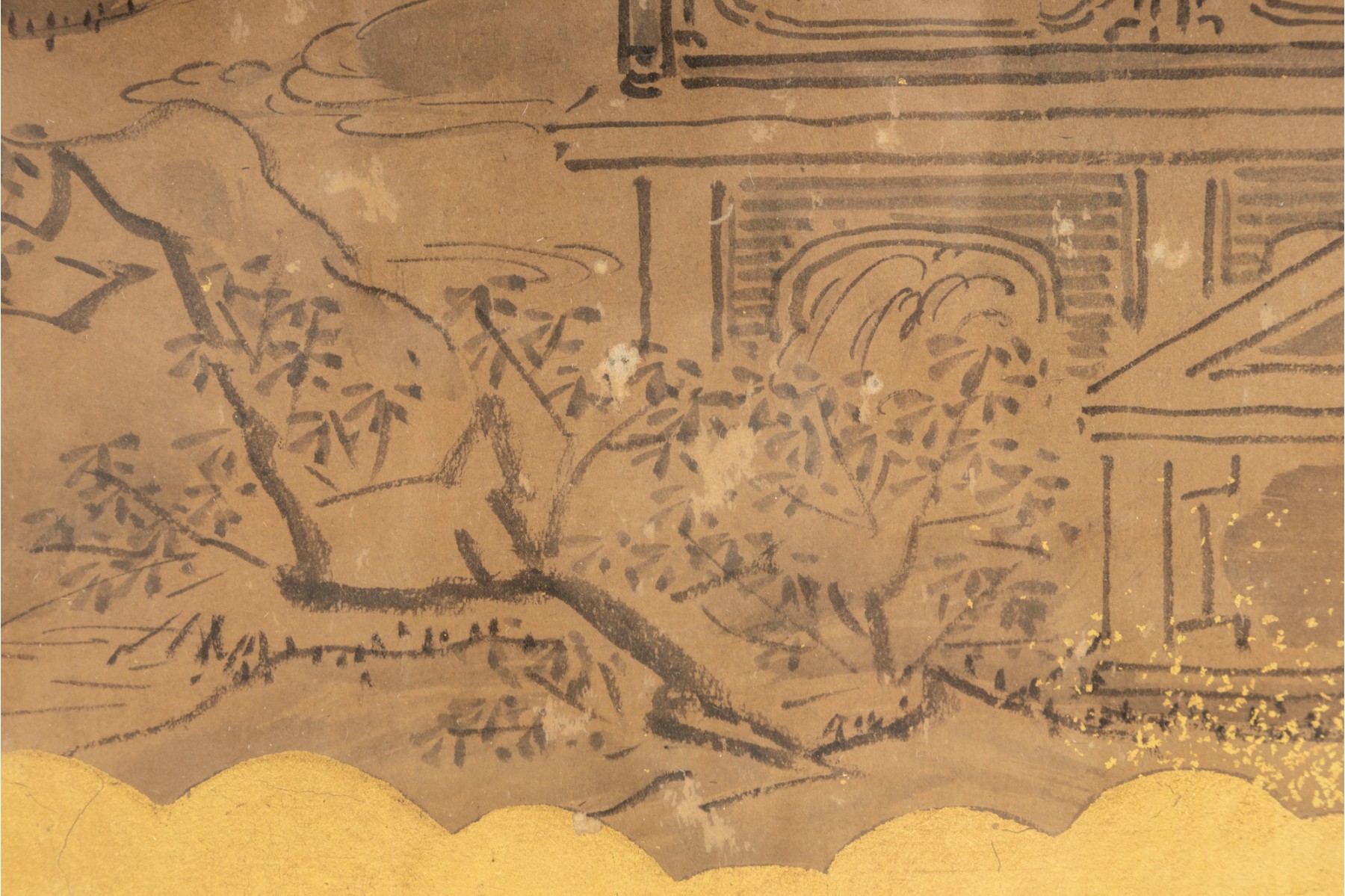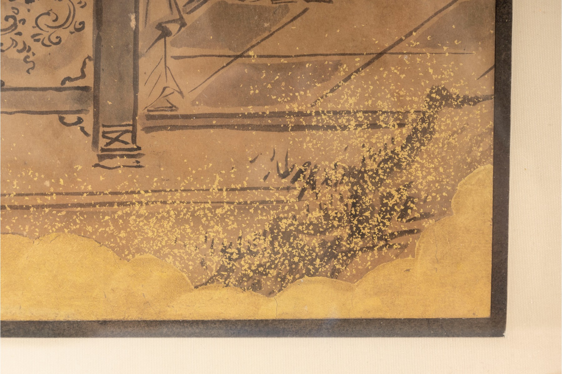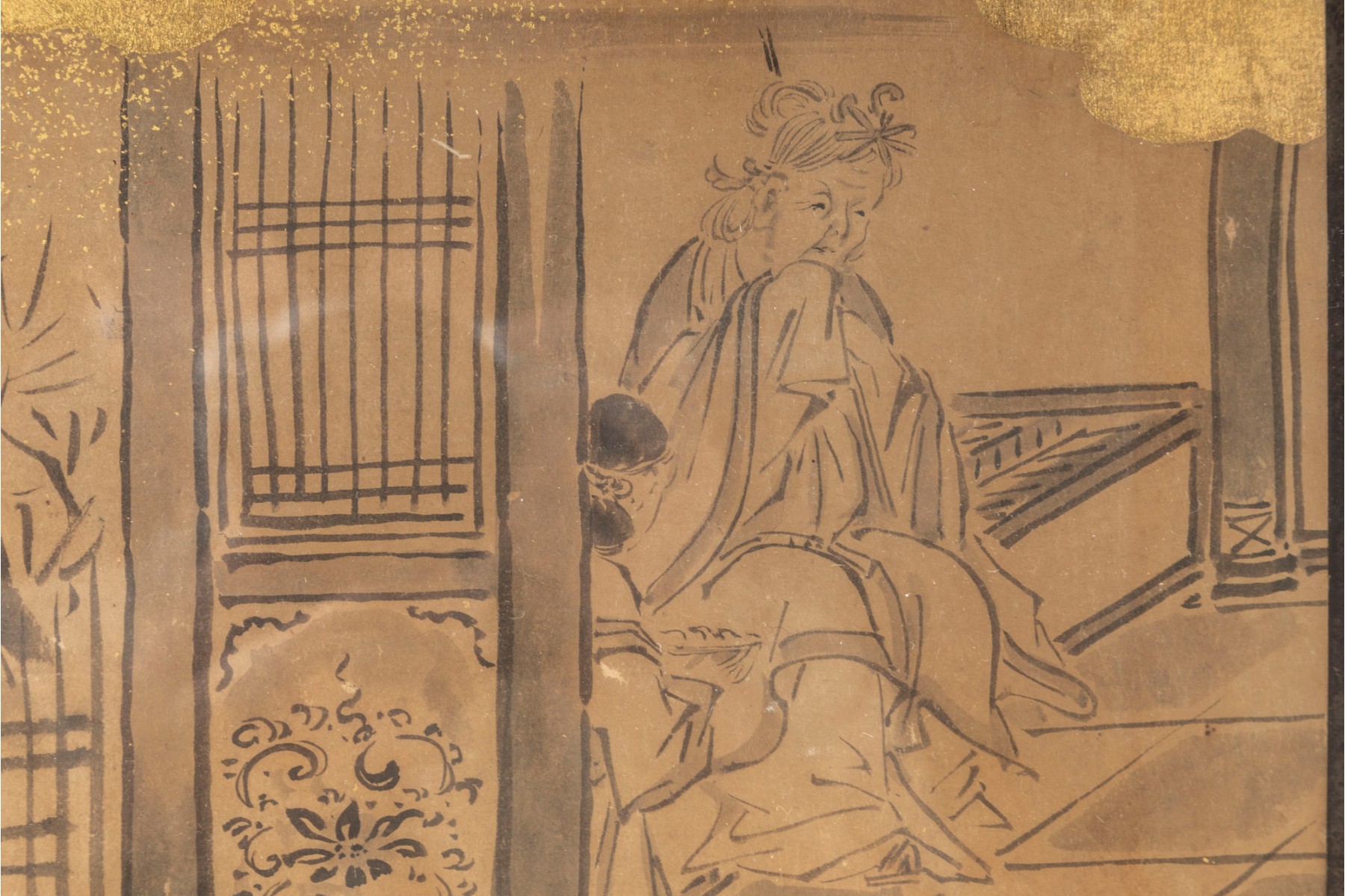 A pair of framed traditional Chinese paper & ink paintings. Each illustration is meticulously drawn, depicting finely detailed figures dressed in opulent attire typical of their era. The interplay of ink and gold creates a striking visual contrast, making these artworks not only a celebration of historical fashion but also a captivating decorative statement.