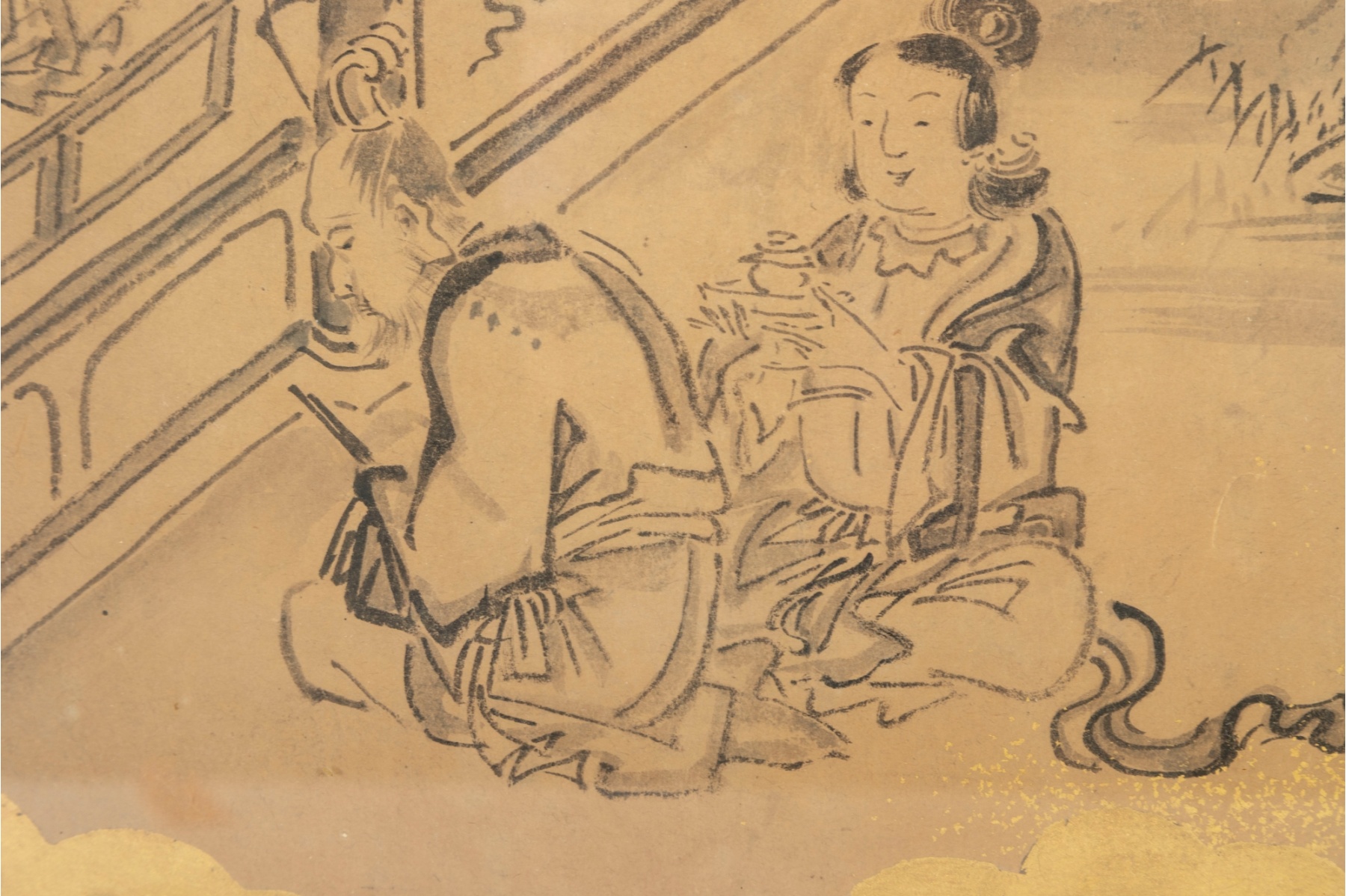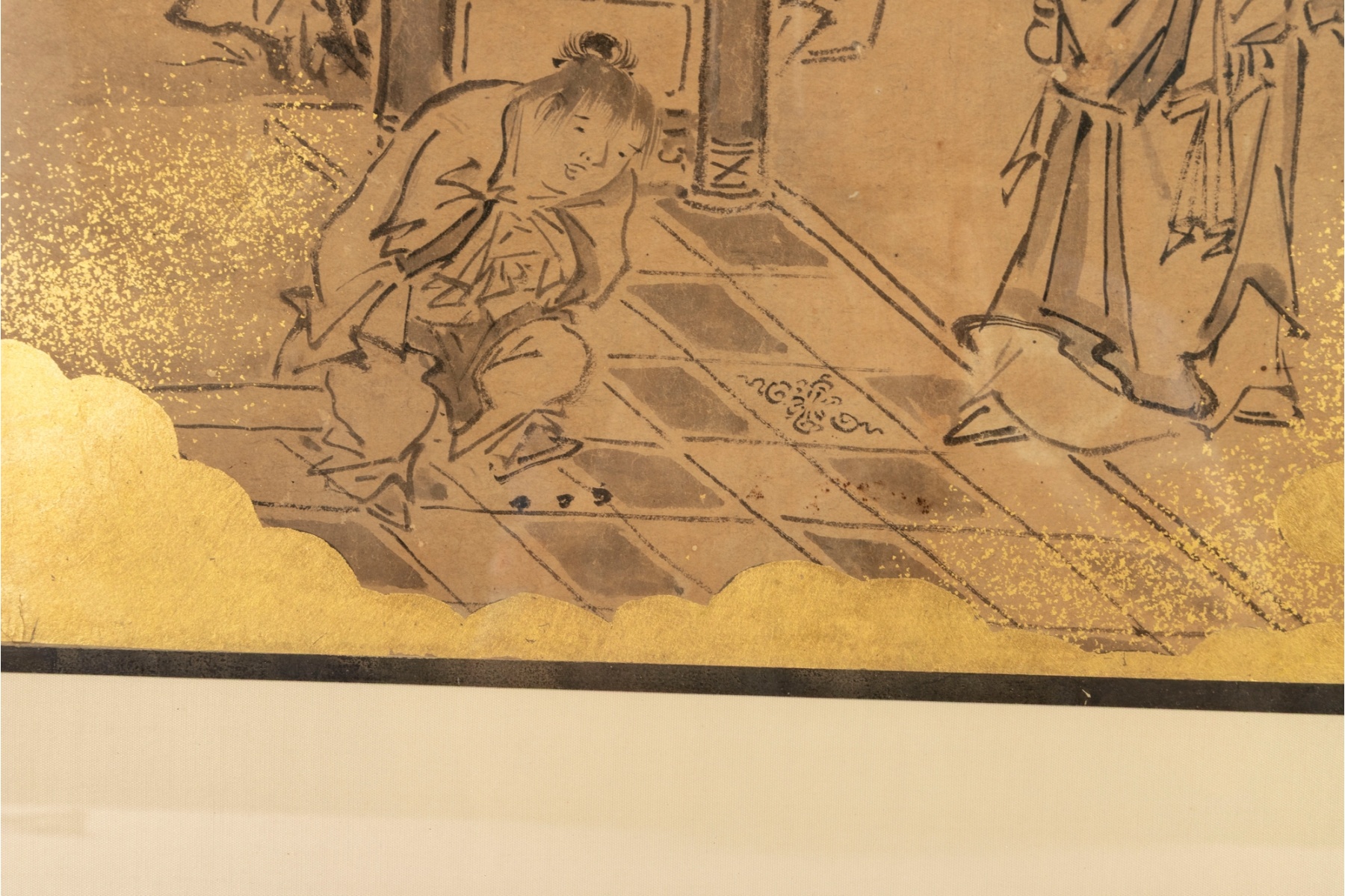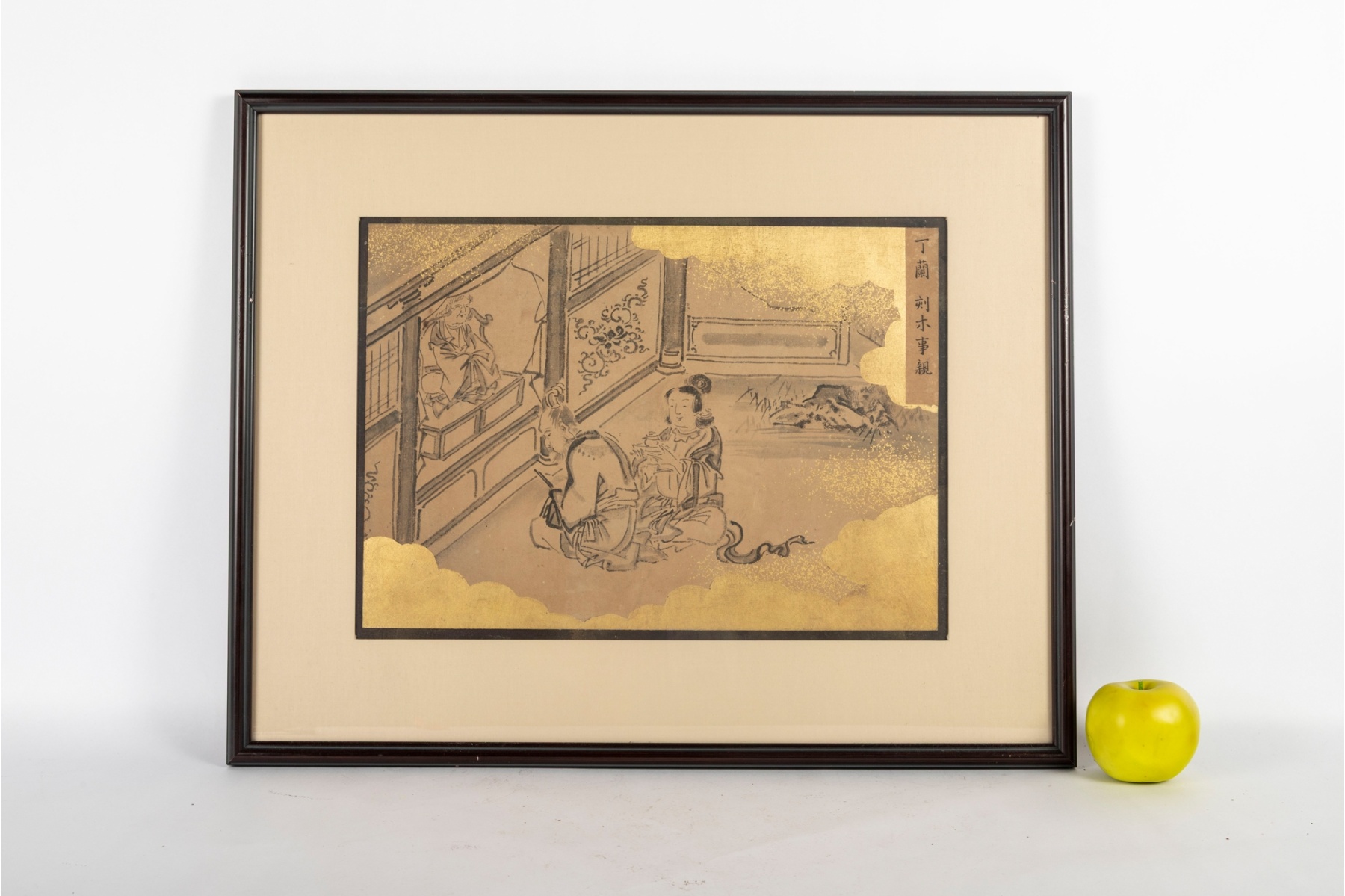 A pair of framed traditional Chinese paper & ink paintings. Each illustration is meticulously drawn, depicting finely detailed figures dressed in opulent attire typical of their era. The interplay of ink and gold creates a striking visual contrast, making these artworks not only a celebration of historical fashion but also a captivating decorative statement.