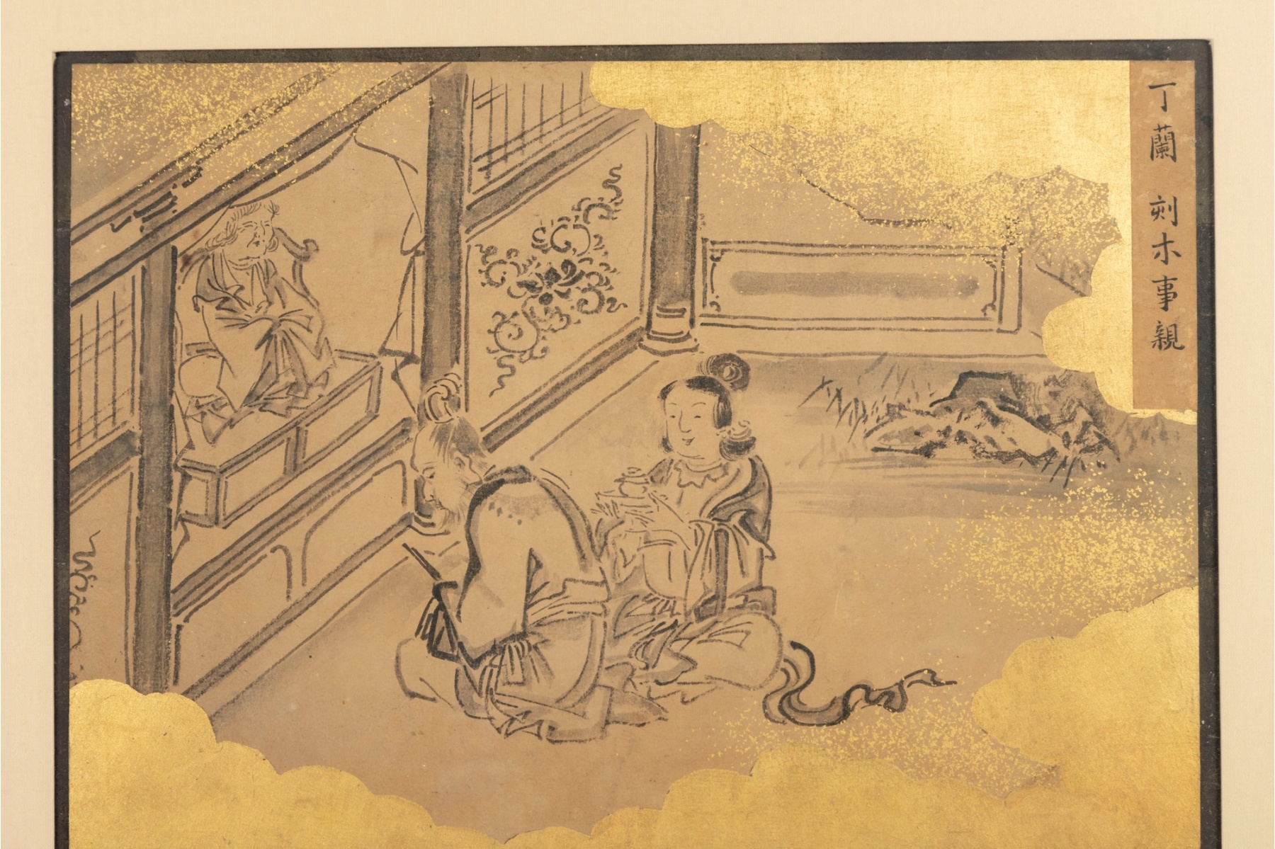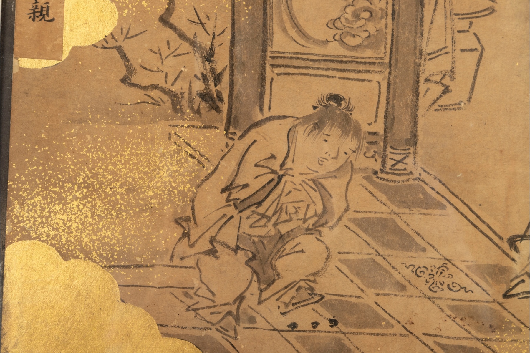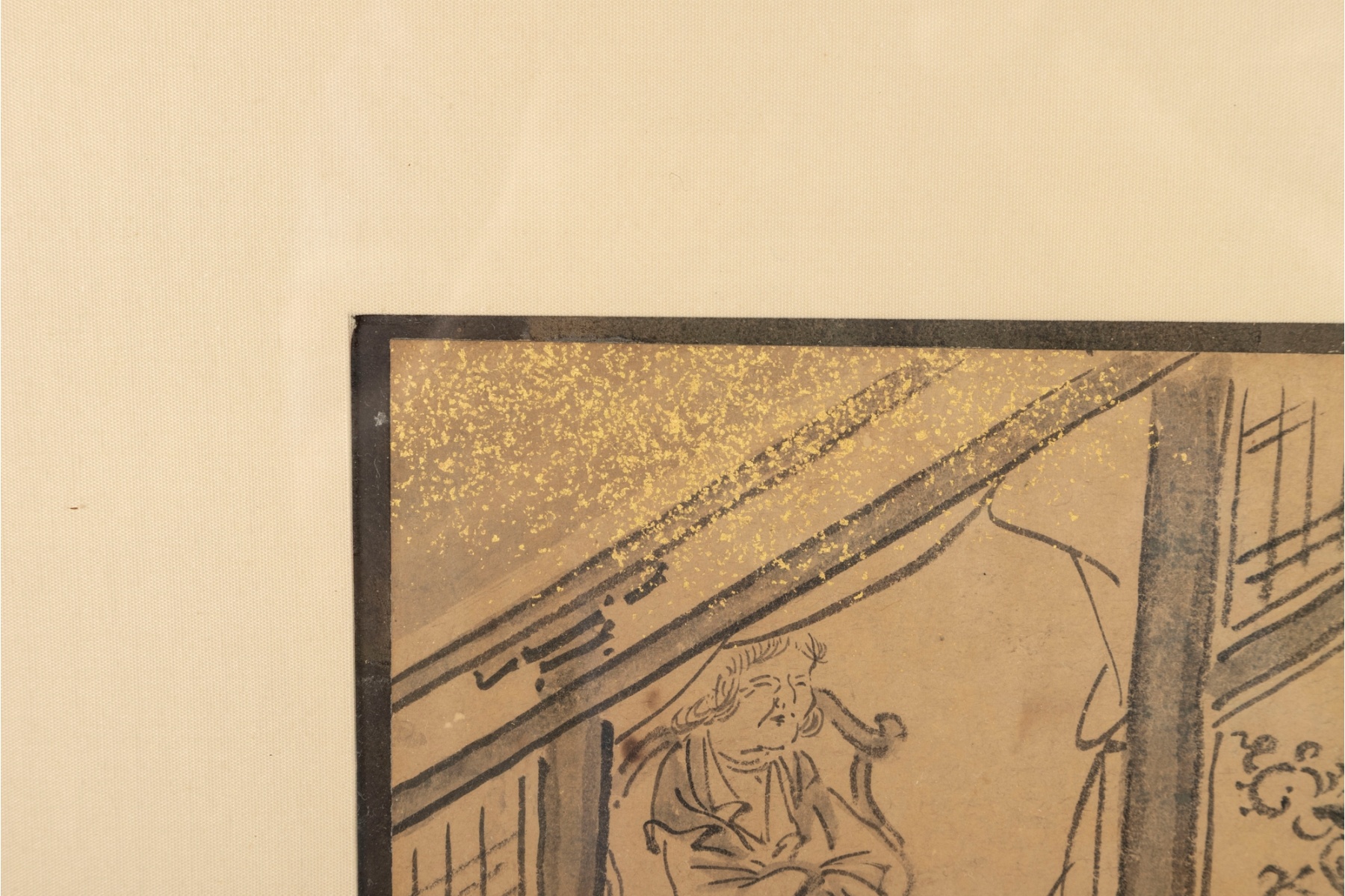 A pair of framed traditional Chinese paper & ink paintings. Each illustration is meticulously drawn, depicting finely detailed figures dressed in opulent attire typical of their era. The interplay of ink and gold creates a striking visual contrast, making these artworks not only a celebration of historical fashion but also a captivating decorative statement.