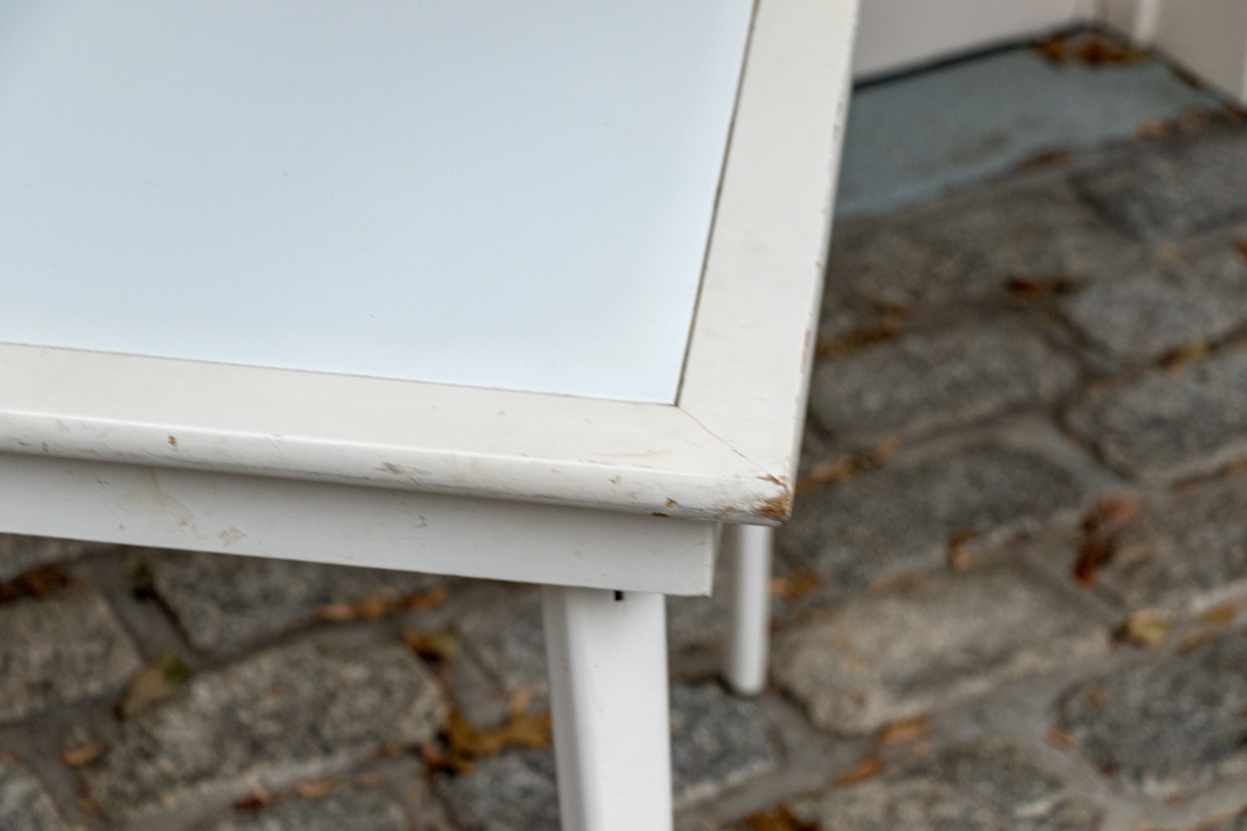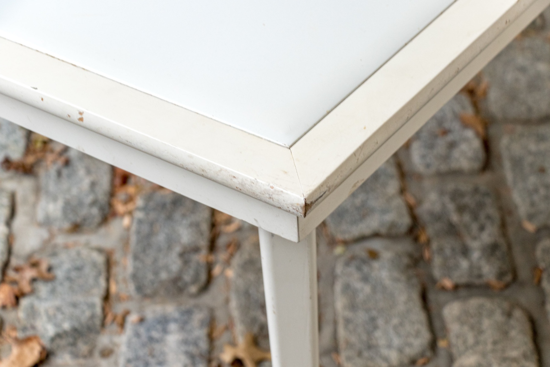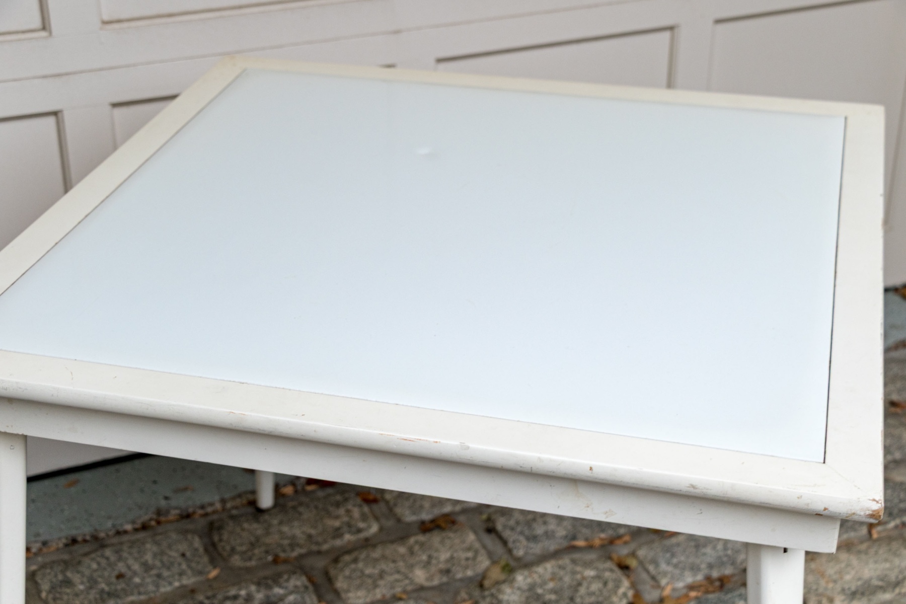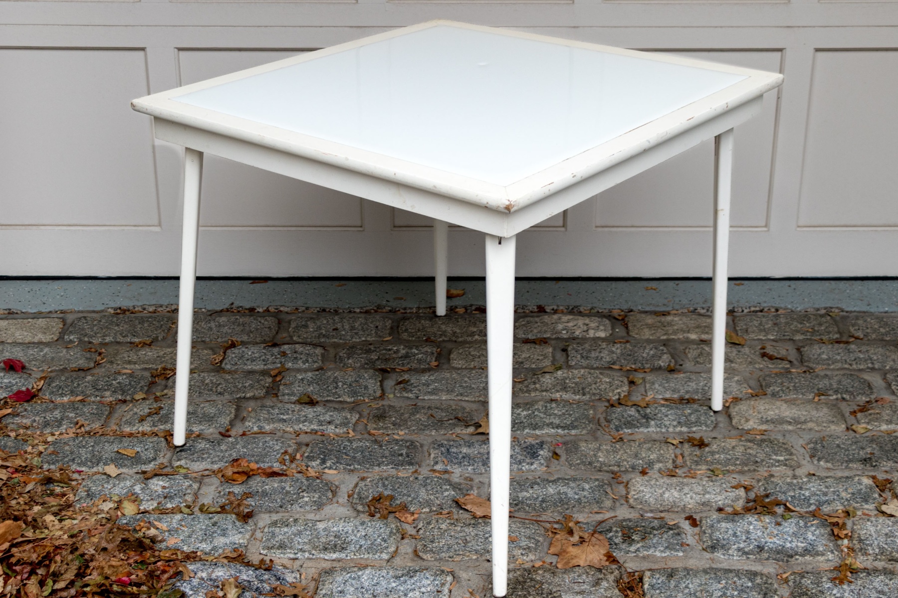 A stylish pair of card tables showcasing square glass tops and white finished frames with straight, tapered legs that fold up for easy storage.