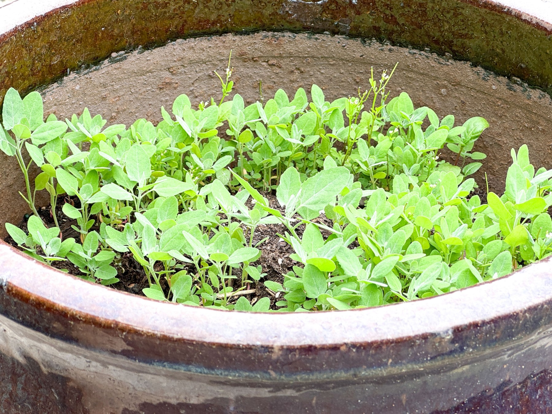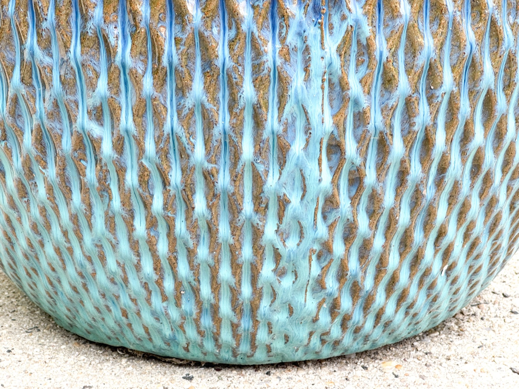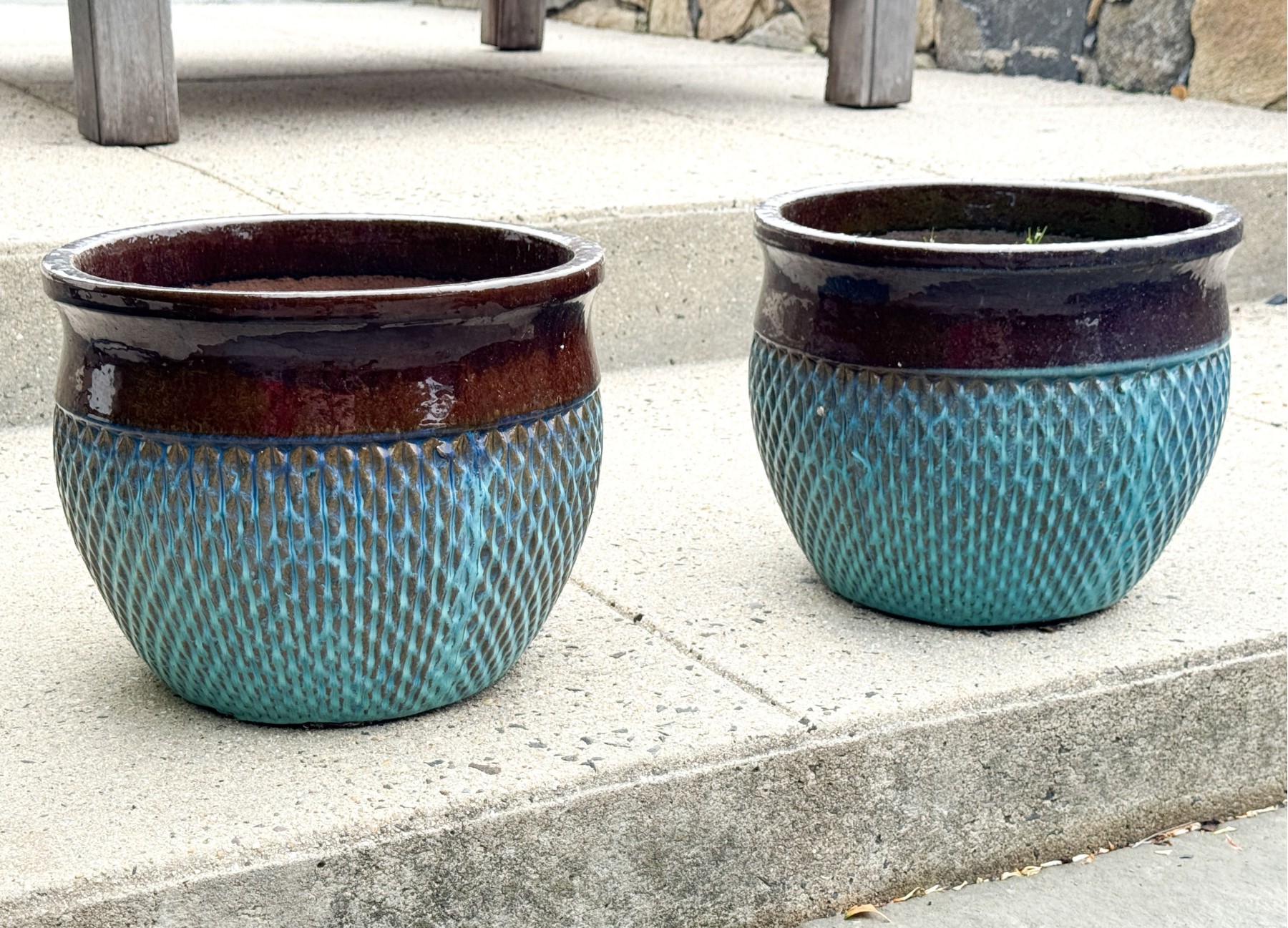 A wonderful pair of ceramic garden planters with lappet rims, subtly tapered necks, and apple form bodies. Rims and necks are glazed warm brown, beautifully contrasting aqua blue textured bodies.
