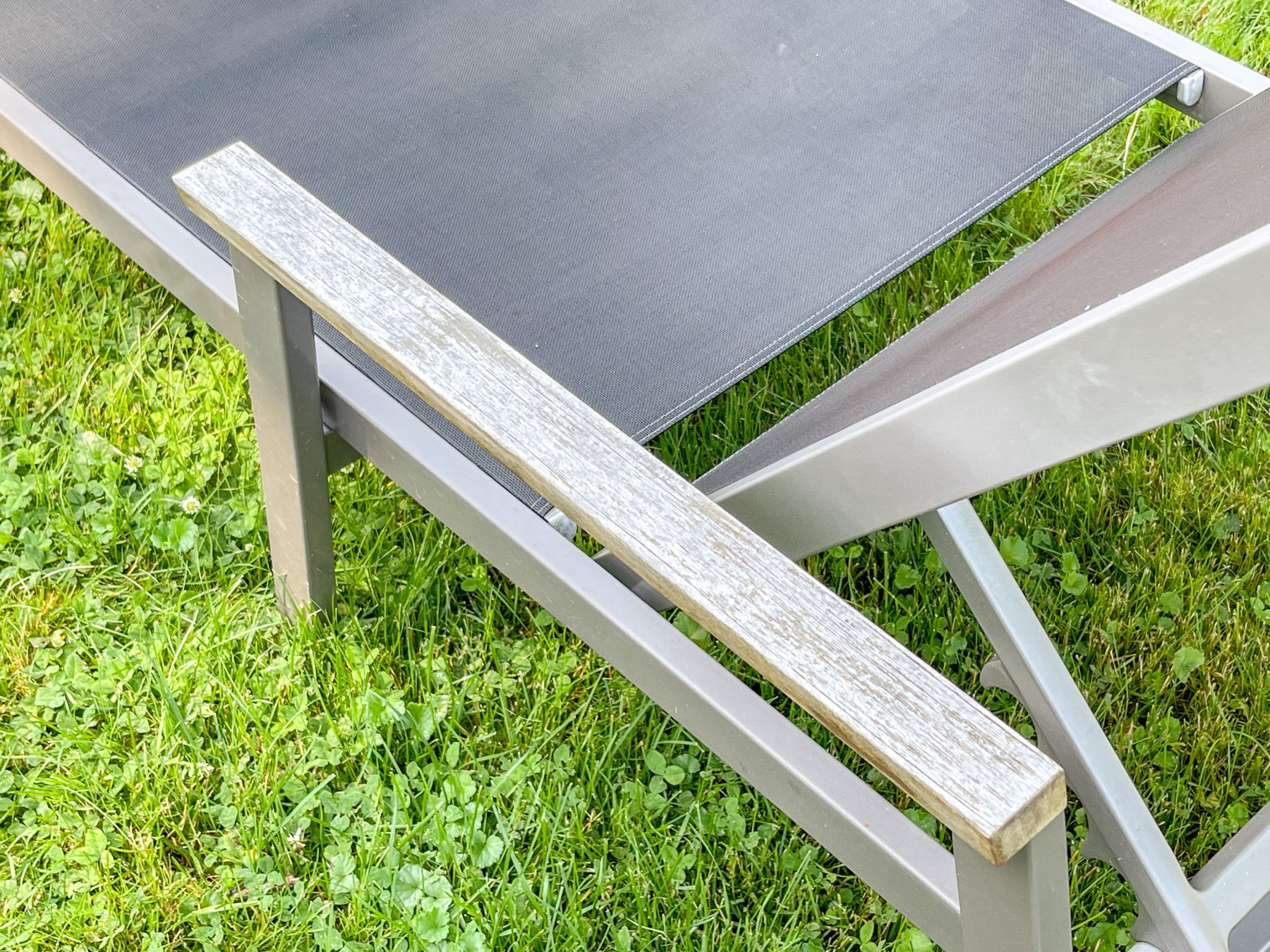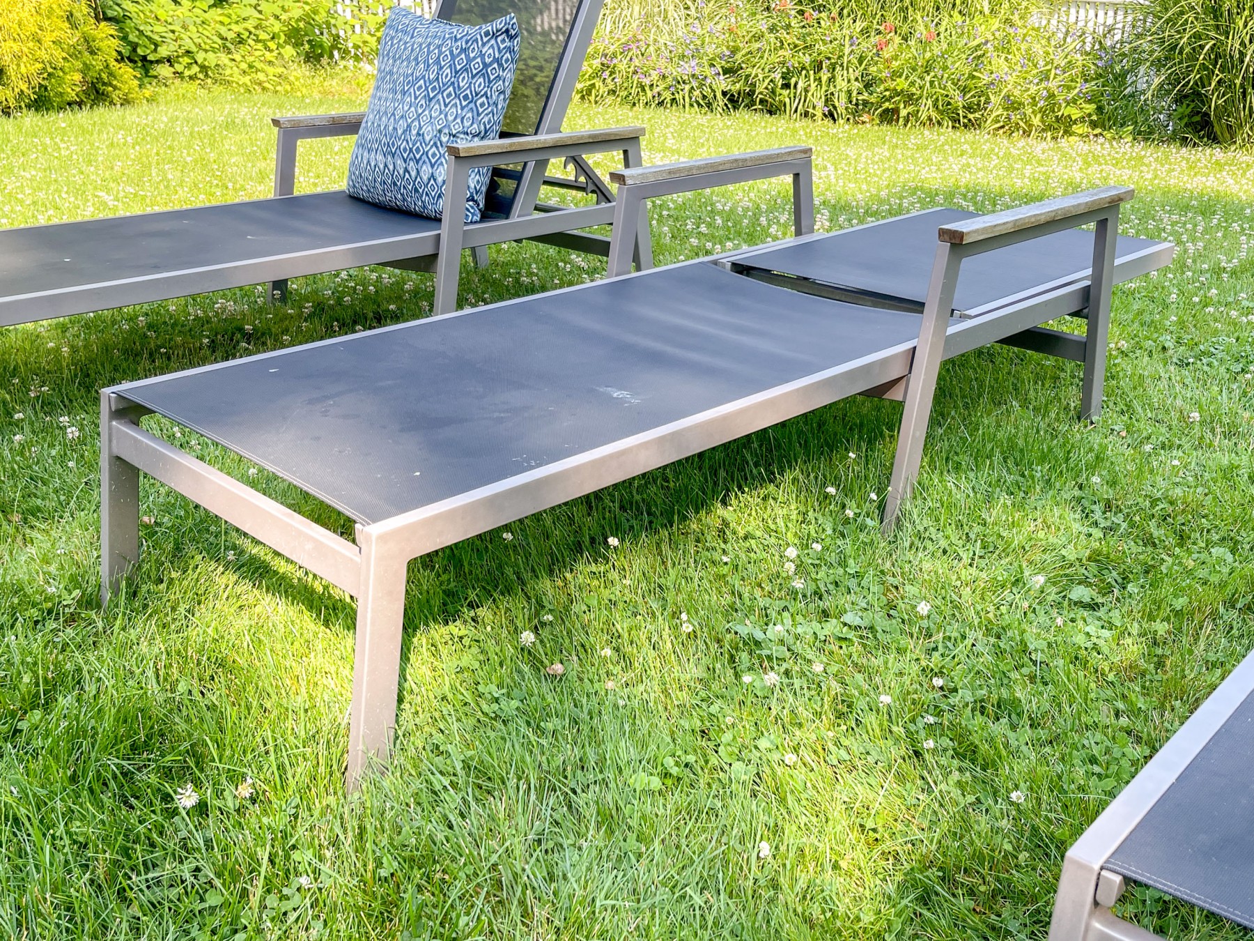 TWO Gloster brand charcoal-gray, fine mesh, sling adjustable back chaise lounges. Each fitted with quality teak arm rests on aluminum frames.
