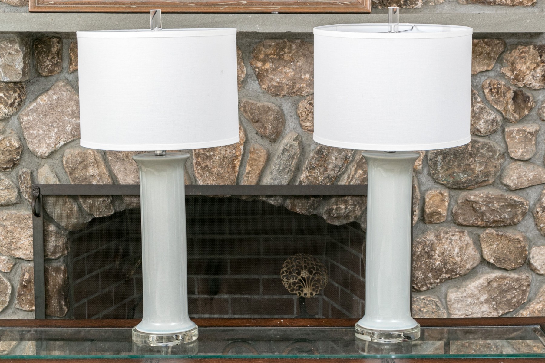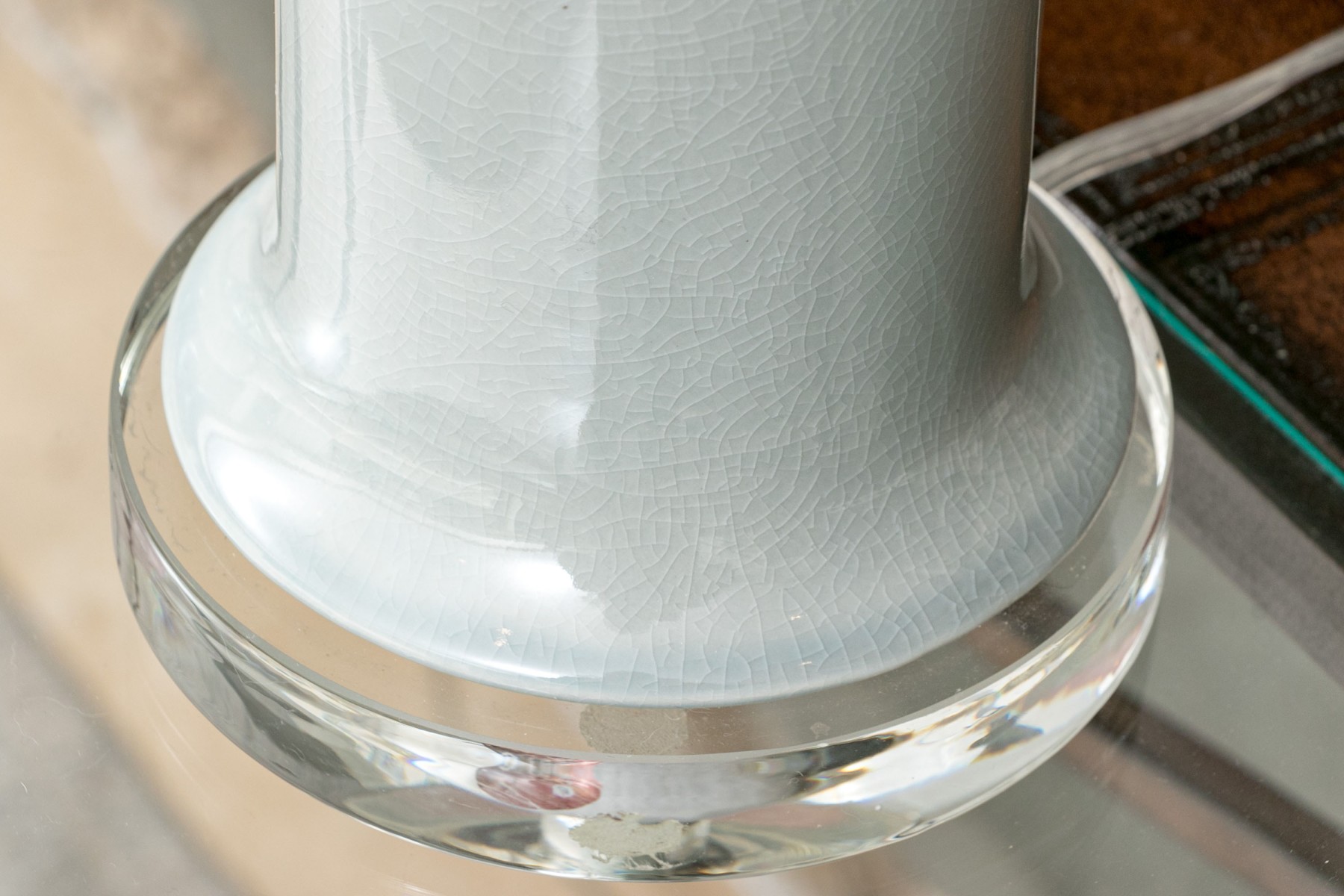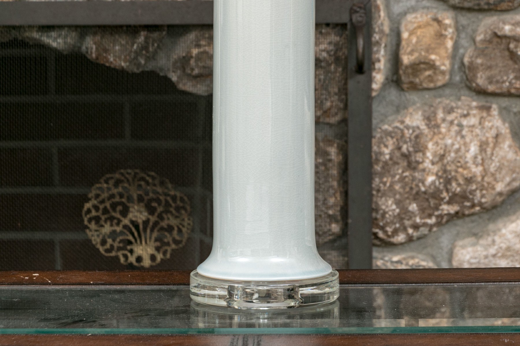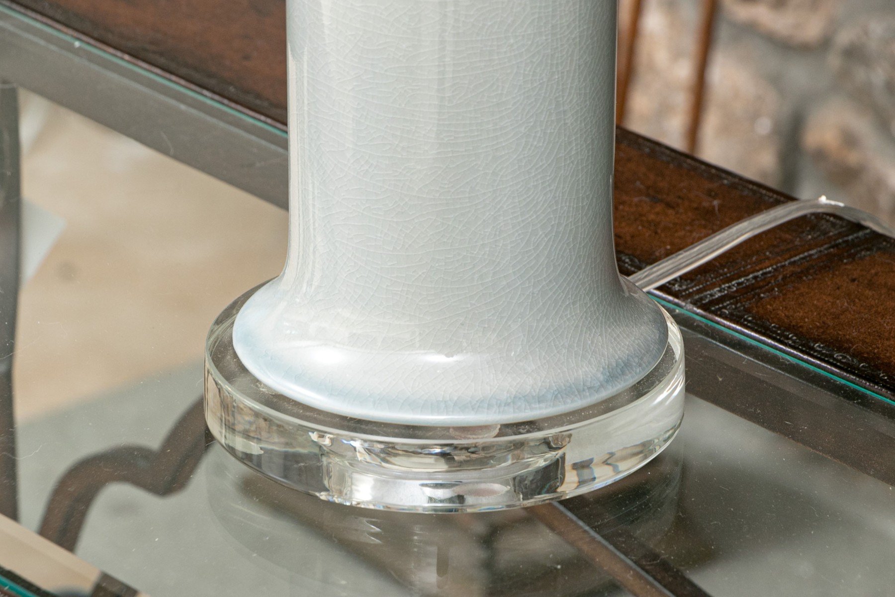 These lamps have a smooth and sleek appearance with the colored glass standard. The whole is crackle glazed with a lucite finial and white shade.