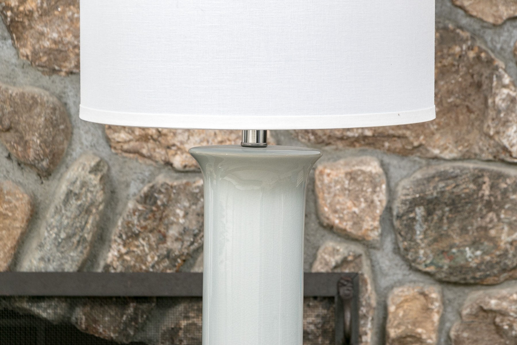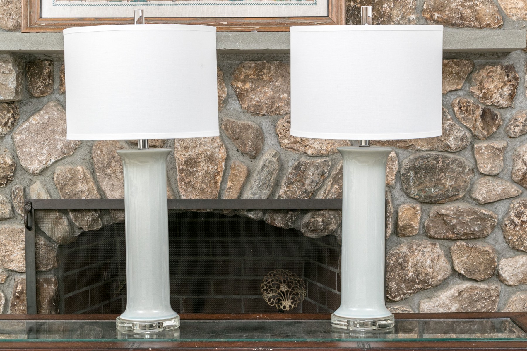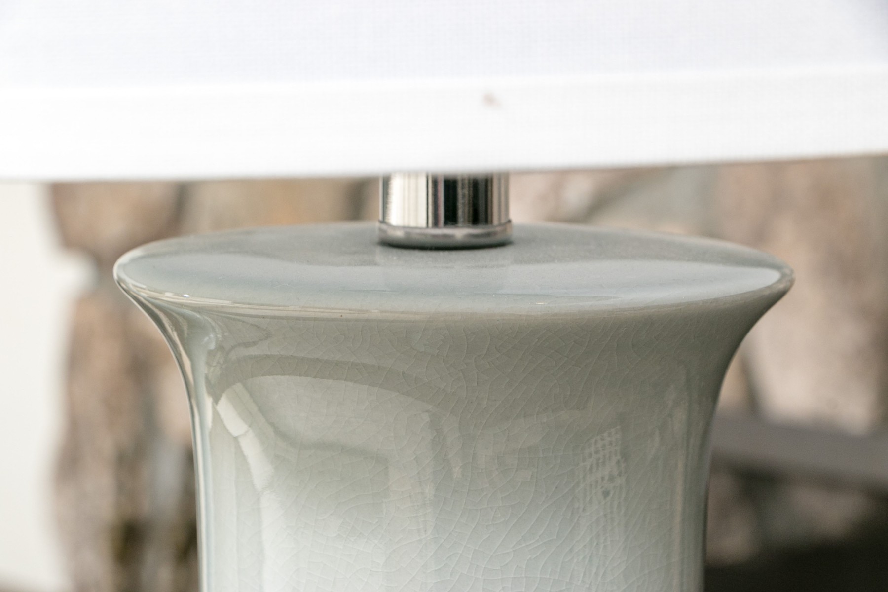 These lamps have a smooth and sleek appearance with the colored glass standard. The whole is crackle glazed with a lucite finial and white shade.