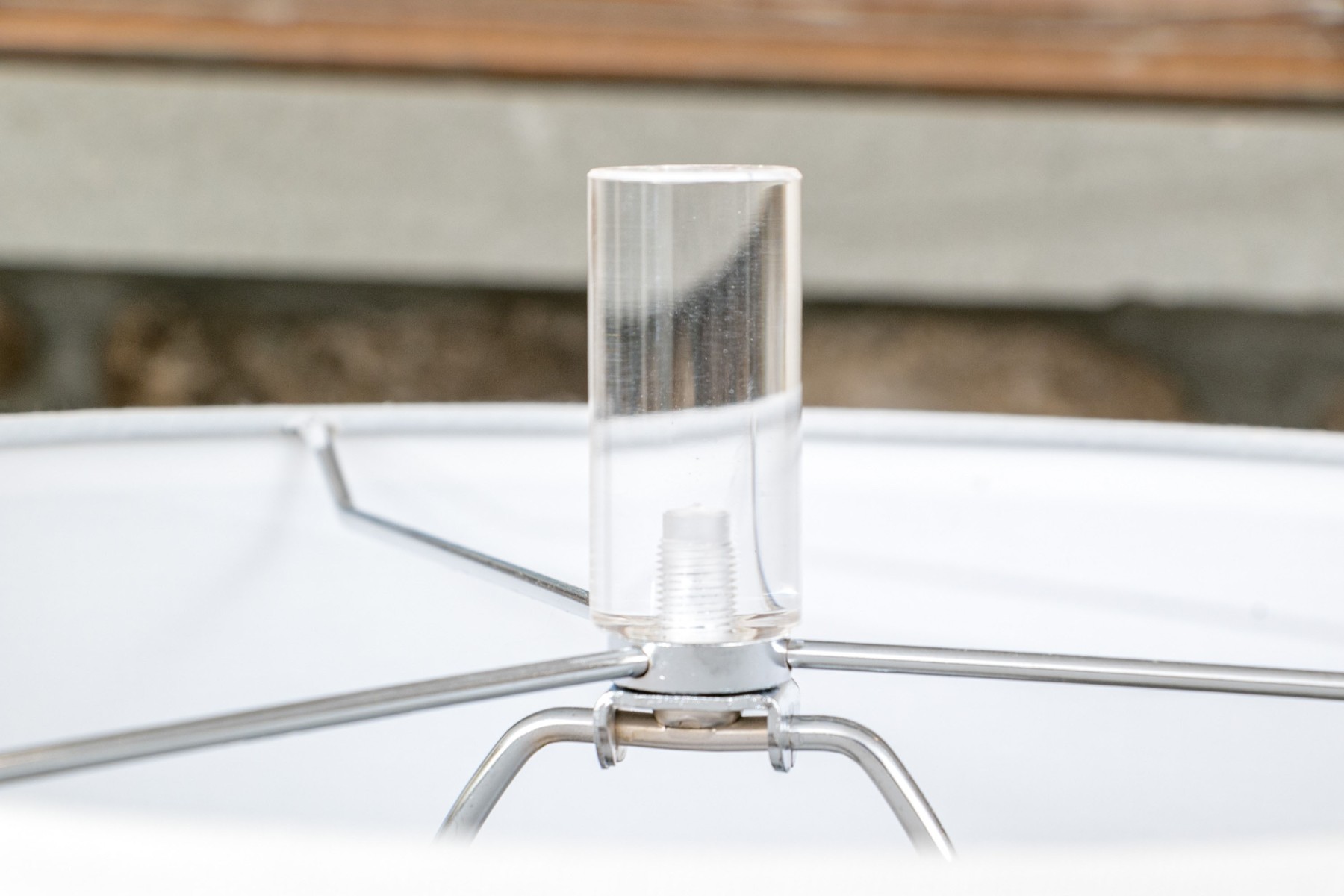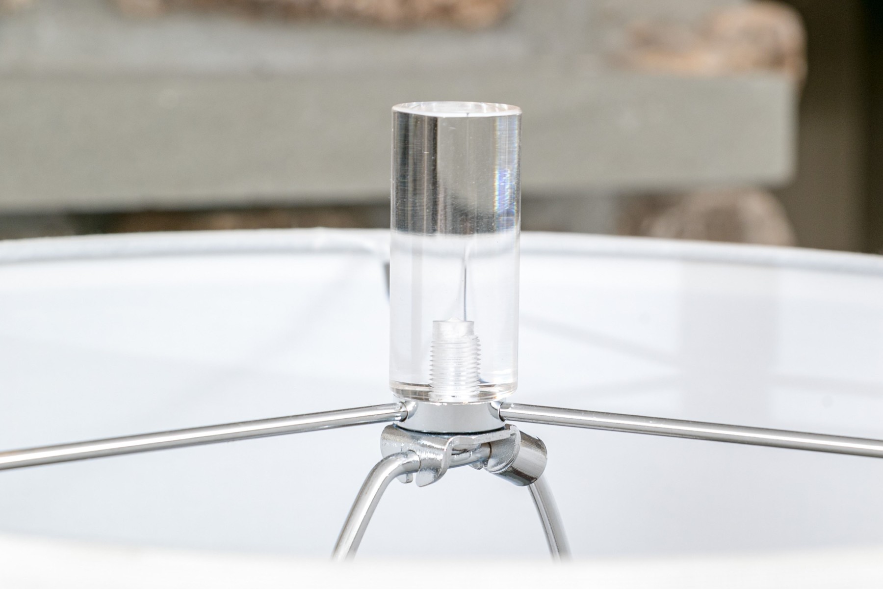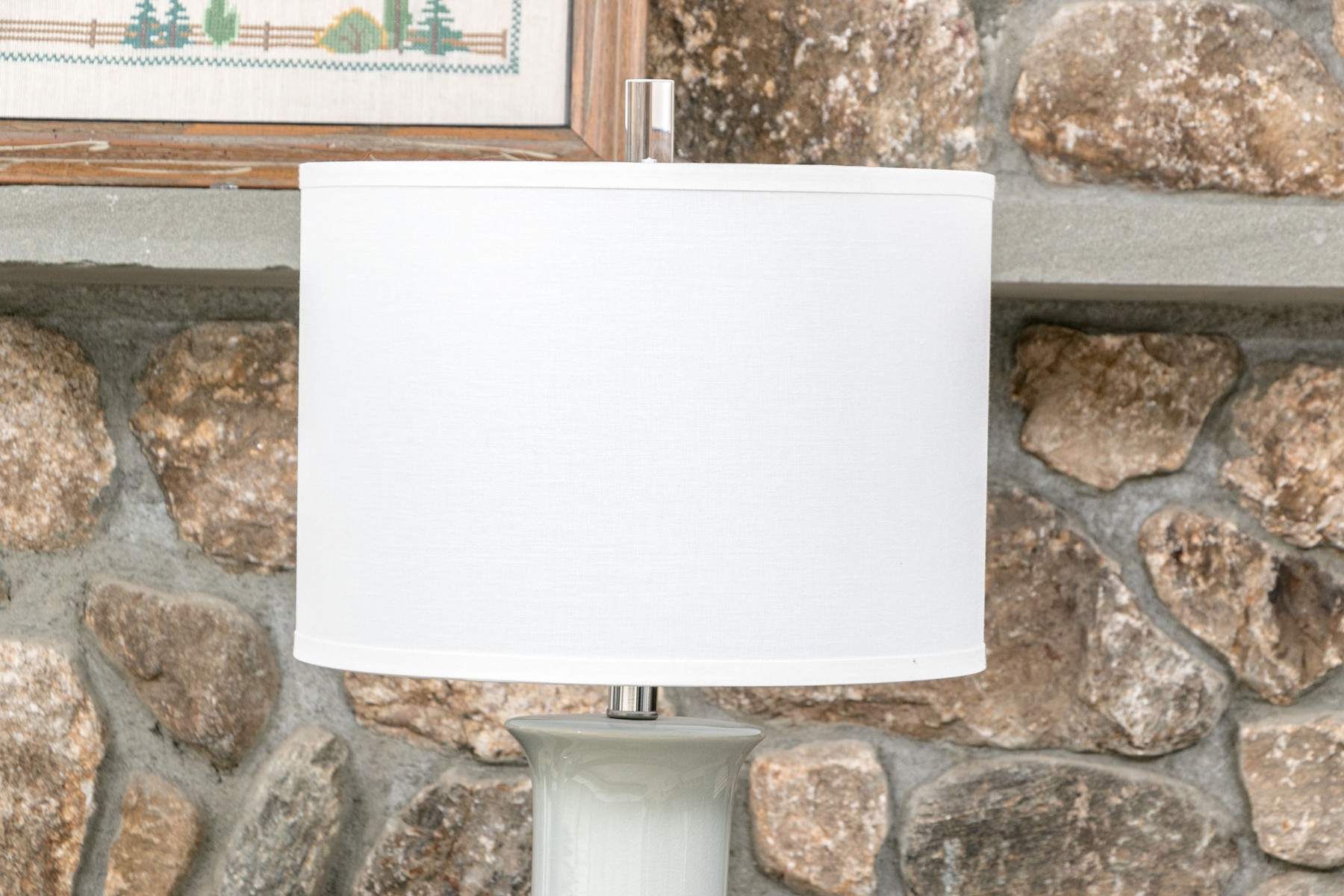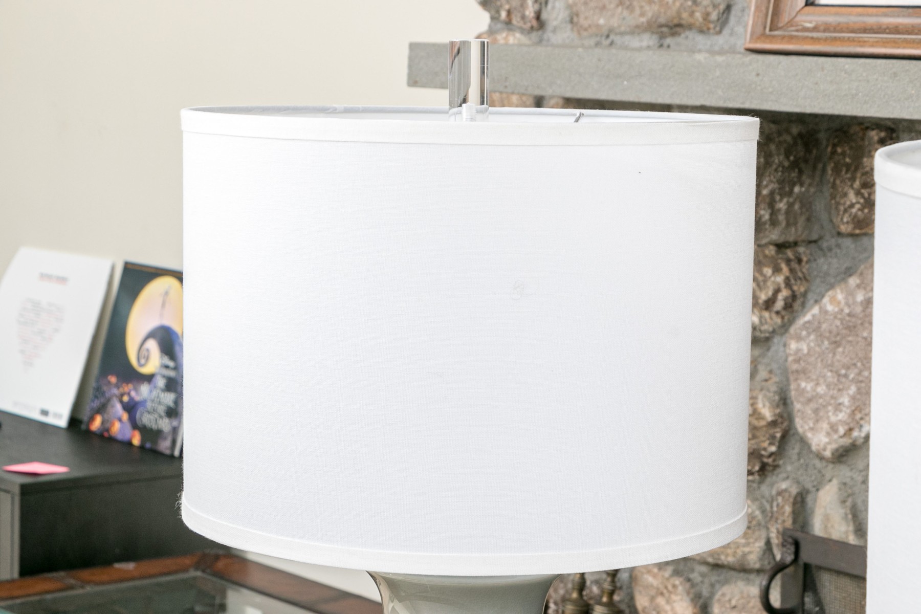 These lamps have a smooth and sleek appearance with the colored glass standard. The whole is crackle glazed with a lucite finial and white shade.