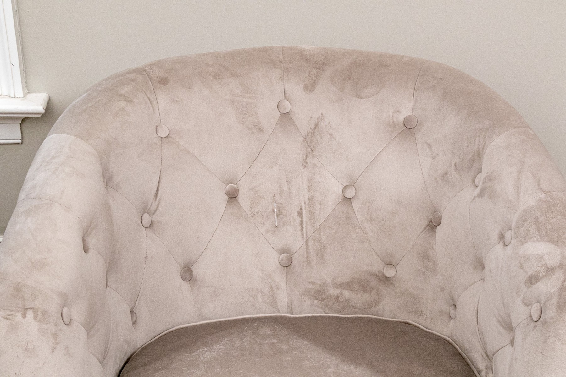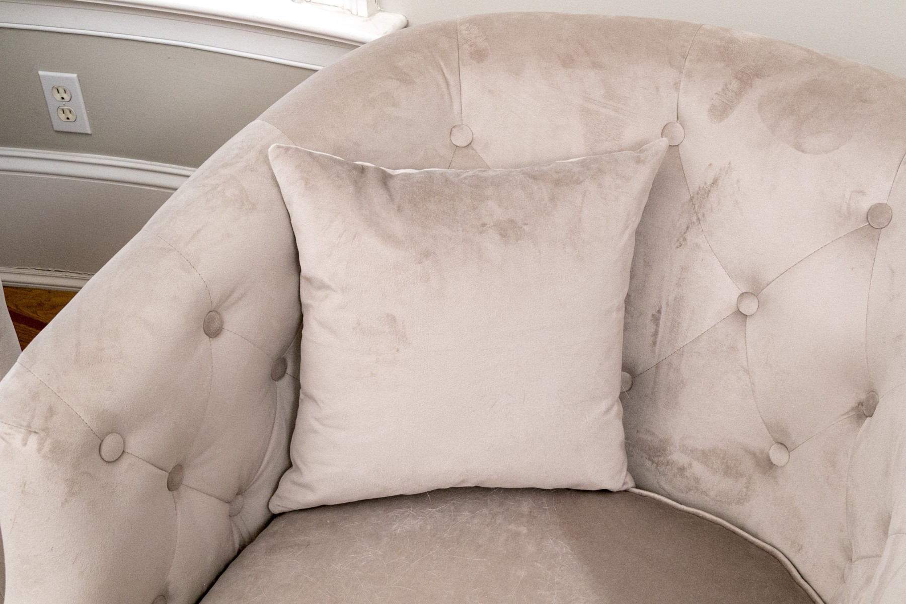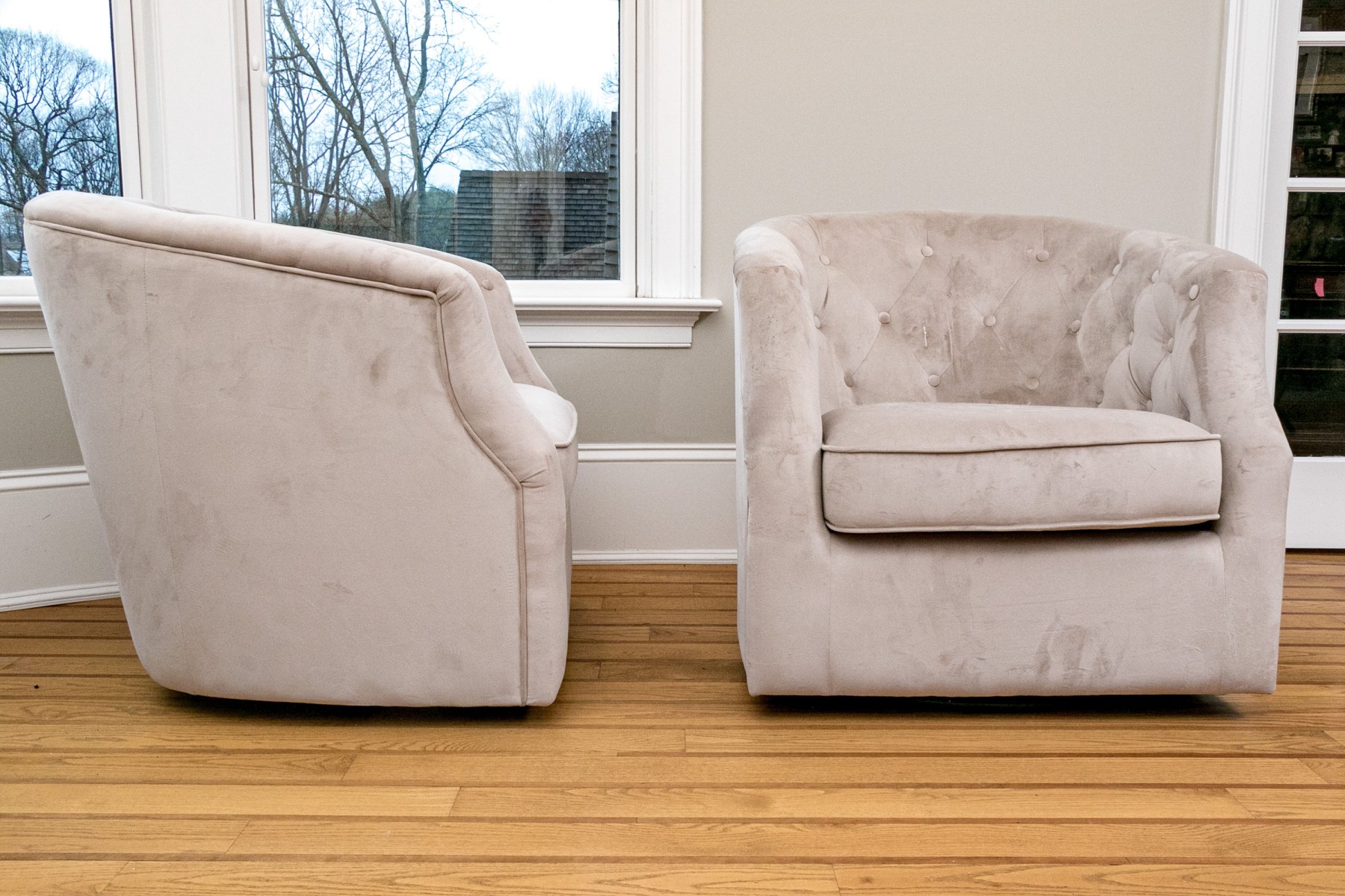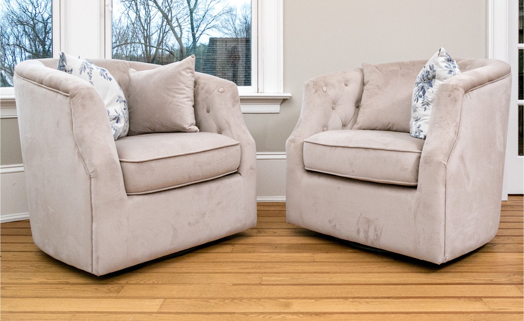 With a button tufted back and arms on a swivel base. Velcro removable seats. With two decorative pillows.