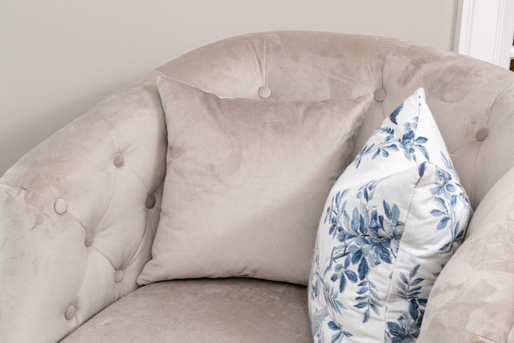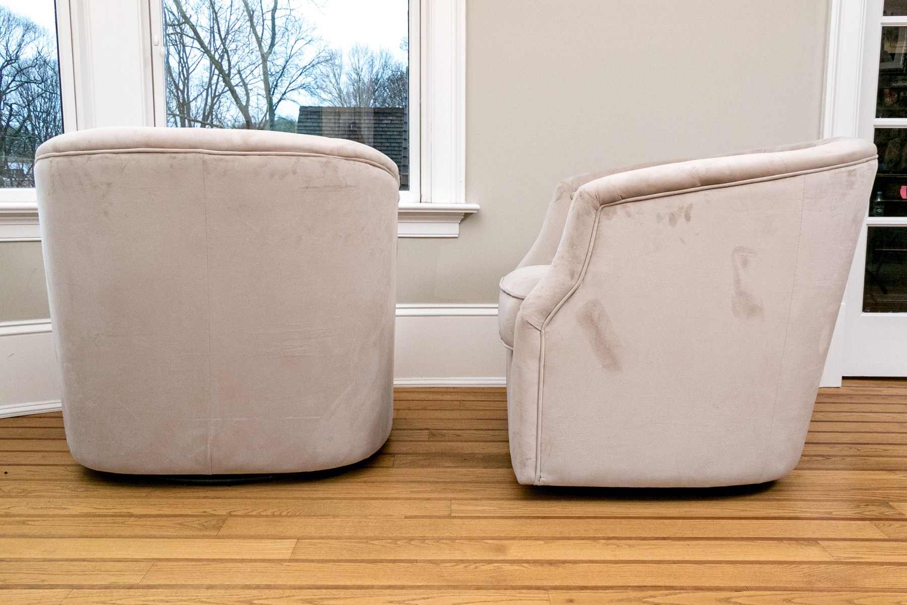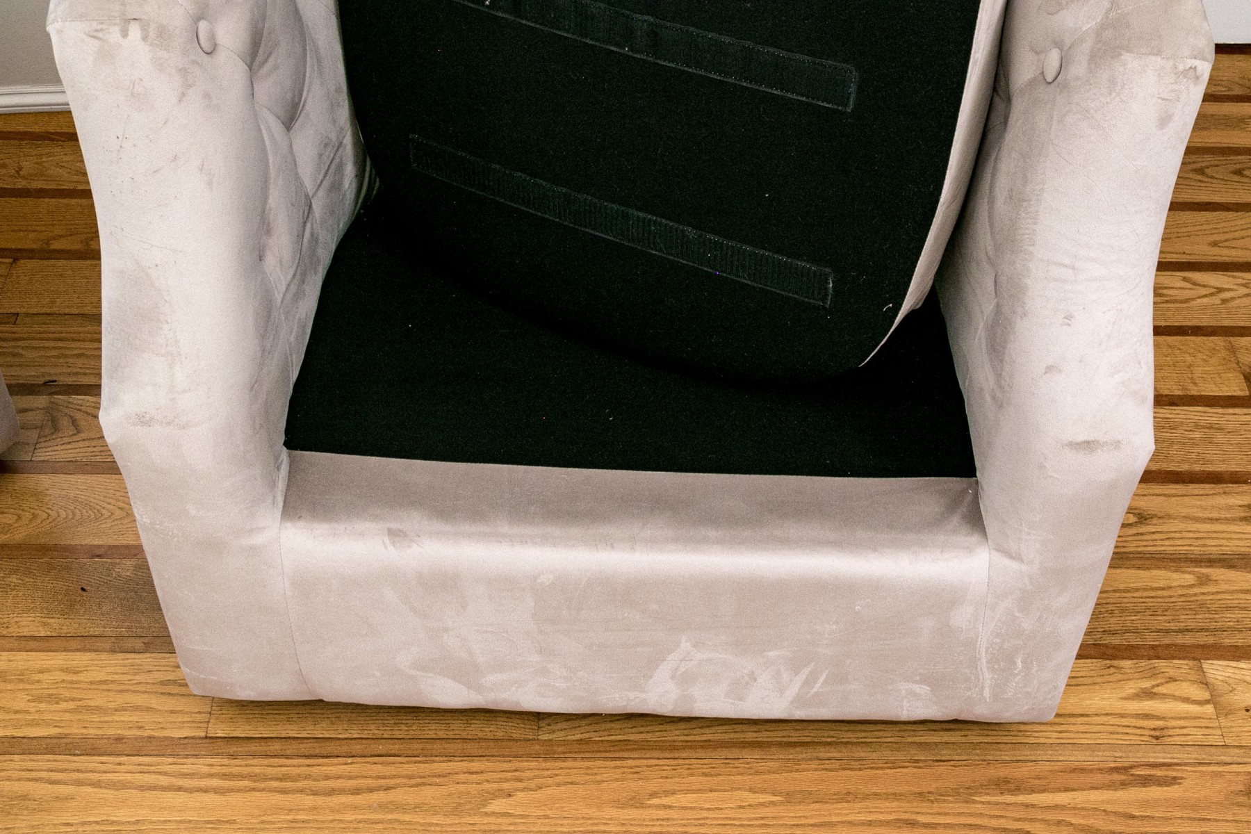 With a button tufted back and arms on a swivel base. Velcro removable seats. With two decorative pillows.