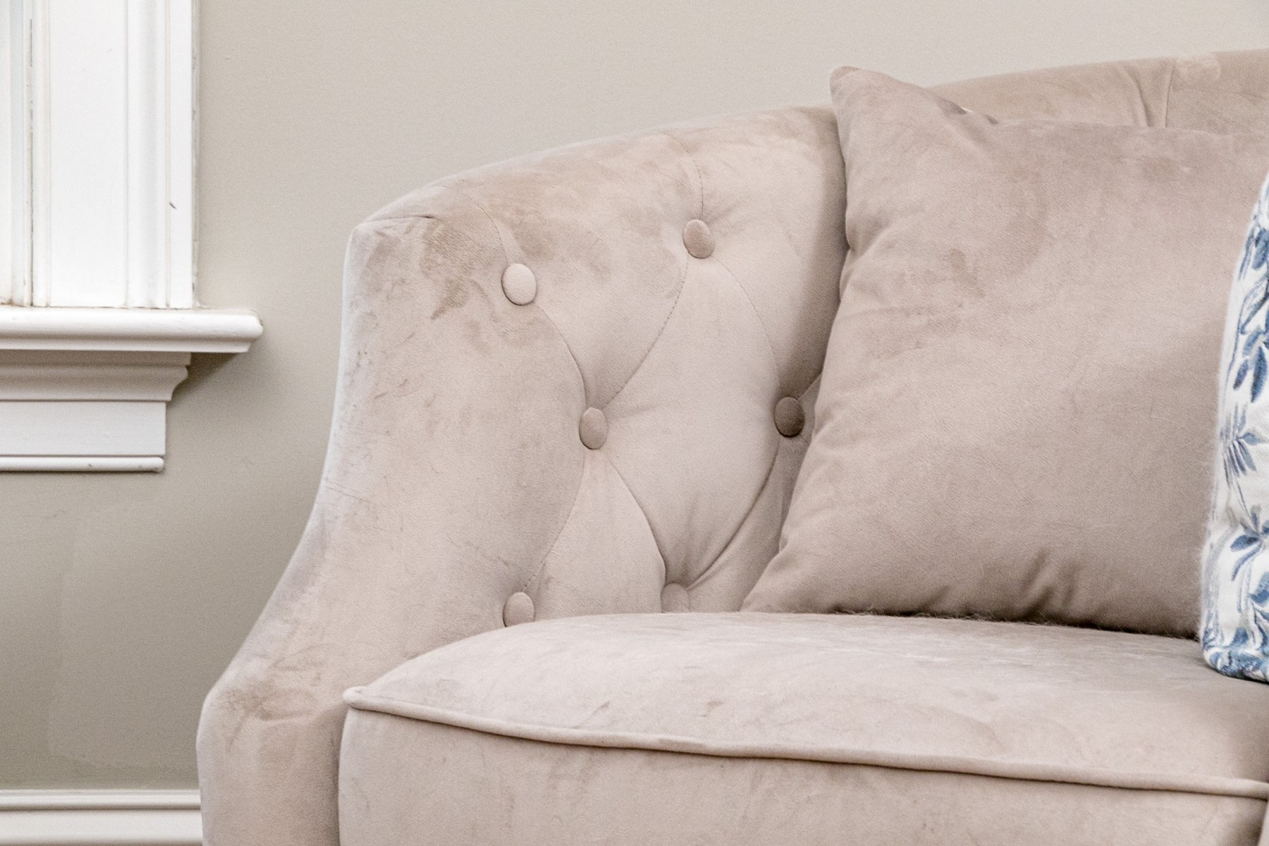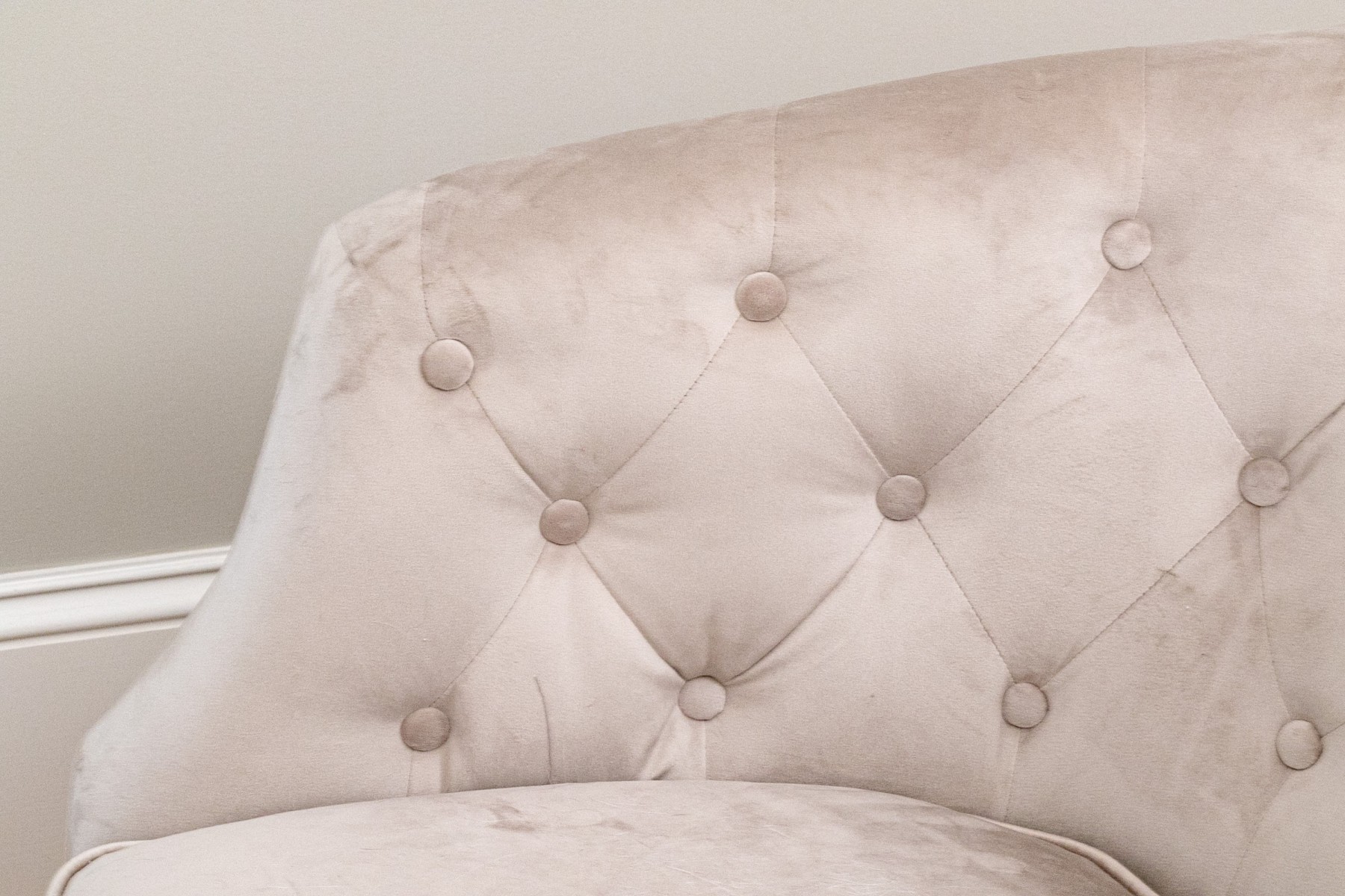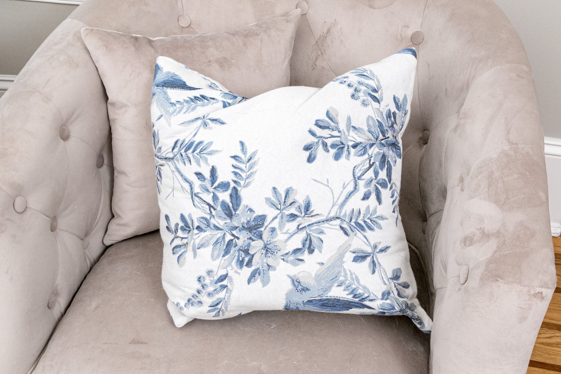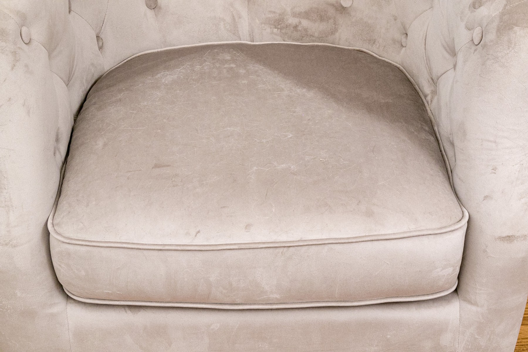 With a button tufted back and arms on a swivel base. Velcro removable seats. With two decorative pillows.