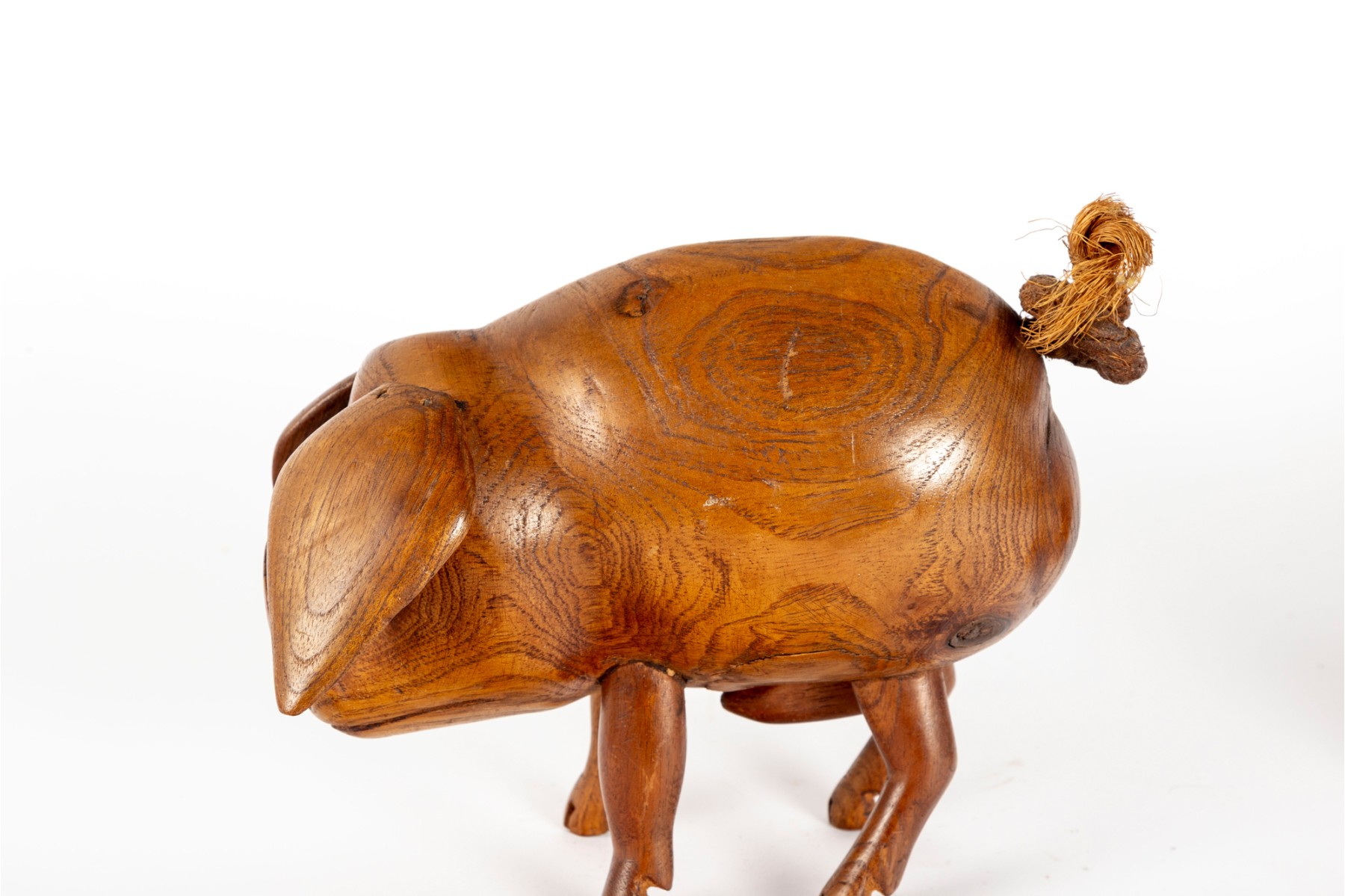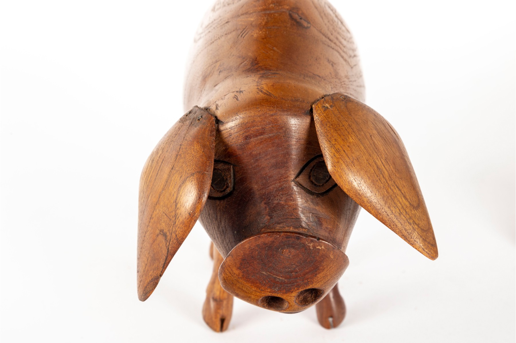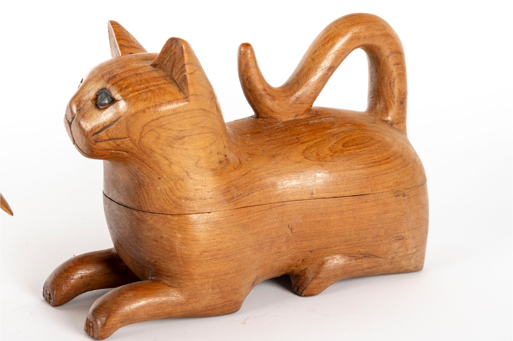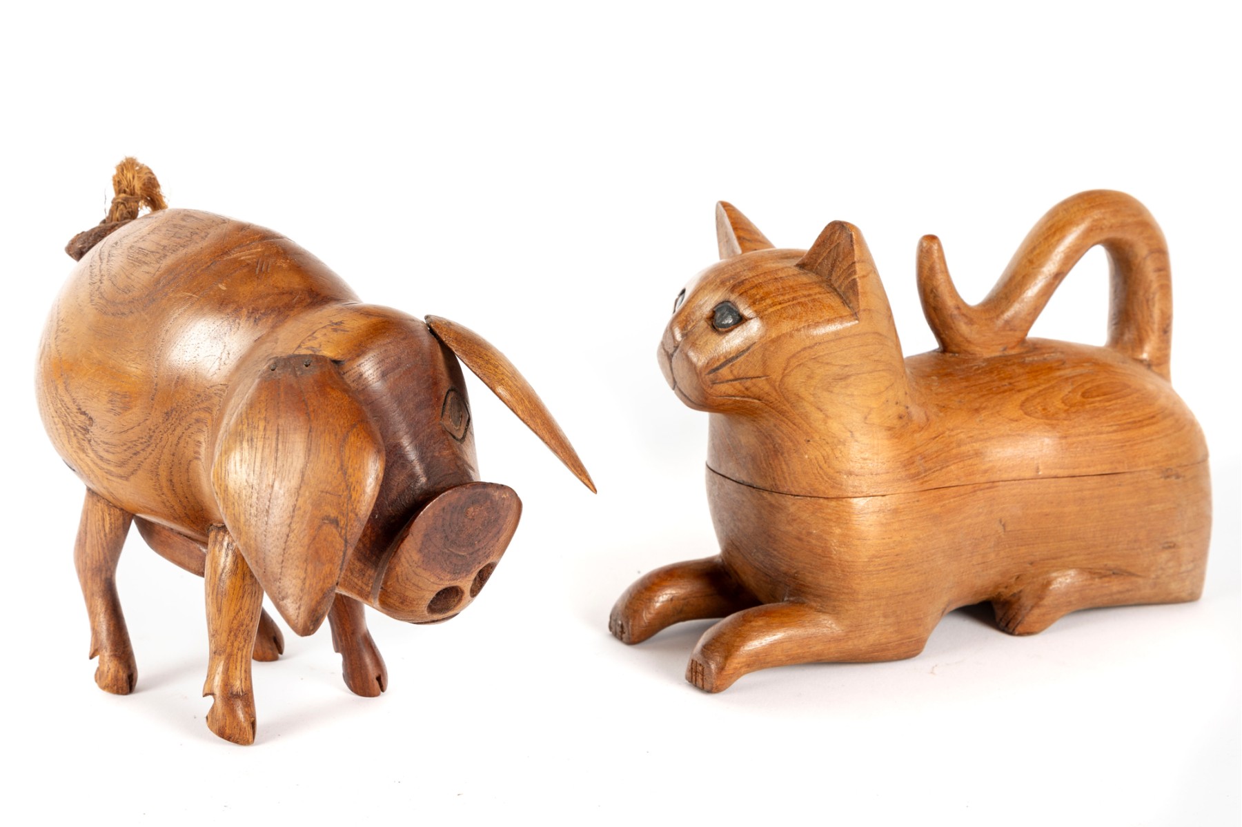 Two wooden animal sculptures, unmarked — showcasing a pig with articulating ears and a friction-fit cat capsule.