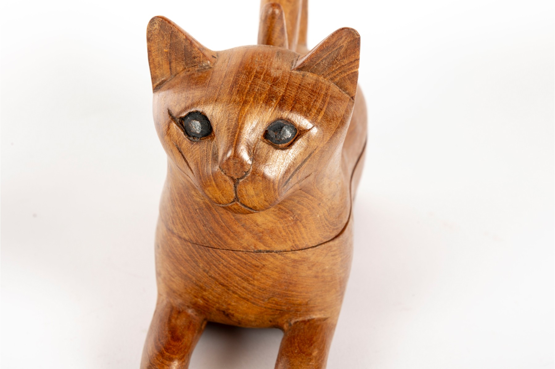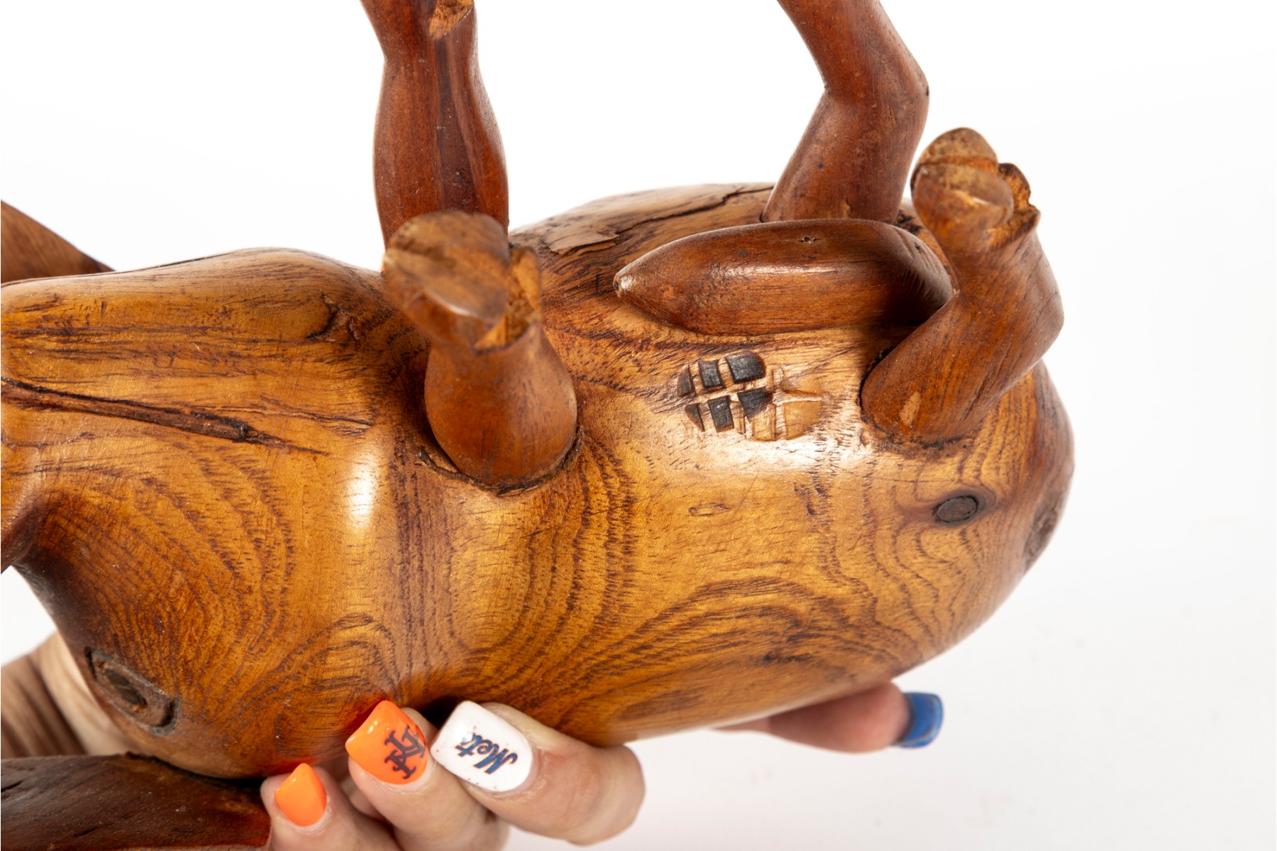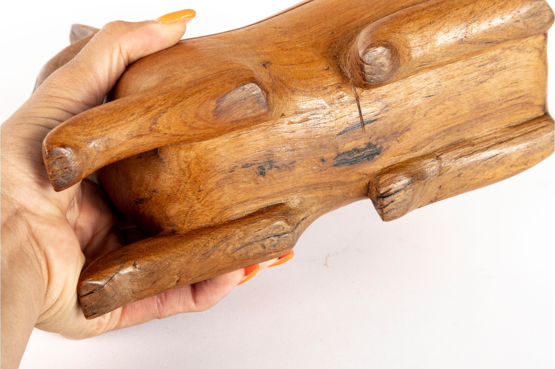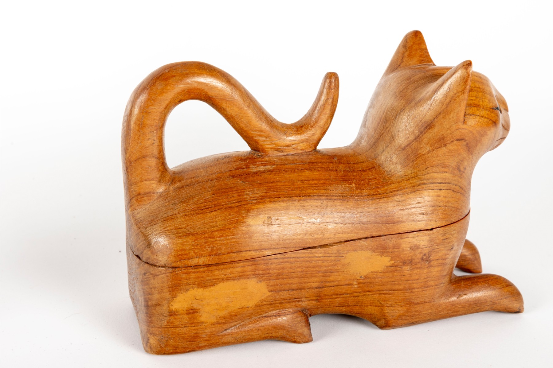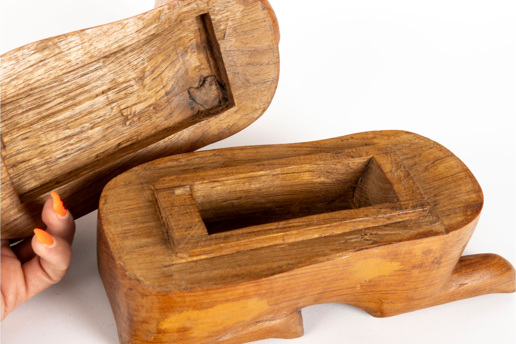Two wooden animal sculptures, unmarked — showcasing a pig with articulating ears and a friction-fit cat capsule.