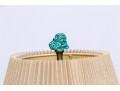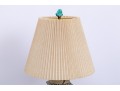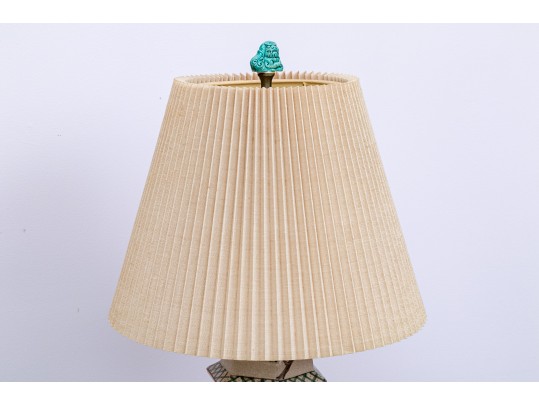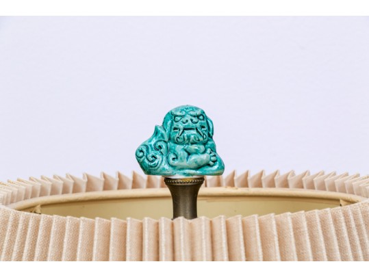 In beautiful naturalistic hues on a black beveled base having heavily pleated shades. The finial in the form of a Foo Dog in a lovely shade of blue.
