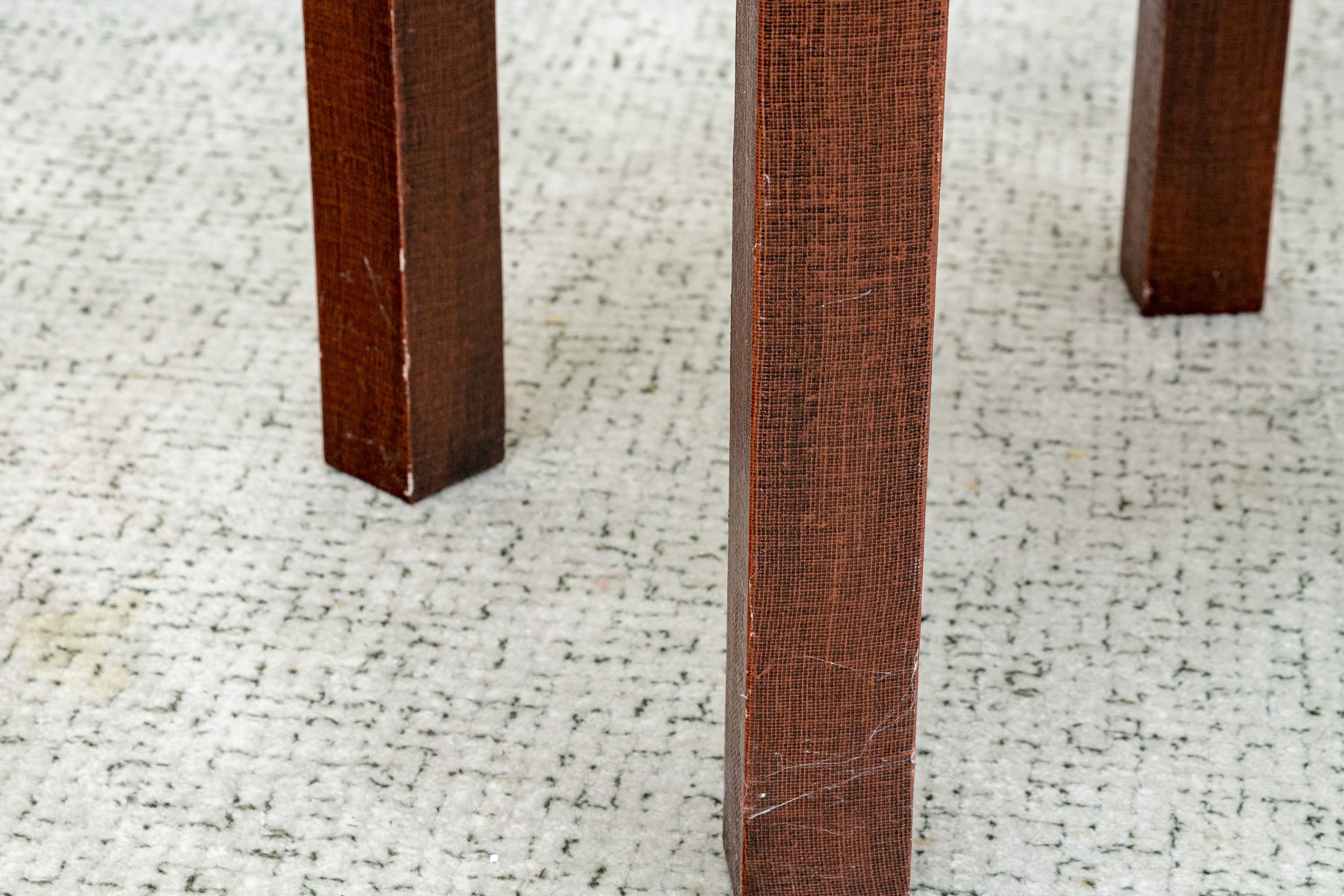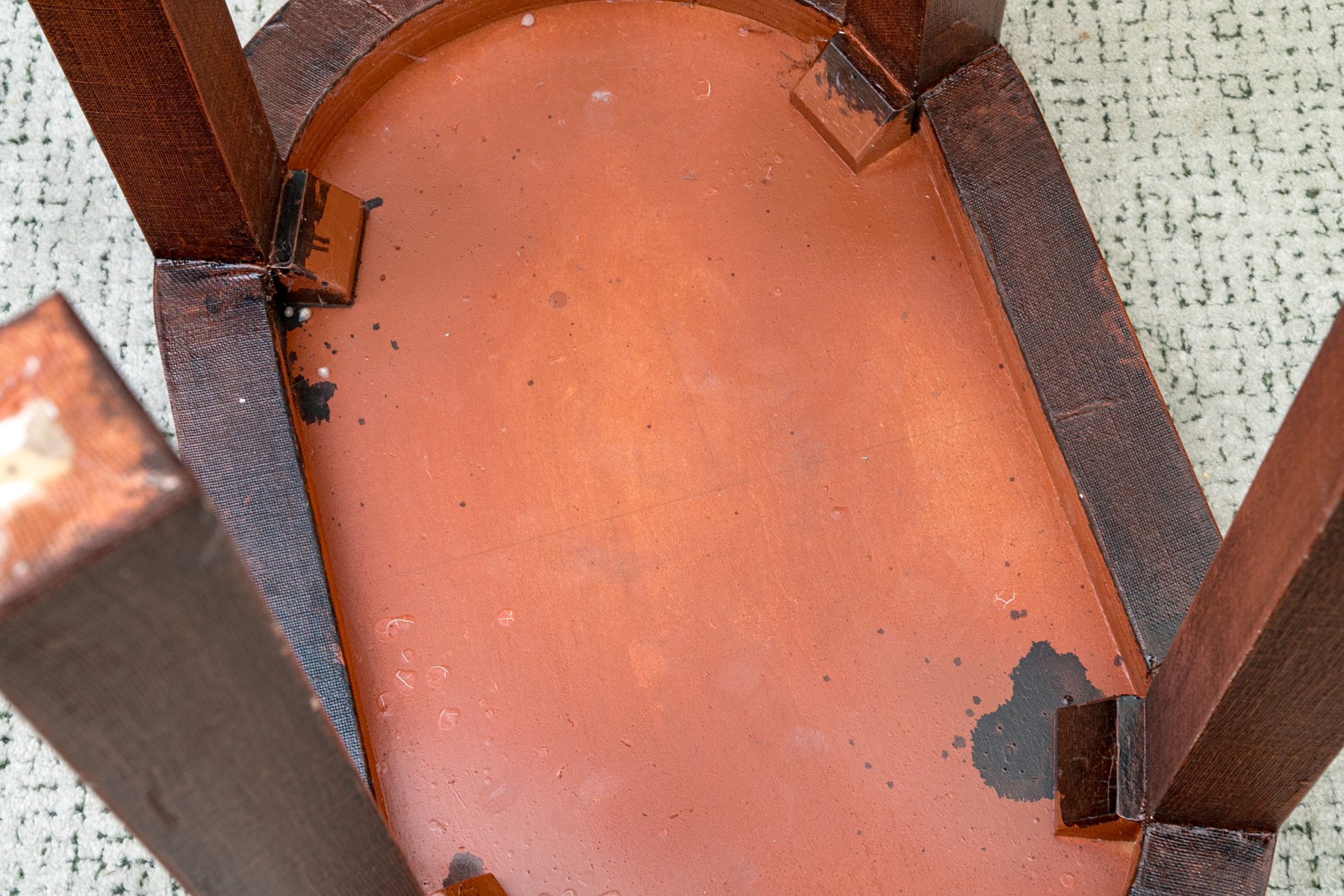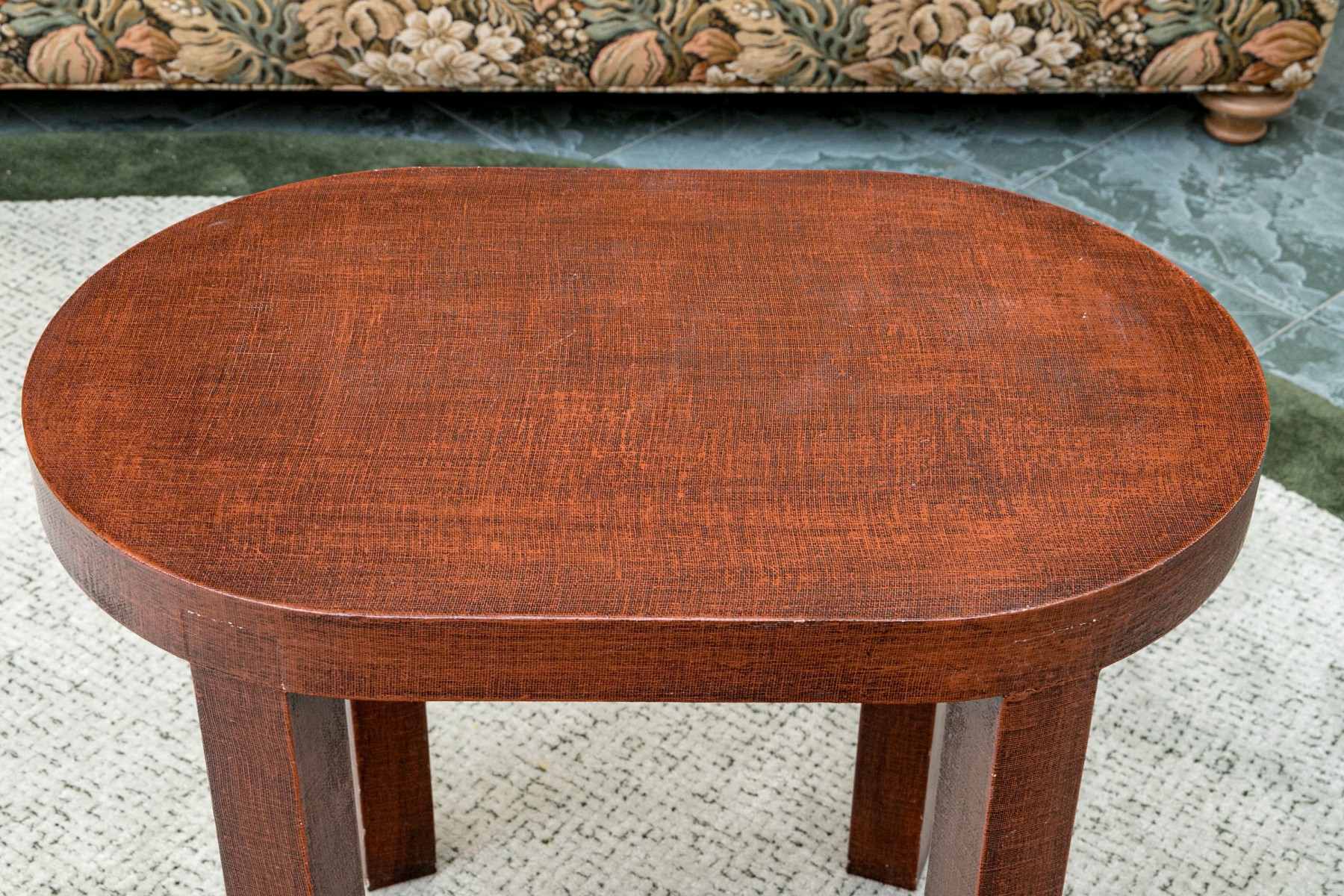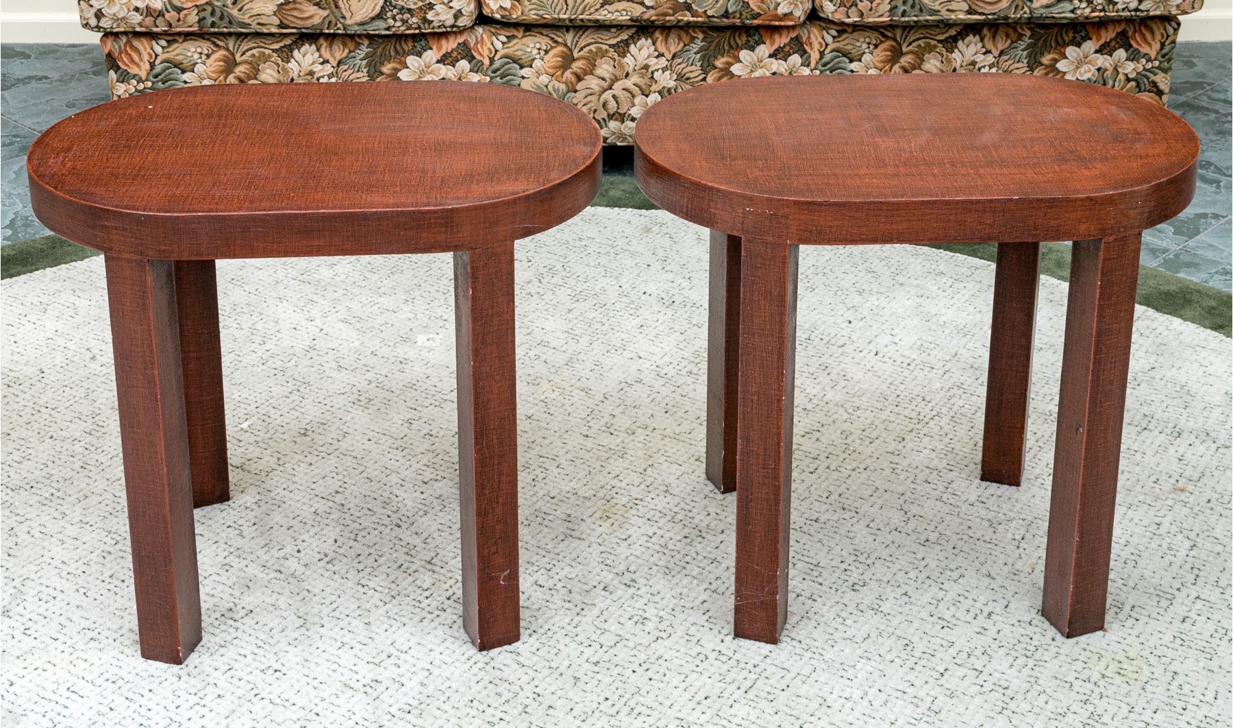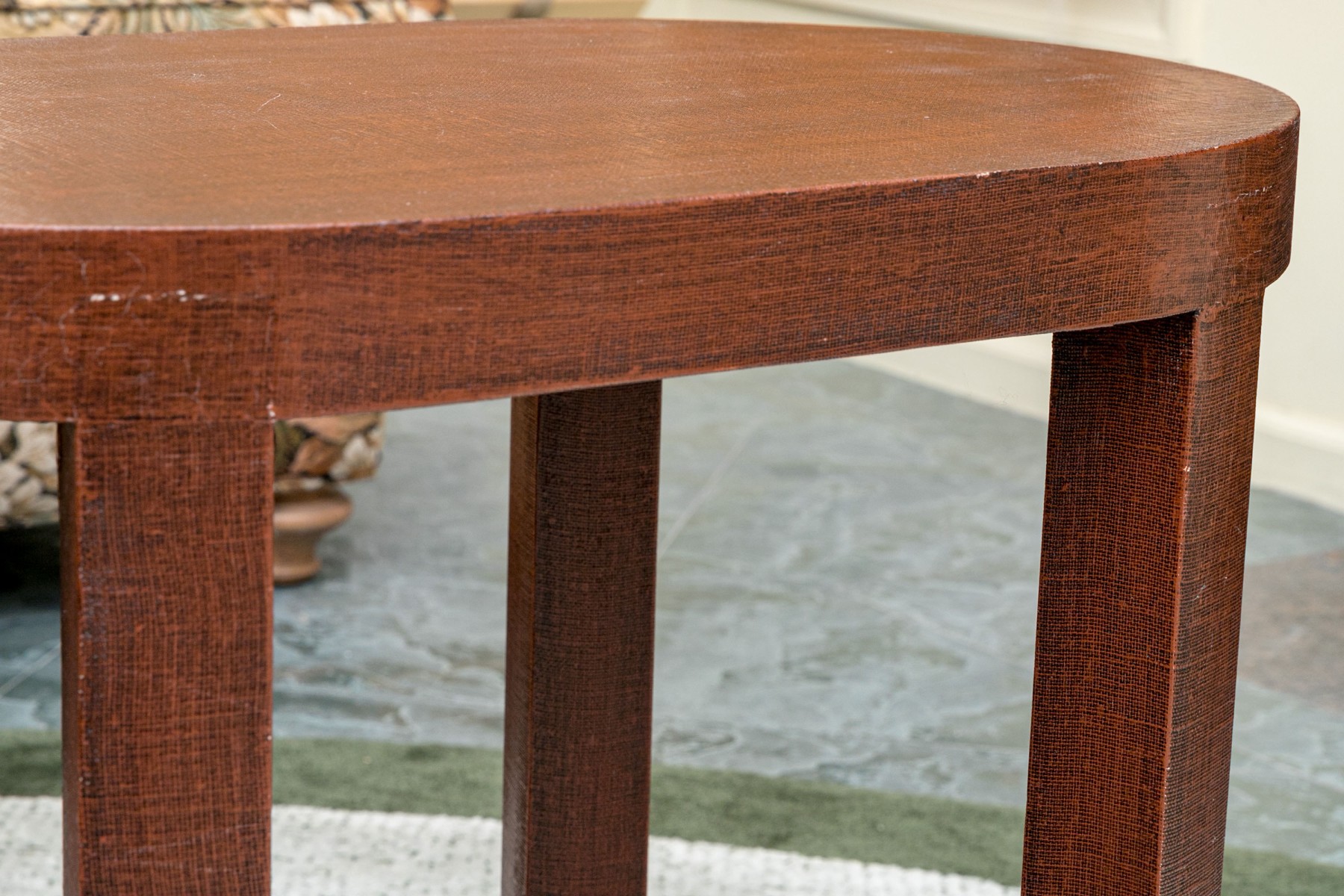 A handsome pair of side tables sporting oval tops over simple rectangular legs. Wrapped in a cloth texture veneer and lacquered in rich, warm brown for a unique and eye-catching fois boix appearance.