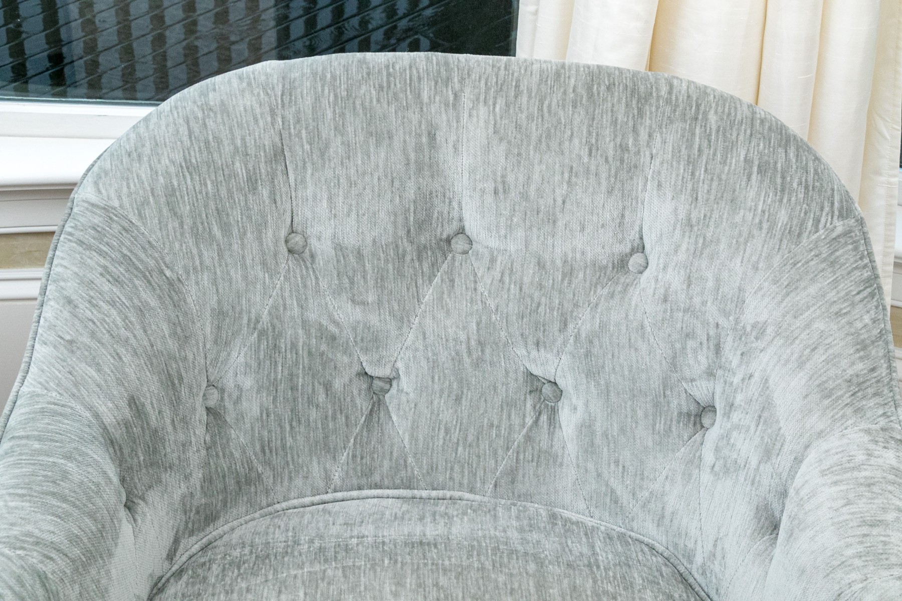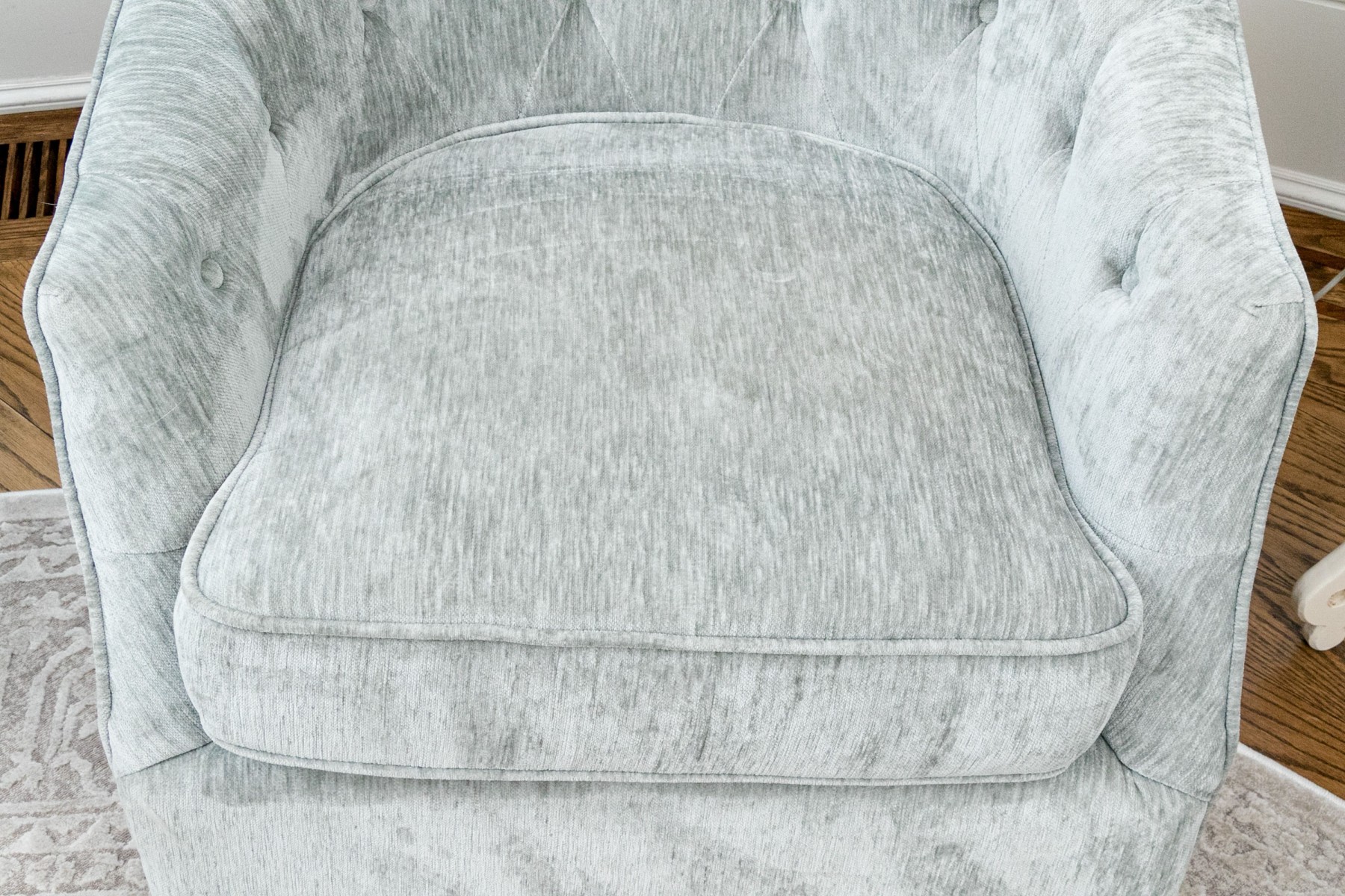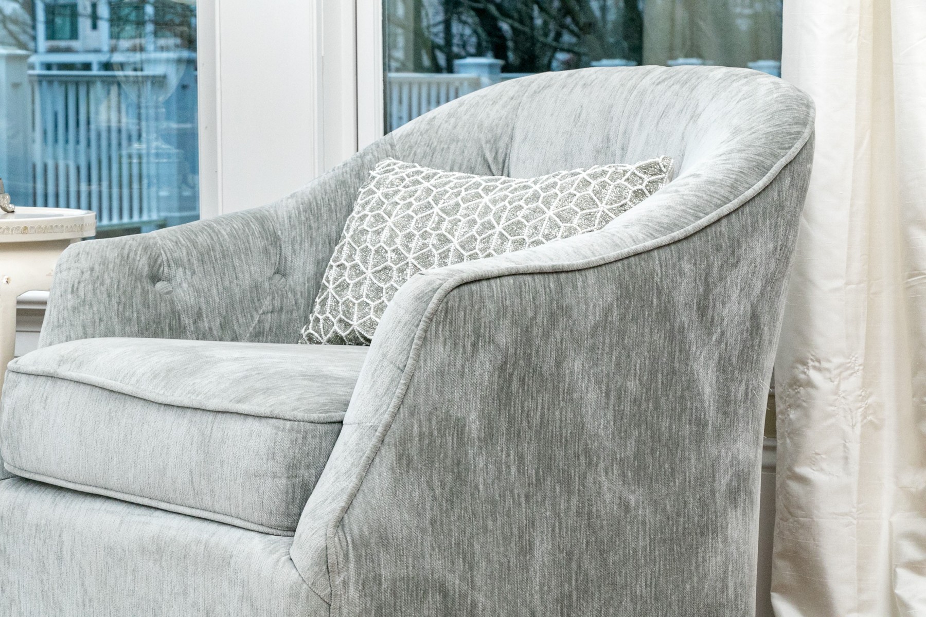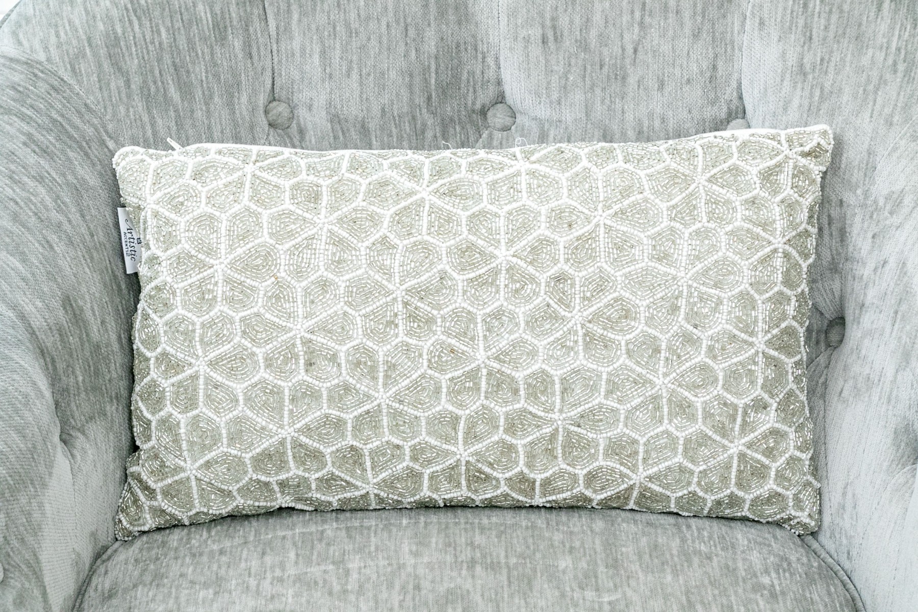 These handsome and practical chairs are velvet upholstered and have a button tufted back and arms with a removable seat cushion and a beaded accent pillow with the label “Artistic Accents.”