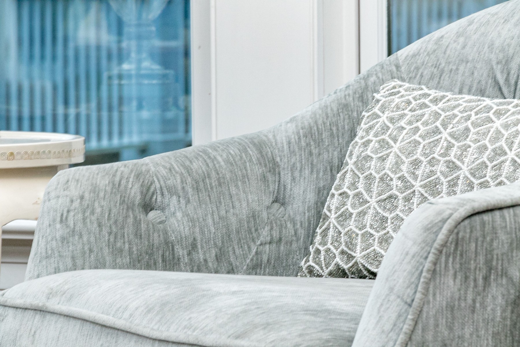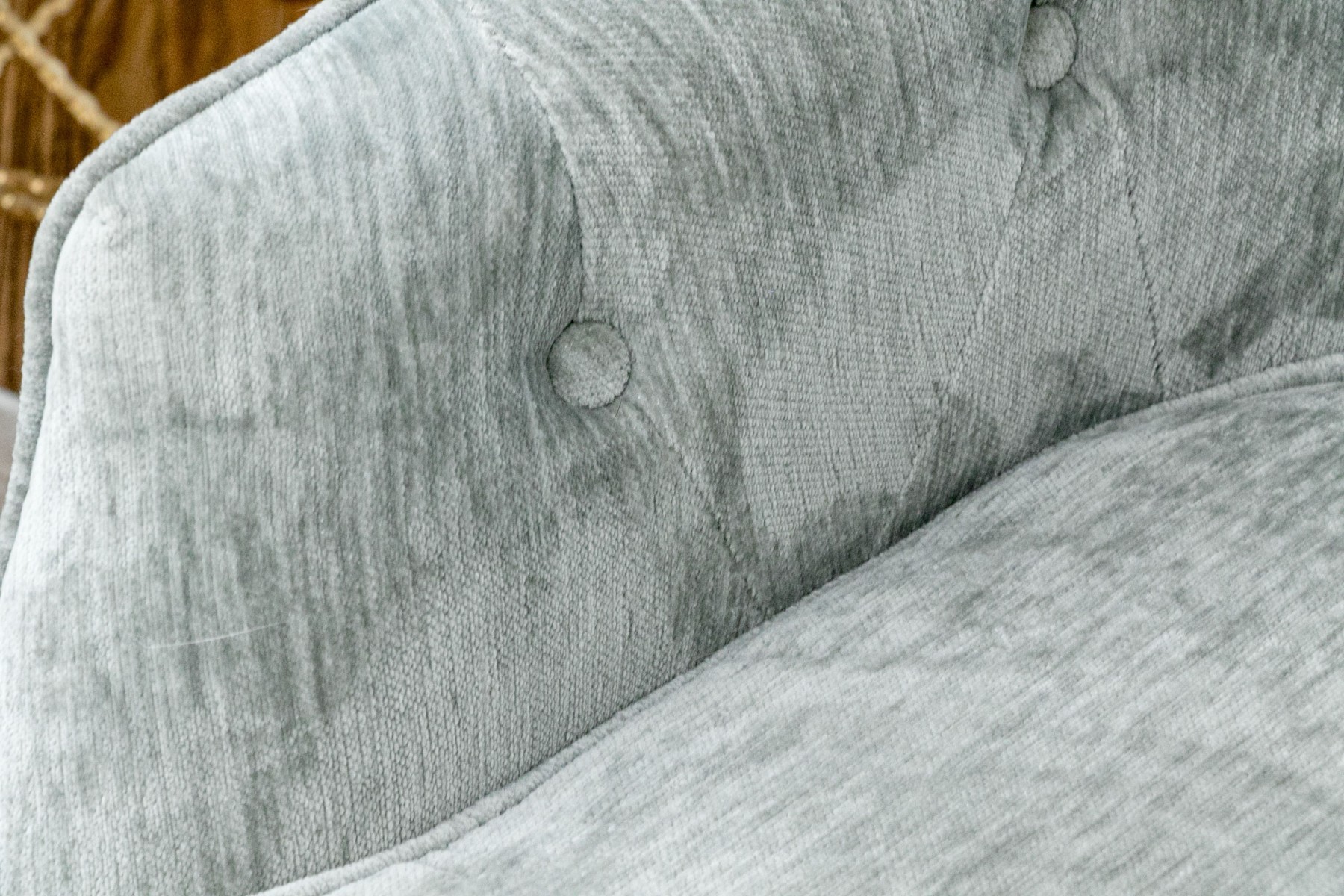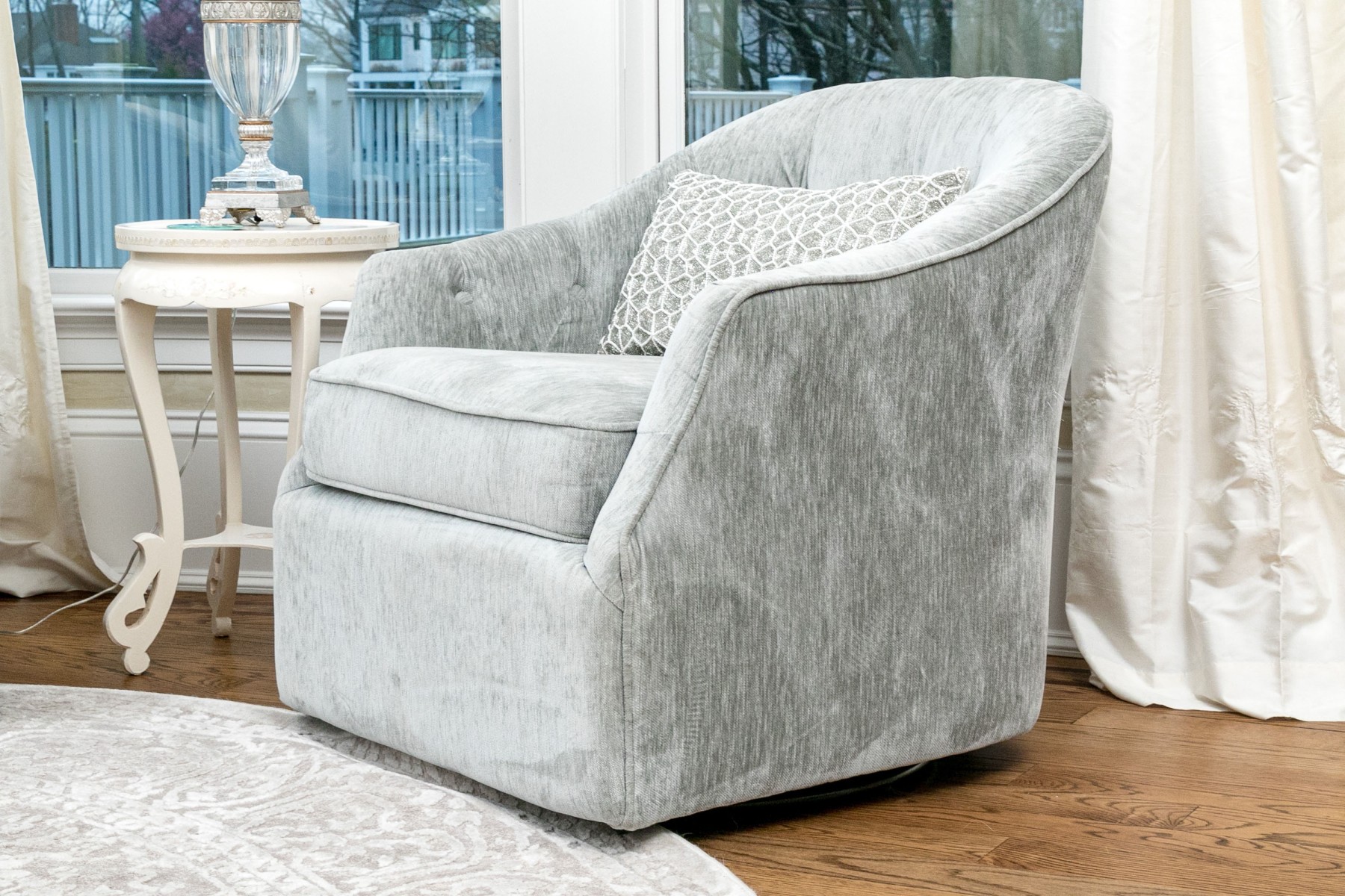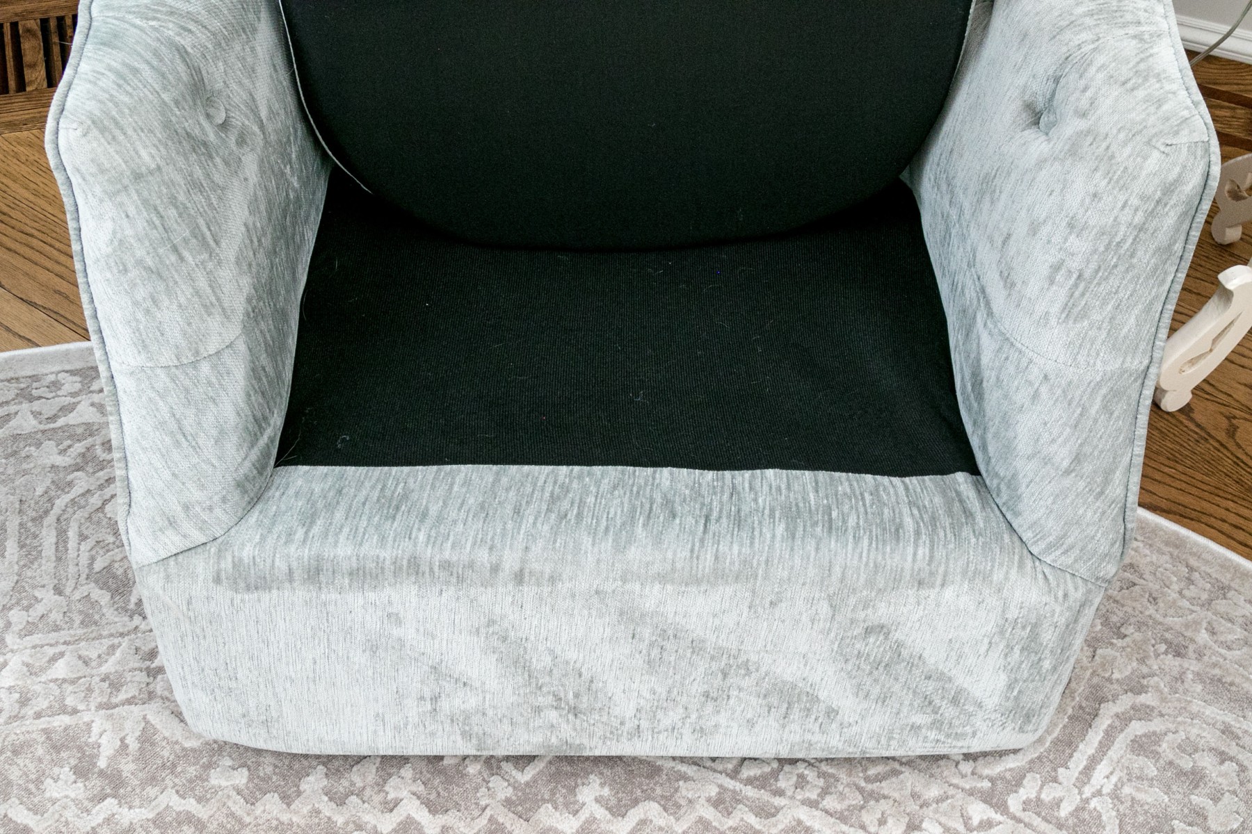 These handsome and practical chairs are velvet upholstered and have a button tufted back and arms with a removable seat cushion and a beaded accent pillow with the label “Artistic Accents.”