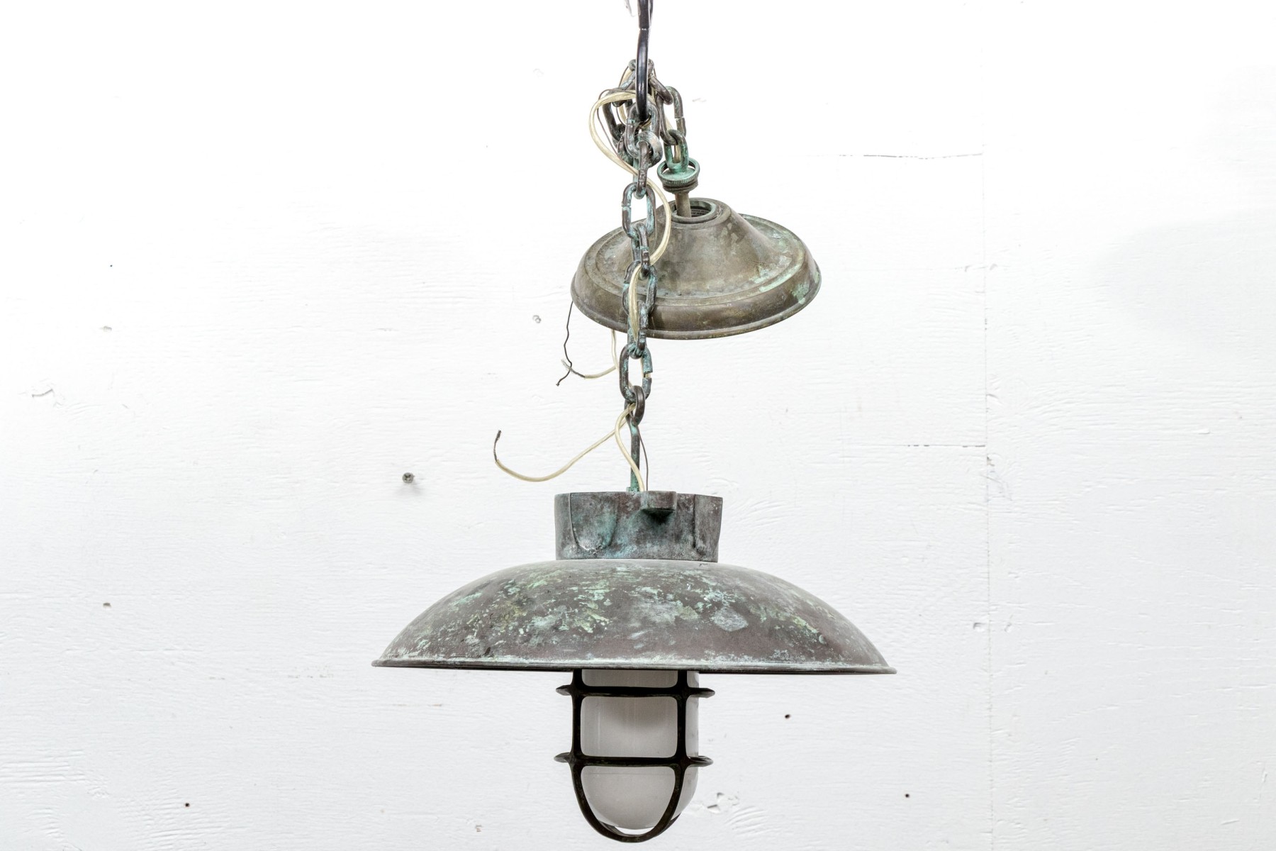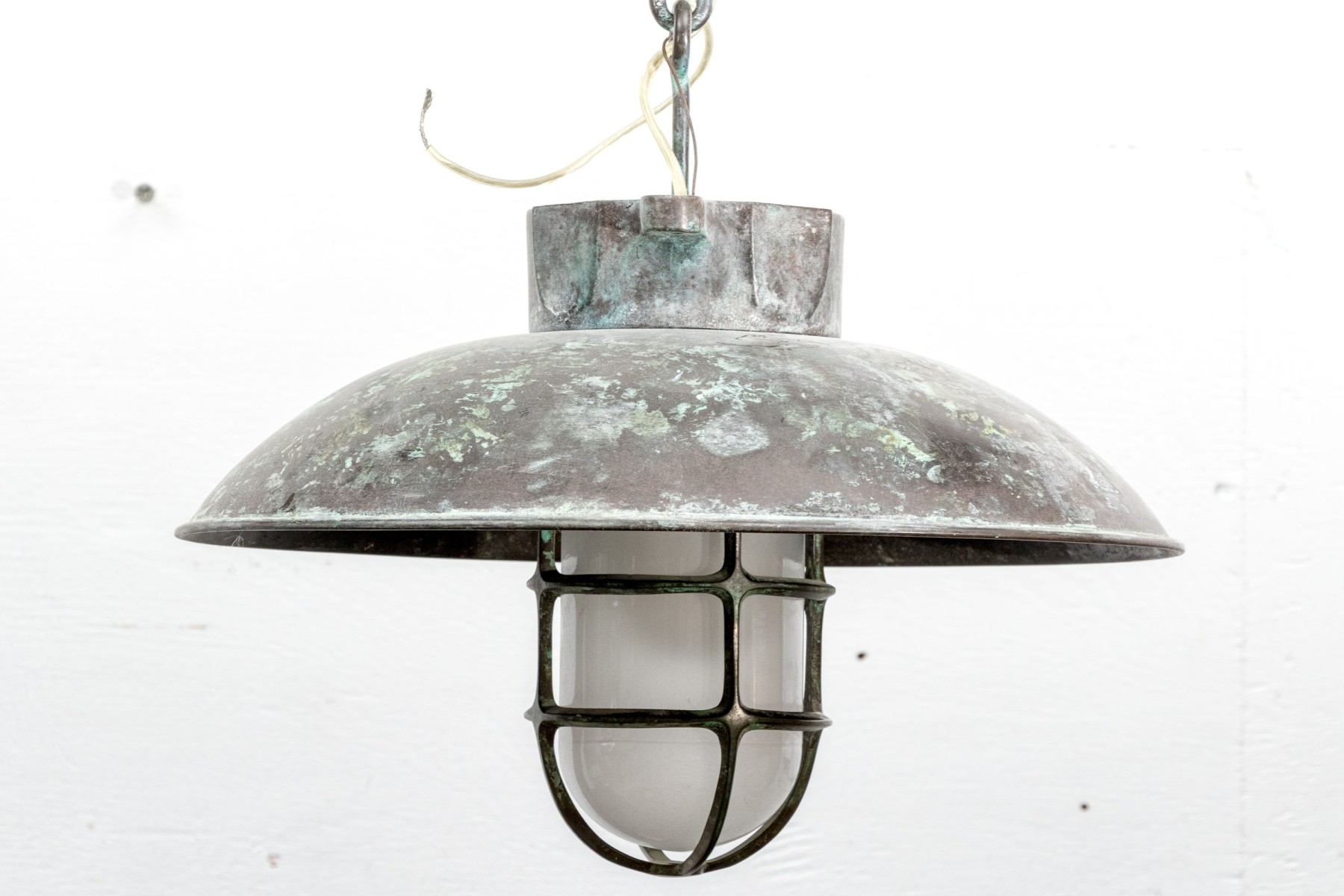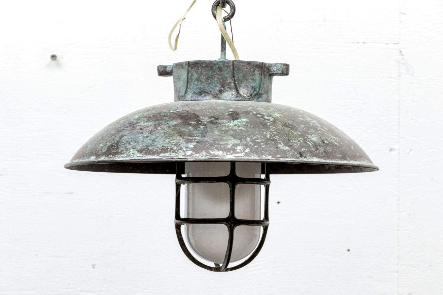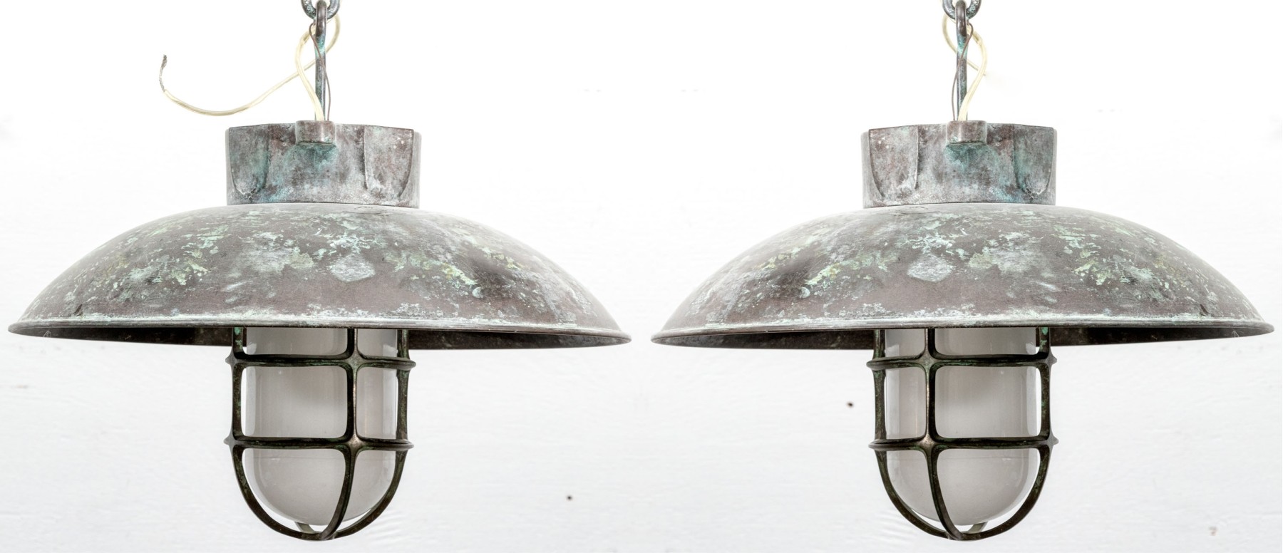 A fantastic pair of Urban Archaeology NY pendant lights with excellent rustic nautical and industrial style. The pendants are beautifully designed with a nicely patinaed verdigris hued finish over sturdy, warm gray metal, showcasing domed shades over white bulbs contained within protective cages.
