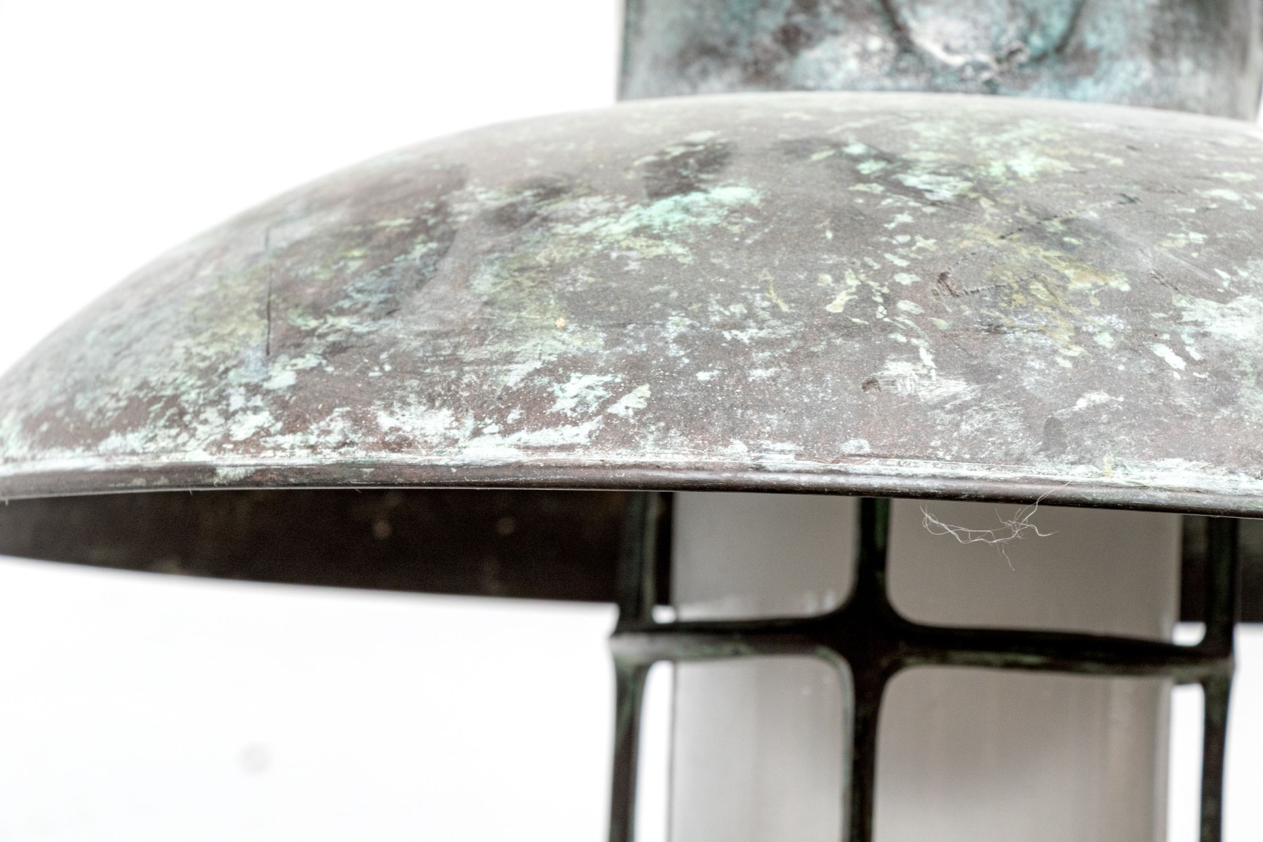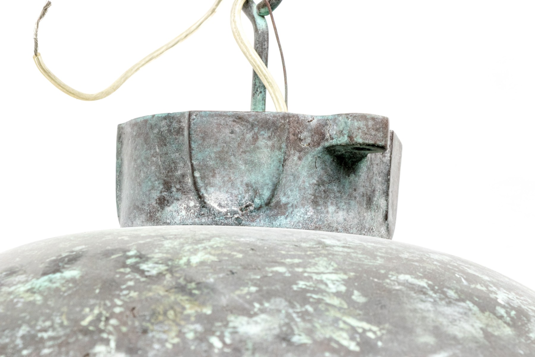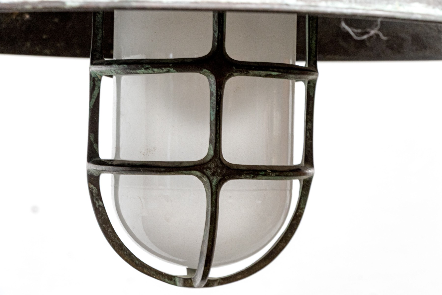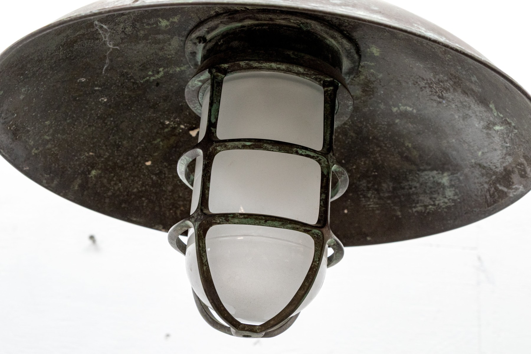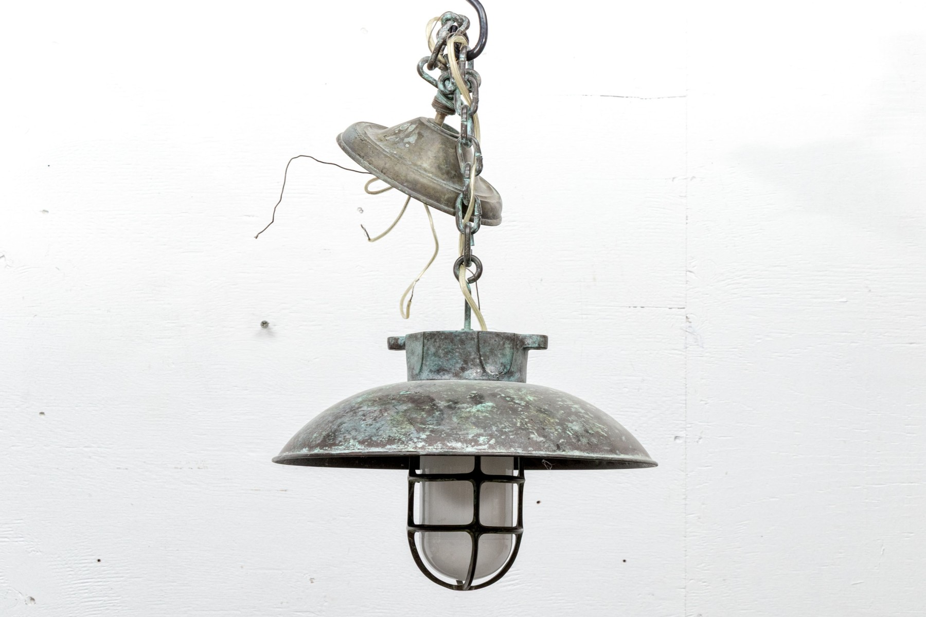 A fantastic pair of Urban Archaeology NY pendant lights with excellent rustic nautical and industrial style. The pendants are beautifully designed with a nicely patinaed verdigris hued finish over sturdy, warm gray metal, showcasing domed shades over white bulbs contained within protective cages.